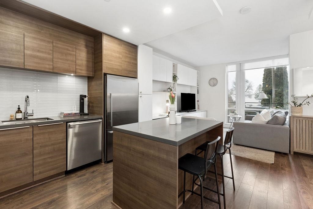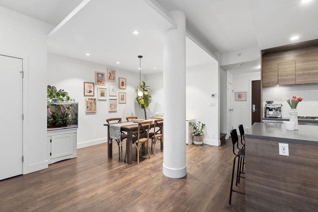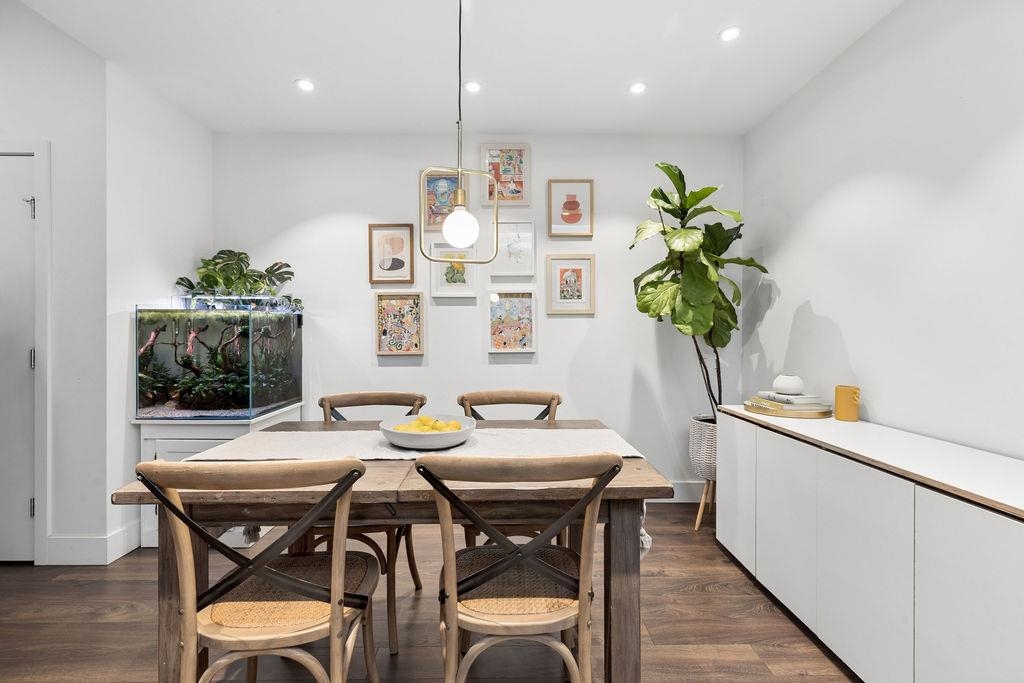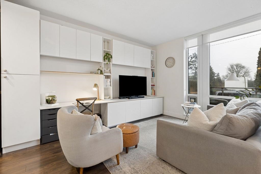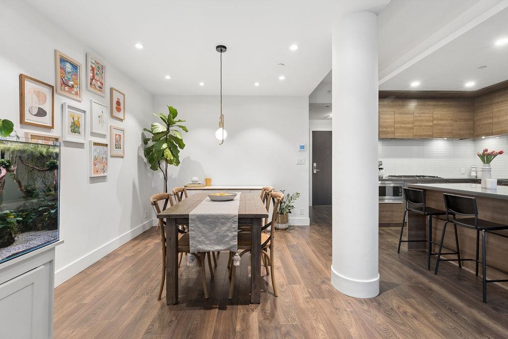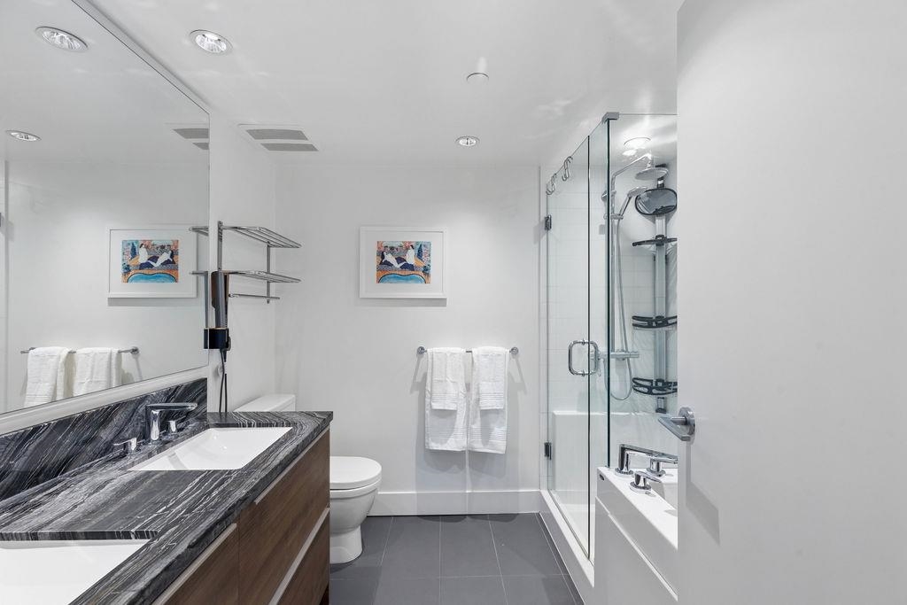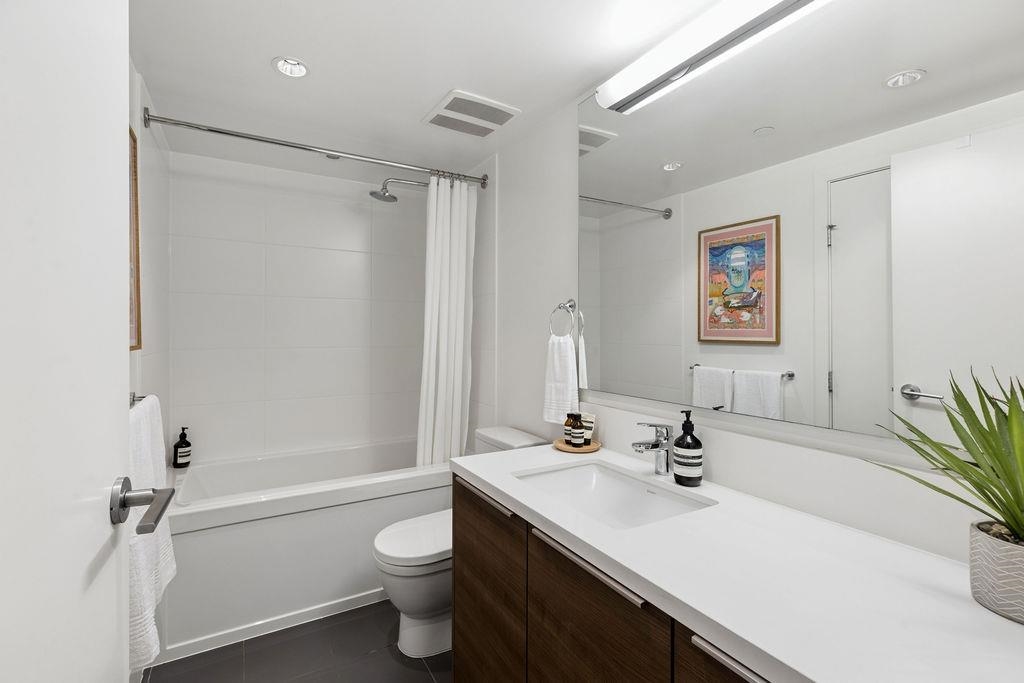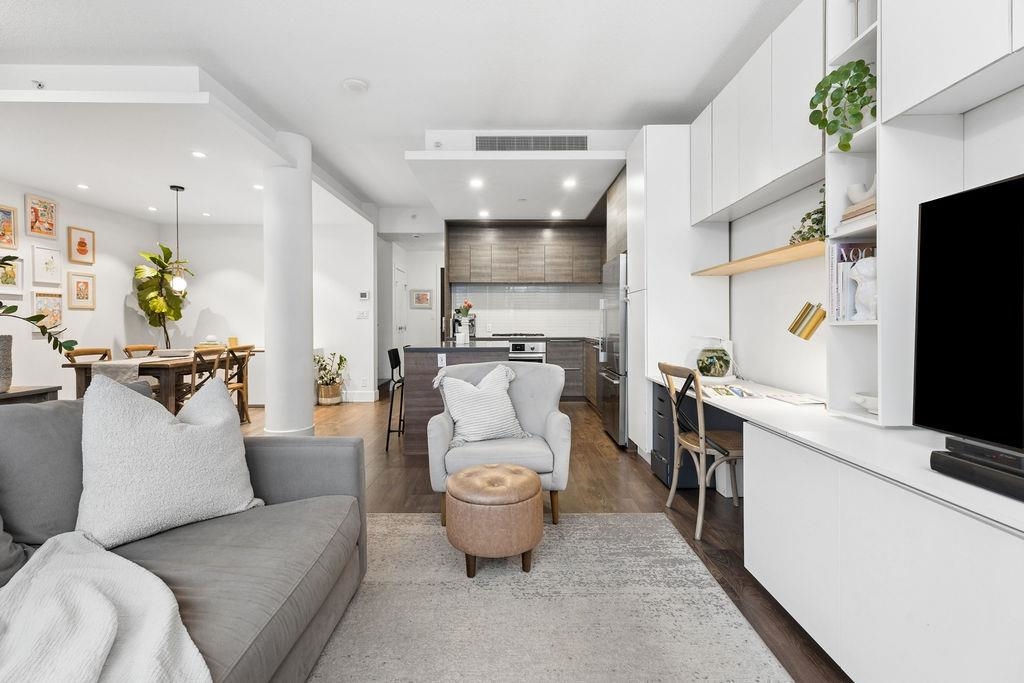 Spacious end unit on a quiet cul-de-sac, this south facing concrete townhome offers total privacy with no highway noise. Thoughtfully designed with 2 bedrooms+ a spacious den (fits a full bed), 3 bathrooms, plus 300 sq ft of sun-soaked outdoor living with gas hookup, perfect for entertaining! The open concept main floor features a quartz kitchen with gas cooktop, custom millwork, 9' ceilings, and triple-glazed windows that flood the space with natural light. Enjoy A/C, guest suites, and world-class ameniti...