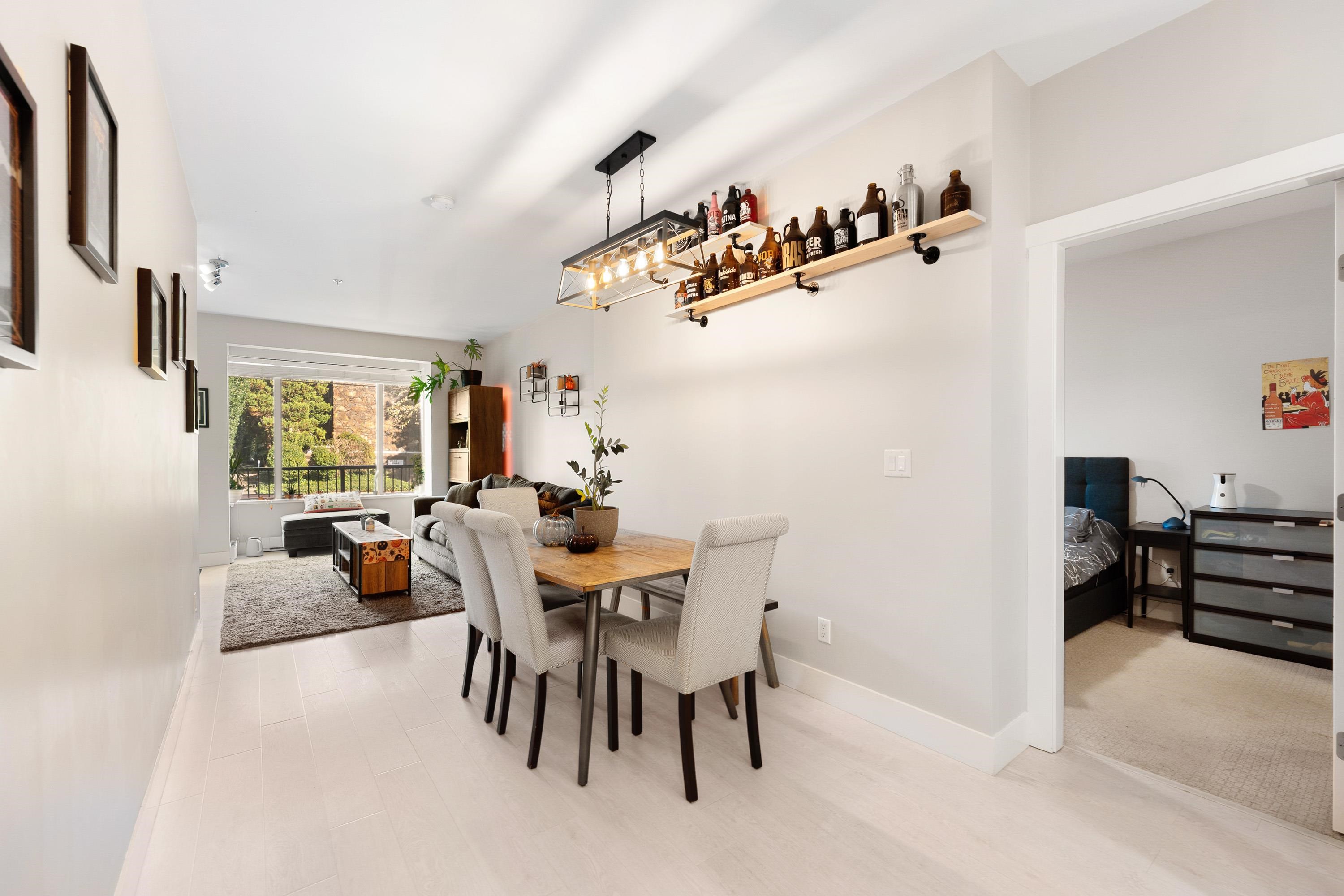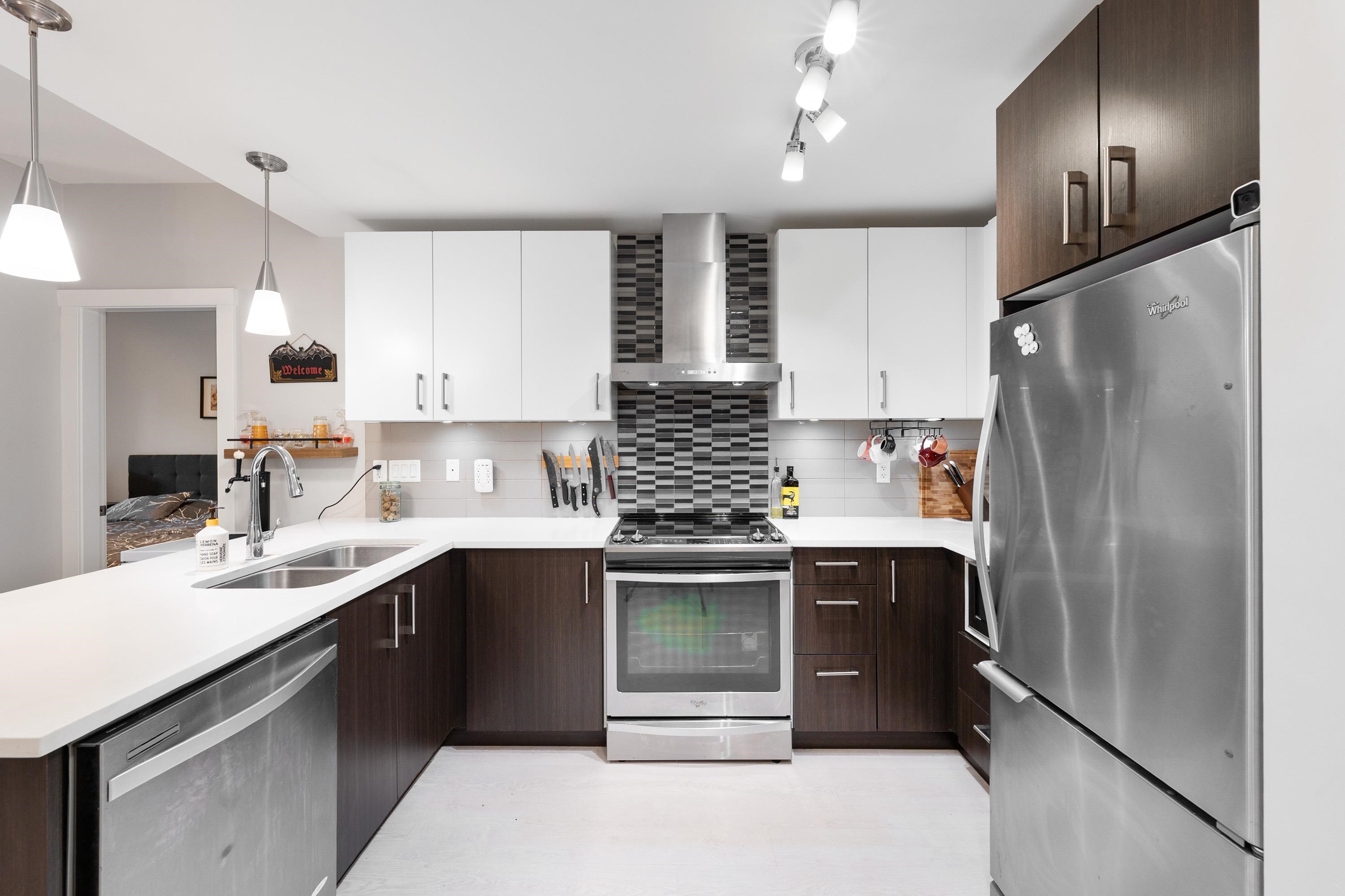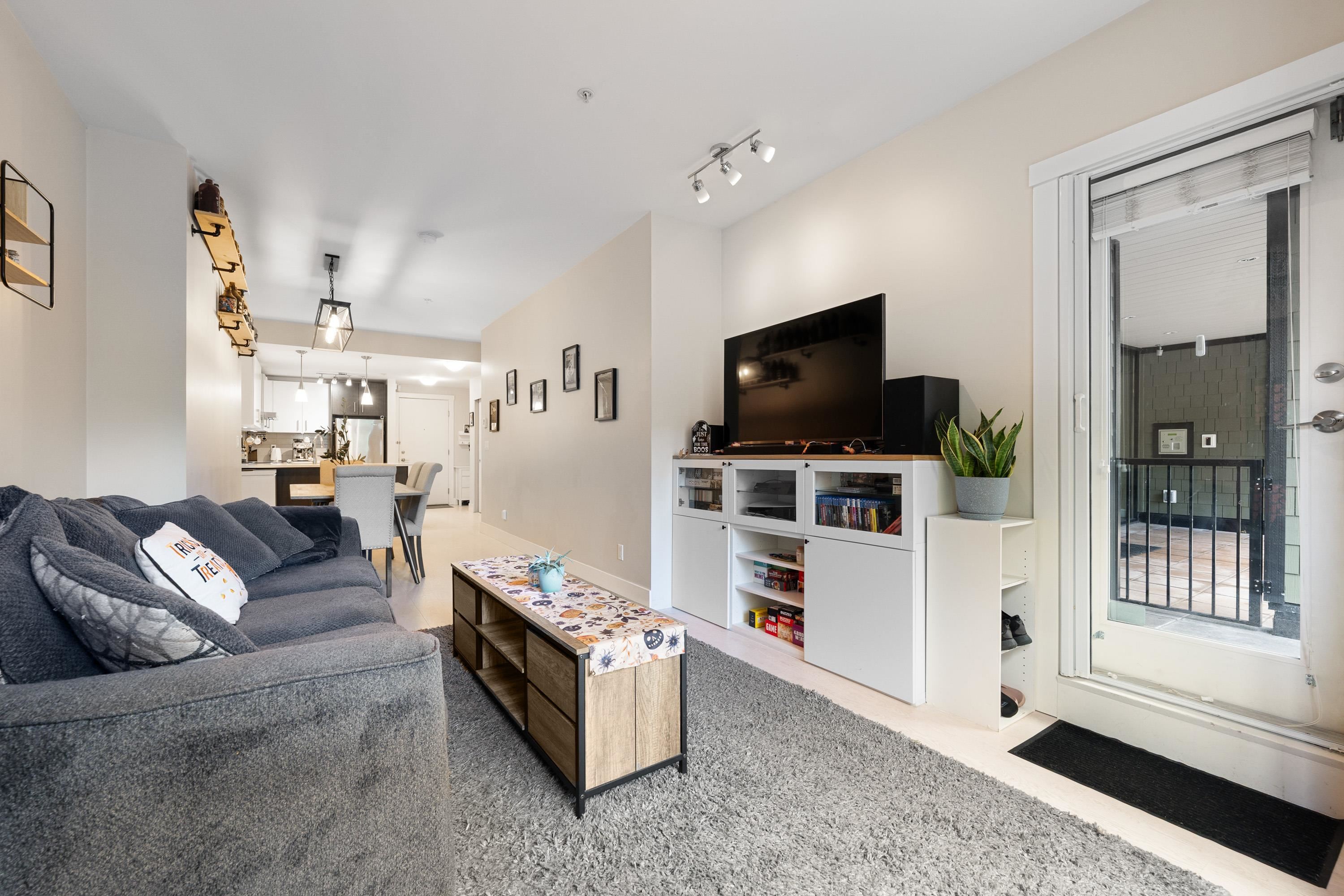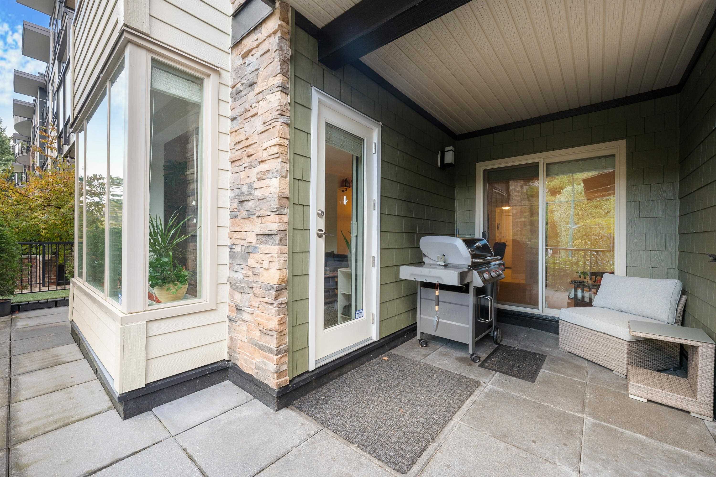This quiet, ground-level corner unit offers over 1,088 sqft of modern living space, including two bedrooms, two bathrooms, and a versatile den perfect for an office or flex space. The open-concept layout features a contemporary kitchen with quartz countertops, stainless steel appliances, and a cozy living room with green views. Step outside onto a spacious wrap-around patio of over 300 sqft, complete with a charming electric fireplace—ideal for entertaining. Located just steps from Gates Park, the Coquitlam...