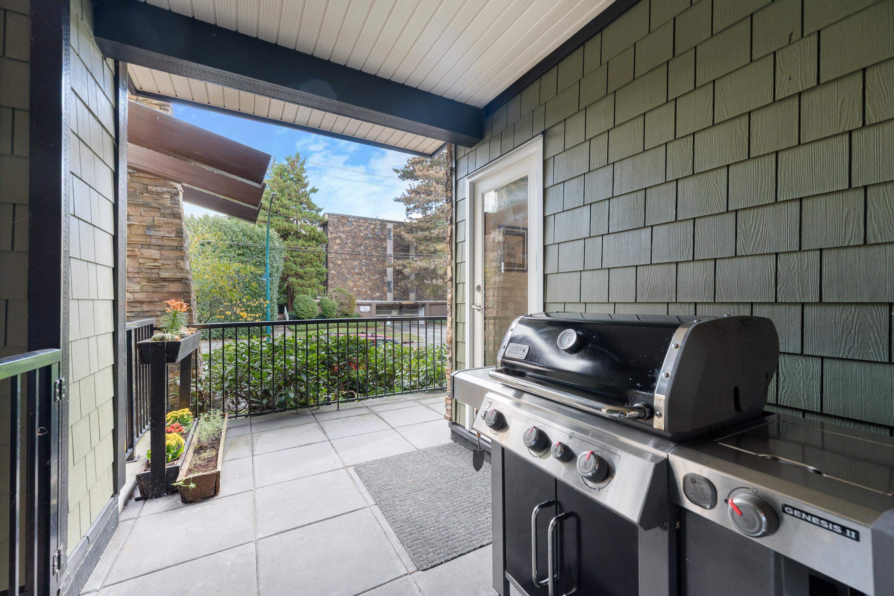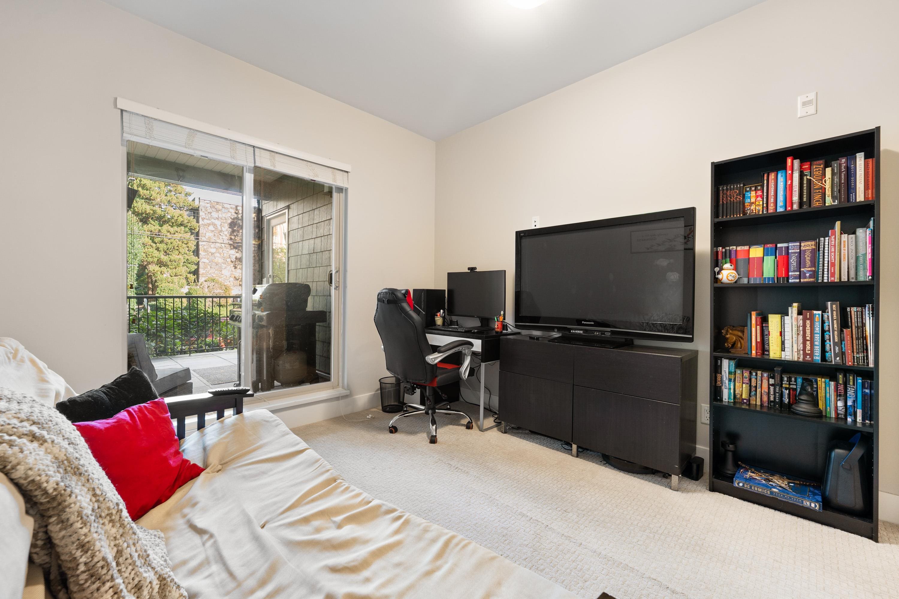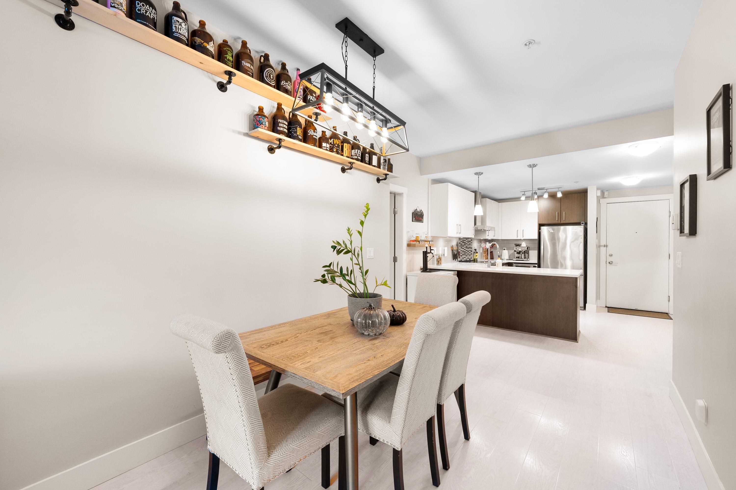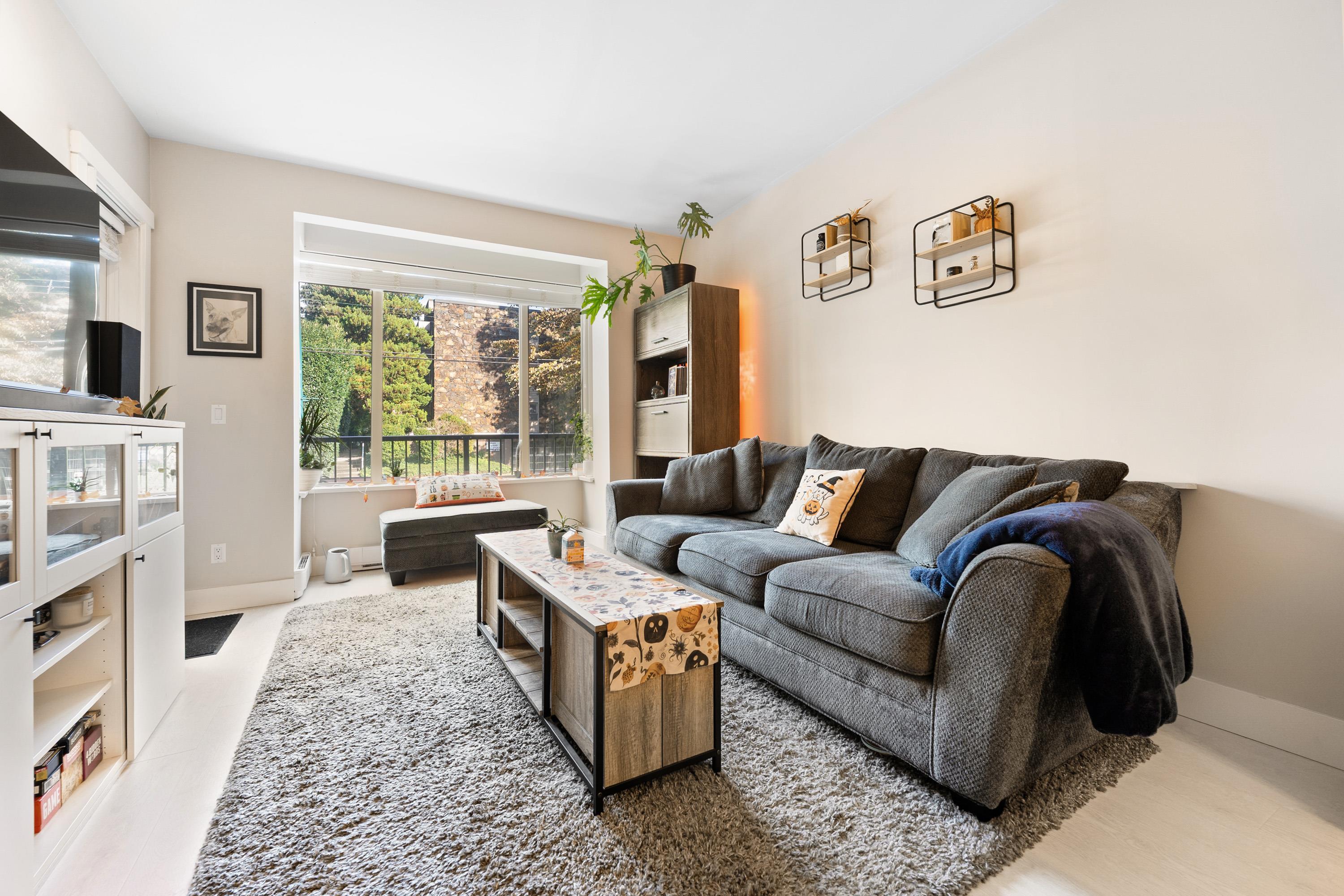 This quiet, ground-level corner unit offers over 1,088 sqft of modern living space, including two bedrooms, two bathrooms, and a versatile den perfect for an office or flex space. The open-concept layout features a contemporary kitchen with quartz countertops, stainless steel appliances, and a cozy living room with green views. Step outside onto a spacious wrap-around patio of over 300 sqft, complete with a charming electric fireplace—ideal for entertaining. Located just steps from Gates Park, the Coquitlam...