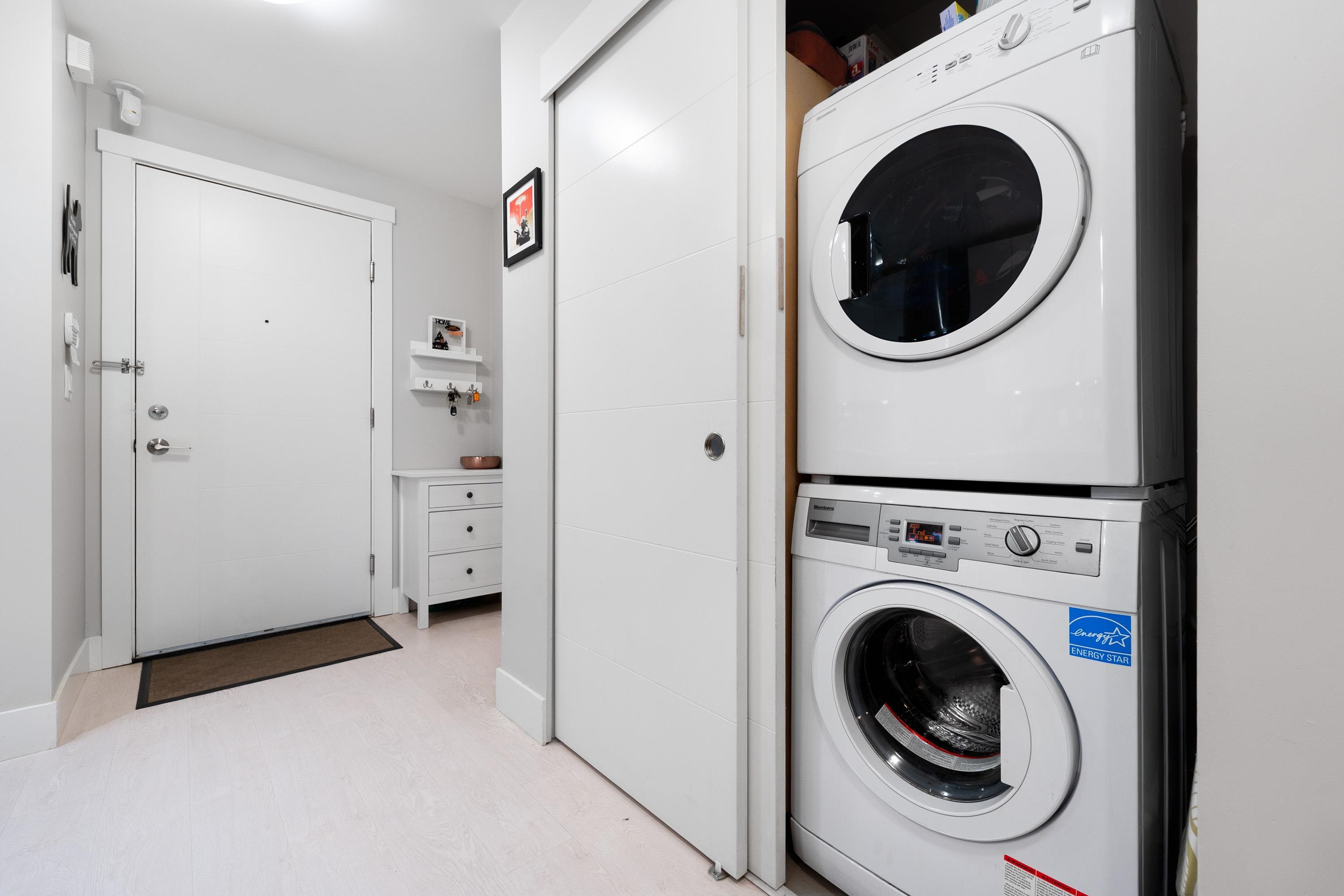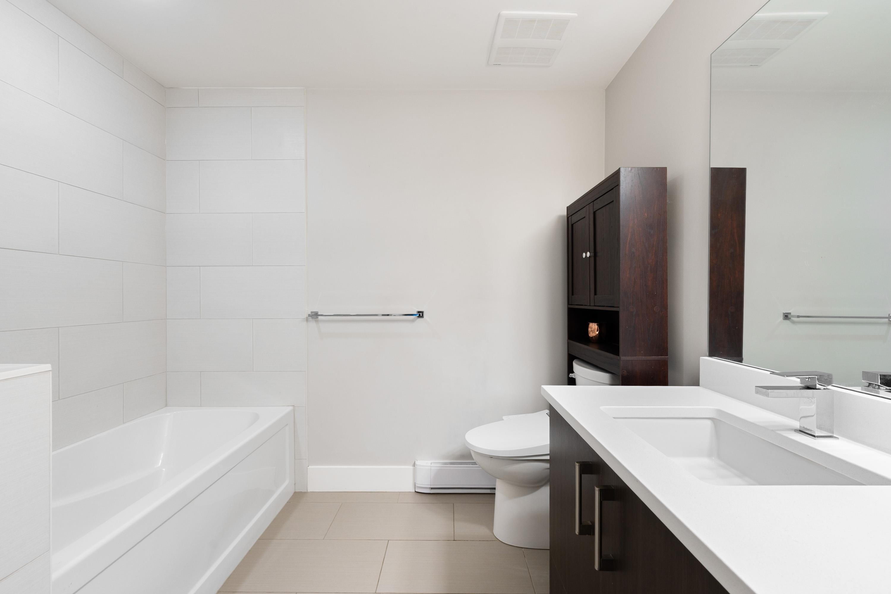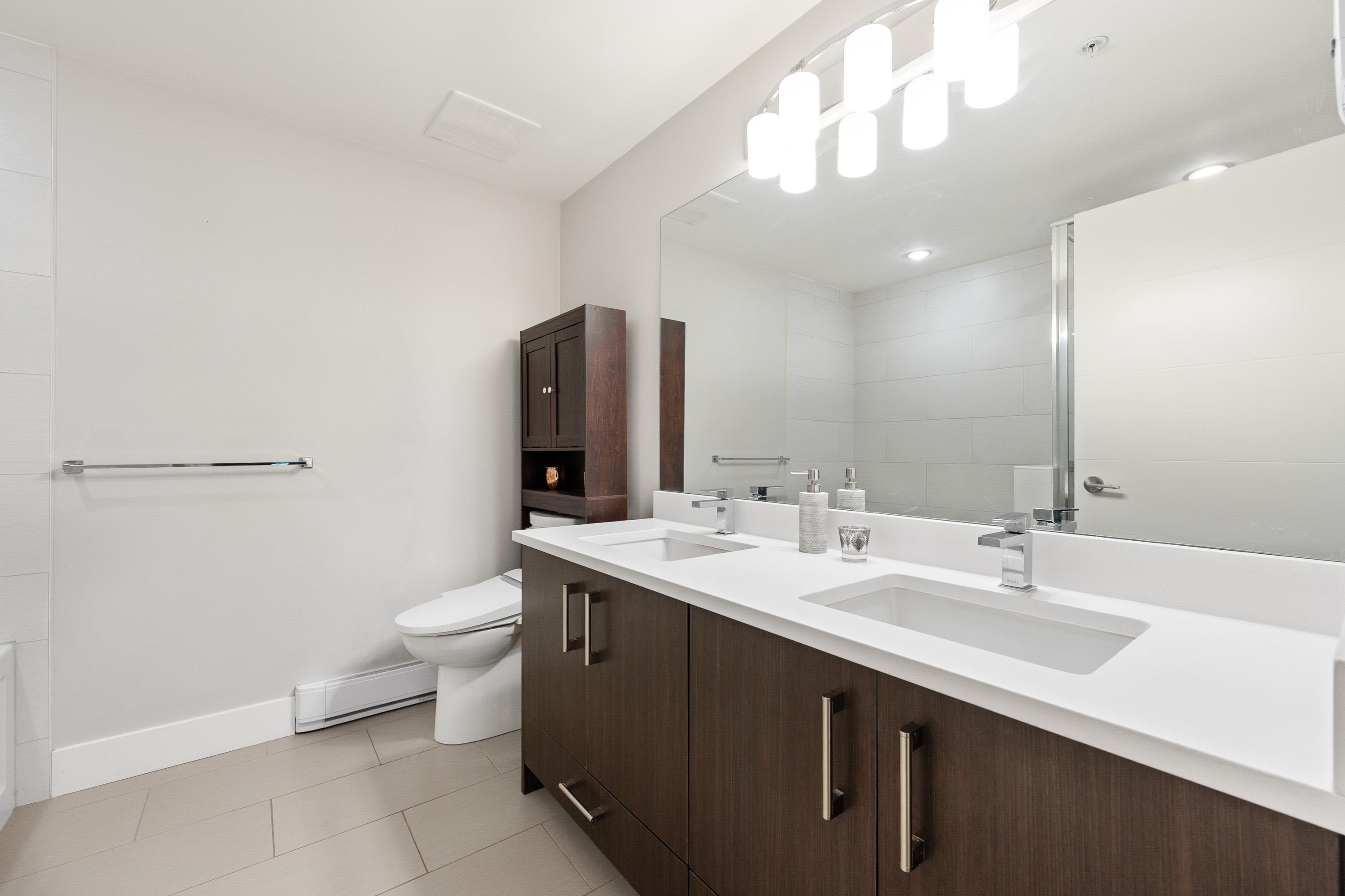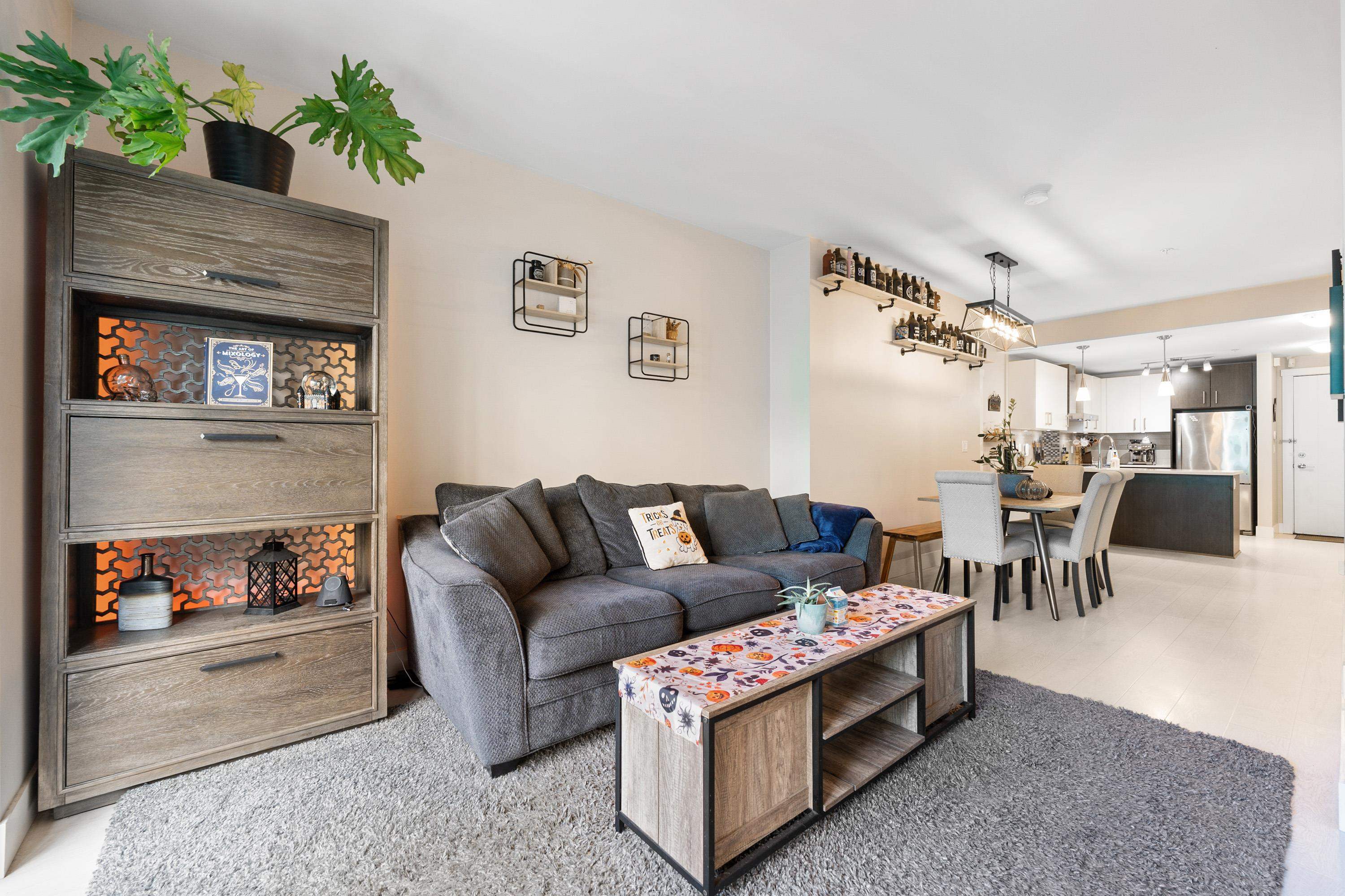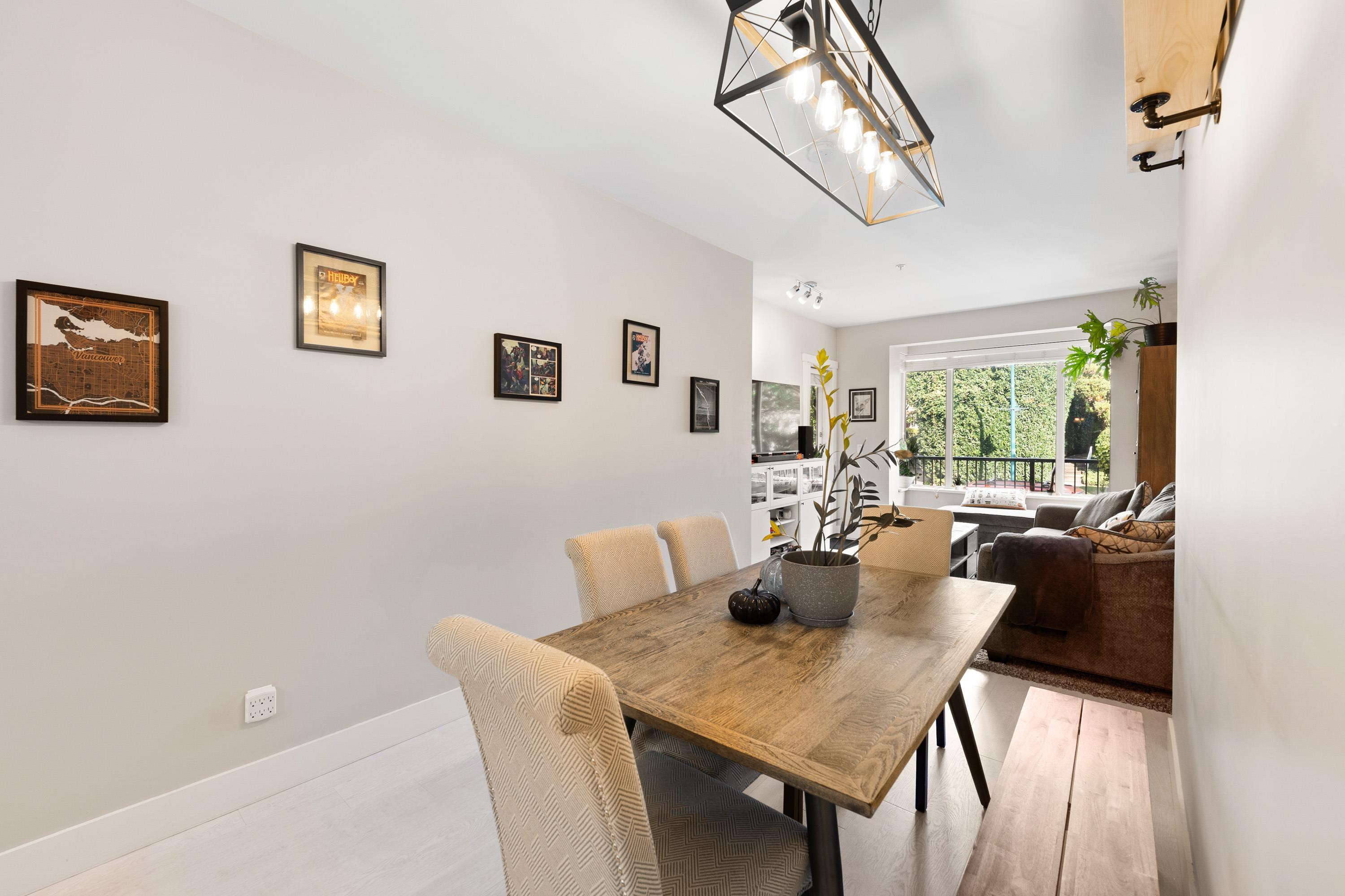 This quiet, ground-level corner unit offers over 1,088 sqft of modern living space, including two bedrooms, two bathrooms, and a versatile den perfect for an office or flex space. The open-concept layout features a contemporary kitchen with quartz countertops, stainless steel appliances, and a cozy living room with green views. Step outside onto a spacious wrap-around patio of over 300 sqft, complete with a charming electric fireplace—ideal for entertaining. Located just steps from Gates Park, the Coquitlam...
