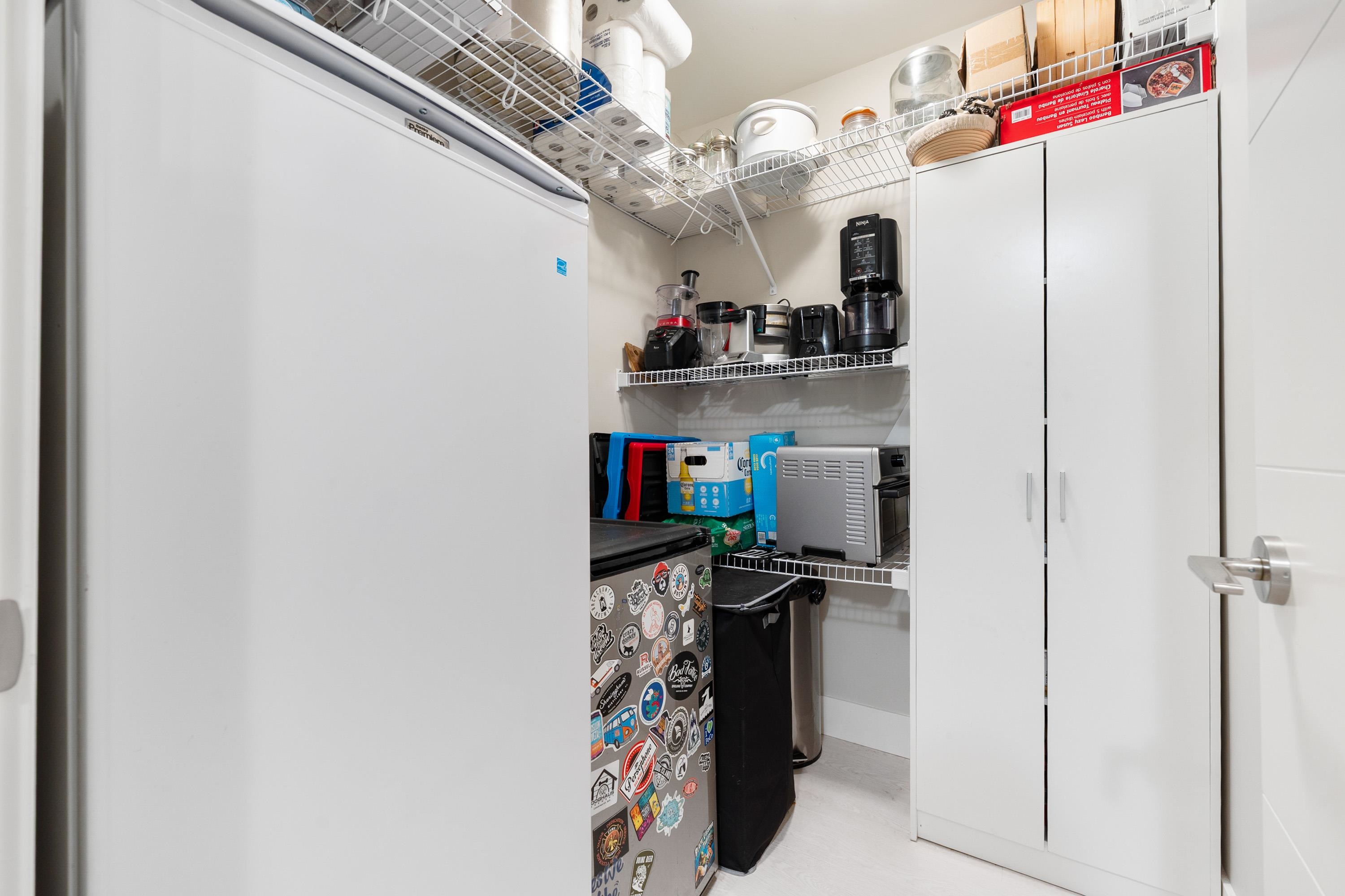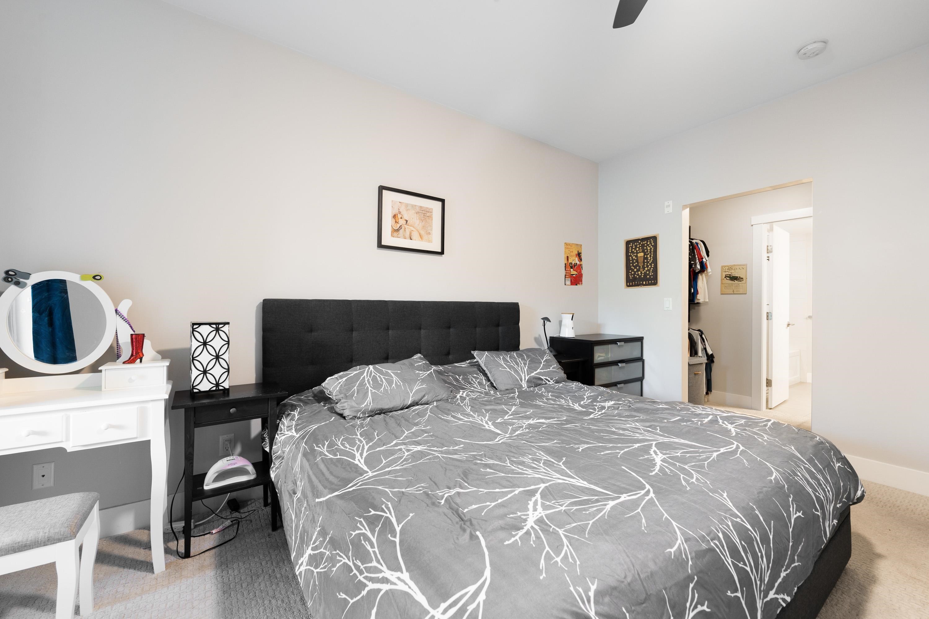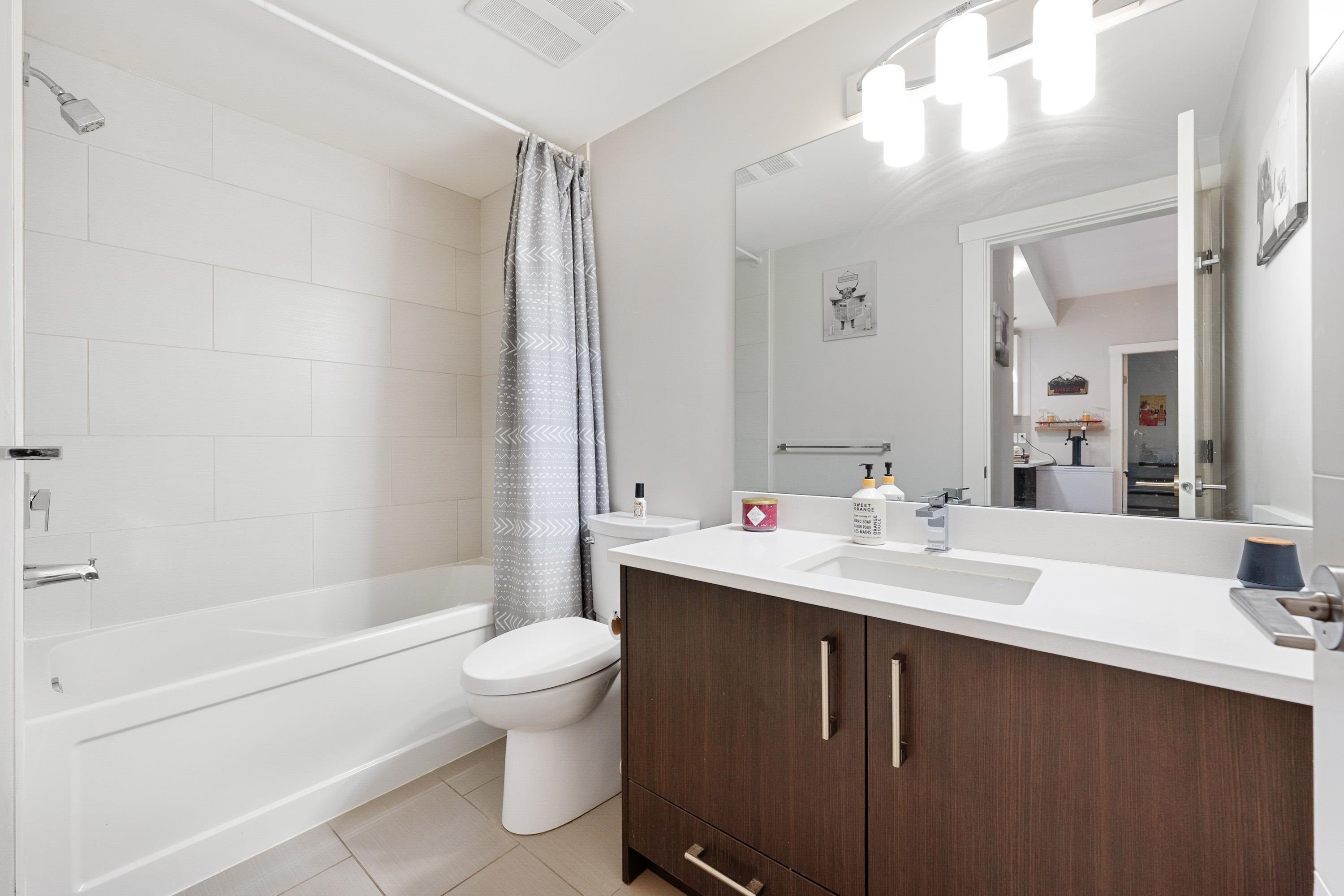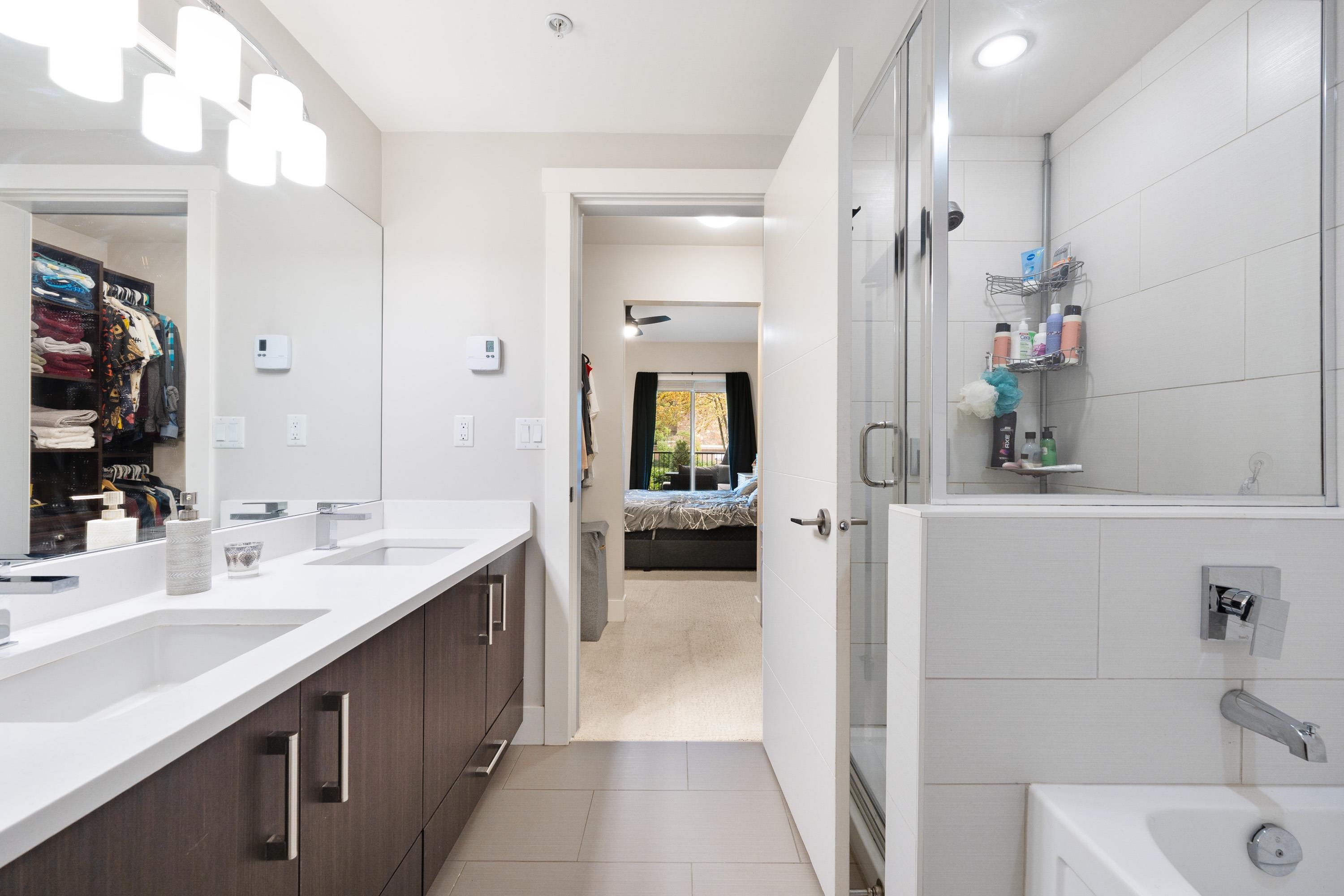 This quiet, ground-level corner unit offers over 1,088 sqft of modern living space, including two bedrooms, two bathrooms, and a versatile den perfect for an office or flex space. The open-concept layout features a contemporary kitchen with quartz countertops, stainless steel appliances, and a cozy living room with green views. Step outside onto a spacious wrap-around patio of over 300 sqft, complete with a charming electric fireplace—ideal for entertaining. Located just steps from Gates Park, the Coquitlam...