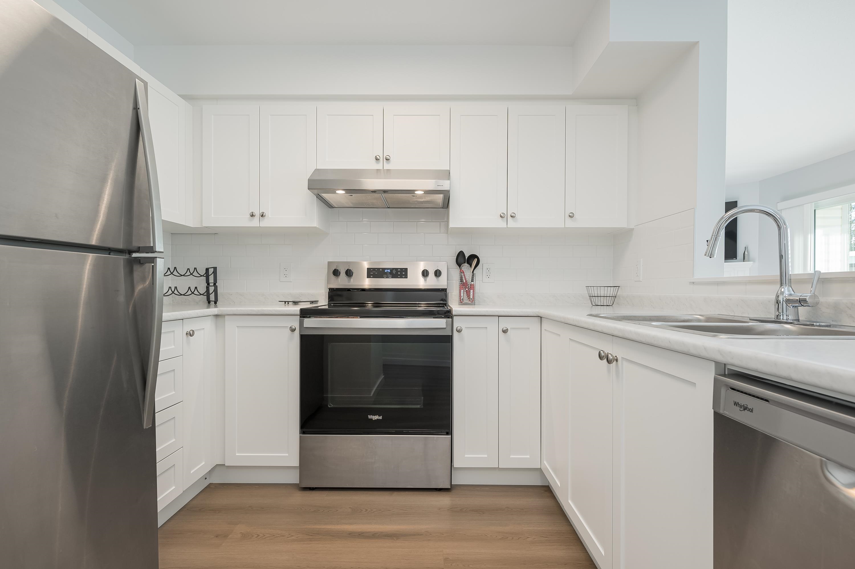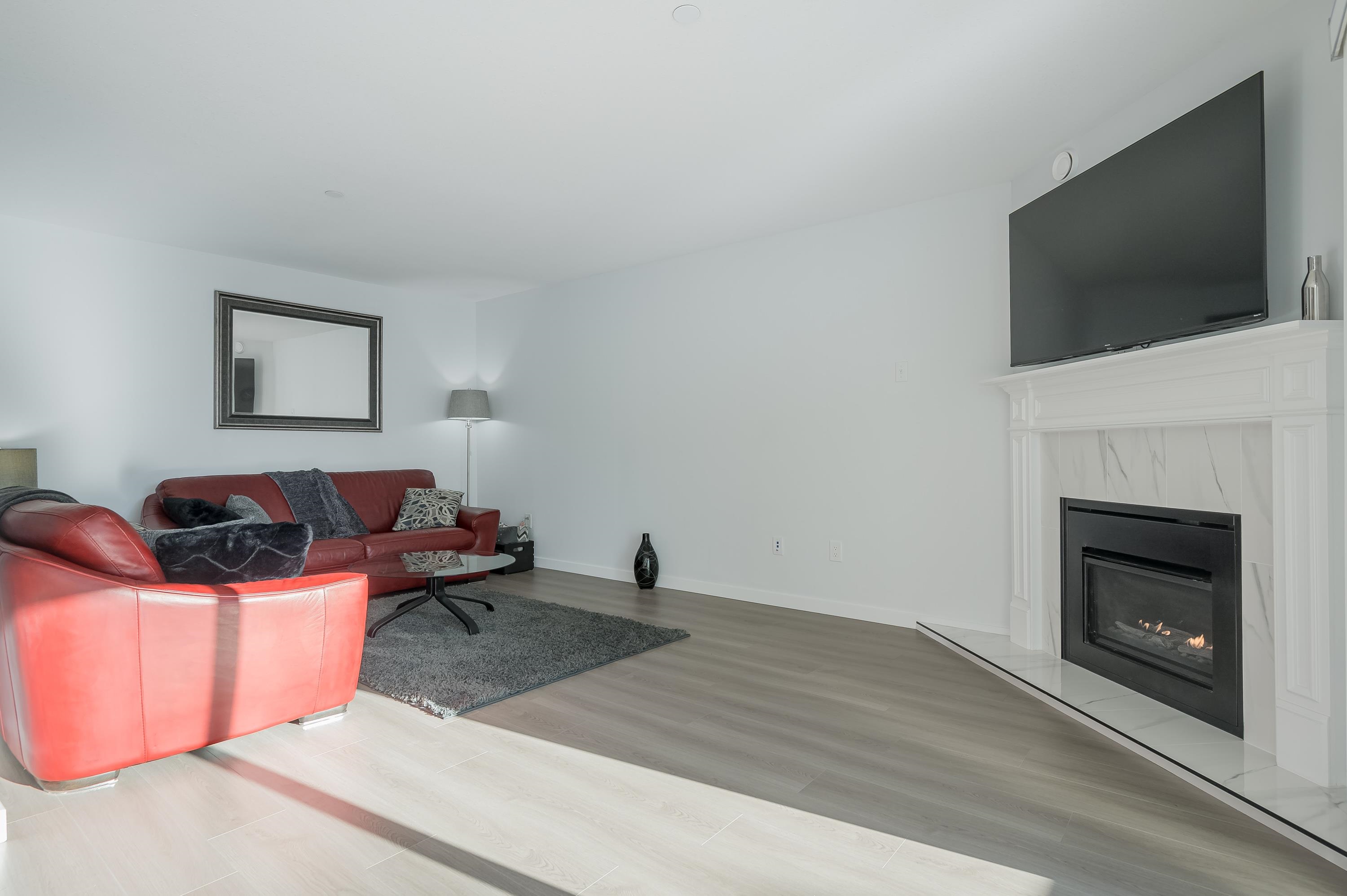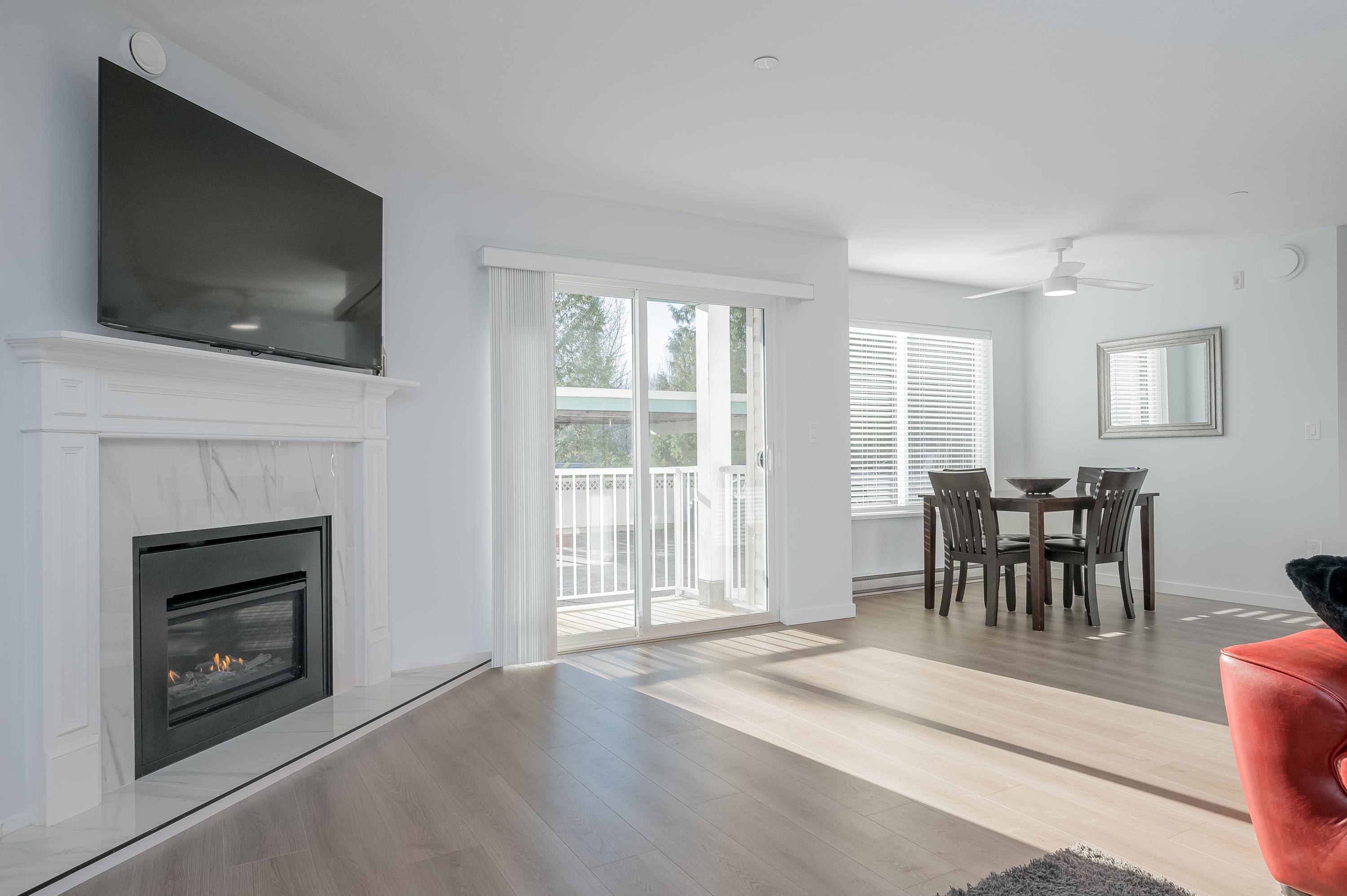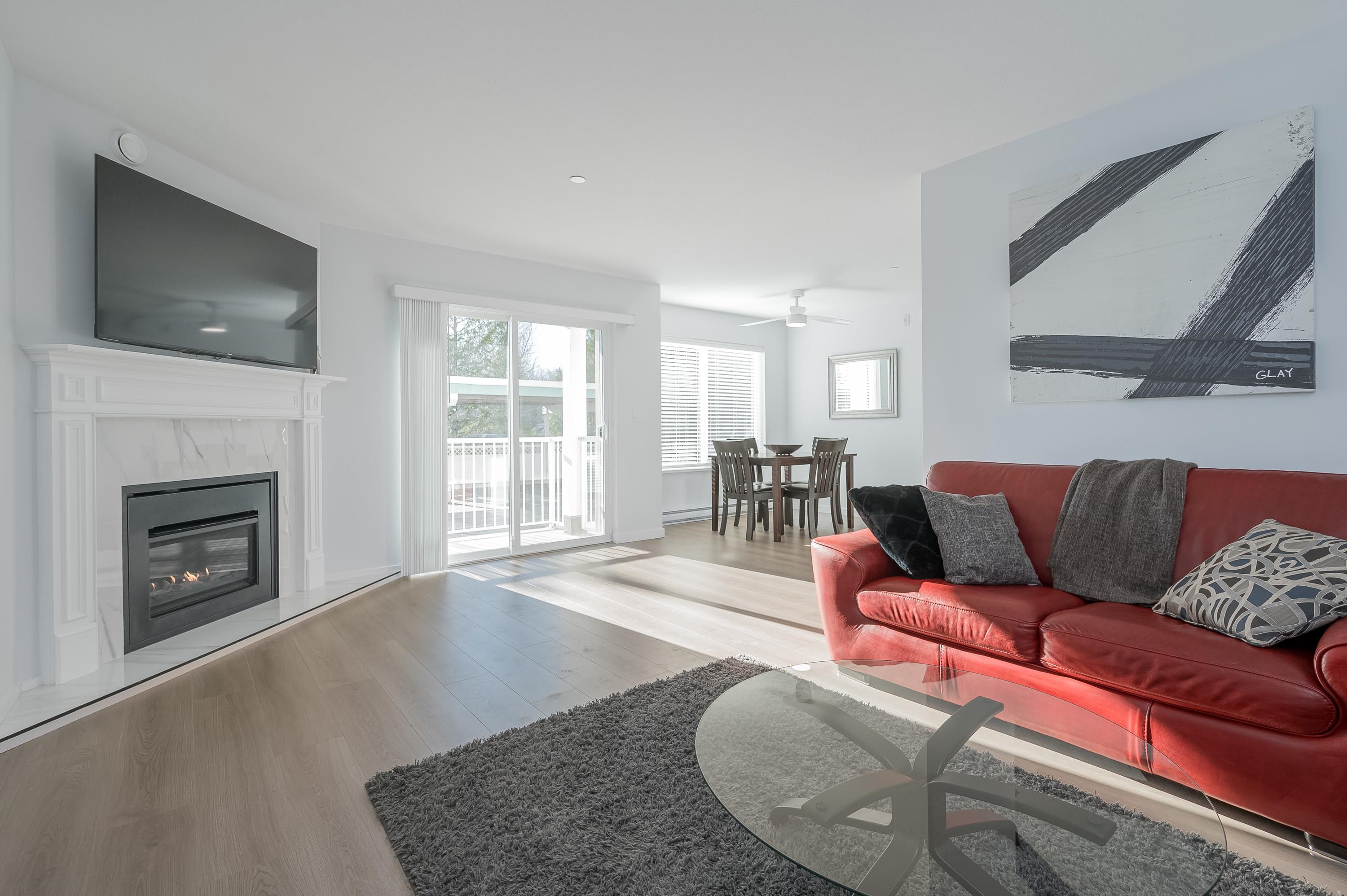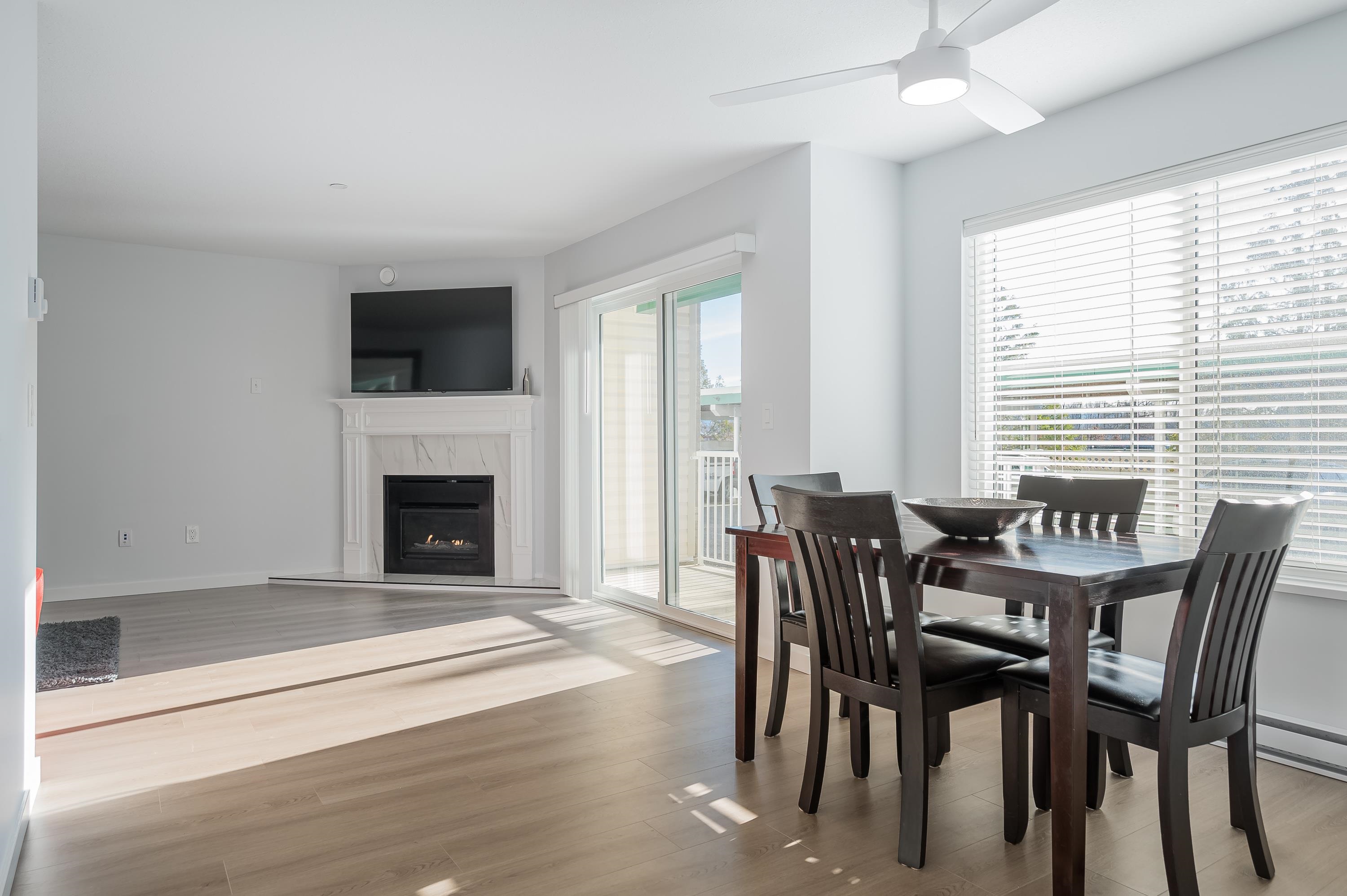 Spacious and beautifully updated 2-bedroom, 1 and 1/2 bathroom, 1,041 sq ft ground-floor end unit with covered patio, convenient access via gated patio, and large private storage on the same floor. Bright south-facing layout features a generous primary bedroom with spa-inspired ensuite, soaker tub, and separate shower. Enjoy modern stainless steel appliances, in-suite laundry, and a cozy gas fireplace with gas included in low strata fees. Well-managed building with amenities room, one conveniently located c...