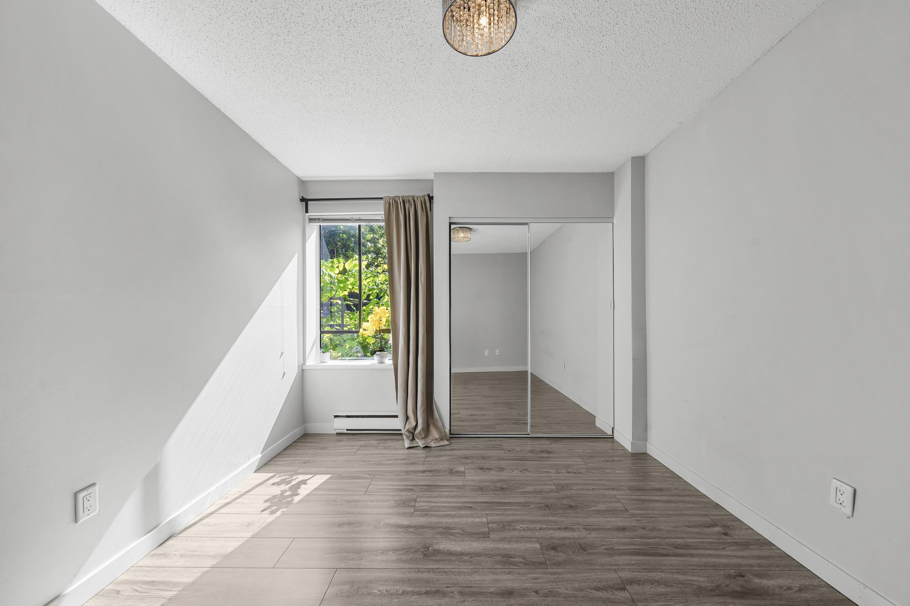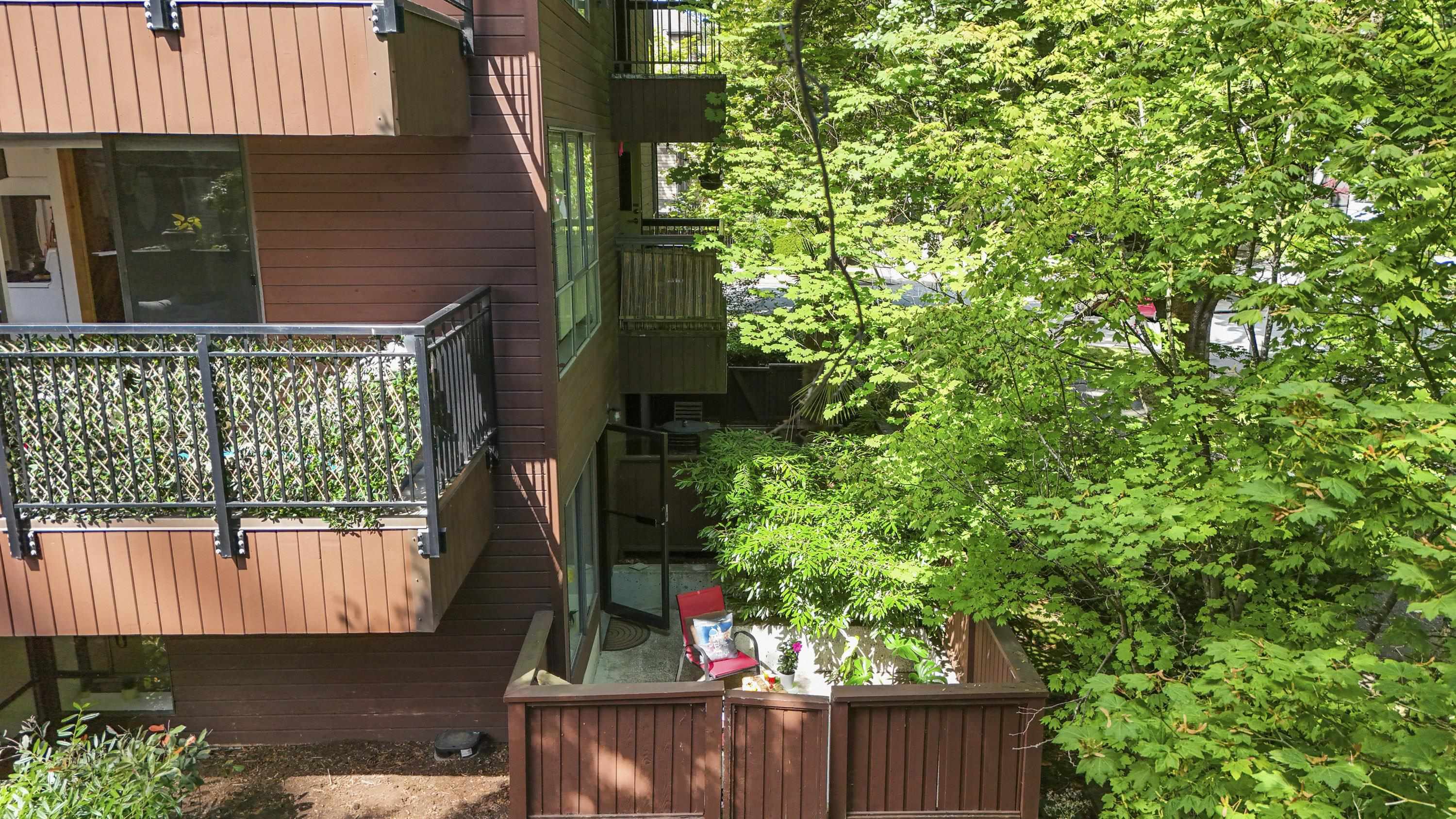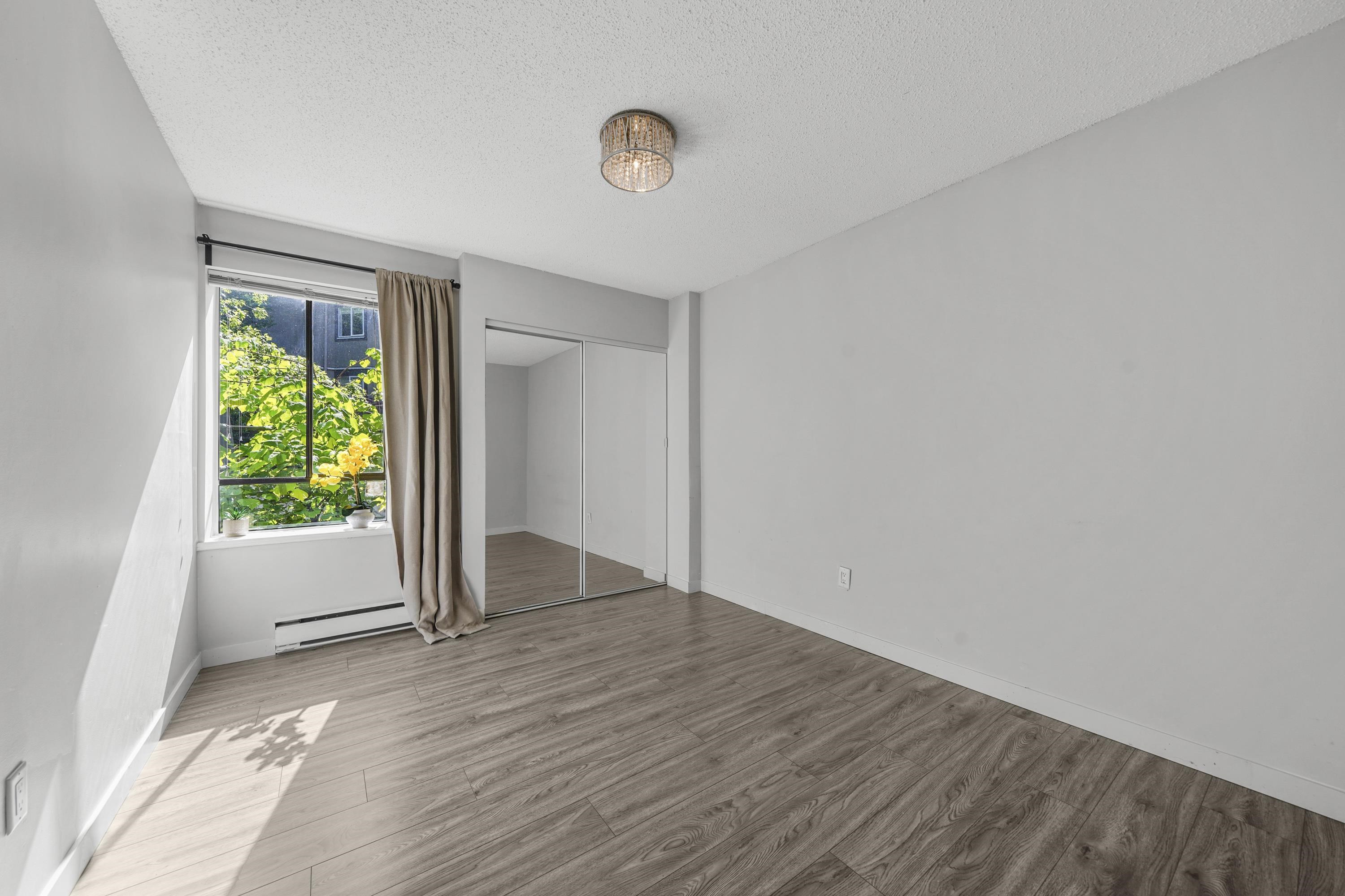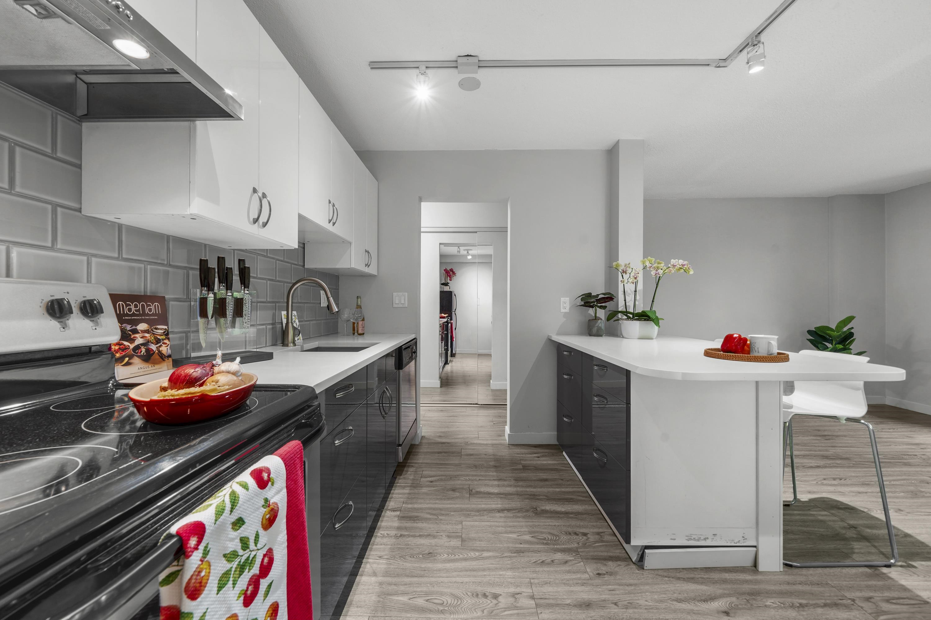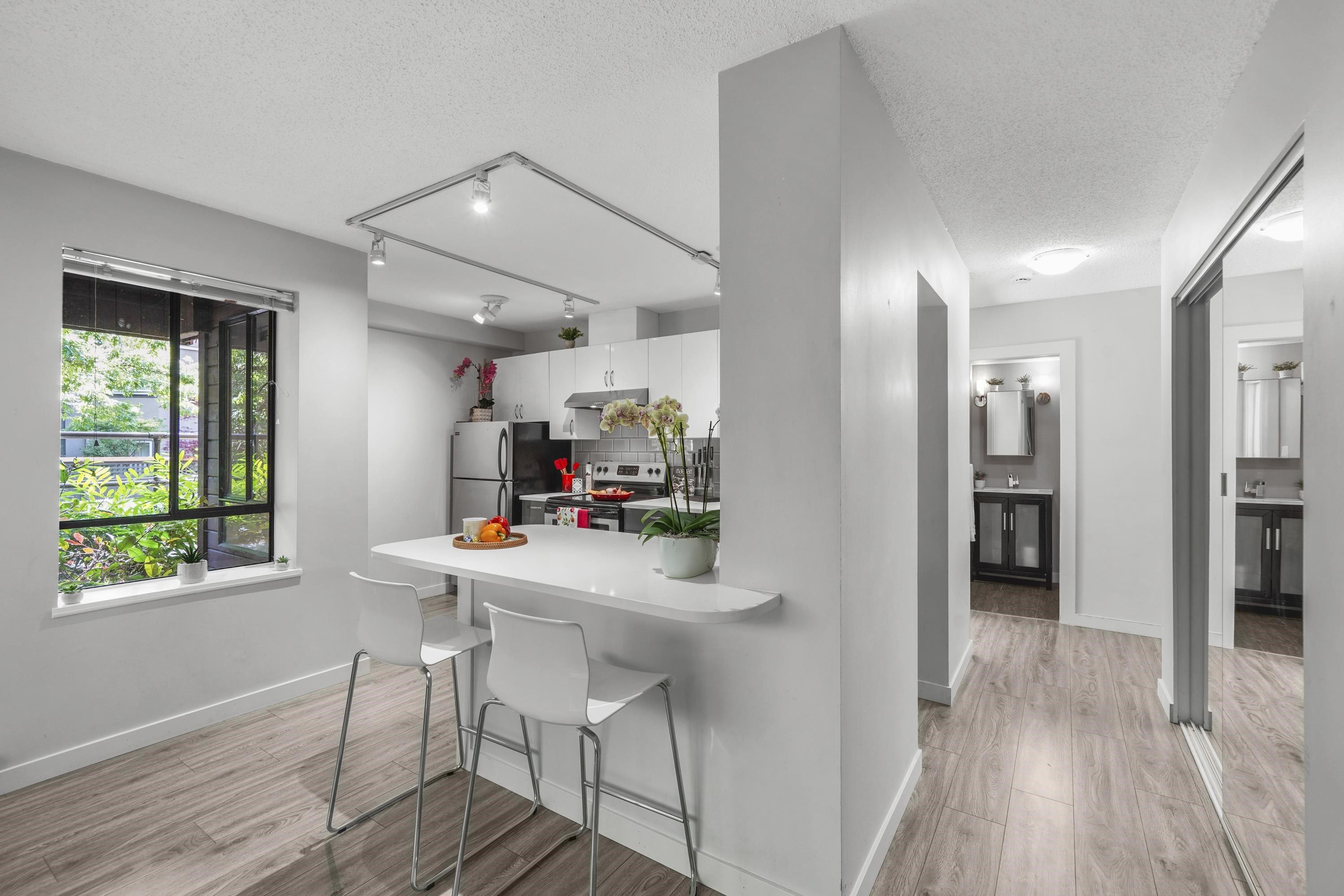 Garden-level NE corner home feat. spacious PRIVATE PATIO & dedicated street-level entrance, offering a total living space of 693SF. Enjoy a bright & airy open-concept layout w/ large corner windows, maximizing natural light & eliminating wasted space. Kitchen offers quartz countertops, S/S appliances (incl a DW), plenty of storage & prep space—ideal for both cooking & entertaining. This move-in ready home has been renovated, features secure parking & a storage locker. A short stroll to VGH, CityHall, Broadw...