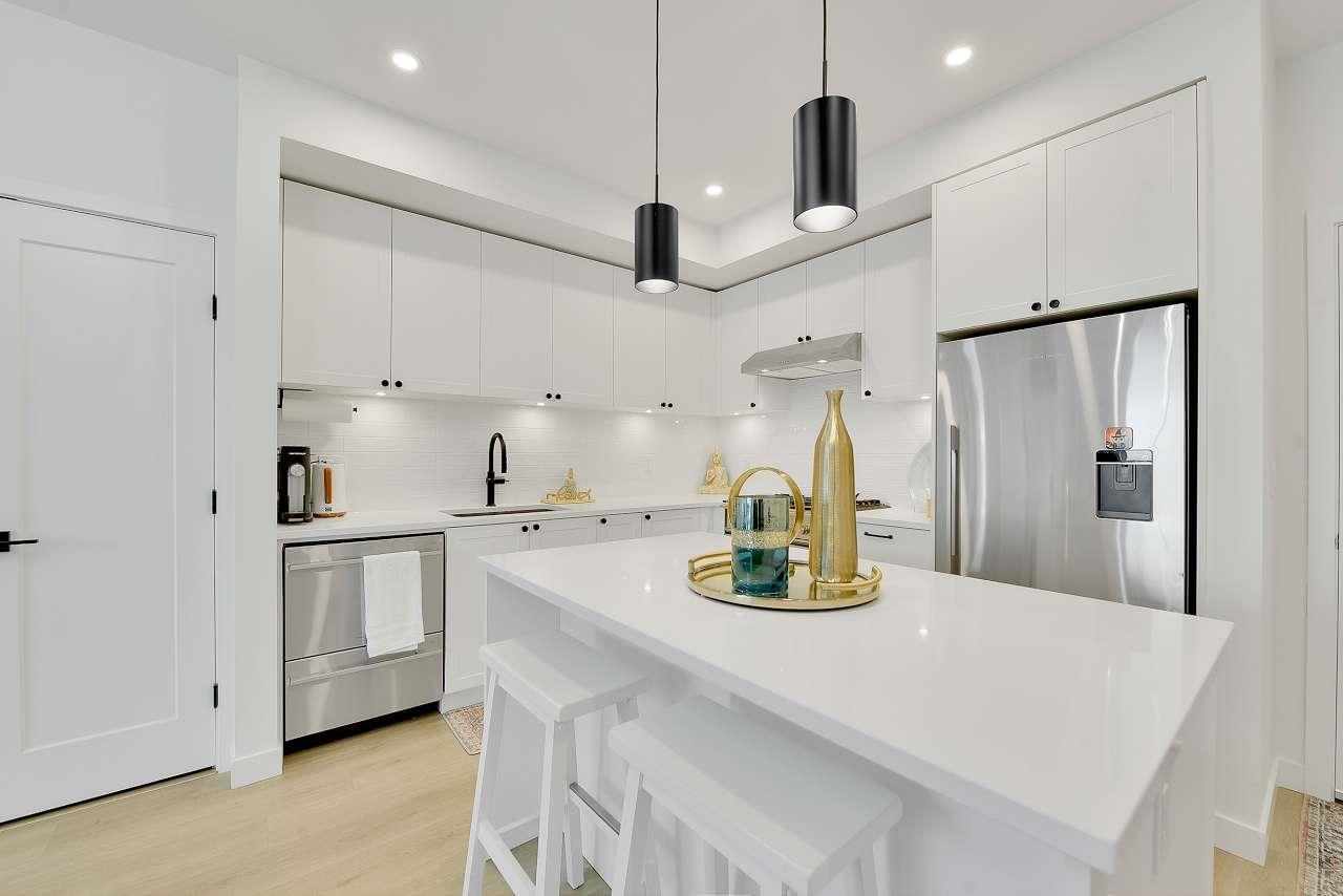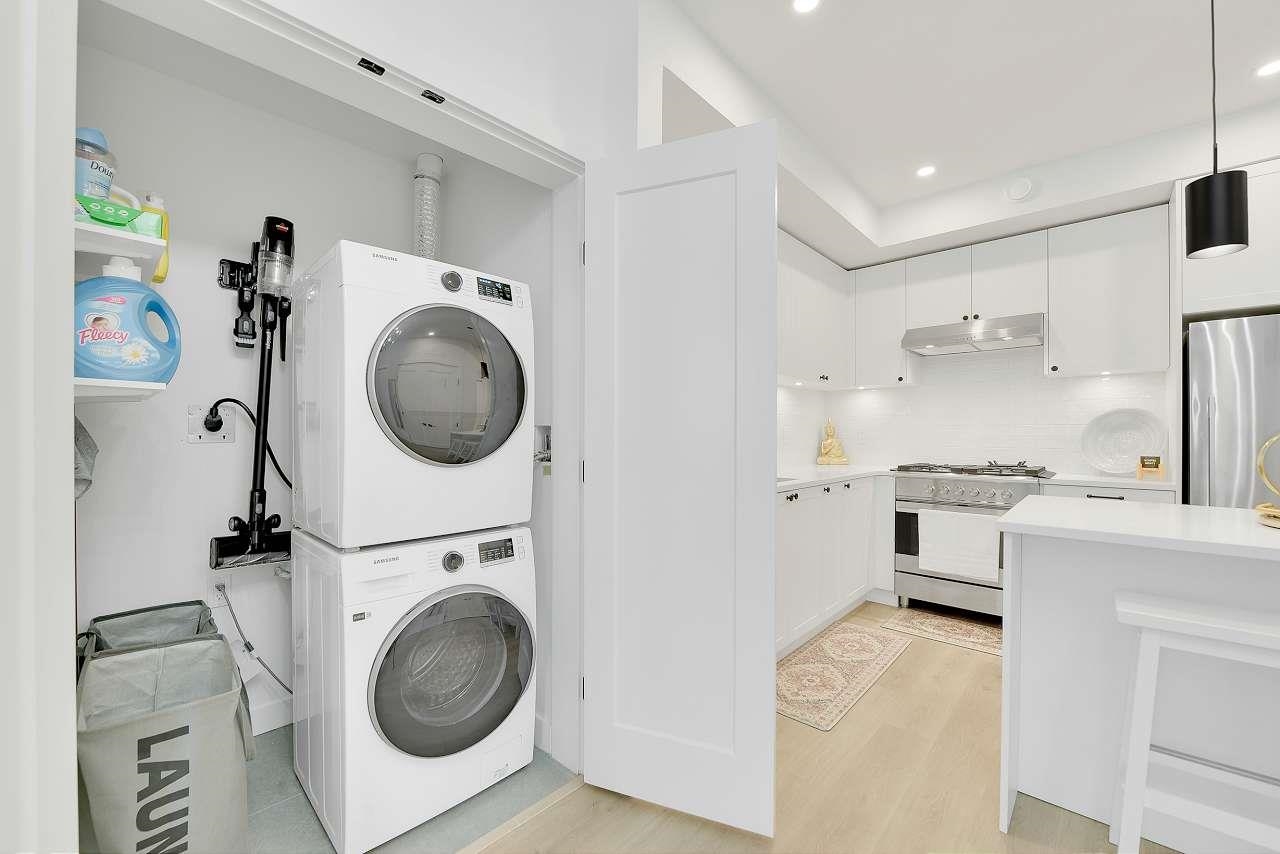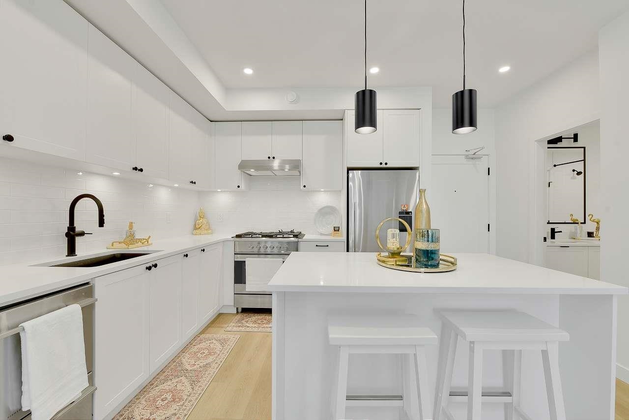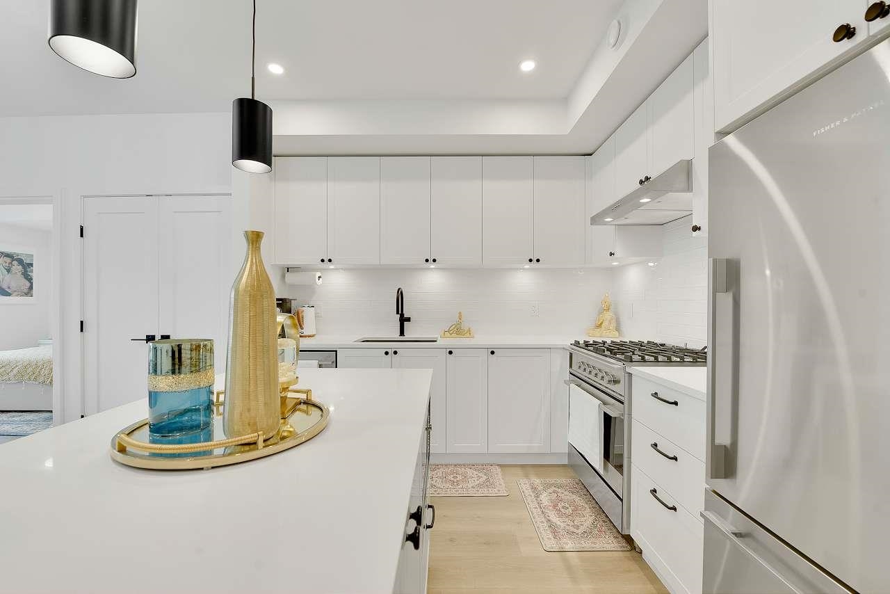 Welcome to Holden Residences, 2-bed/2-bath , 900SQFT Home features an open concept with 9' ceilings. Situated on the ground, Both bedrooms with a walk-in closet and ensuite . Finishes include polished quartz countertops with full height tile backsplash, stainless steel kitchen appliances by Fisher & Paykel including an industrial-style gas range and double-drawer dishwasher. Offers rough-ins for A/C and a gas BBQ outlet on the deck. one parking stall, one storage locker .Roughed in for...A/C, future EV Char...