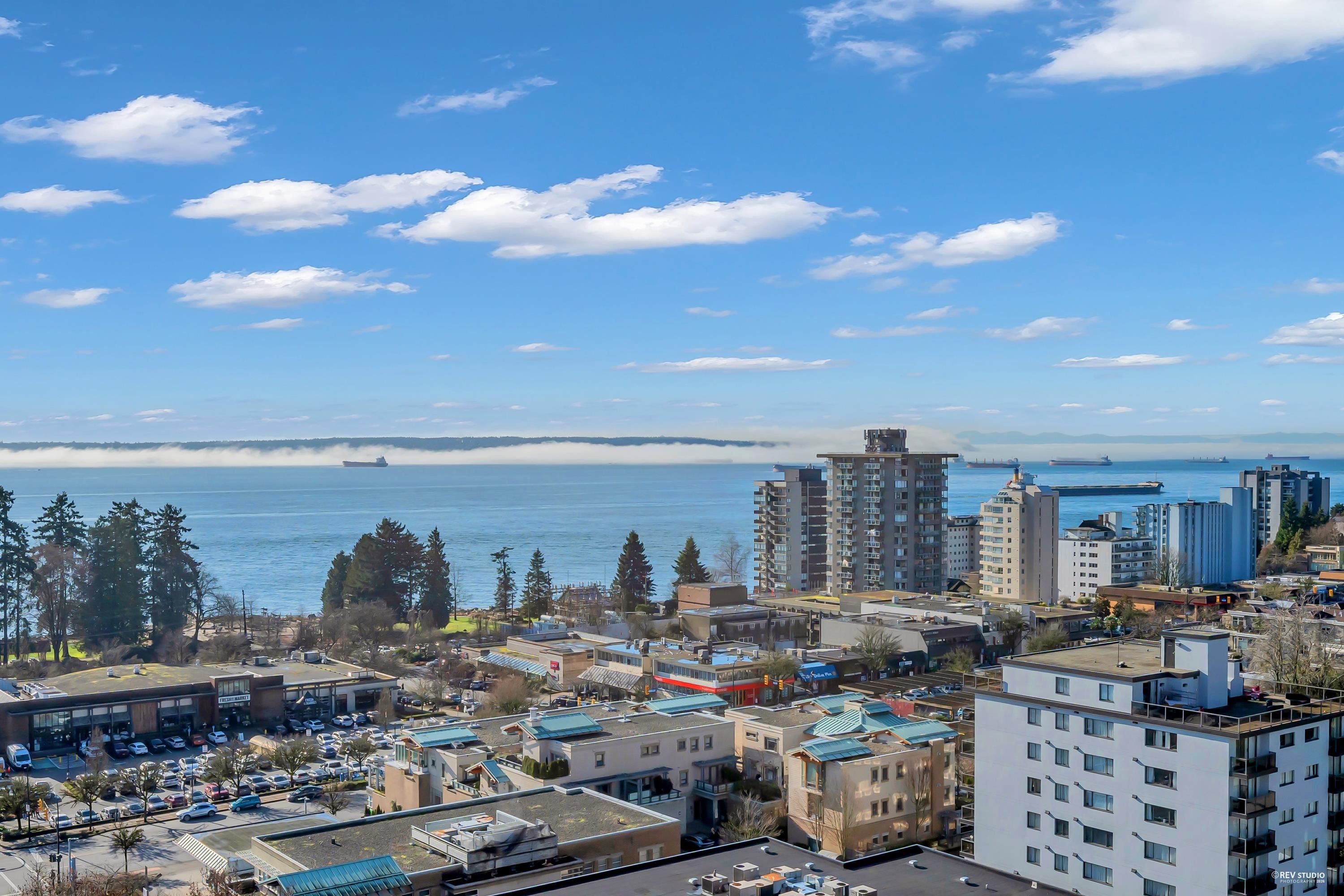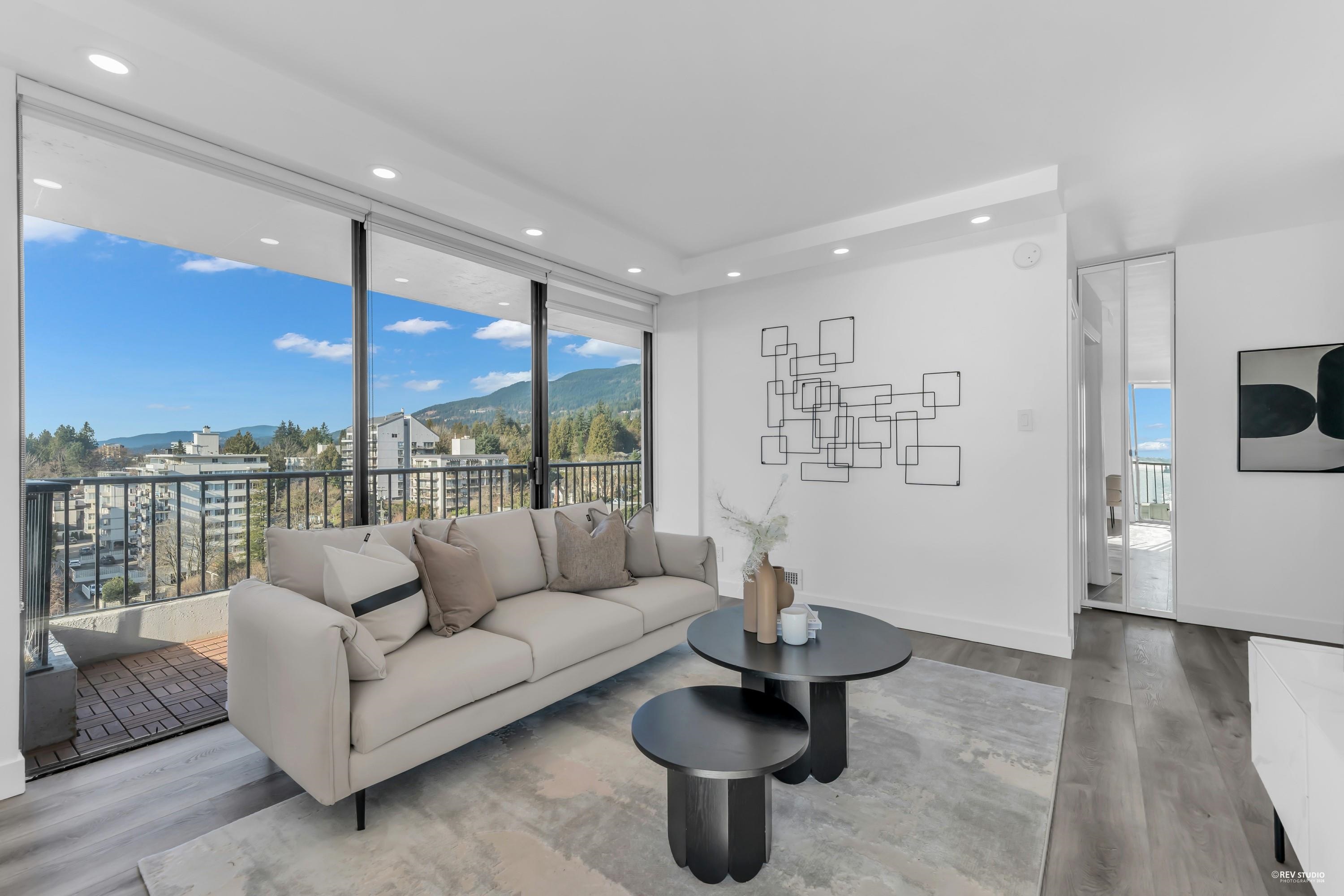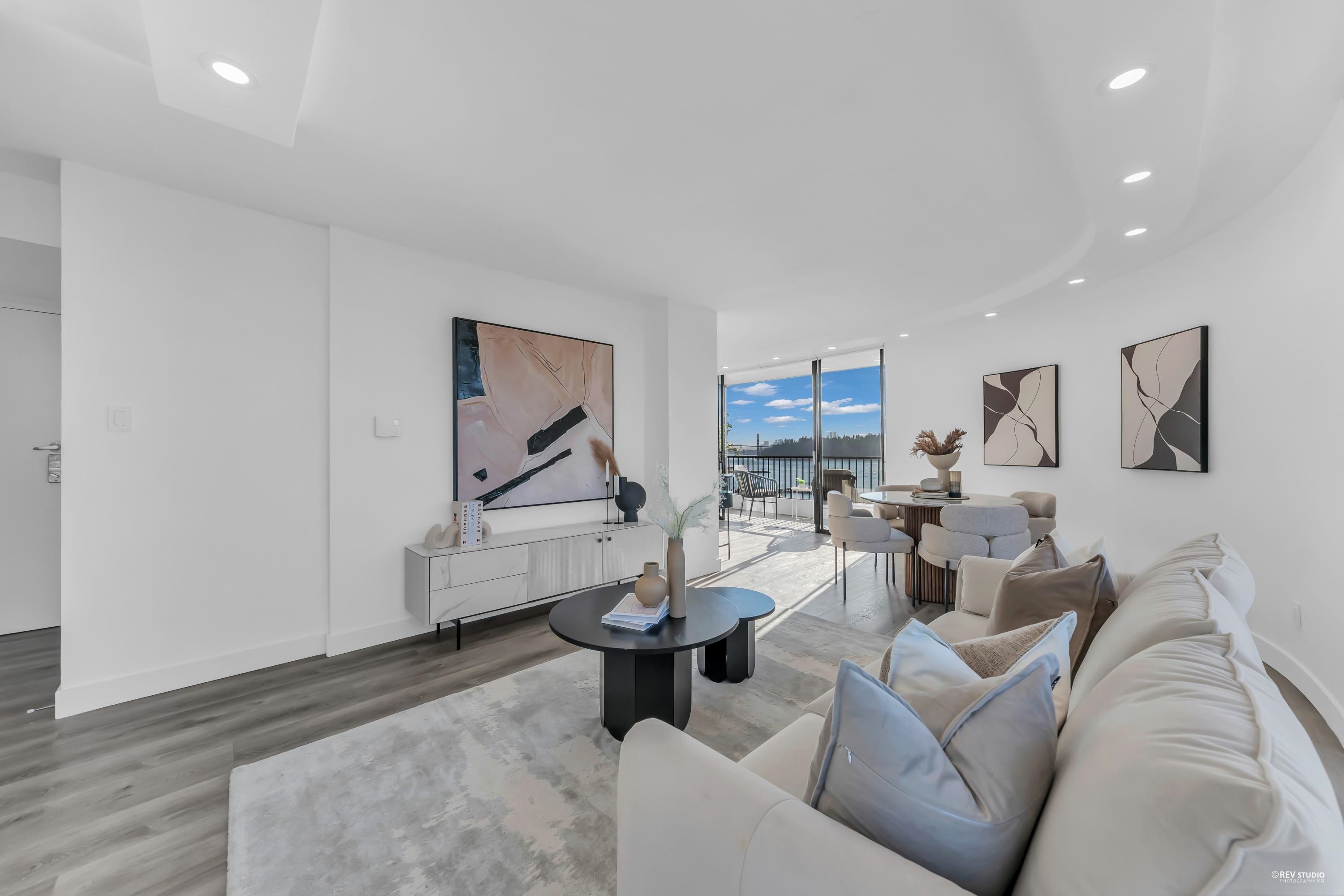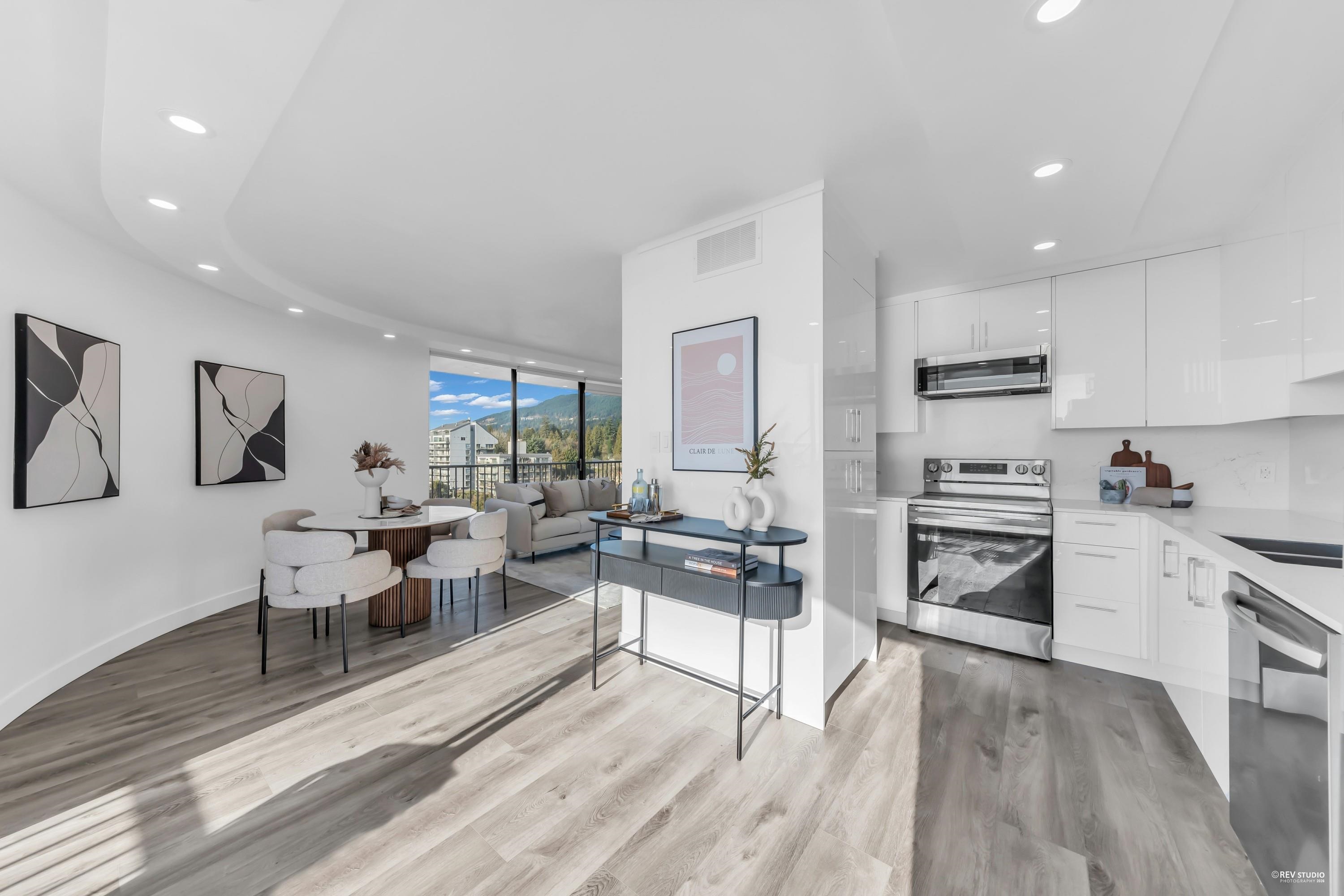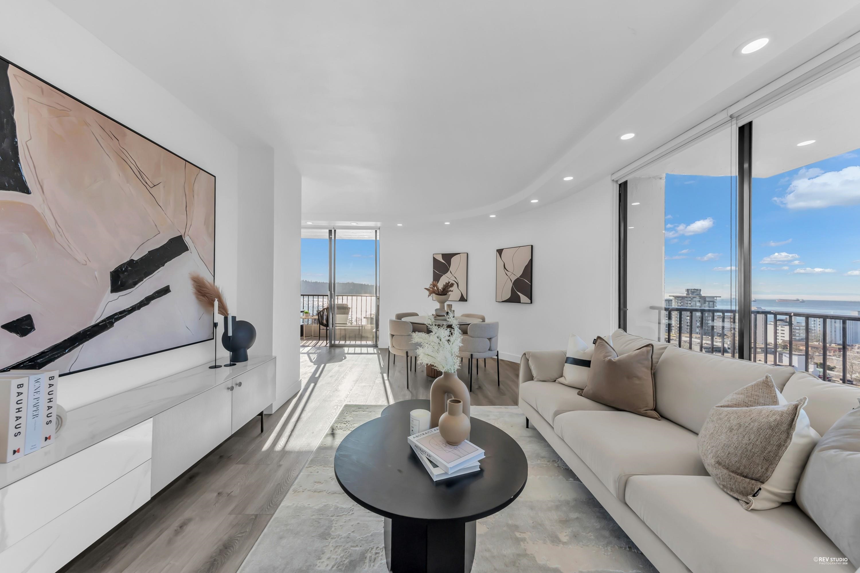 Experience sophisticated urban living at Westshore Place. This elegantly redesigned SW-corner unit offers a breathtaking panoramic view stretching from Mt. Baker to Vancouver Island. Perfectly positioned above neighboring buildings, this residence remains visually connected to the vibrant energy of Ambleside. Inside, floor-to-ceiling windows flood the spacious living areas with natural light, highlighting modern high-end finishes and in-suite laundry. The modern kitchen features sleek cabinetry and brand-ne...