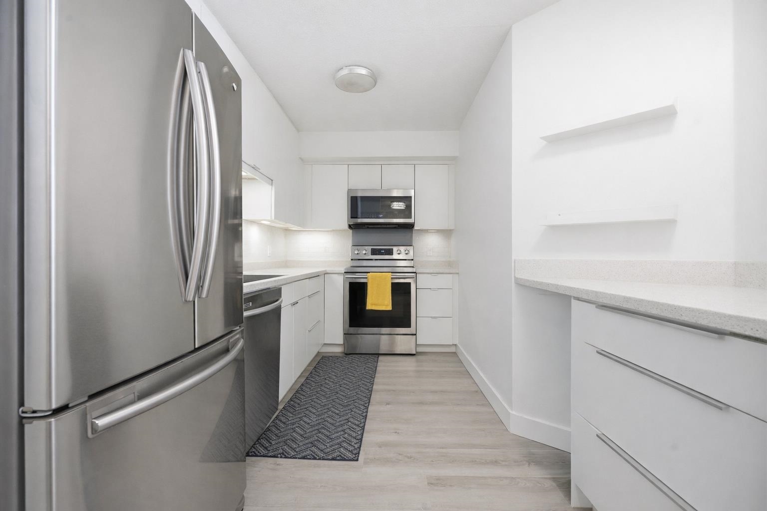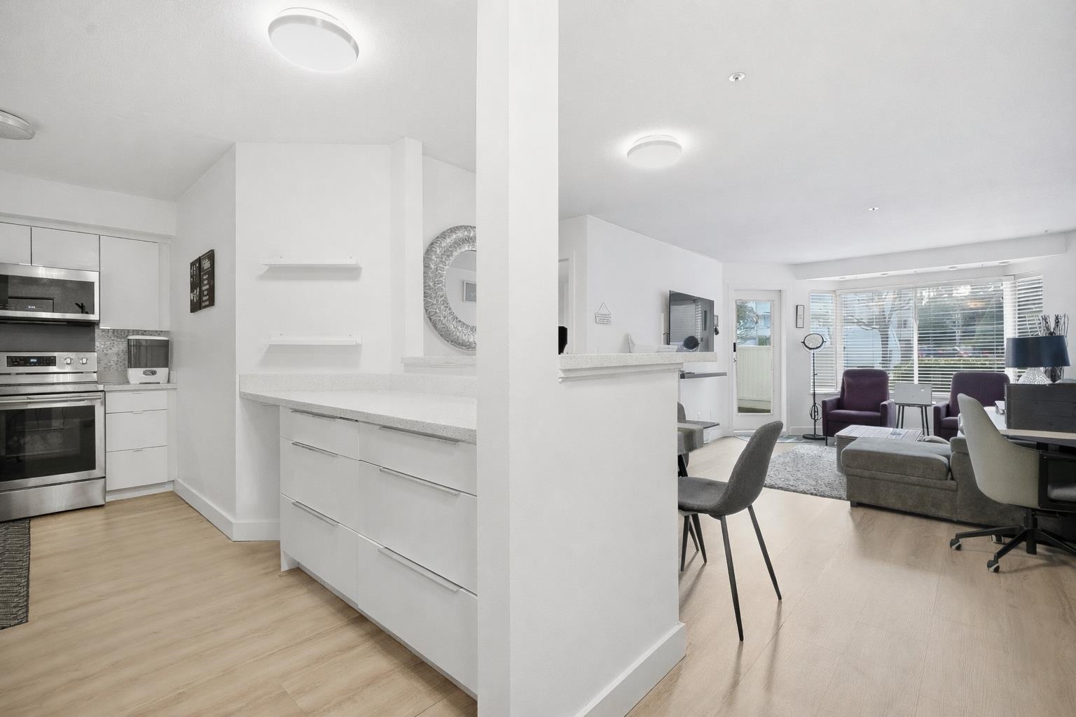BRIGHT FRESHLY PAINTED ground-level 2-bed, 2-bath home with over 900 sq. ft. of functional living space. Features an updated kitchen with quartz counters, soft-close cabinets, and stainless-steel appliances, wide-plank vinyl flooring, carpet in the primary bedroom, modern lighting, and ENERGY EFFICIENT baseboard heaters. Bedrooms are on opposite sides for privacy, and the spacious primary fits a king bed. 2 FULL BATHROOMS. Quiet side of the building with convenient PATIO ACCESS—park and bring groceries stra...