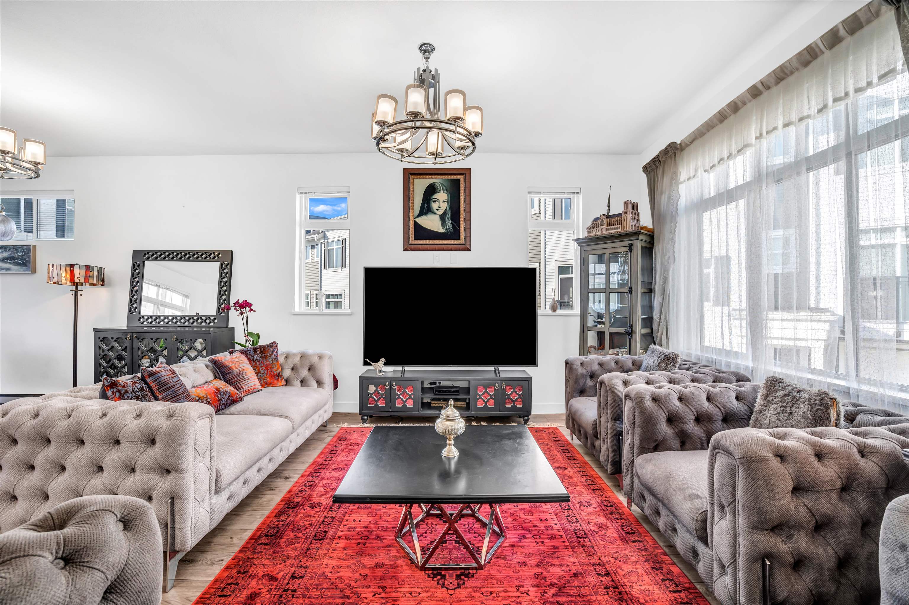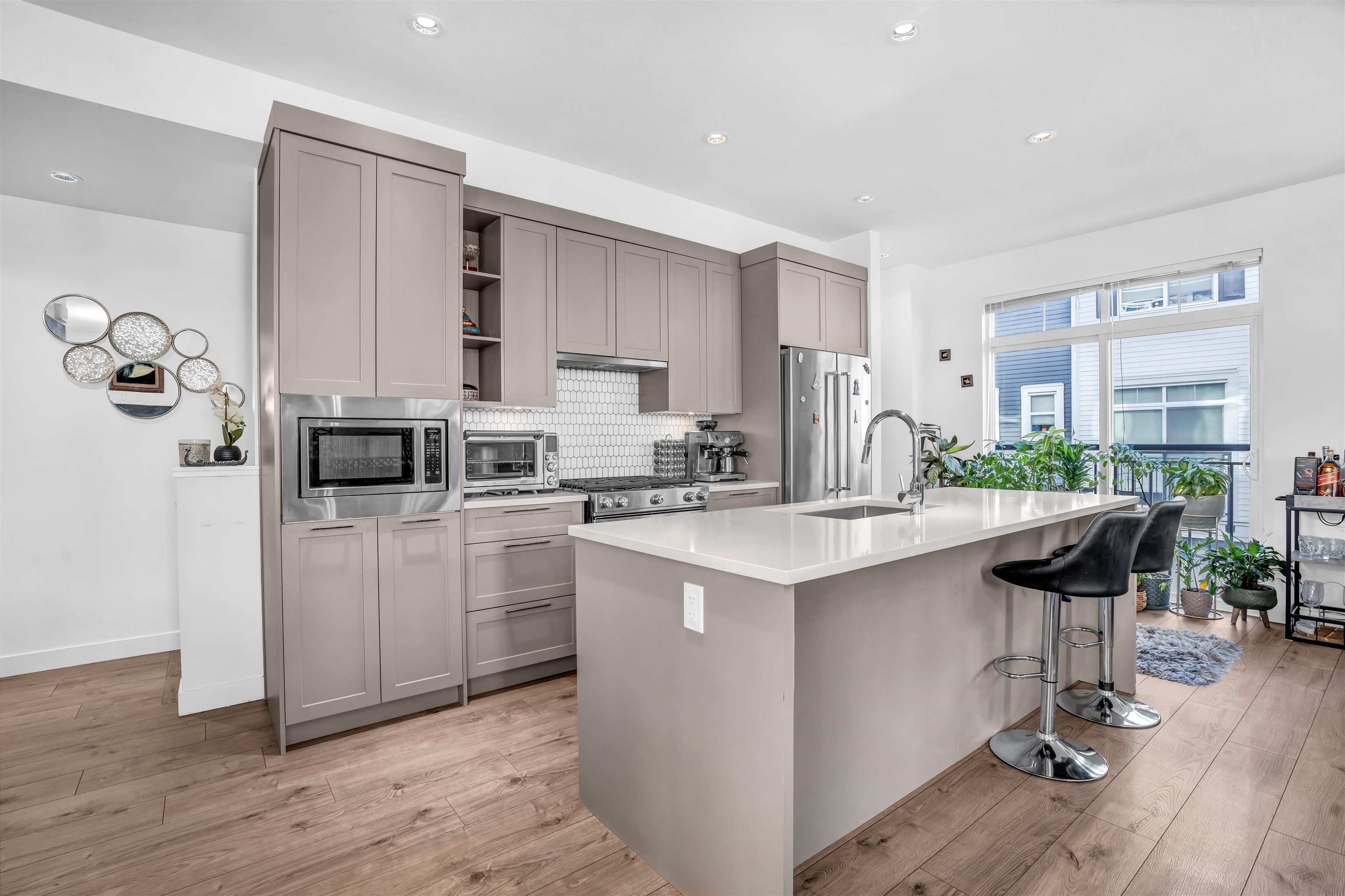 Welcome to Rocklin on the Creek by Woodbridge Homes - a rare end-unit townhome backing onto a peaceful greenbelt. This bright home offers 3 bedrooms, 3 bathrooms, and approx. 1,610 sq. ft. of thoughtfully designed living space with. The main level features an open-concept layout with 9-ft ceilings, oversized windows, and a gourmet kitchen complete with stone/quartz counters, gas cooktop, KitchenAid appliances, custom cabinetry. Entertain effortlessly with a built-in bar and step out to a private fenced yard...