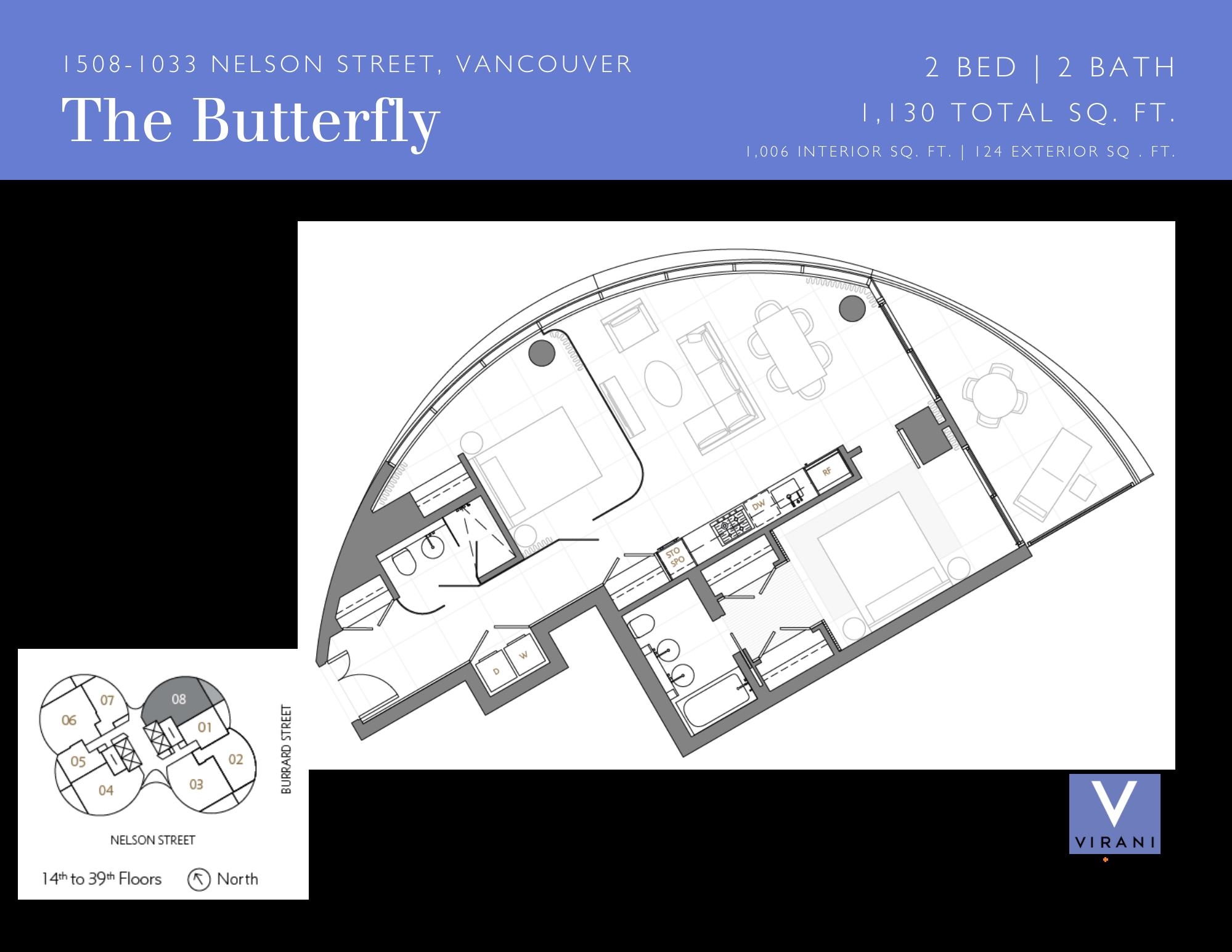 The Butterfly by Westbank, is a striking new addition to downtown Vancouver’s skyline. This world-class building features 331 one-of-a-kind homes. This 2-bedroom, 2-bathroom unit spans 1,130 sq. ft., with 1,006 sq. ft. of interior living and 124 sq. ft. of exterior space. The custom interior includes a eucalyptus veneered front door, large white porcelain flooring, and an Italian-crafted kitchen with Miele appliances. Floor-to-ceiling sheer drapery and curved glass walls enhance the light-filled space. LEED...