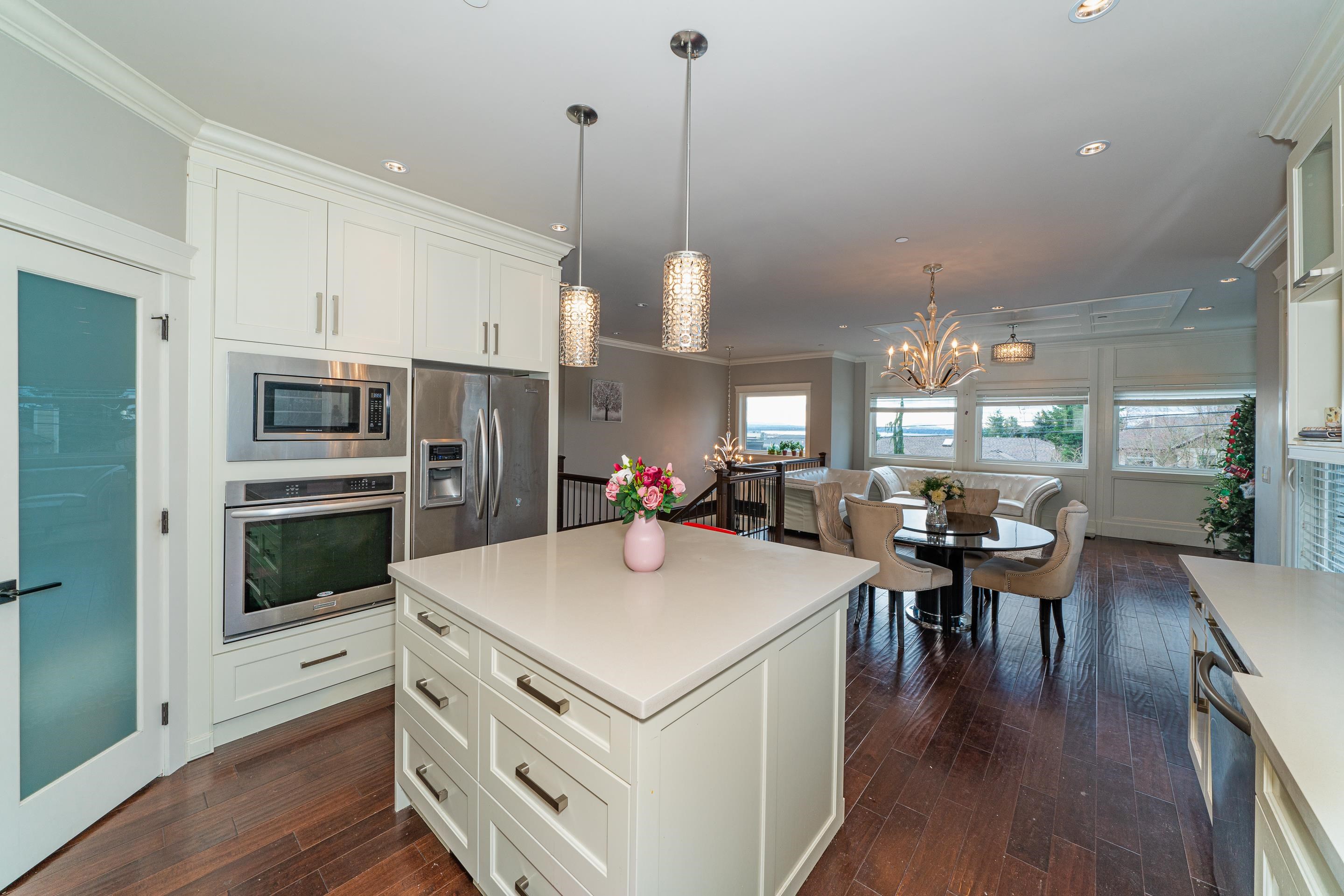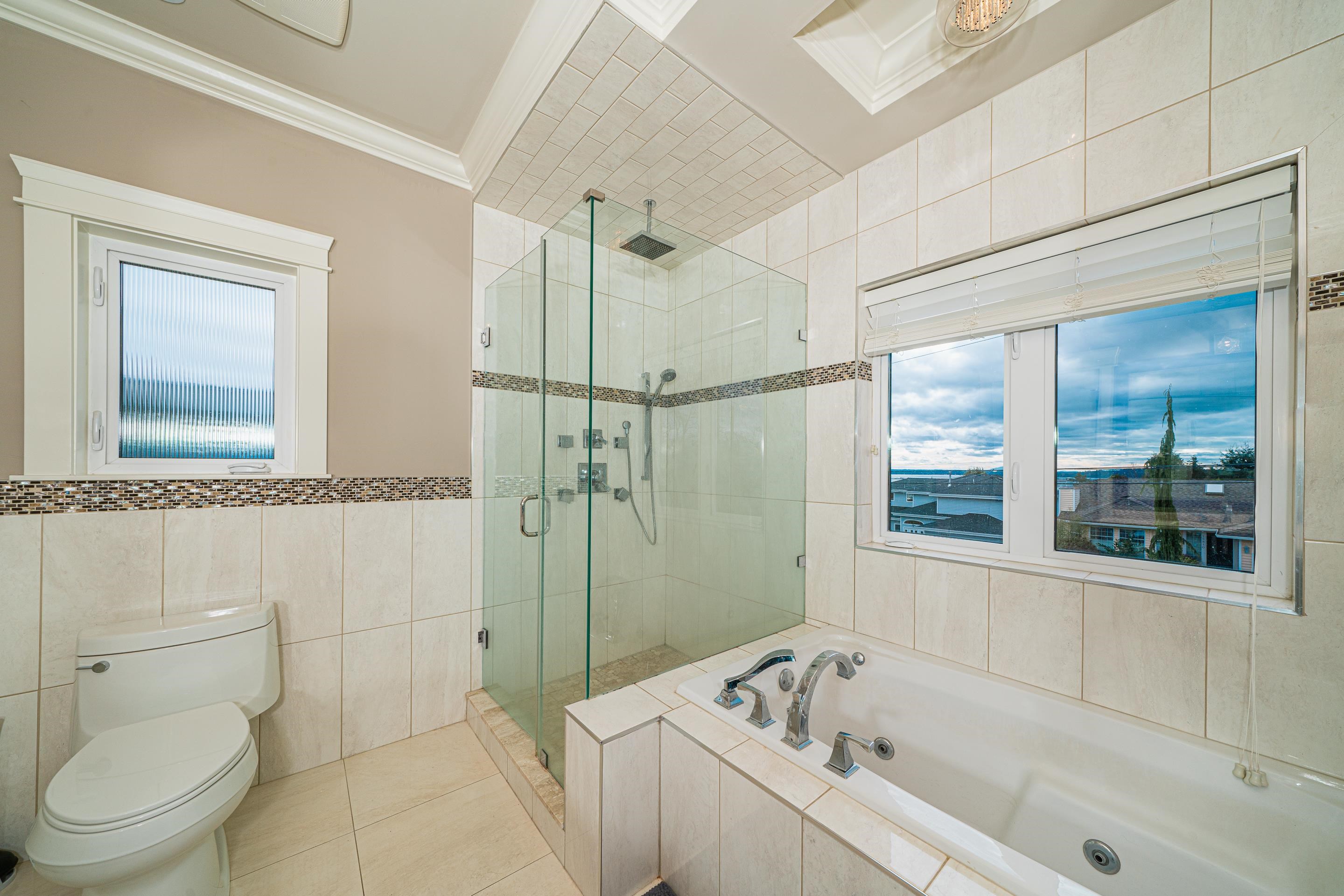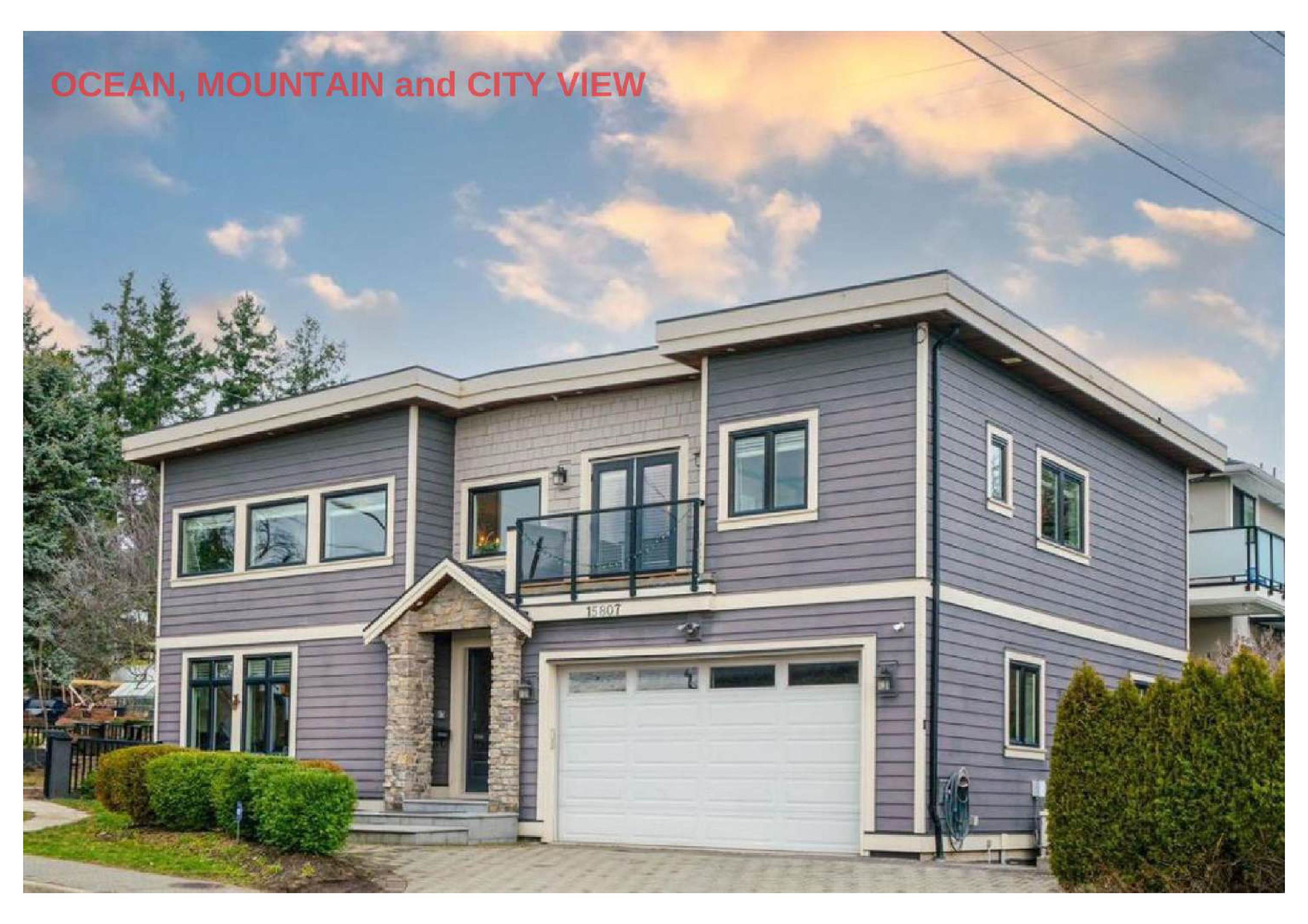 Stunning OCEAN, MOUNTAIN and CITY view. Premium custom built home featuring reverse floor plan with kitchen and master bedroom on the top floor to take advantage of the ocean views. Open concept floor plan with bright kitchen with accent lighting, granite counters, grand island and stainless steel appliances.The Master bedroom retreat with spa style ensuite, walkin closet, private balcony and view of ocean & Mnt. Baker. Main floor features 2 large bedrooms both ensuited and a large sunny office. Basement bo...