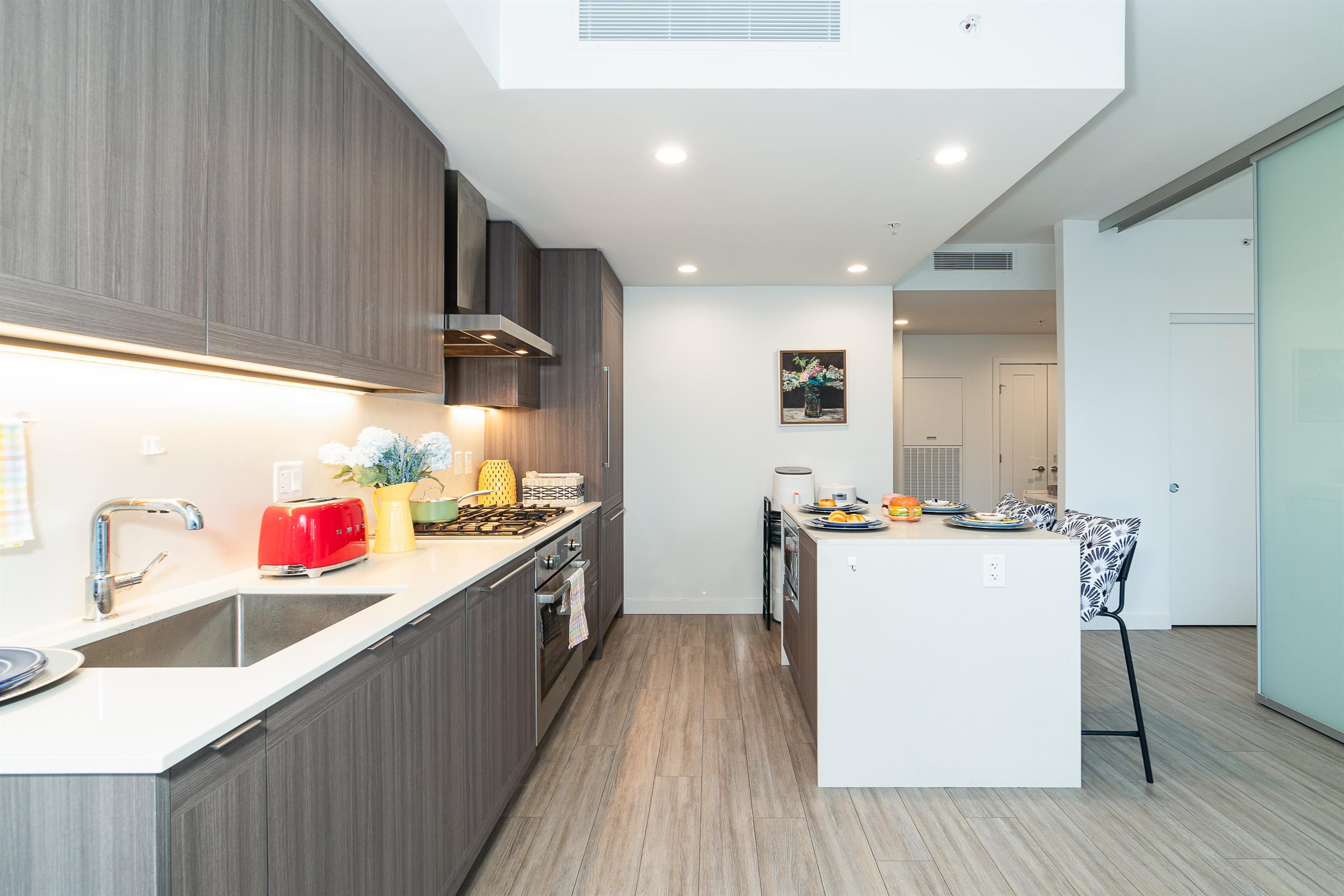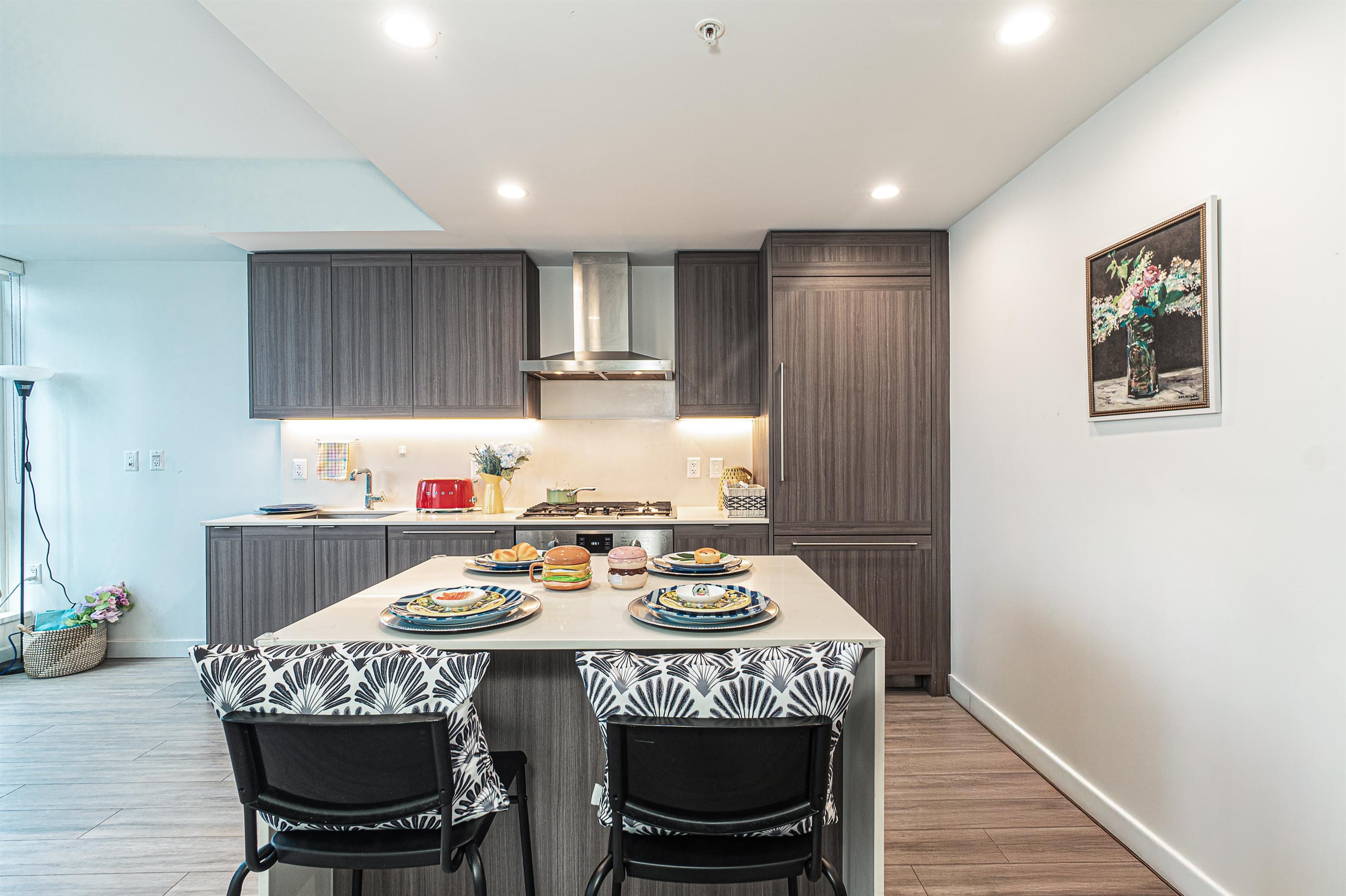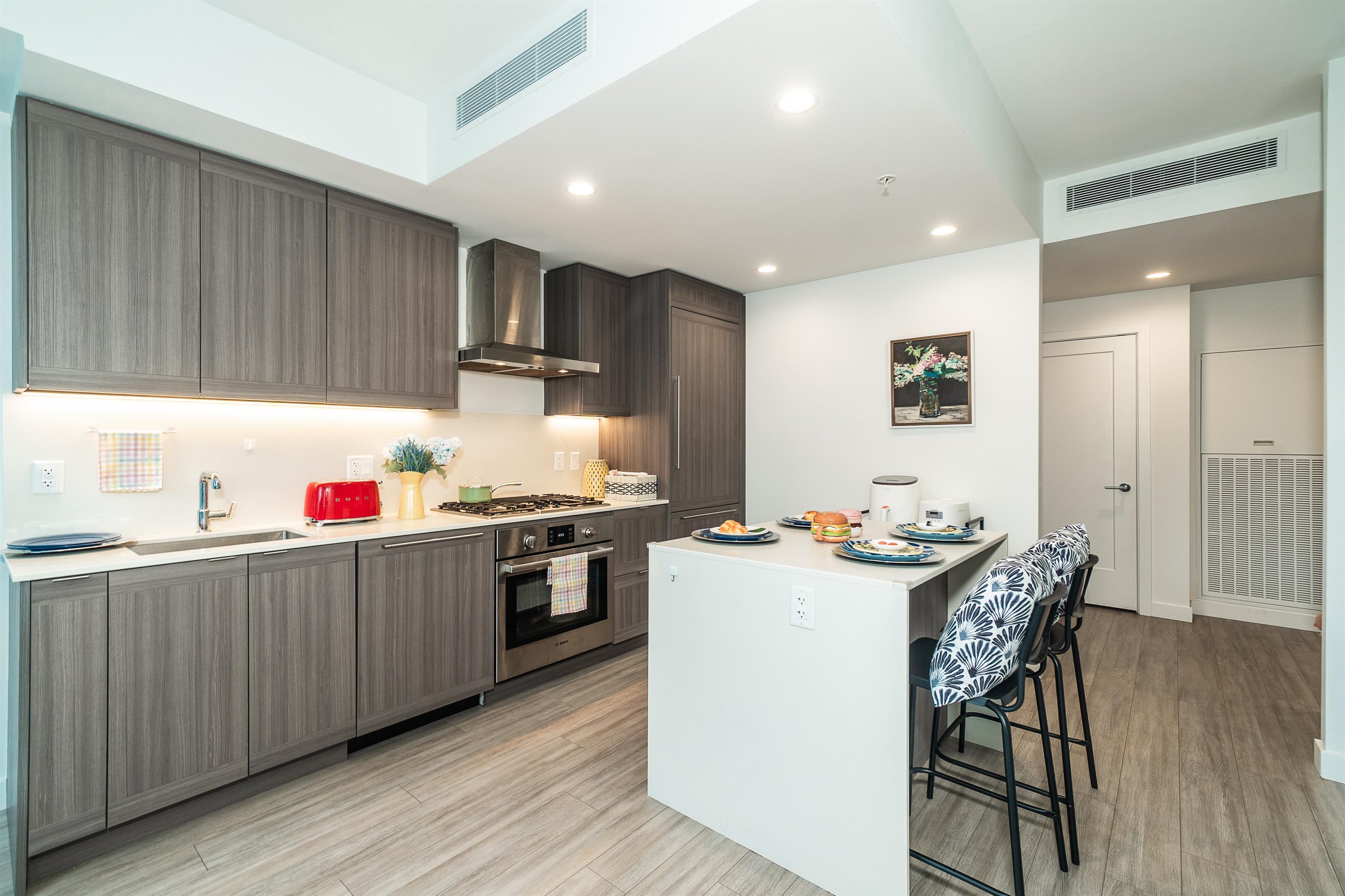 Welcome to this spacious 1 bedrooms & 1 bath unit in Lumina Starling at Brentwood area! Amazing snow-capped mountains & metropolitan views, over height ceilings, very spacious bdrm, full size kitchen w/stainless steel appliances, full size stove, full size fridge & full size dishwasher! Nice outdoor balcony for your entertainment gathering! Full size washer/dryer, airy & tasteful feelings through out! One parking w/ EV charging & one storage locker, secured building, location, location, location, reflecting...