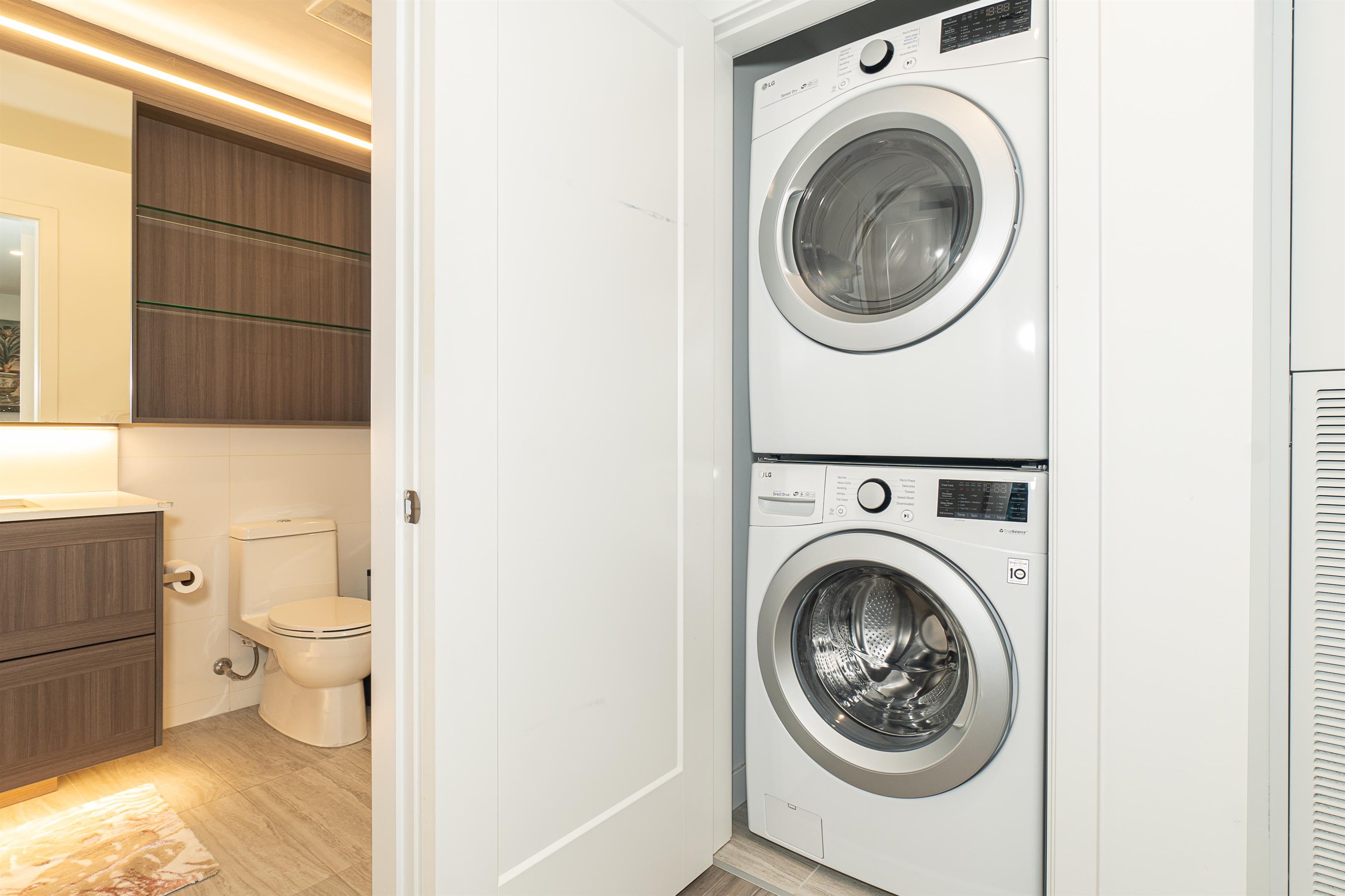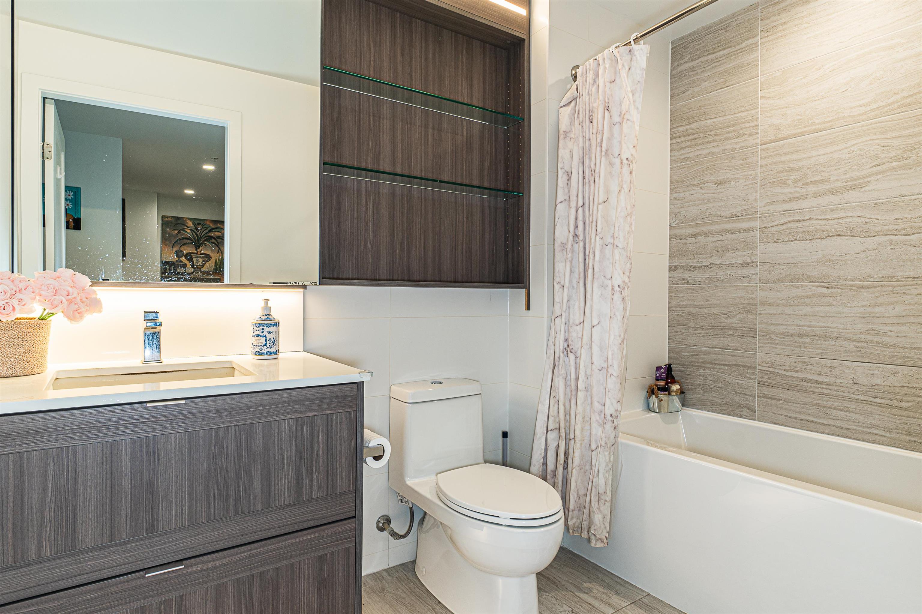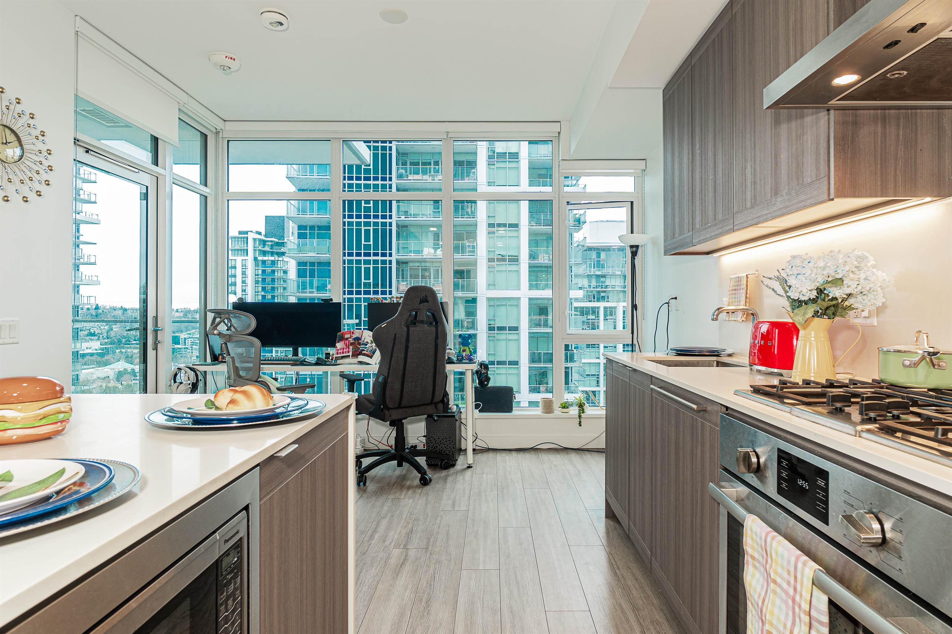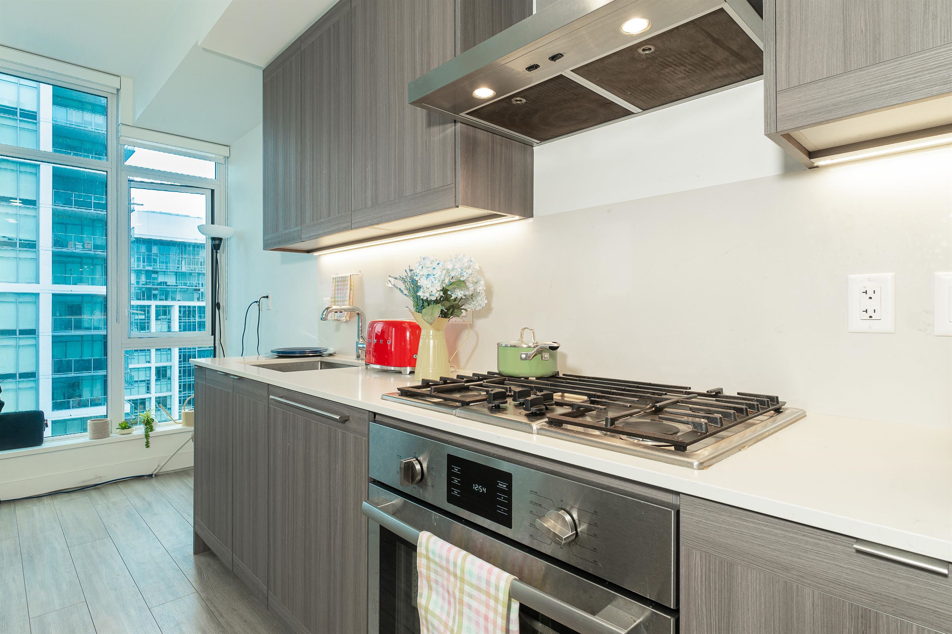 Welcome to this spacious 1 bedrooms & 1 bath unit in Lumina Starling at Brentwood area! Amazing snow-capped mountains & metropolitan views, over height ceilings, very spacious bdrm, full size kitchen w/stainless steel appliances, full size stove, full size fridge & full size dishwasher! Nice outdoor balcony for your entertainment gathering! Full size washer/dryer, airy & tasteful feelings through out! One parking w/ EV charging & one storage locker, secured building, location, location, location, reflecting...