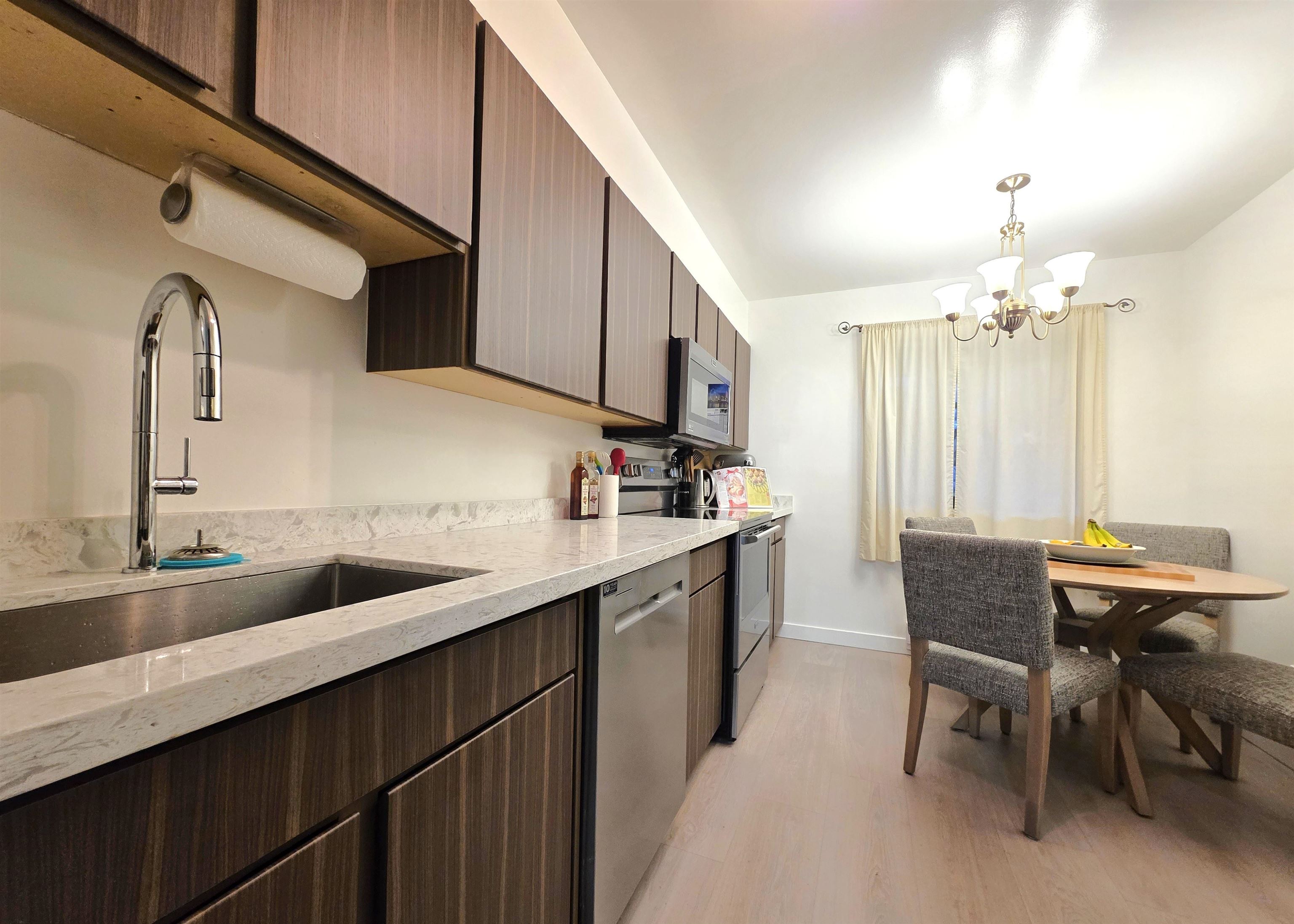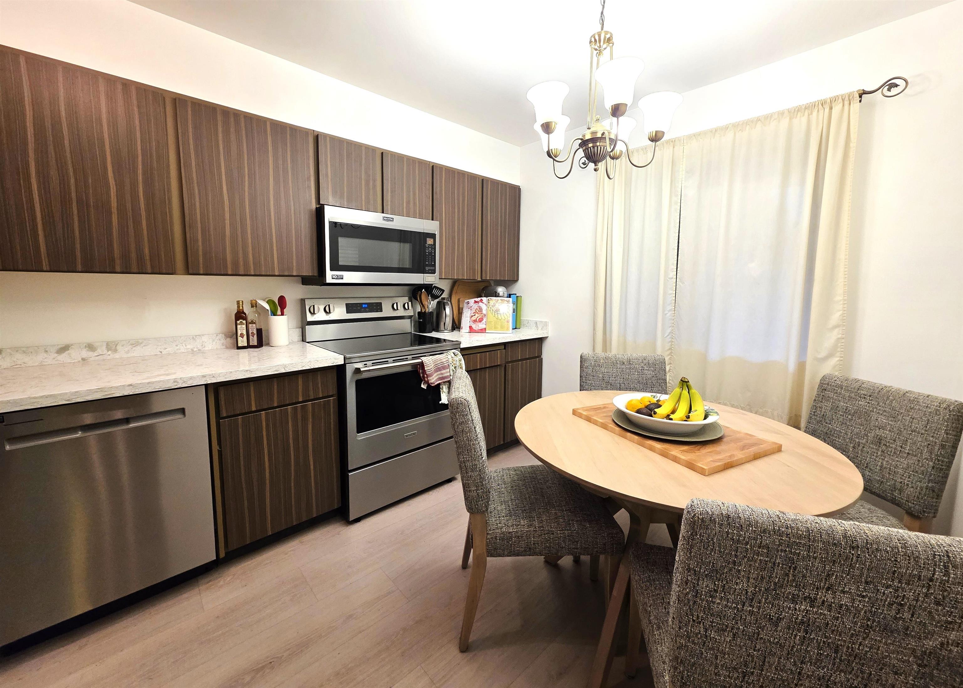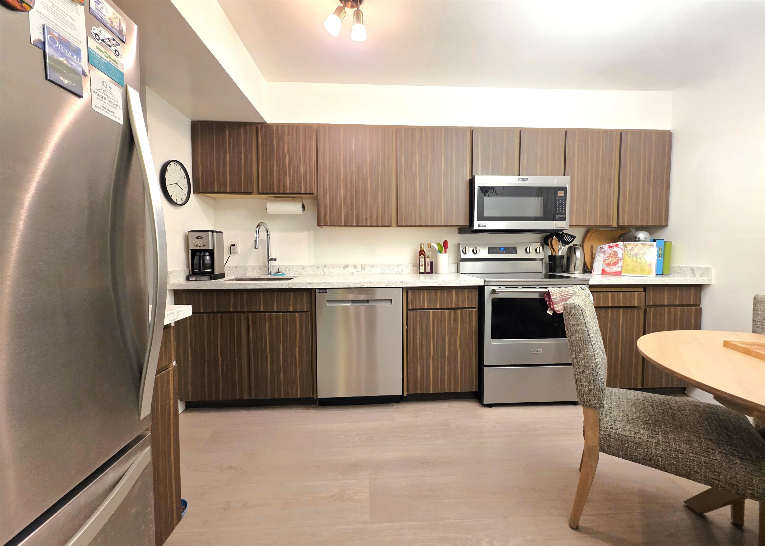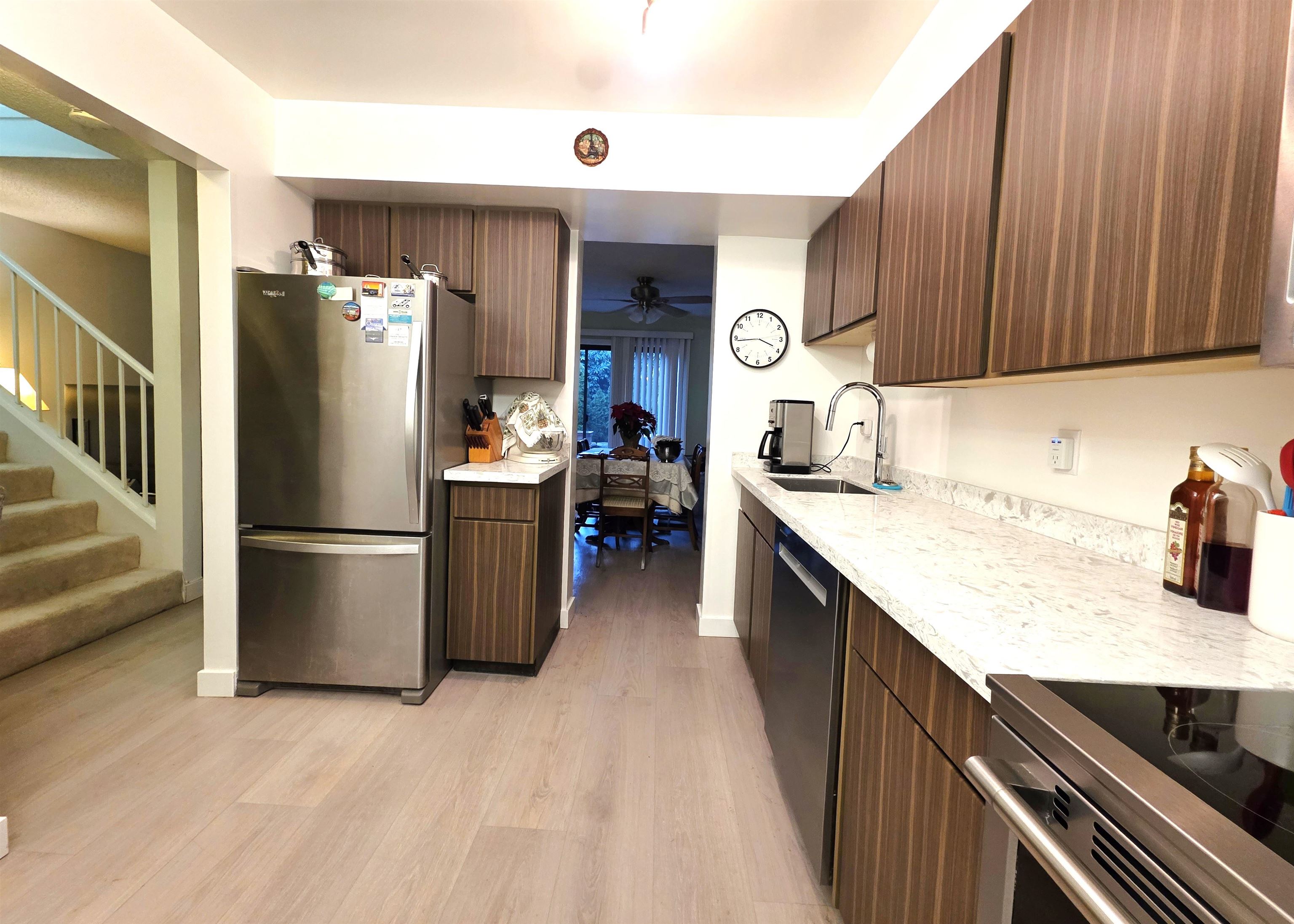 Welcome to Timberlane! This nicely redone 3 generous-sized bedroom, 2 bath townhome features a brand new kitchen with new cabinet doors and countertop, plus a brand new composite deck with new patio door and screen, along with a new hot water tank. Enjoy peace of mind with additional renovations completed in 2023, including updated vinyl flooring, a refreshed powder room, new stove, dishwasher, fridge, and fresh paint. Family-friendly complex close to schools, parks, Green Timbers trails, transit, Surrey Me...