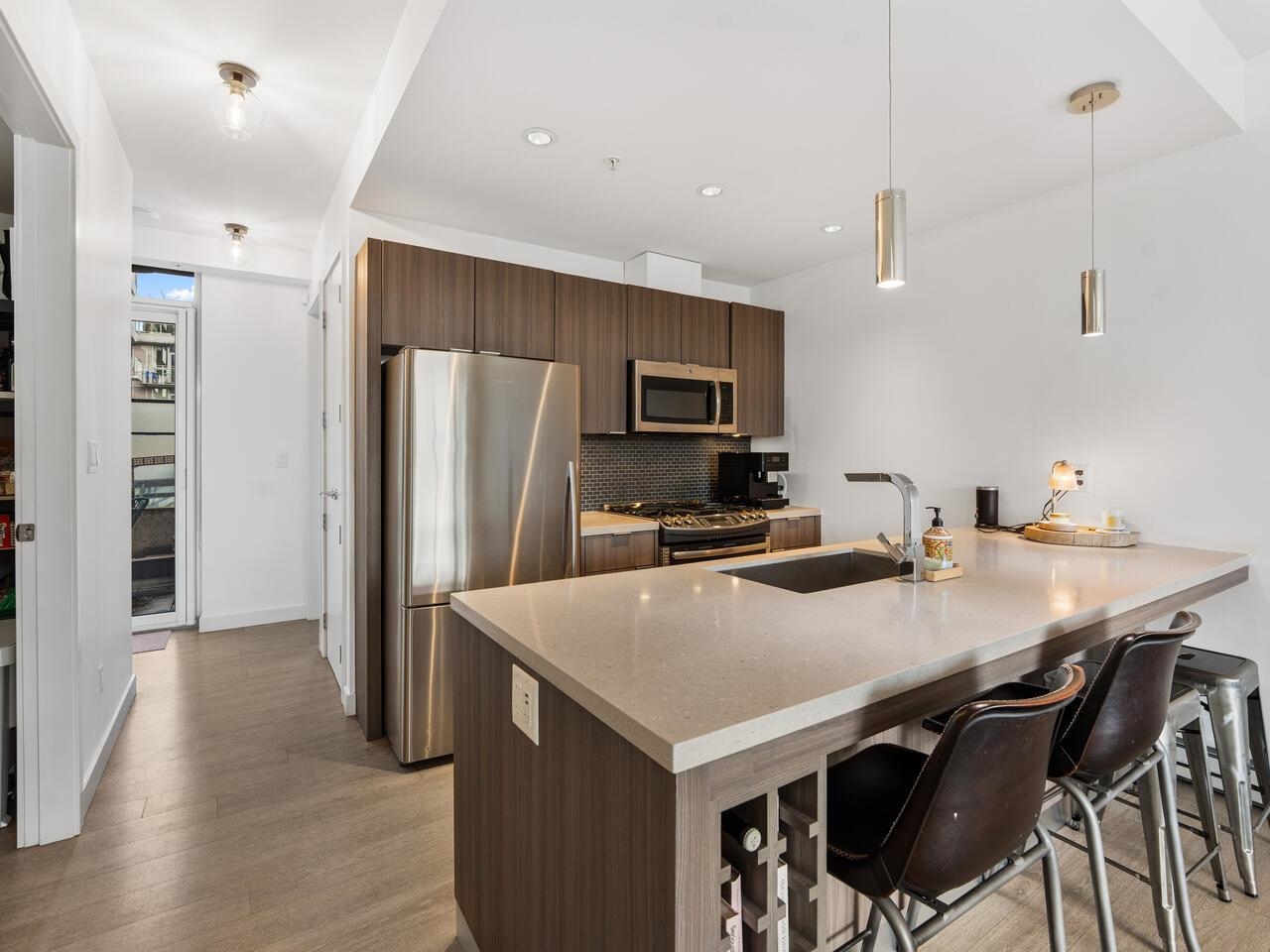 **Open House March 22nd 2-4pm!** Stunning 2 bed + den, 2 bath corner 2nd floor garden suite in Olympic Village’s Proximity. Bright & airy with floor-to-ceiling windows & 9’ ceilings. Bedrooms are thoughtfully separated for privacy, a spacious den ideal for a home office/pantry/in suite storage. Gourmet kitchen features Caesarstone countertops, full-size stainless steel appliances, gas range, breakfast bar seating & lots of counter space. Enjoy an incredible 393 sq ft private patio/garden oasis surrounded by...