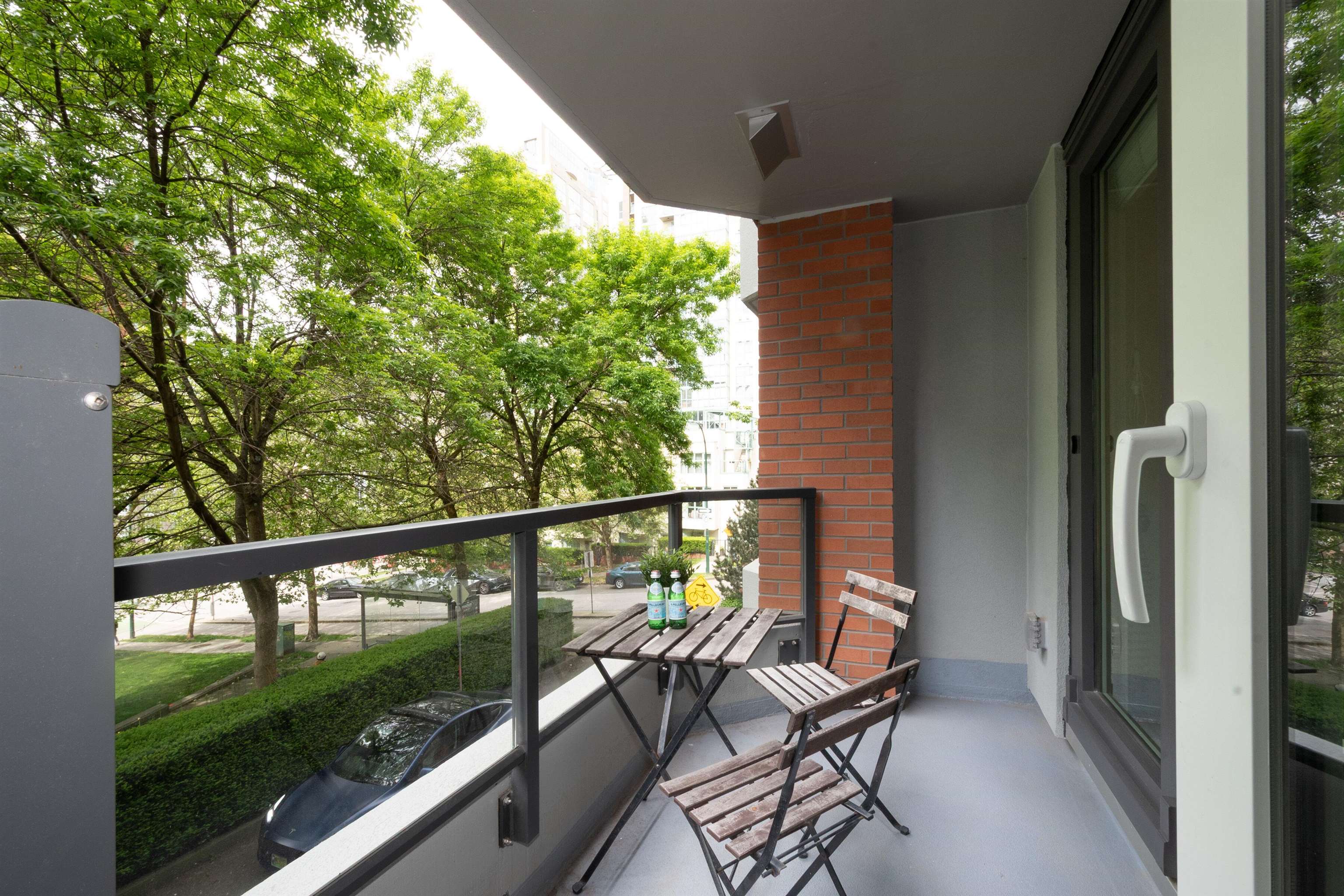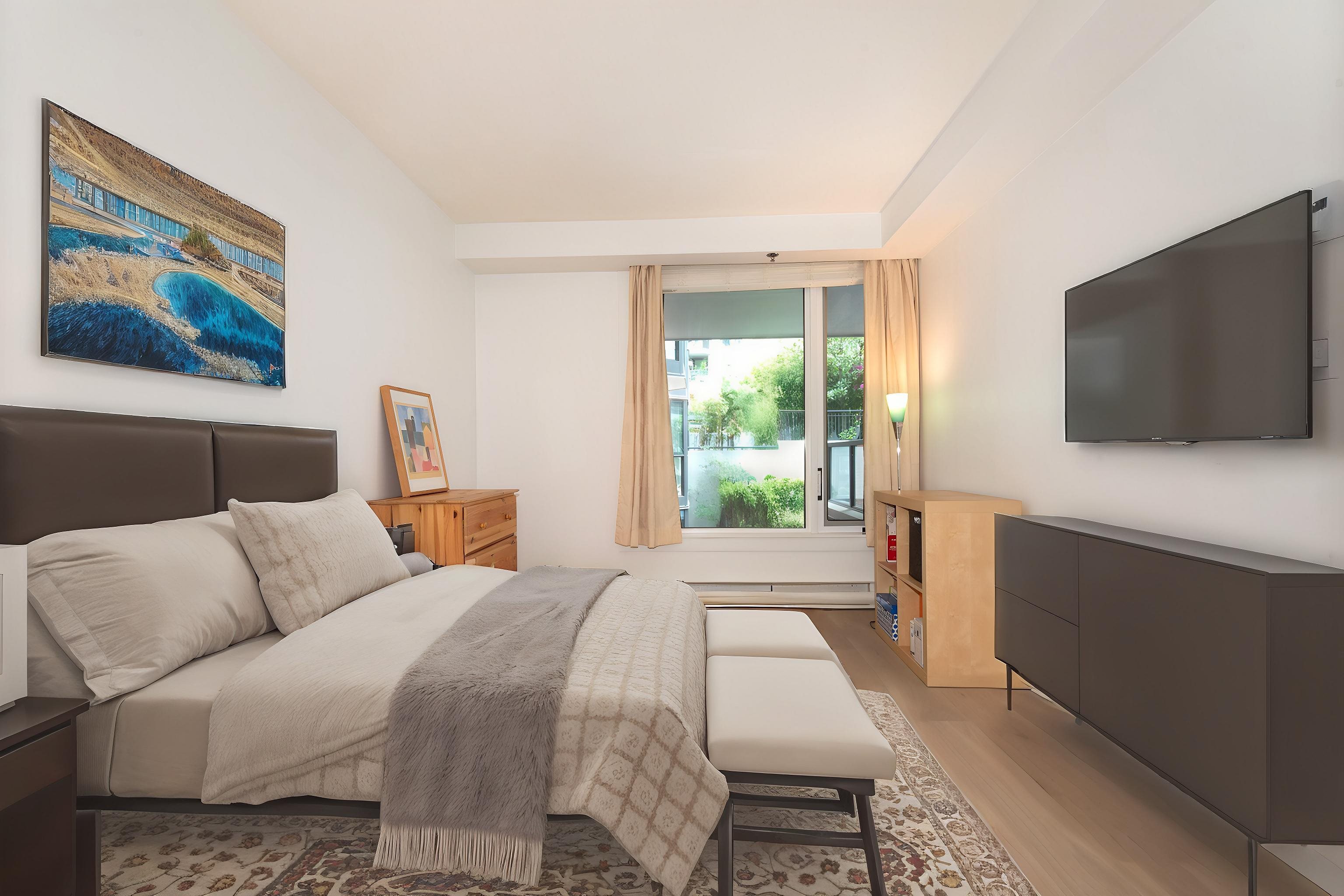 Sharpley Priced!! Prime Beach Ave location - just 1 block to the seawall and marina! This exceptionally large 2 BR, second-floor unit overlooks May & Lorne Brown Park features a private entry, brand-new engineered hardwood flooring, and fresh paint throughout. Bright living room boasts floor to ceiling window and corner electric fireplace. The building has been completely updated in 2024 with Rainscreen exterior, windows and doors, roof, and balconies, and 3 elevators will be updated this year (all paid!) F...