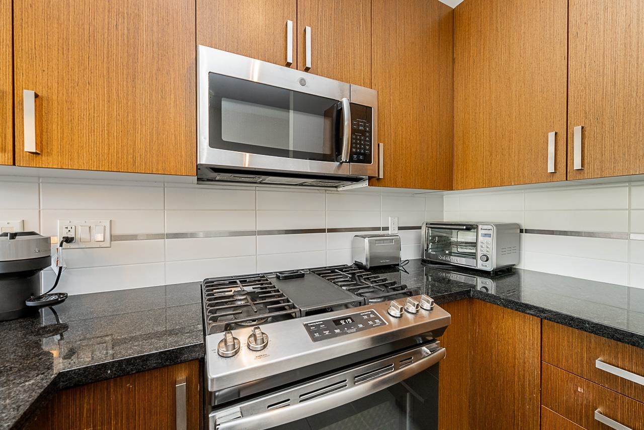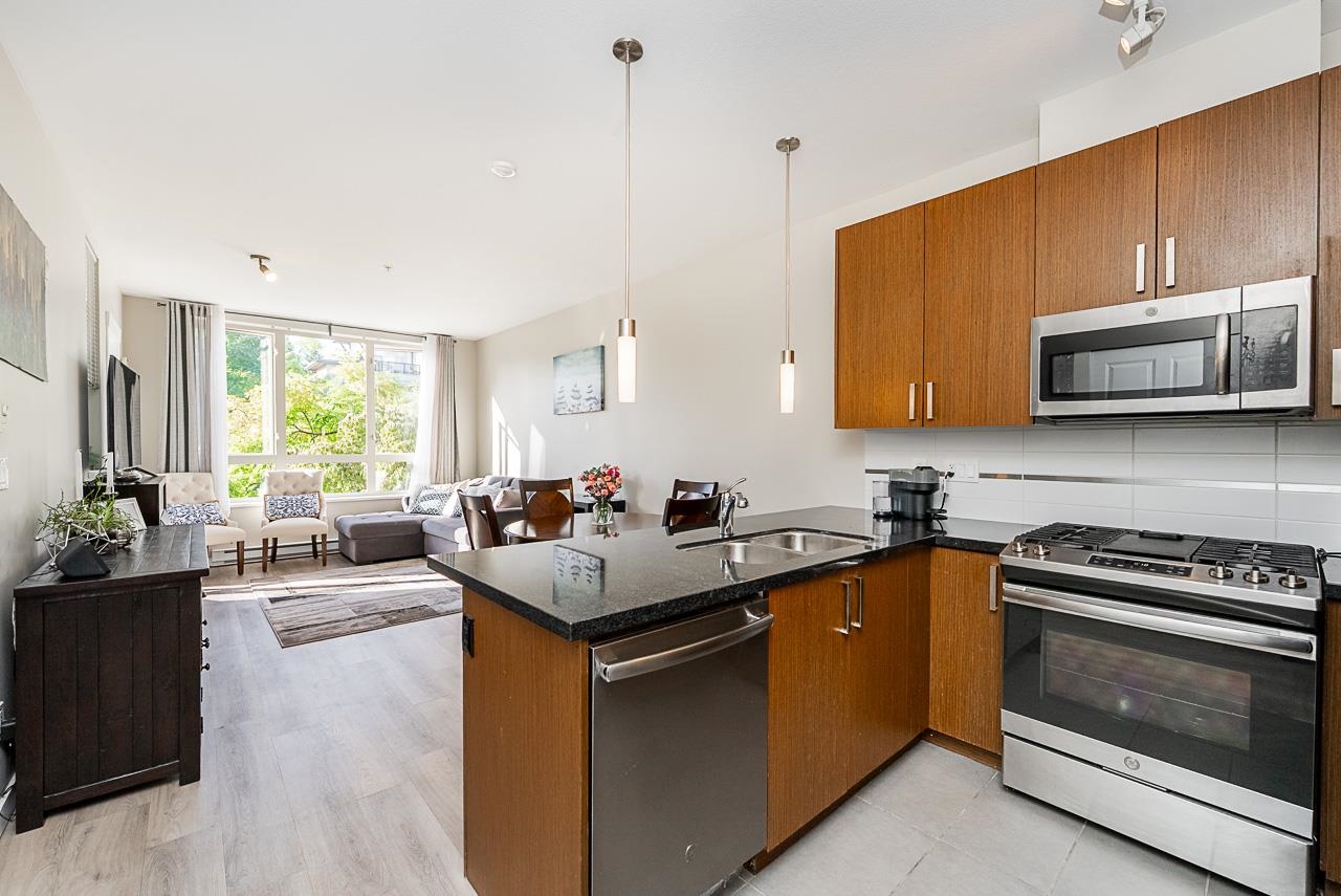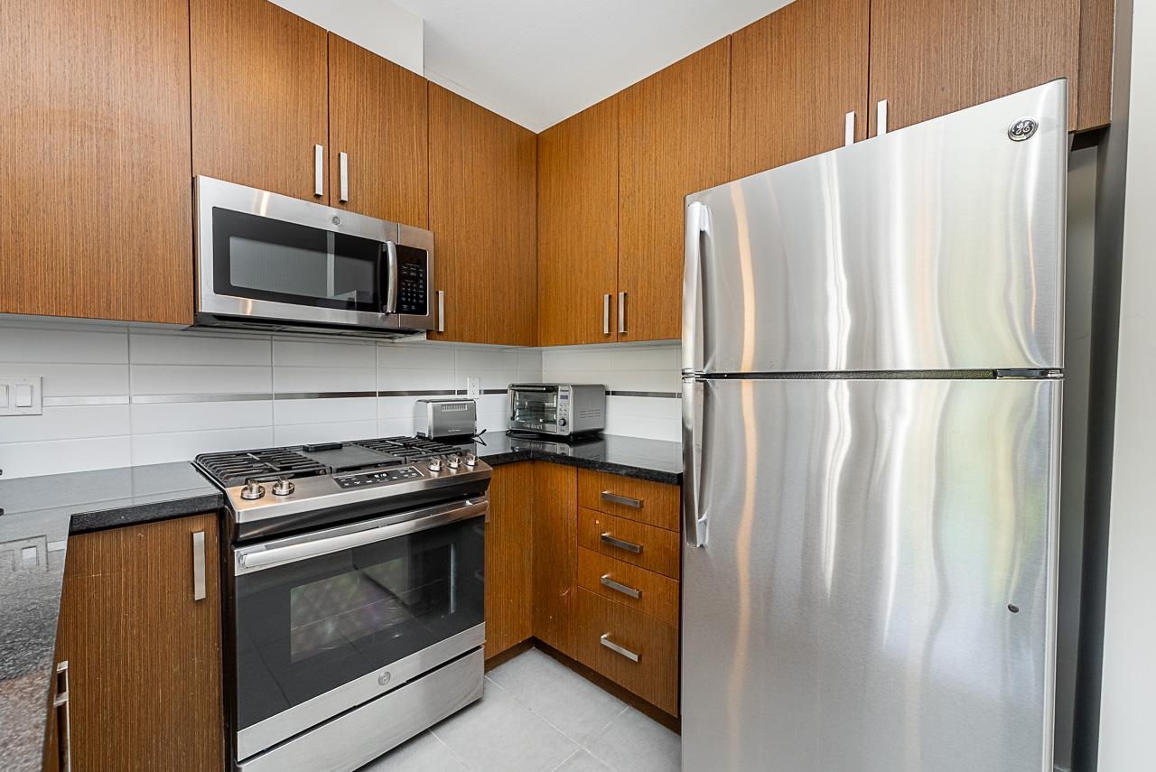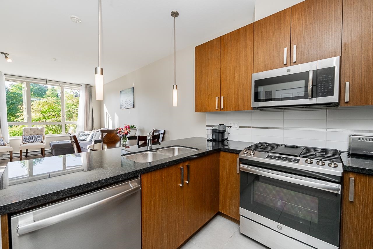You will love living at THE MORGAN! Enjoy this light filled south facing apartment with spacious and open floorplan, 9' ceilings and wonderful view of the quiet courtyard with trees and flowerbeds. Well laid out kitchen shows off with granite countertops, gas stove, stainless steel appliances, shaker style cabinets with plenty of storage and full sized in-suite laundry. Large and bright bedroom is facing the courtyard for additional privacy. Den can be used as additional office space or even converted into ...
