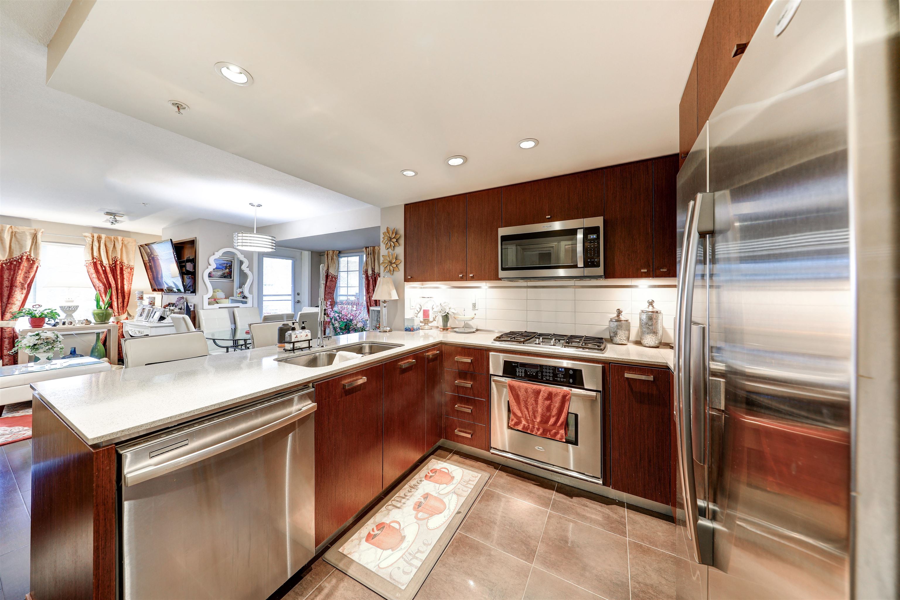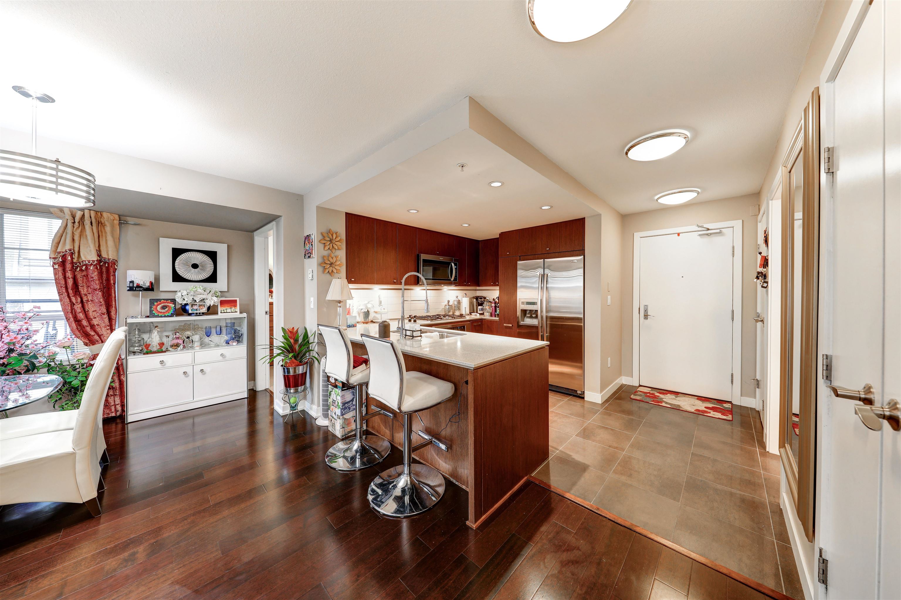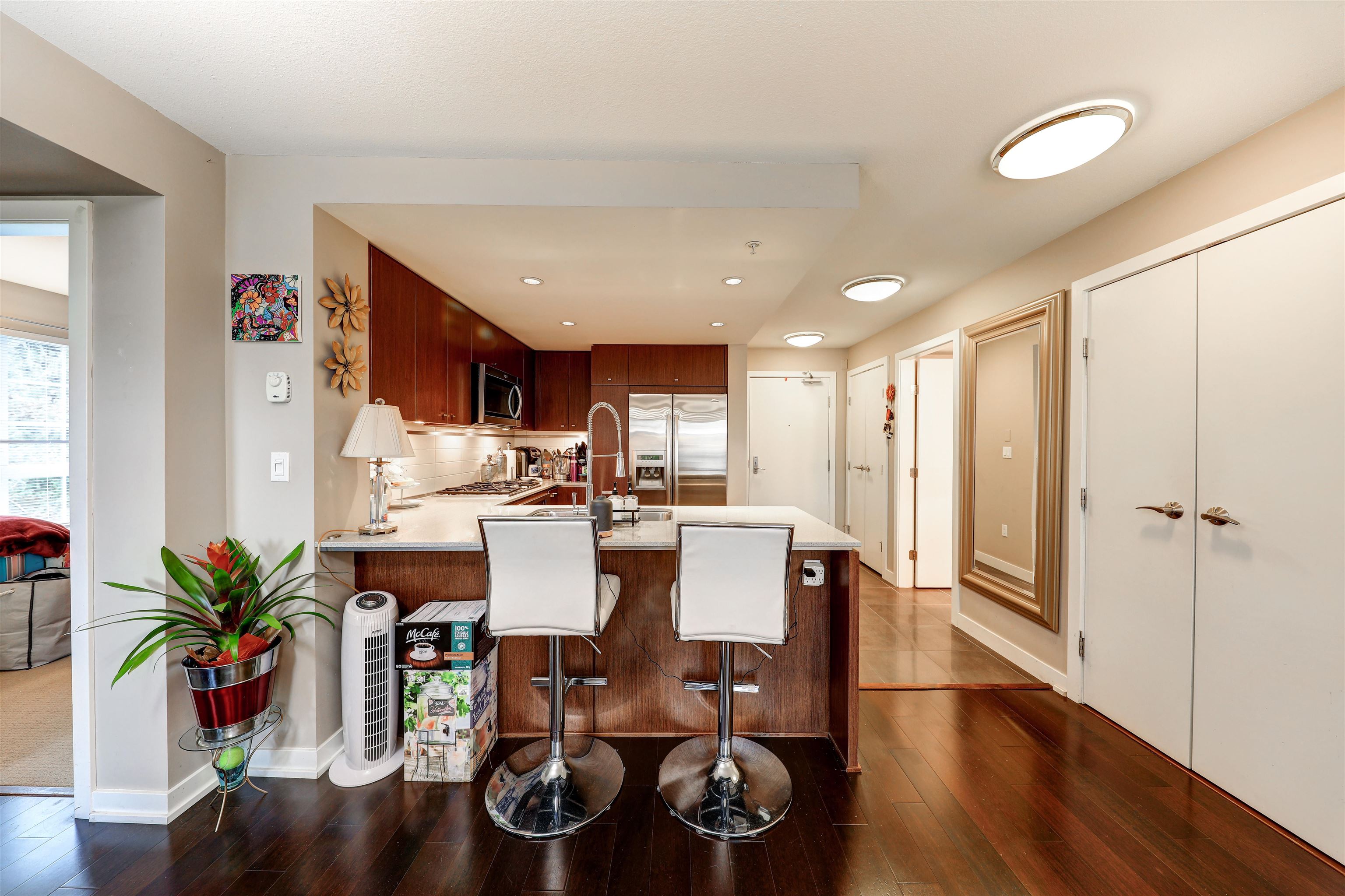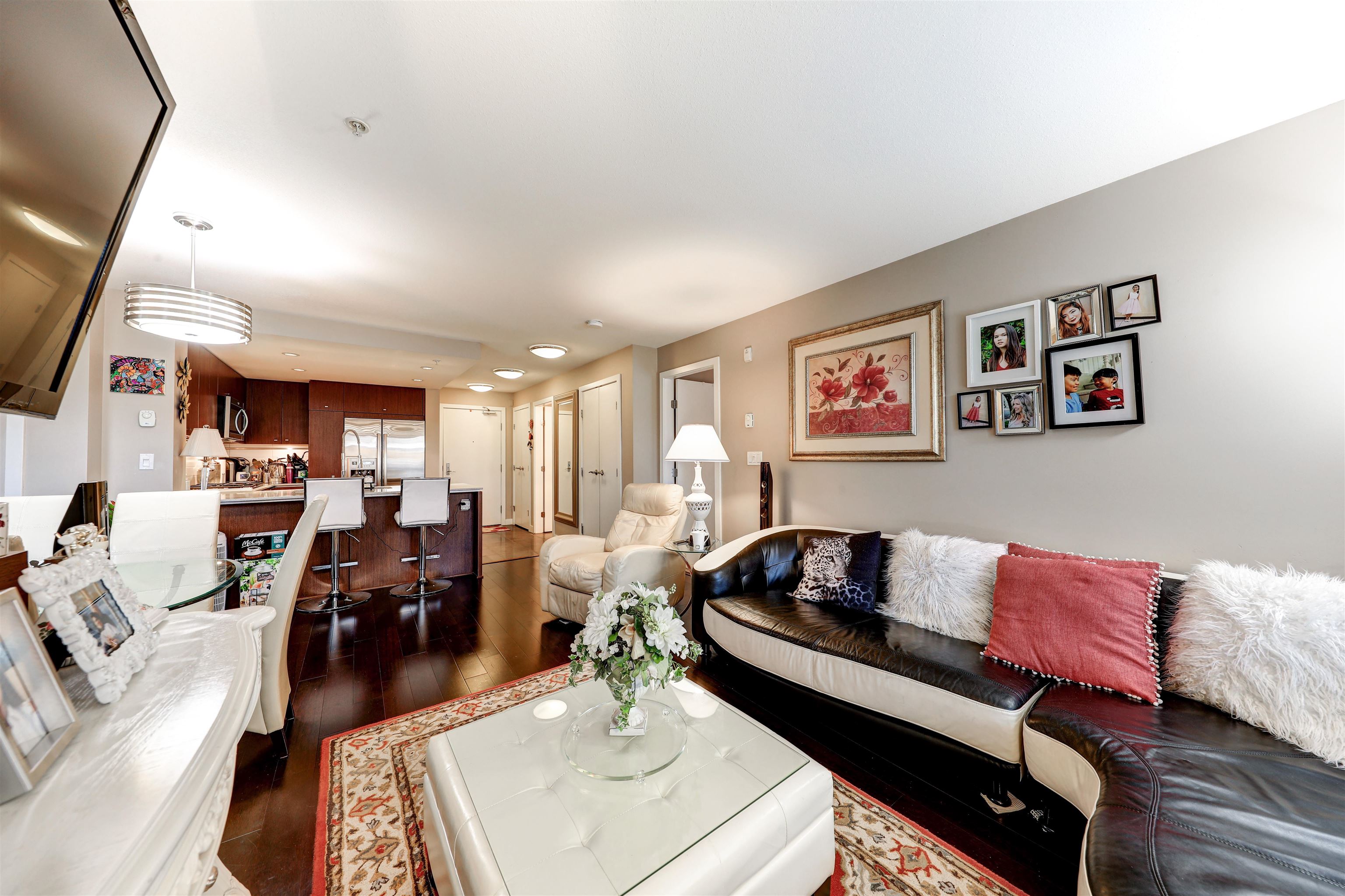 Private corner unit! Facing South east and North east. This unit boasts a functional layout, gourmet kitchen with high end s/s appliances, Caesar stone countertops, walnut kitchen cabinetry, spa inspired bathrooms with luxurious soaker tub, shower, natural gas cooktop, hardwood floor, porcelain tiles, spacious covered wrap-around balcony where you can enjoy your gatherings for BBQ, overlooking the courtyard garden. Live directly above High Street's vibrant shops, cafés, spas, and major retailers like Save-O...