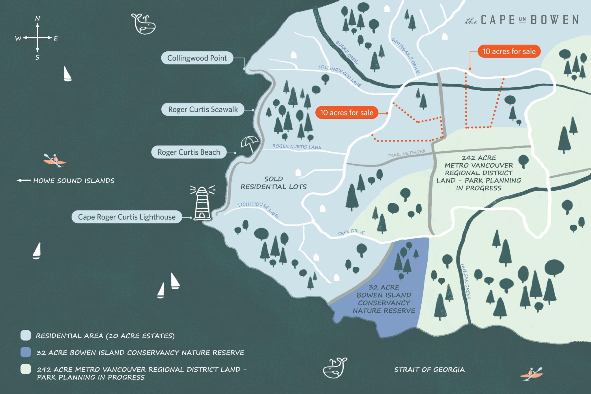 SW tip of Bowen Island. Along the western waterfront is a 1-km sunset trail connecting three iconic viewpoints. 272 acres is a managed, publicly accessible conservation park, incl.112 acres of southern waterfront. Property features: creek, fern valley, gently sloping forest, meadow of foxgloves. Certified wells. Septic pre-approved. 48,438 sf total buildable area permitted: primary residence, secondary dwelling, and up to 20 secondary structures for farm stable, home-based business, workshop, studio, guest ...