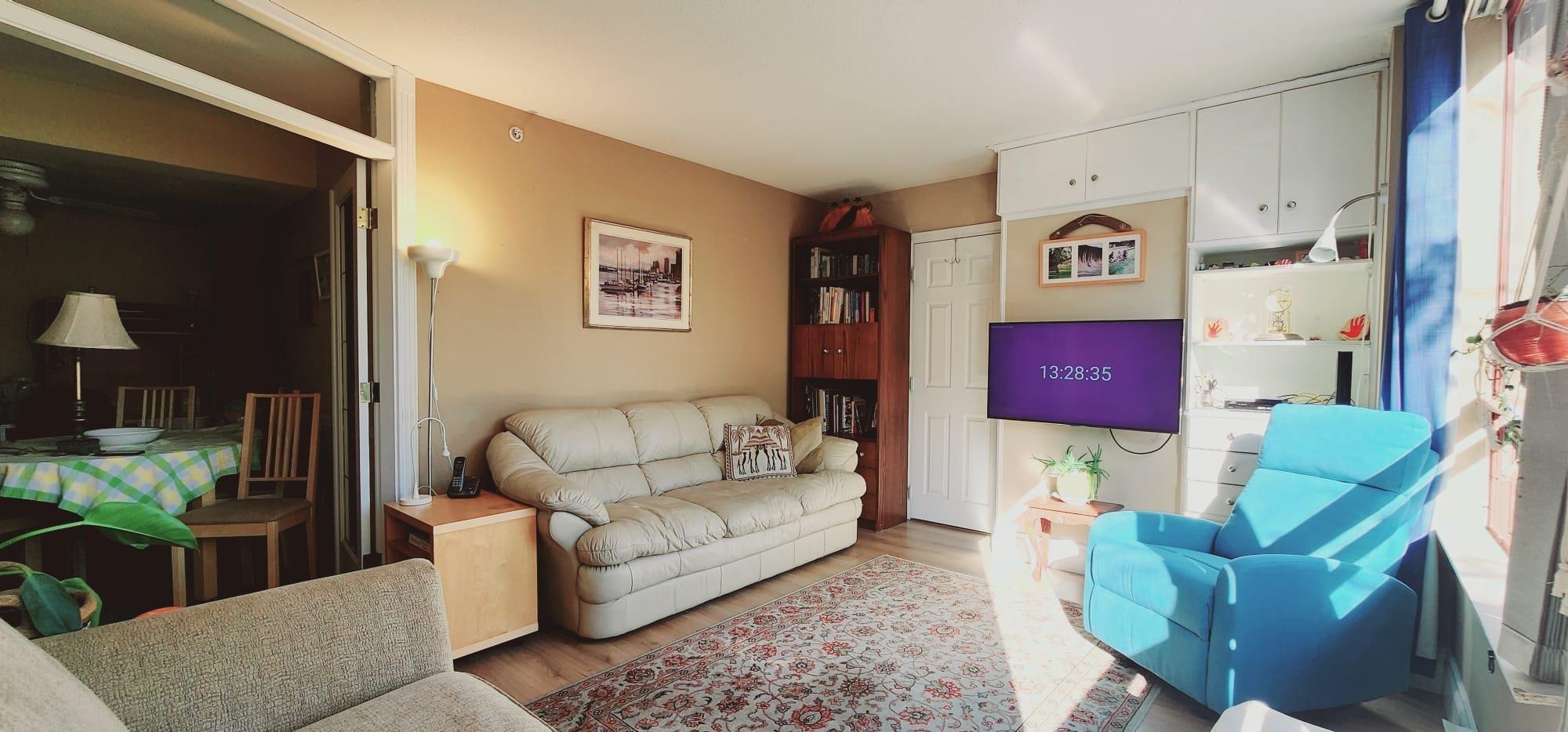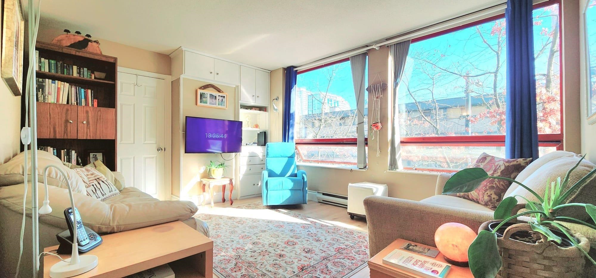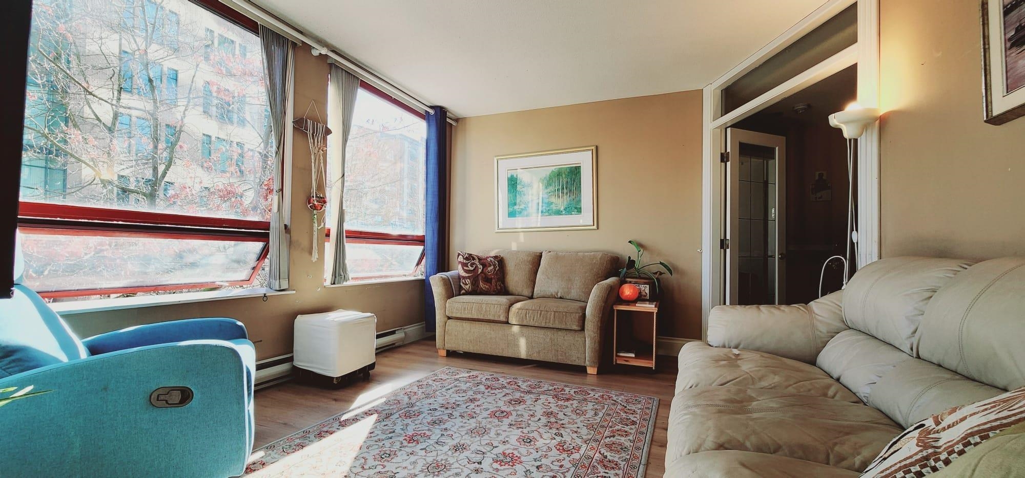 Spacious 2 bdrm, 750 sqft east facing unit at 811 Helmcken, that offers an abundance of natural light creating a warm and inviting atmosphere. Beautiful glass french doors and light hazelnut laminate flooring leads from the dining area into the living room, enhancing the flow and connection between the rooms. Kitchen is equipped with stainless steel fridge and microwave, and features a convenient pass-through window to the dining area, making it perfect for entertaining. This bright unit is perfect for 1st ...
