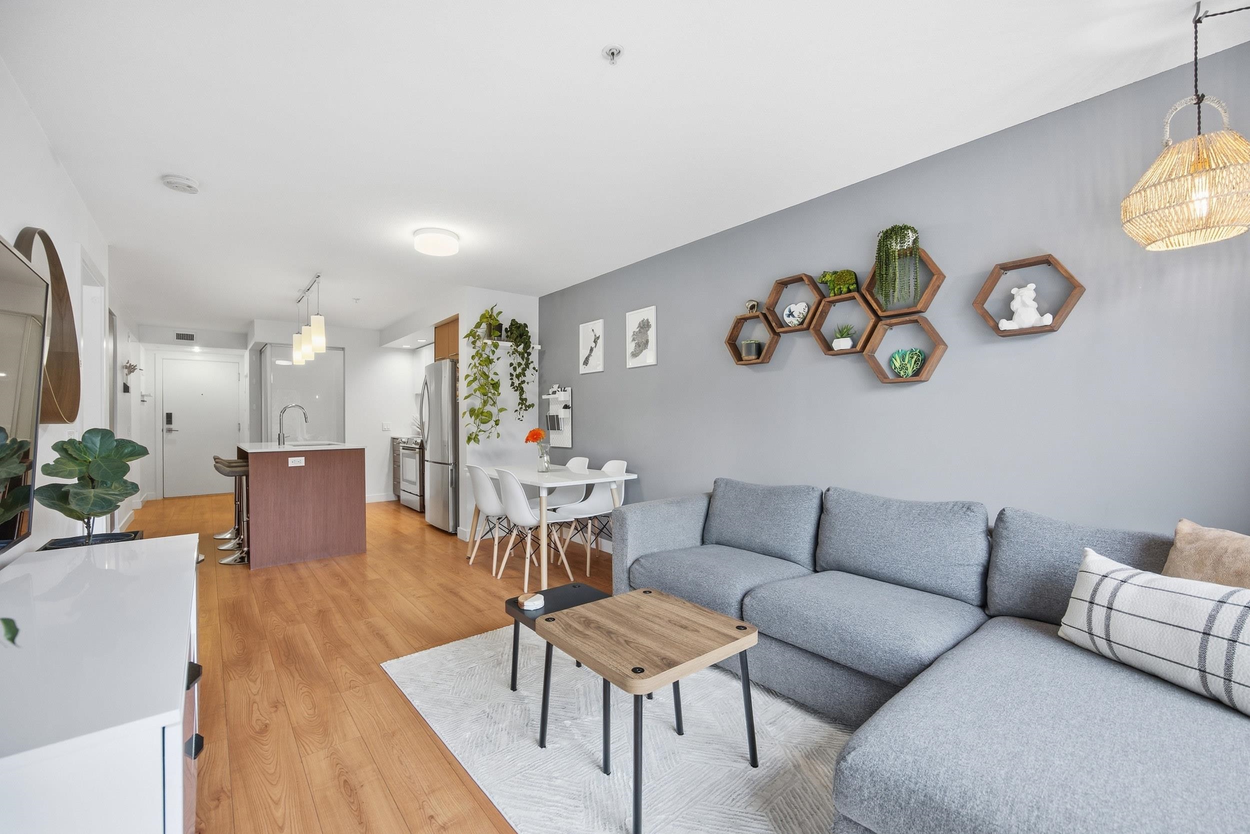 Welcome to Orizon on Third by Intracorp, ideally situated in the heart of vibrant Lower Lonsdale. This thoughtfully designed 1 bed + den home offers a smart, functional layout with a versatile den featuring custom built-in bed and dressers—perfect for guests, a home office, or added storage. The open-concept living space is finished with quartz countertops, stainless steel appliances, laminate flooring, and in-floor radiant heating for year-round comfort. Enjoy access to a fitness centre, rooftop terrace wi...
