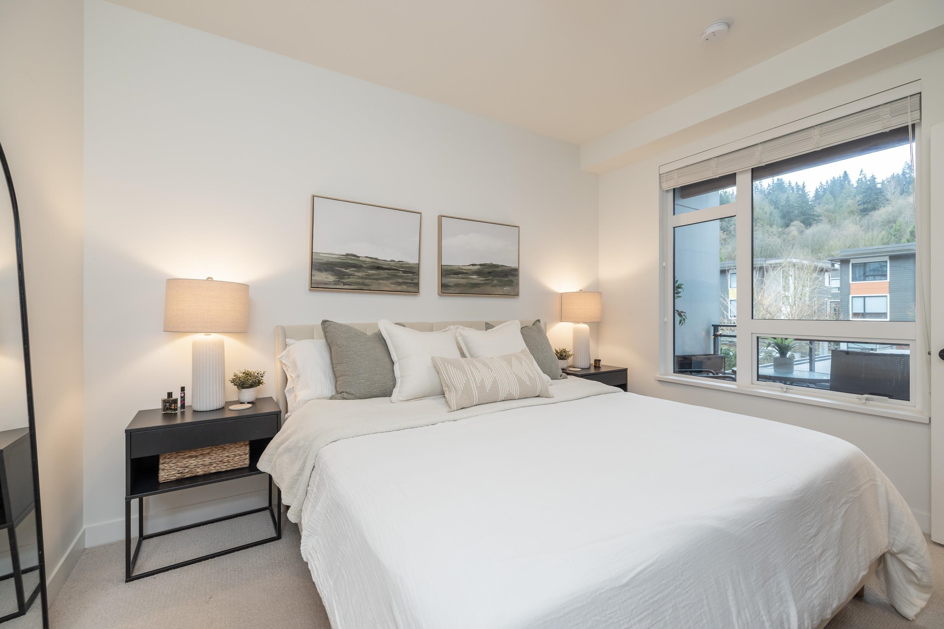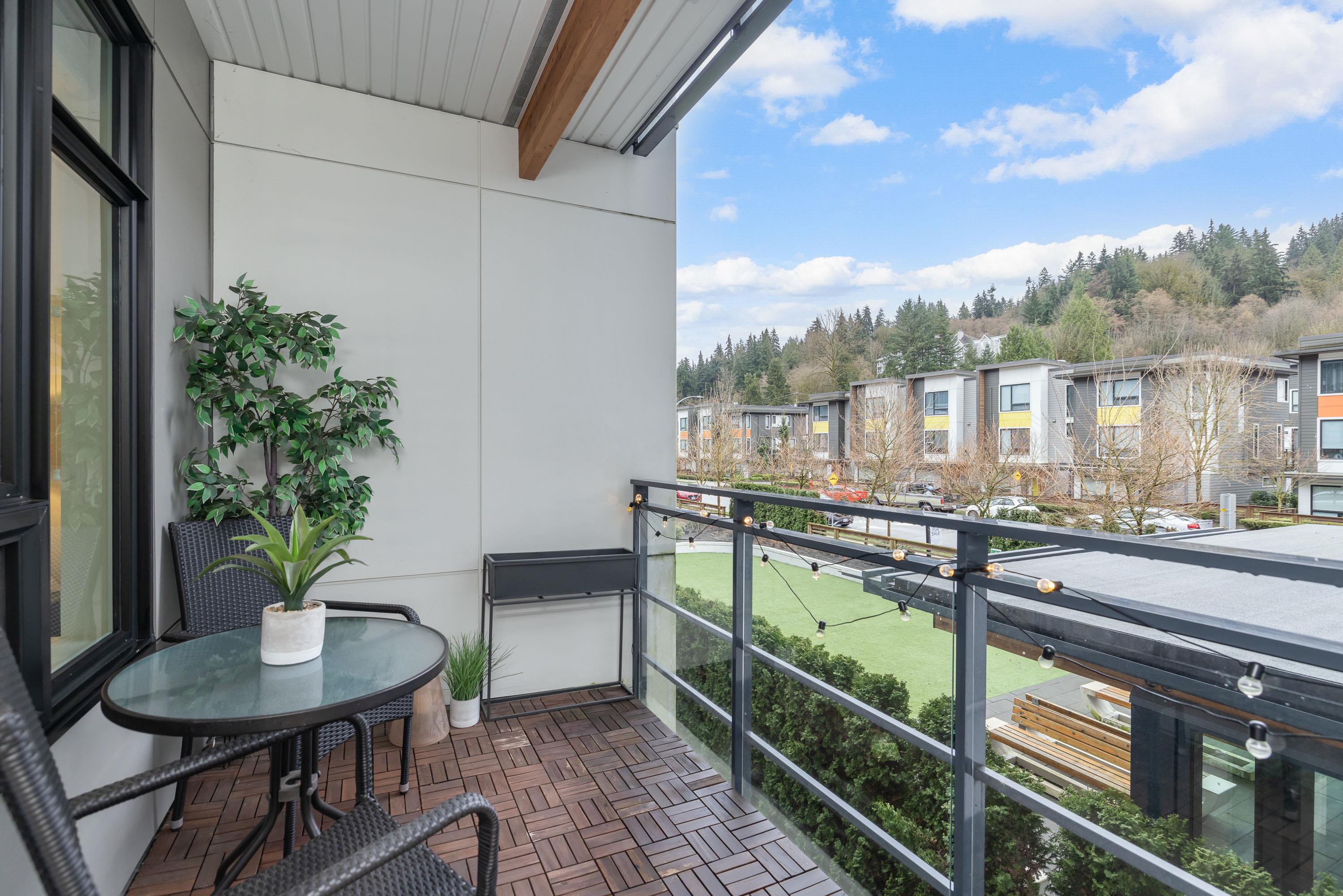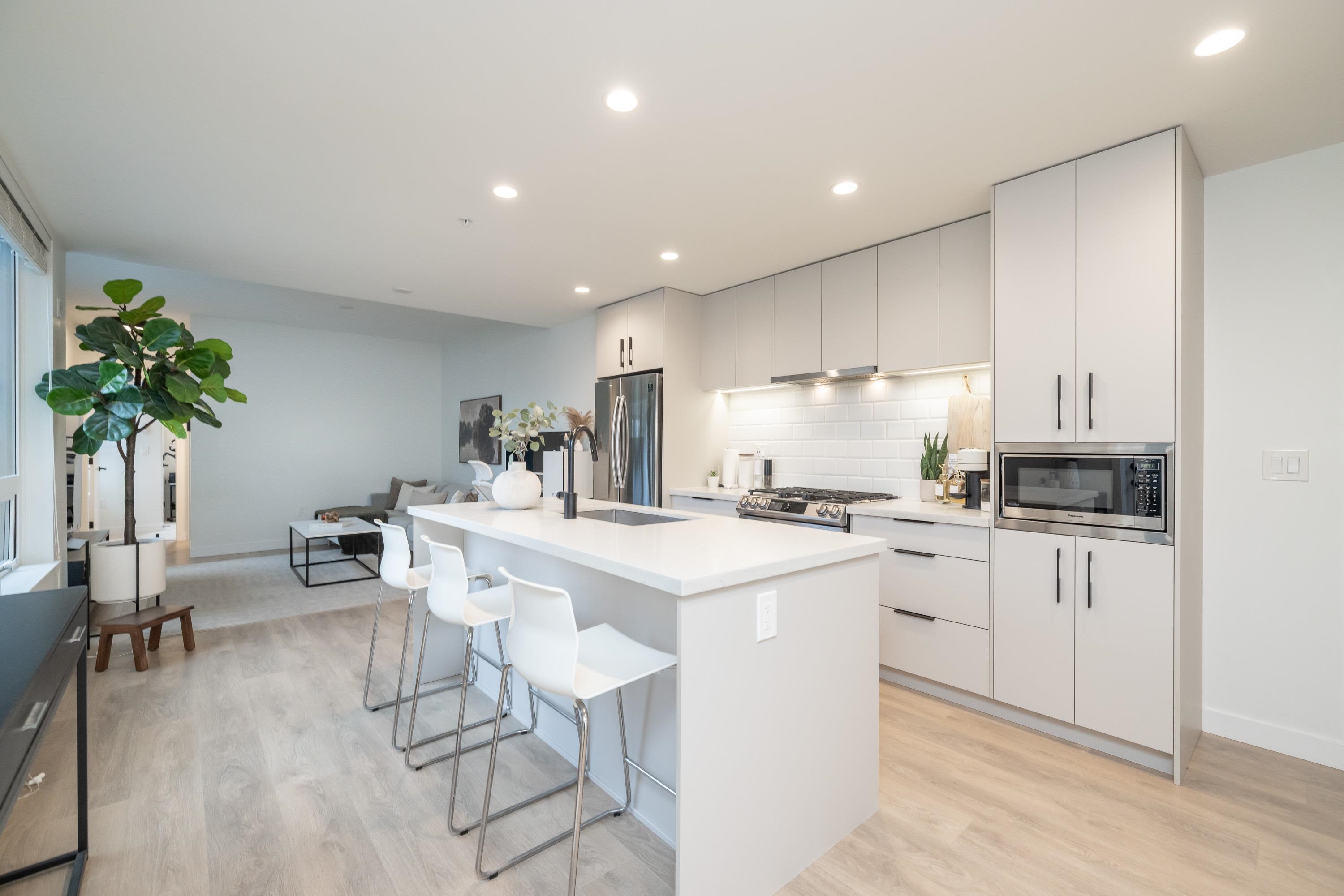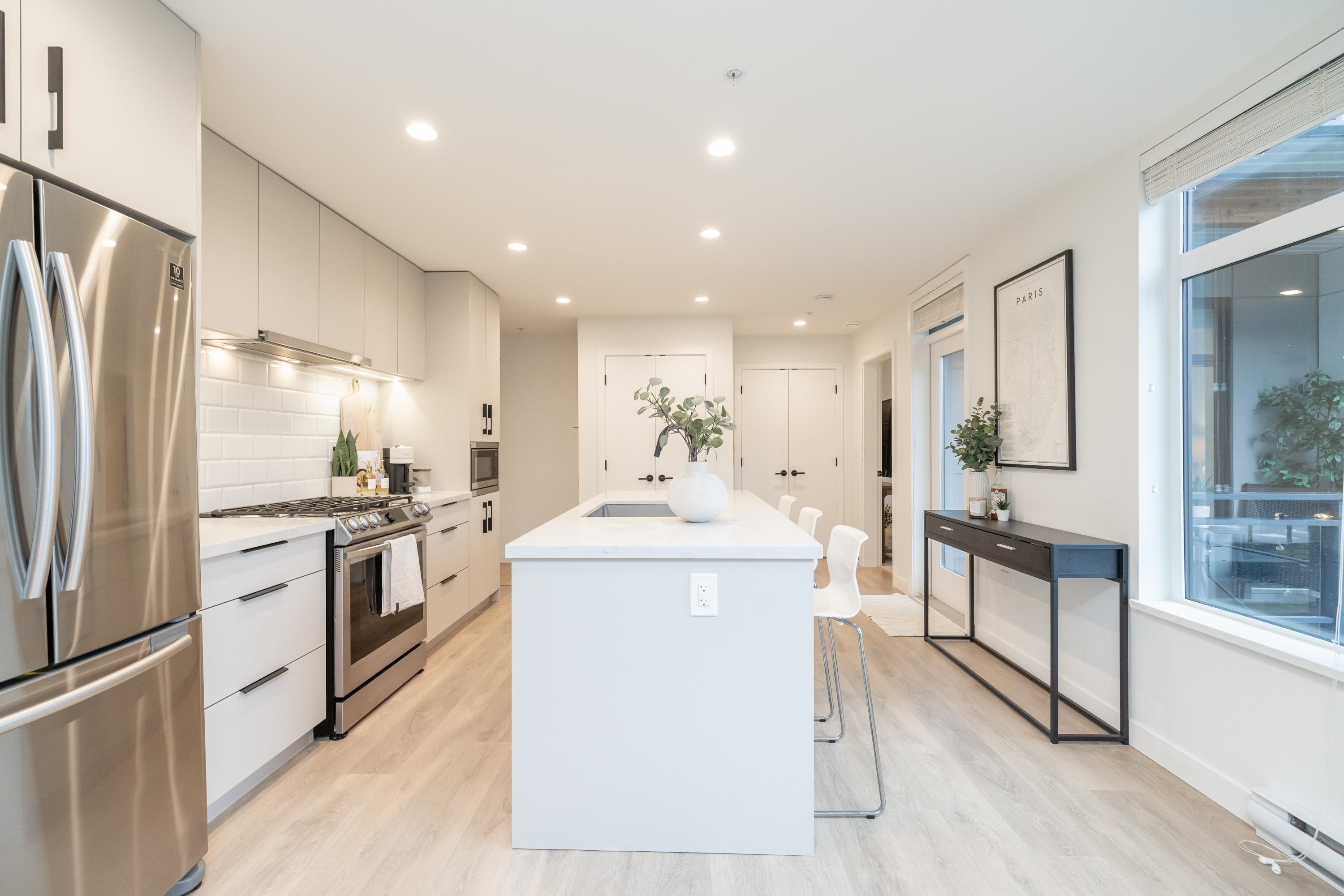 Fabulous living in Port Moody, with shops, restaurants, trails, parks, and more all outside your door! Welcome to this 936 sq ft 2 bdrm 2 bthrm END UNIT (no neighbours below) in the George, steps to the vibrant community yet located on a quiet street making it the perfect location. Kitchen has stylish cabinetry, quartz, island/prep space with seating for 3, and S/S appliances including gas & built in microwave. Bedrooms are located on opposite sides for privacy, and primary has a large walk in closet and a ...