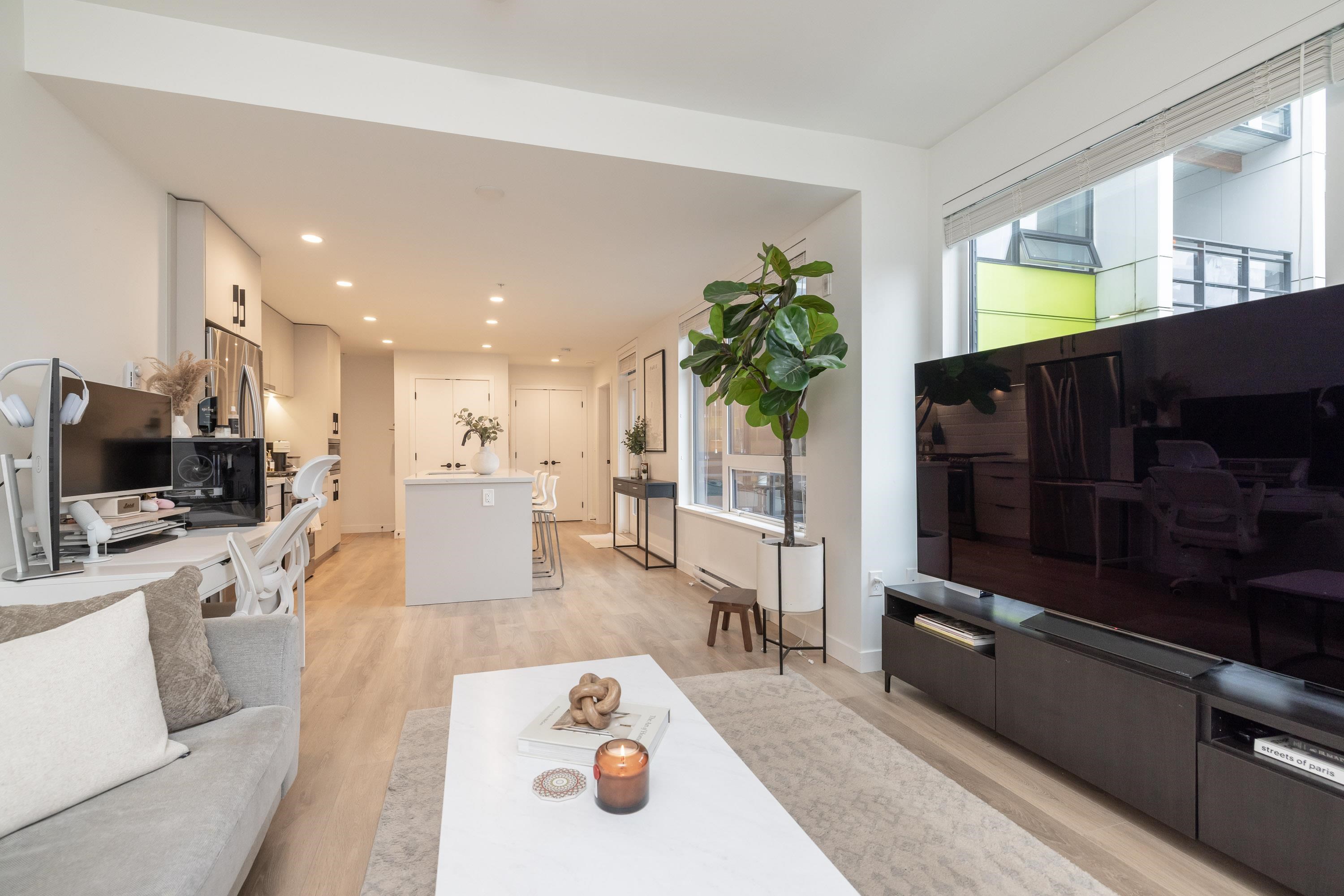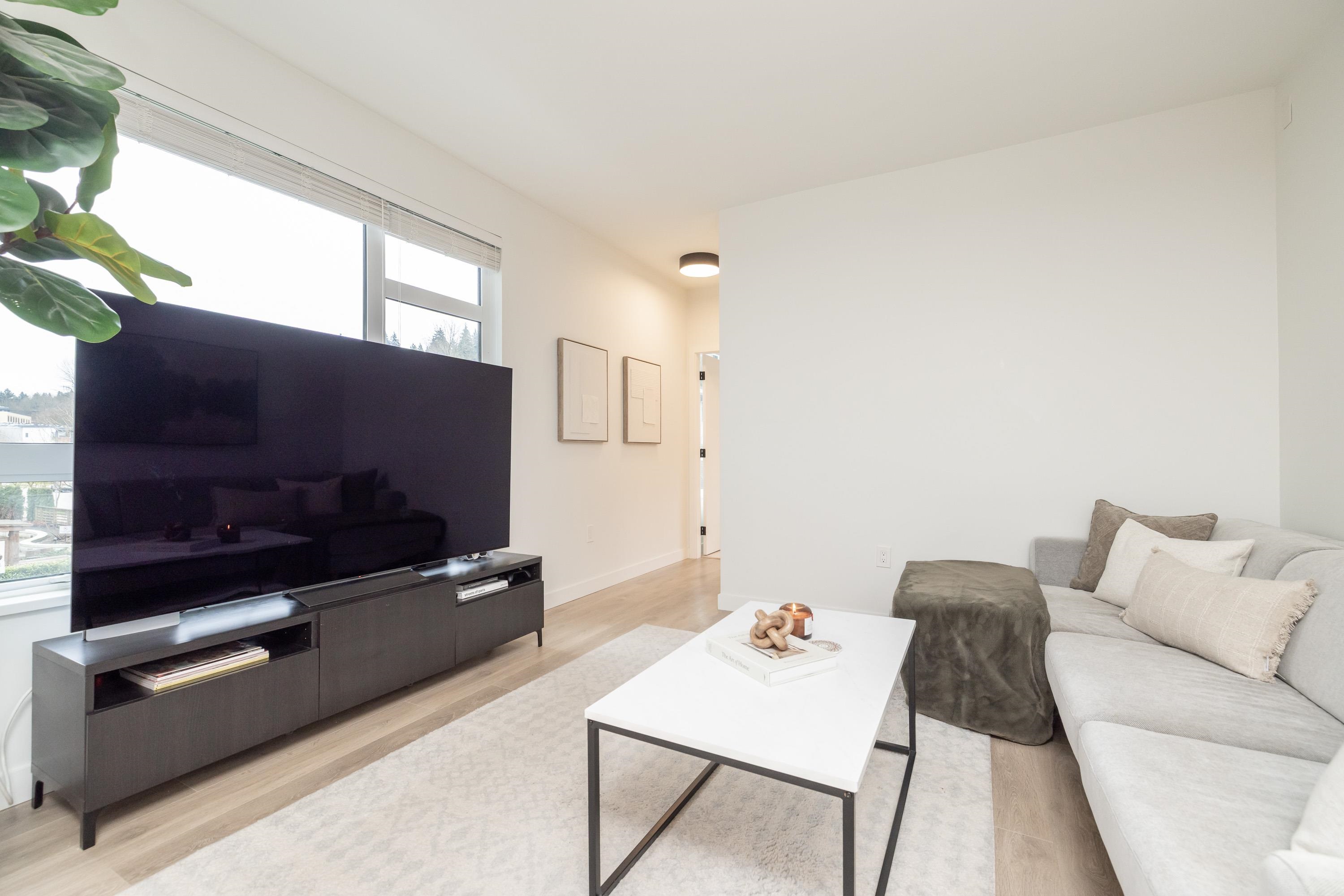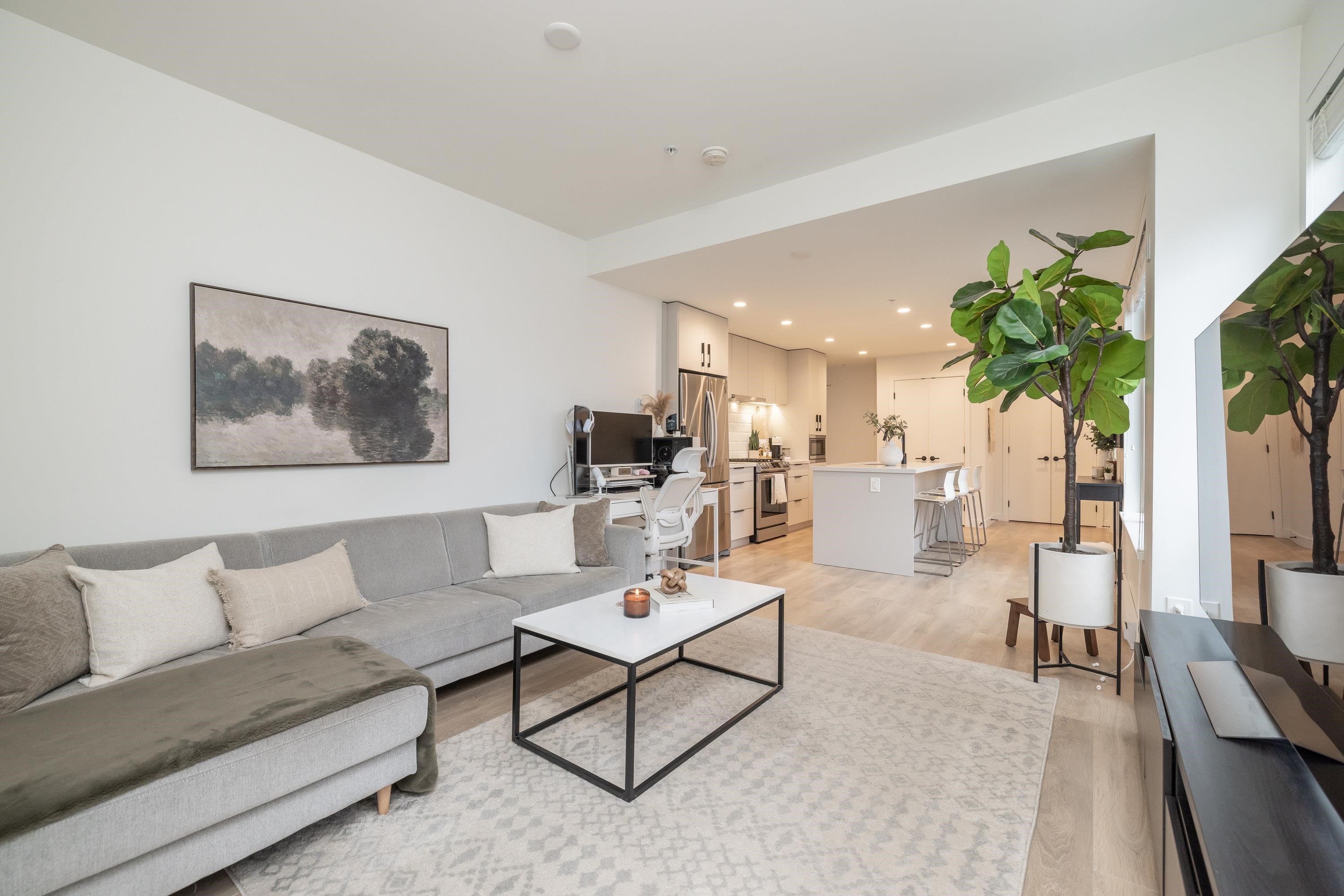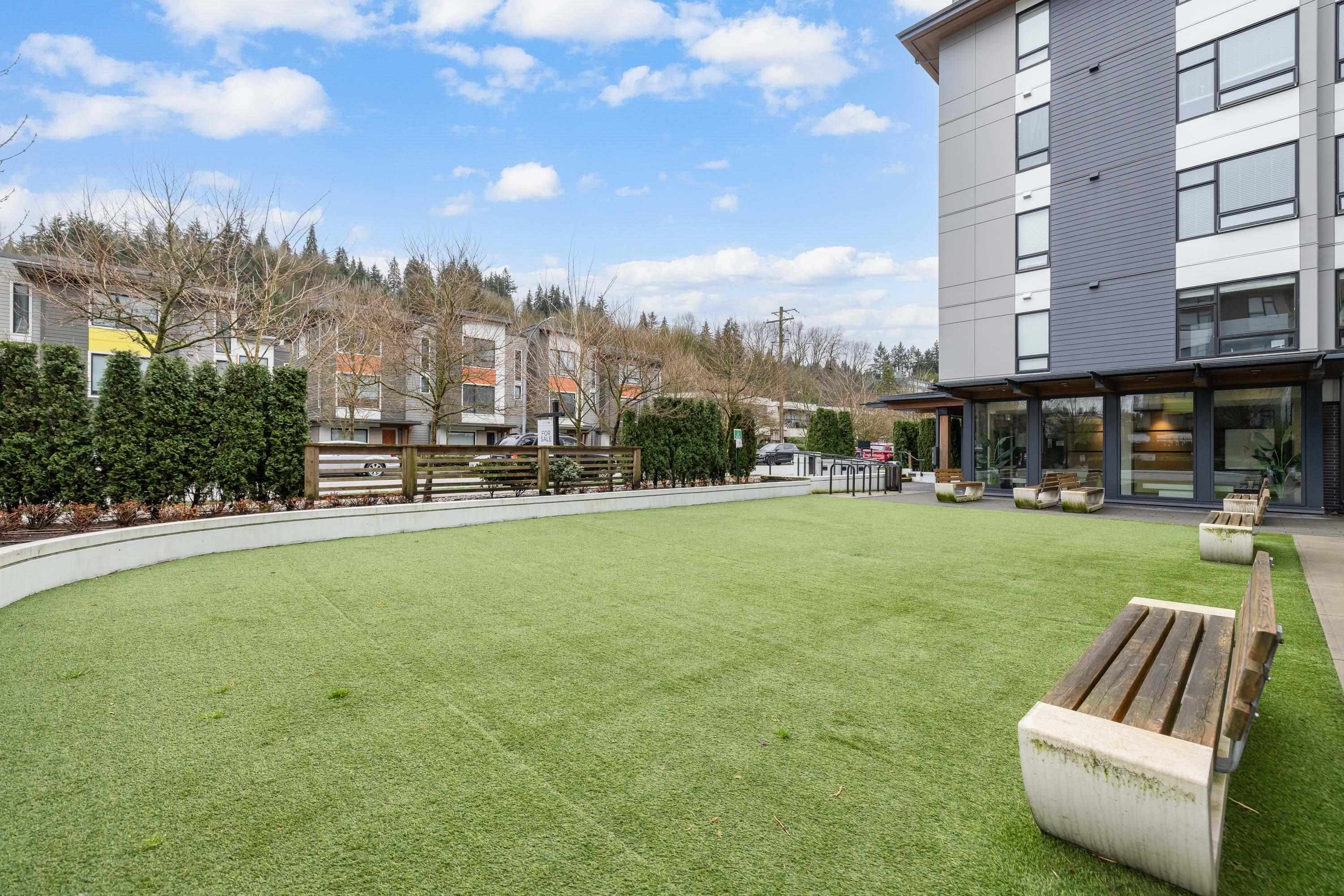 Fabulous living in Port Moody, with shops, restaurants, trails, parks, and more all outside your door! Welcome to this 936 sq ft 2 bdrm 2 bthrm END UNIT (no neighbours below) in the George, steps to the vibrant community yet located on a quiet street making it the perfect location. Kitchen has stylish cabinetry, quartz, island/prep space with seating for 3, and S/S appliances including gas & built in microwave. Bedrooms are located on opposite sides for privacy, and primary has a large walk in closet and a ...