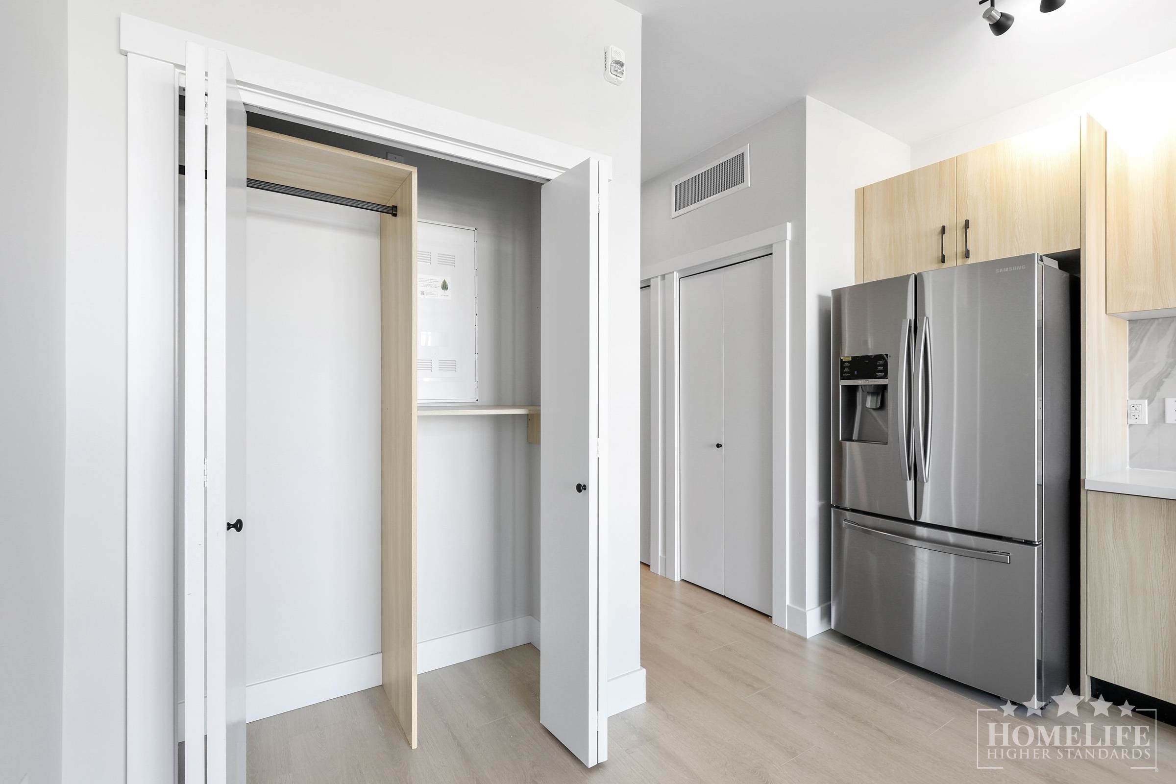 Studio unit in Kenzie. Features include air conditioning, Samsung stainless steel appliances (double-door refrigerator, gas range with convection oven, dishwasher, front-load washer, and dryer), quartz countertops, laminate flooring, soundproofing, tankless water system, secure underground parking, and covered patios with a BBQ gas line and water bib. Retail on the main floor includes daycare, dentist, barber, and more. Schools that fall into this catchment are Cambridge Elementary and Sullivan Heights Seco...