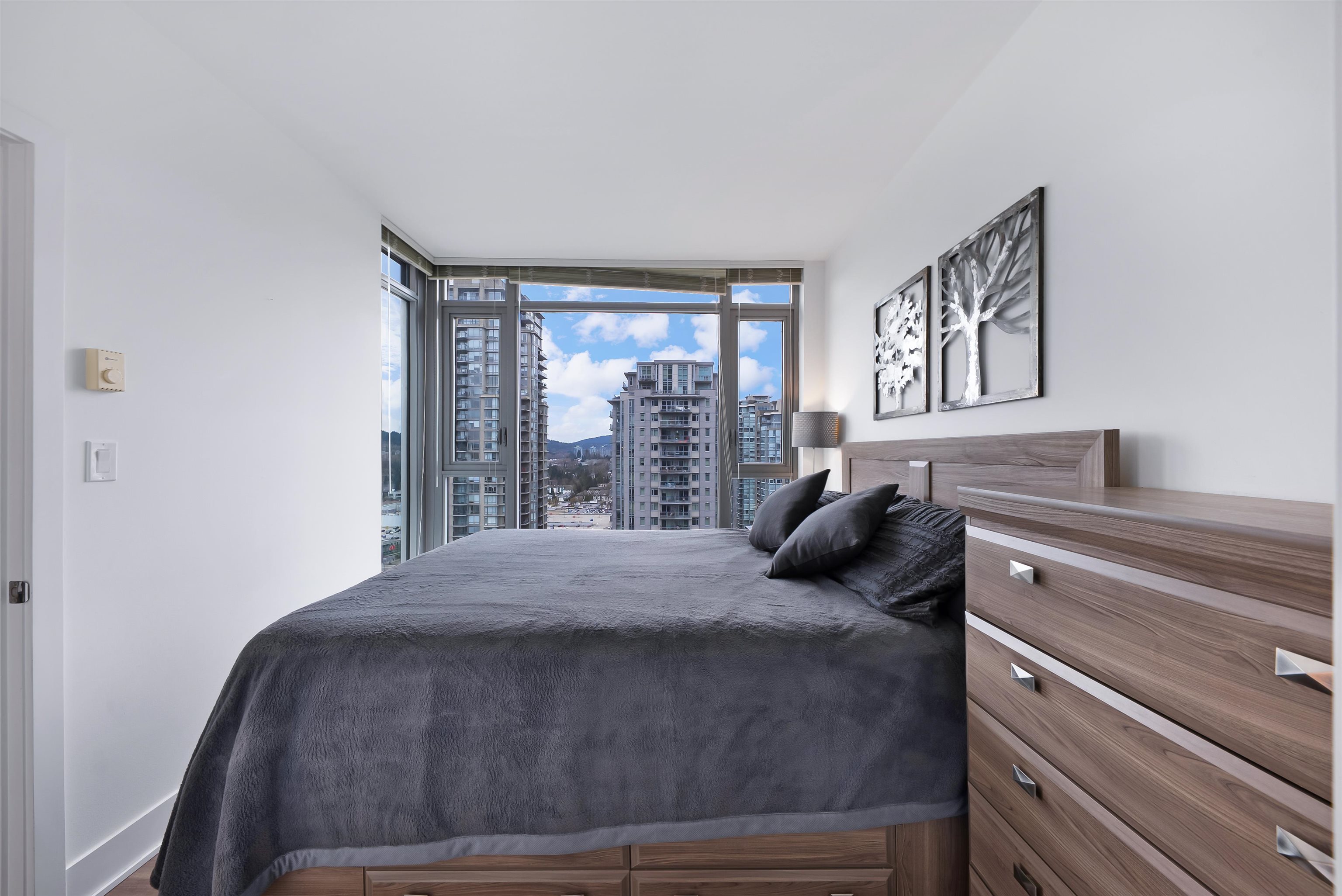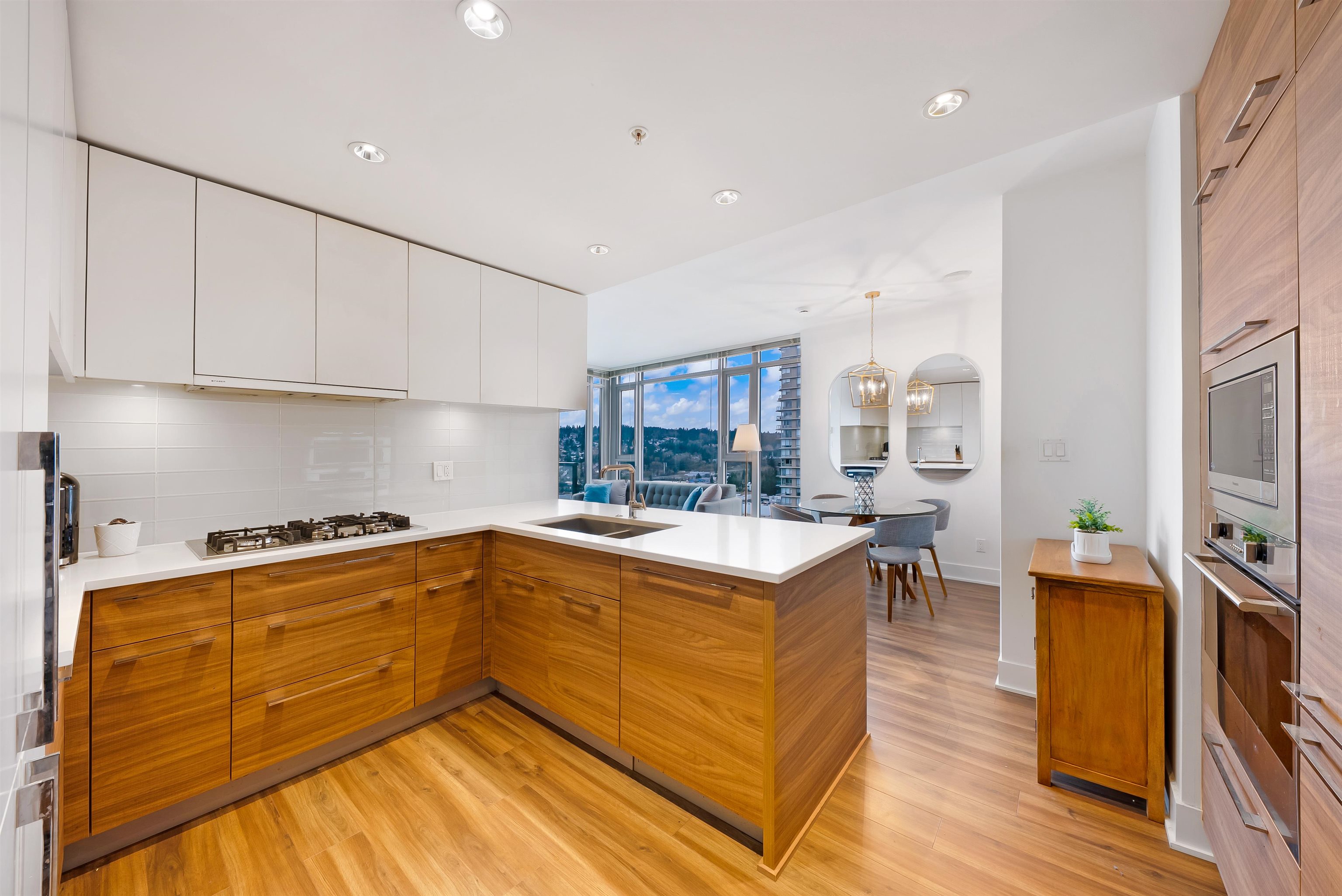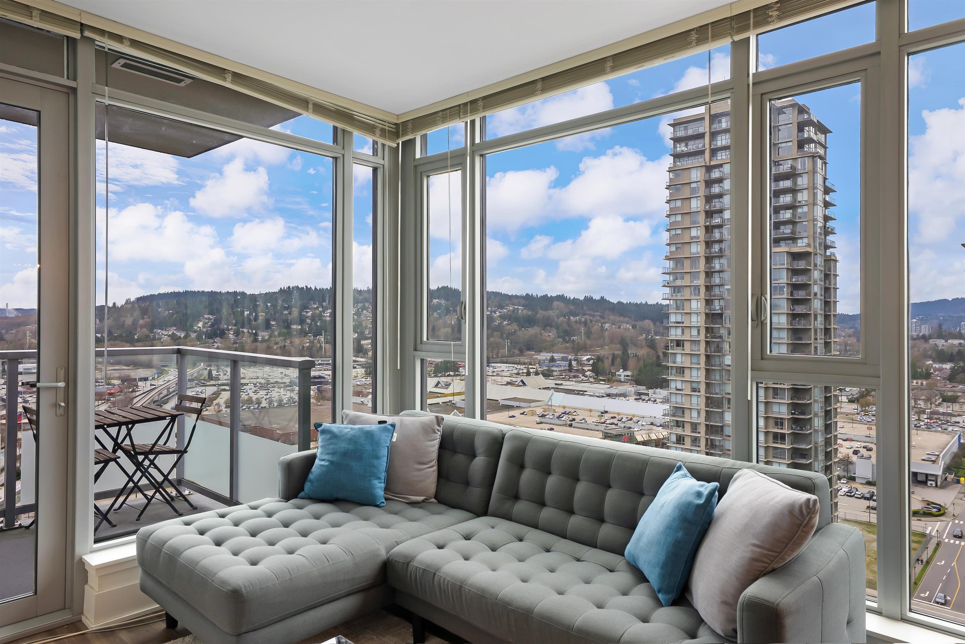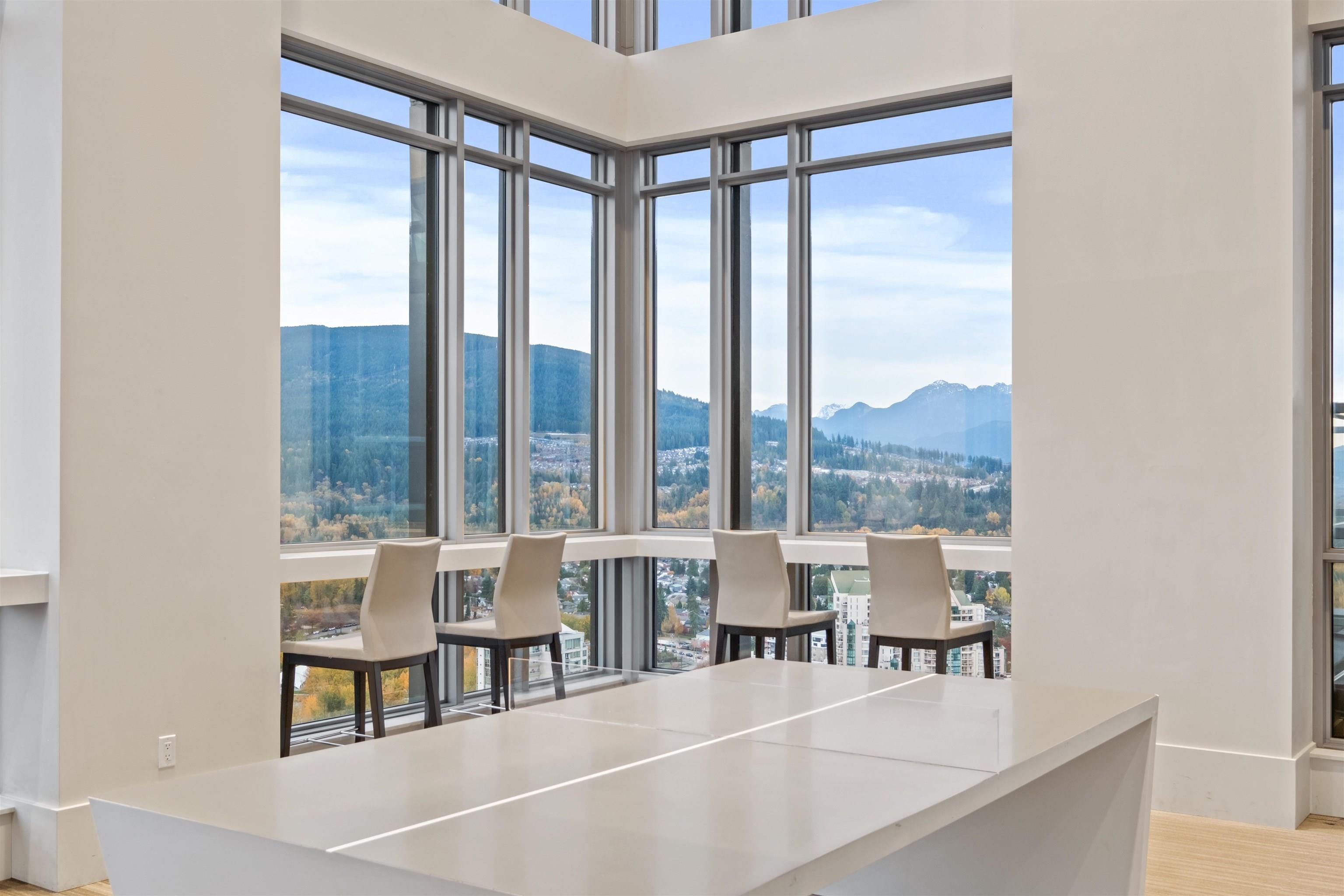 Welcome to iconic MThree, a 48-storey tower in the heart of Coquitlam Center, quality built by Cressey Development. This rarely available ONE BED CORNER home features the famous "Cressey Kitchen" with 48" double fridge, integrated appliances, 5 burner gas range, wine cooler, wide living & dining area next to corner windows, spacious bedroom w/ walk-in-closet, & NuHeat floor in bathroom. Enjoy open SW views of sunset, mountains, & Bridge. Experience luxury amenities in the 2-level SkyLounge on top floors 47...