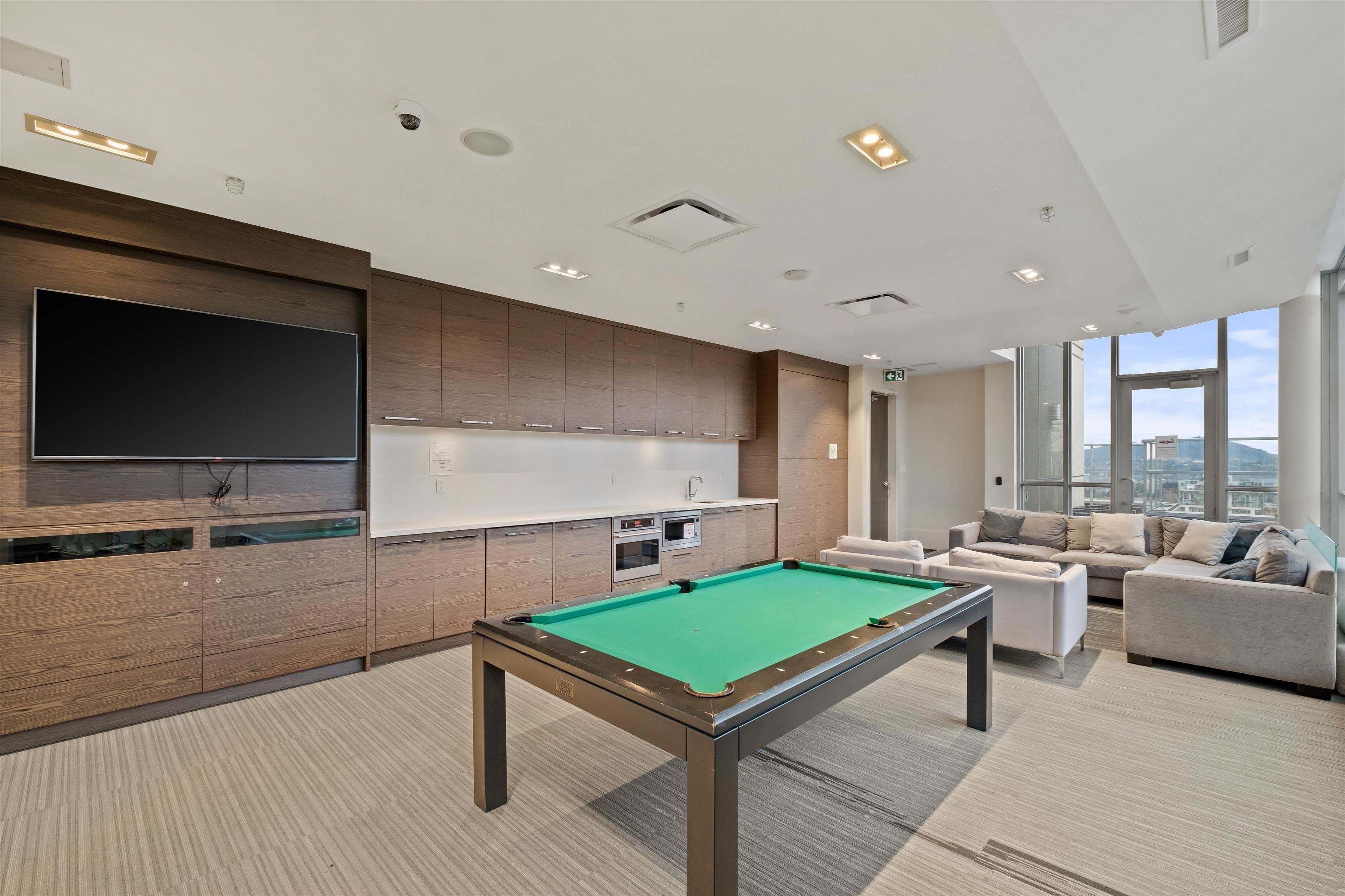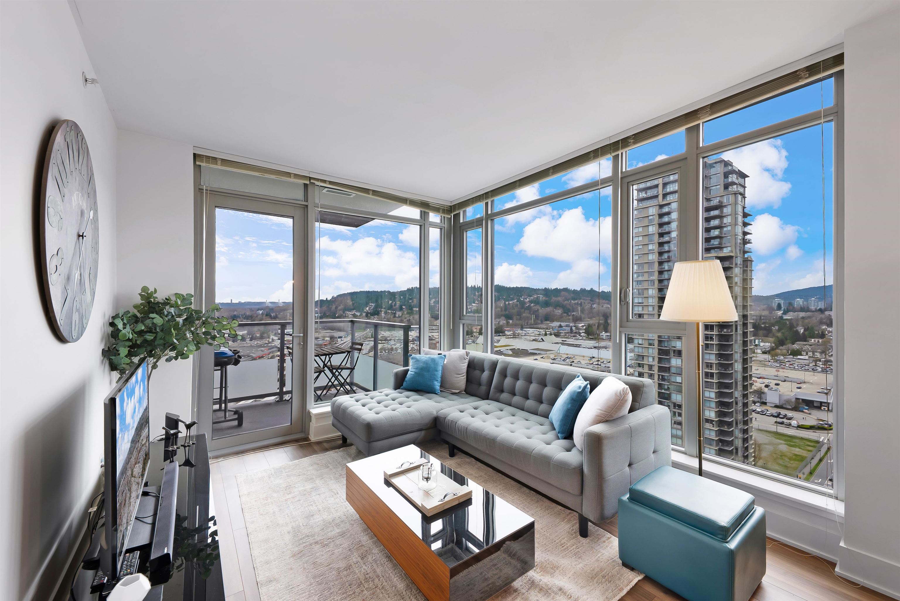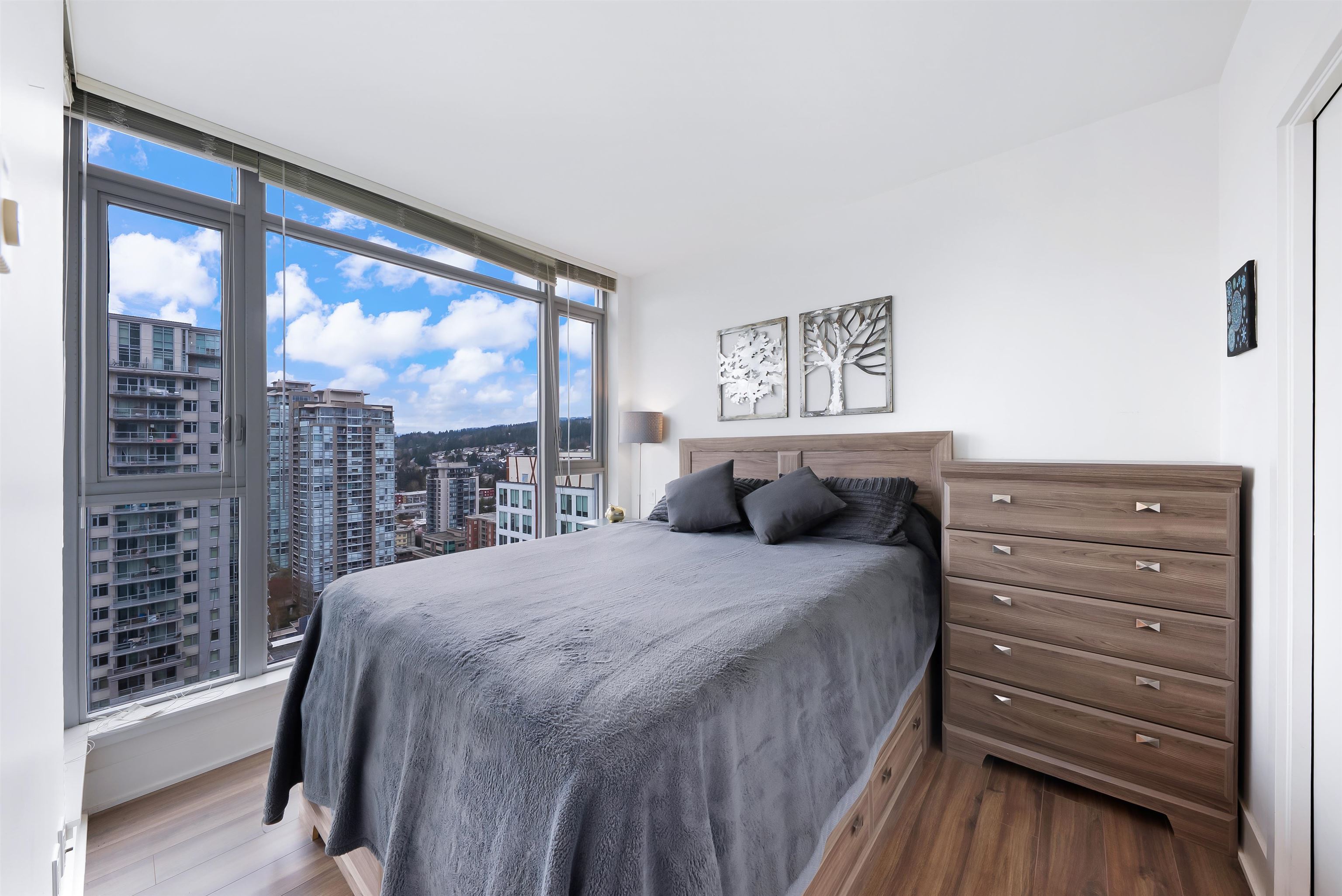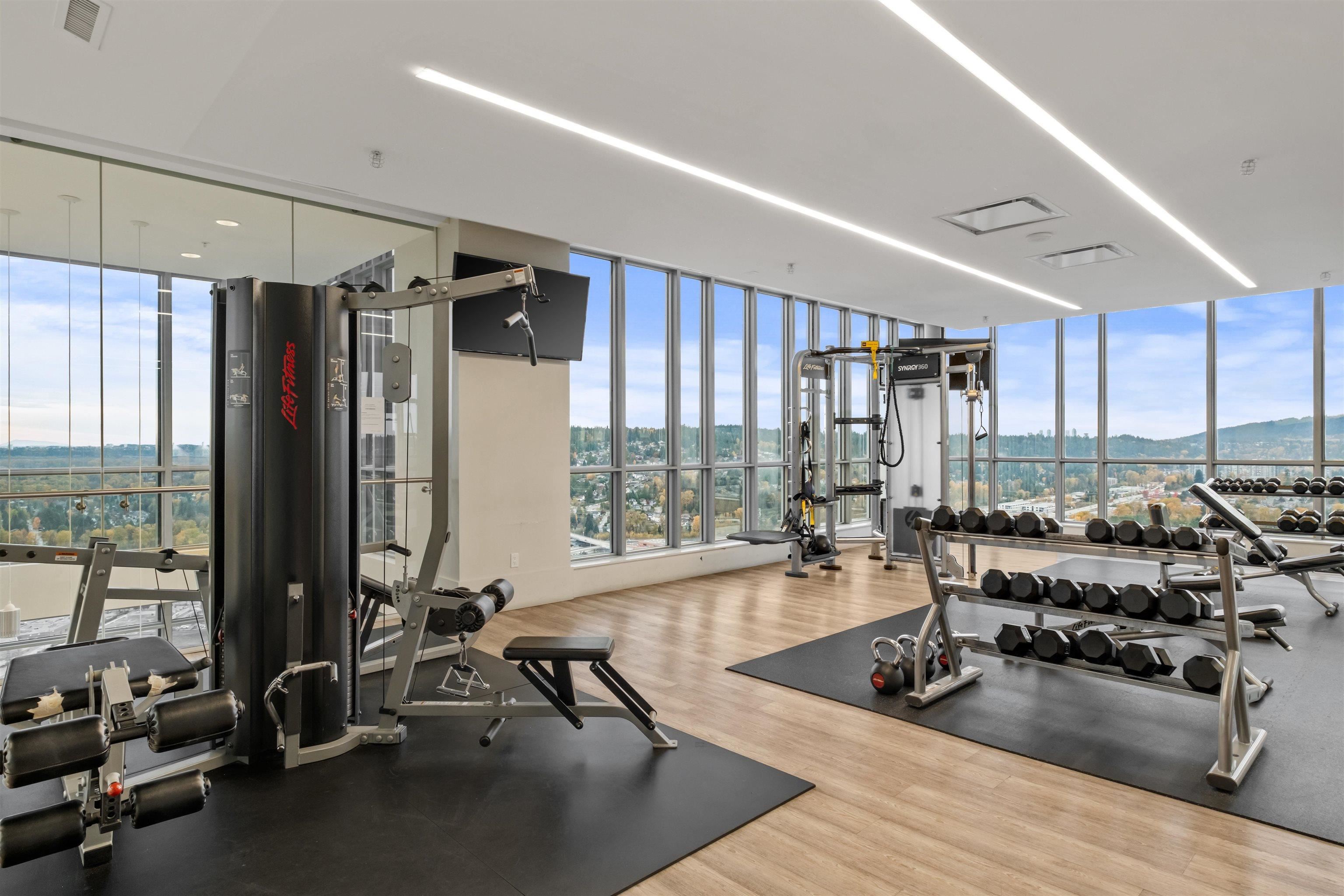 Welcome to iconic MThree, a 48-storey tower in the heart of Coquitlam Center, quality built by Cressey Development. This rarely available ONE BED CORNER home features the famous "Cressey Kitchen" with 48" double fridge, integrated appliances, 5 burner gas range, wine cooler, wide living & dining area next to corner windows, spacious bedroom w/ walk-in-closet, & NuHeat floor in bathroom. Enjoy open SW views of sunset, mountains, & Bridge. Experience luxury amenities in the 2-level SkyLounge on top floors 47...