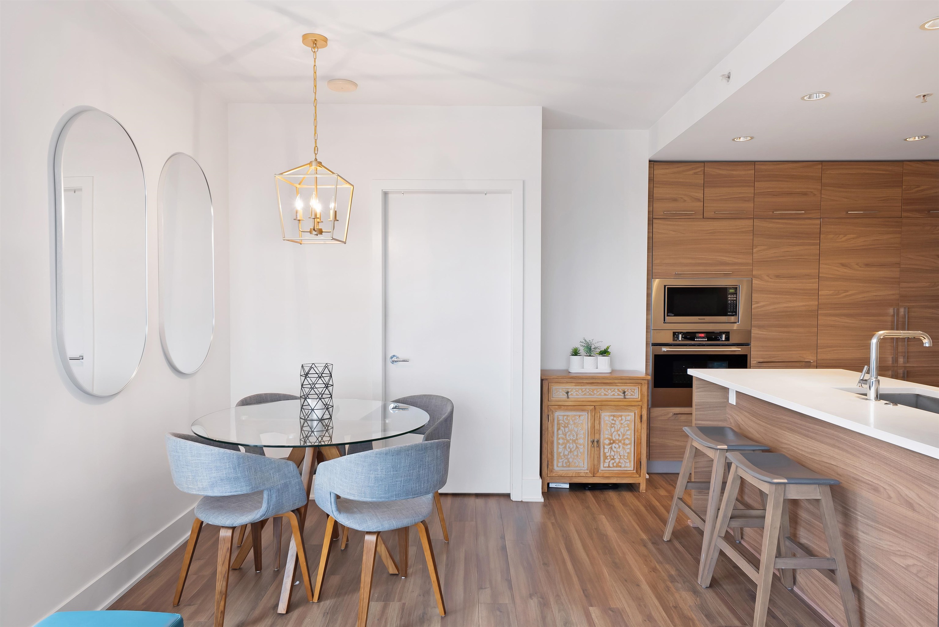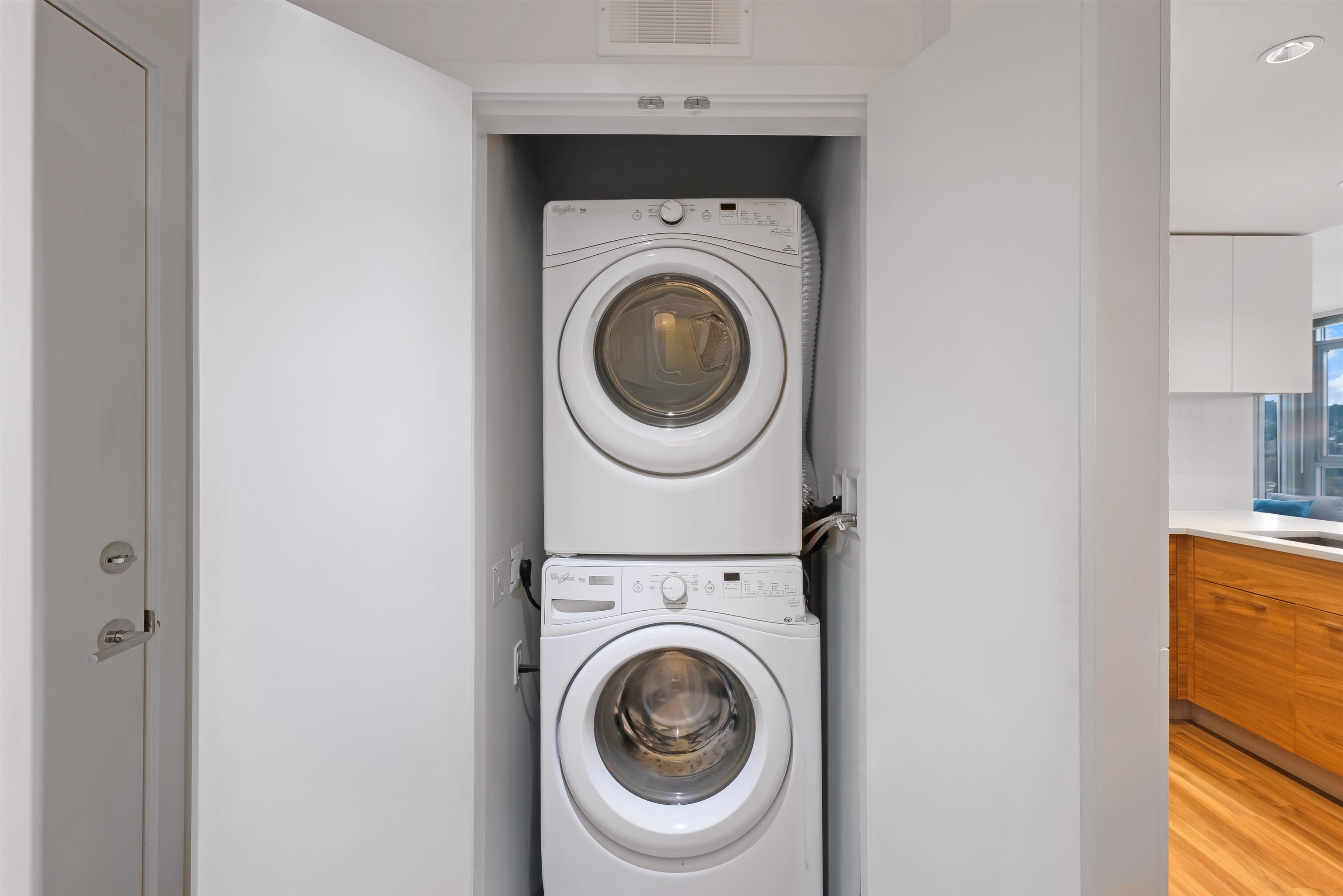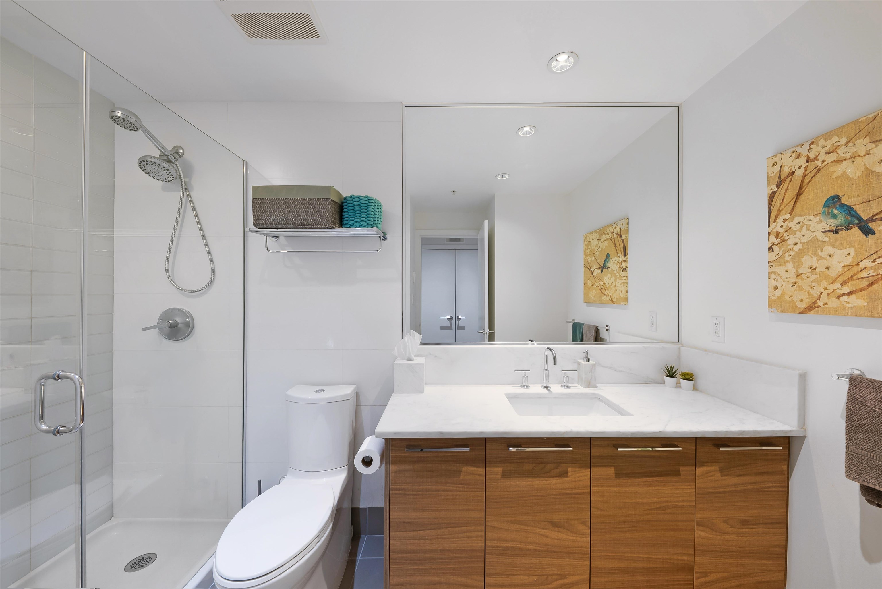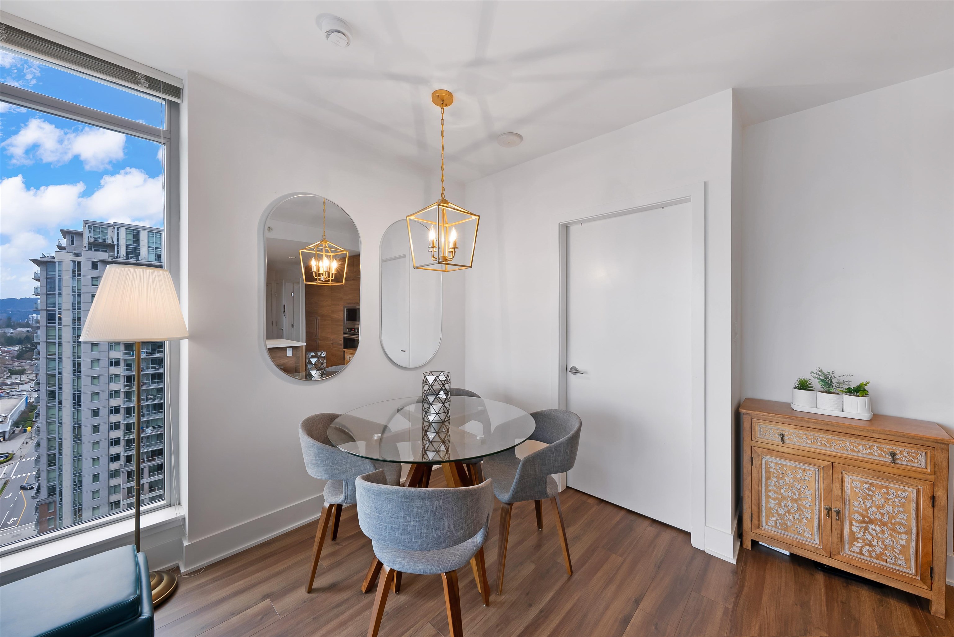 Welcome to iconic MThree, a 48-storey tower in the heart of Coquitlam Center, quality built by Cressey Development. This rarely available ONE BED CORNER home features the famous "Cressey Kitchen" with 48" double fridge, integrated appliances, 5 burner gas range, wine cooler, wide living & dining area next to corner windows, spacious bedroom w/ walk-in-closet, & NuHeat floor in bathroom. Enjoy open SW views of sunset, mountains, & Bridge. Experience luxury amenities in the 2-level SkyLounge on top floors 47...