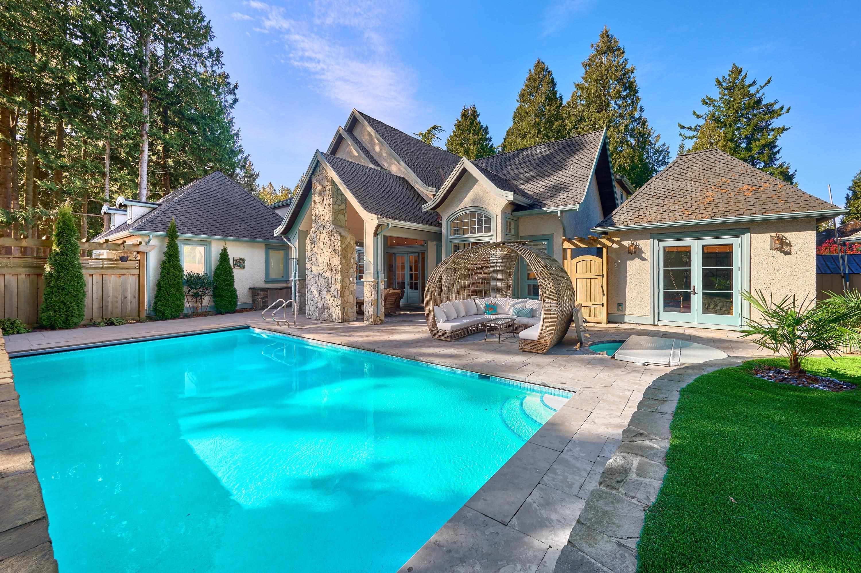 French Chateau-gated estate on a private 21,780 sq ft south-facing lot, offering sun exposure and privacy. This exceptional residence blends timeless design with modern comfort. The main level (3,339 sq ft) features soaring ceilings and open-concept living, anchored by a chef’s dream kitchen with island seating, Wolf & Miele appliances, wok kitchen, and two butler’s bars—ideal for entertaining. Formal living and dining rooms, executive office, family room, wine room, and a guest/nanny suite with private ent...
