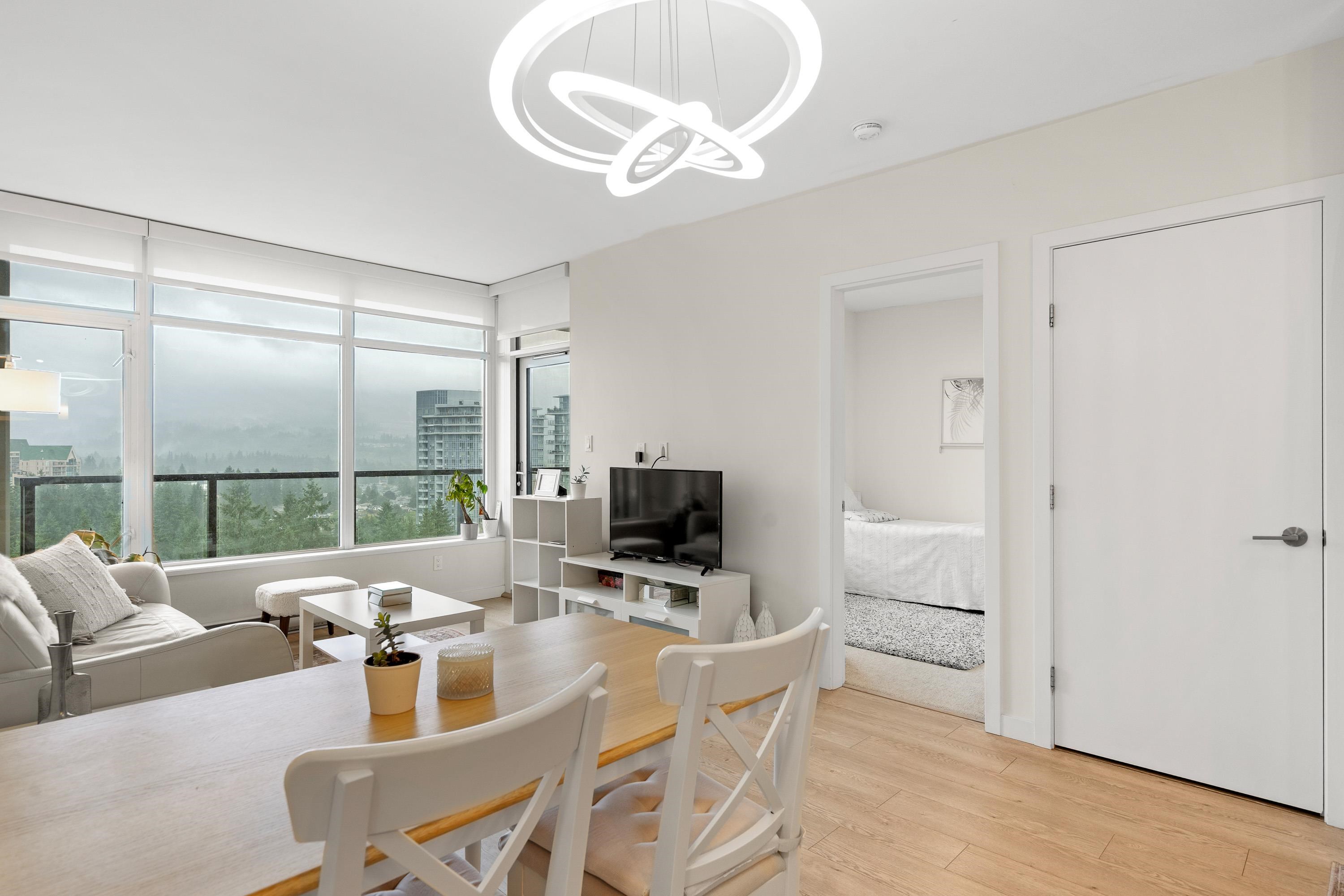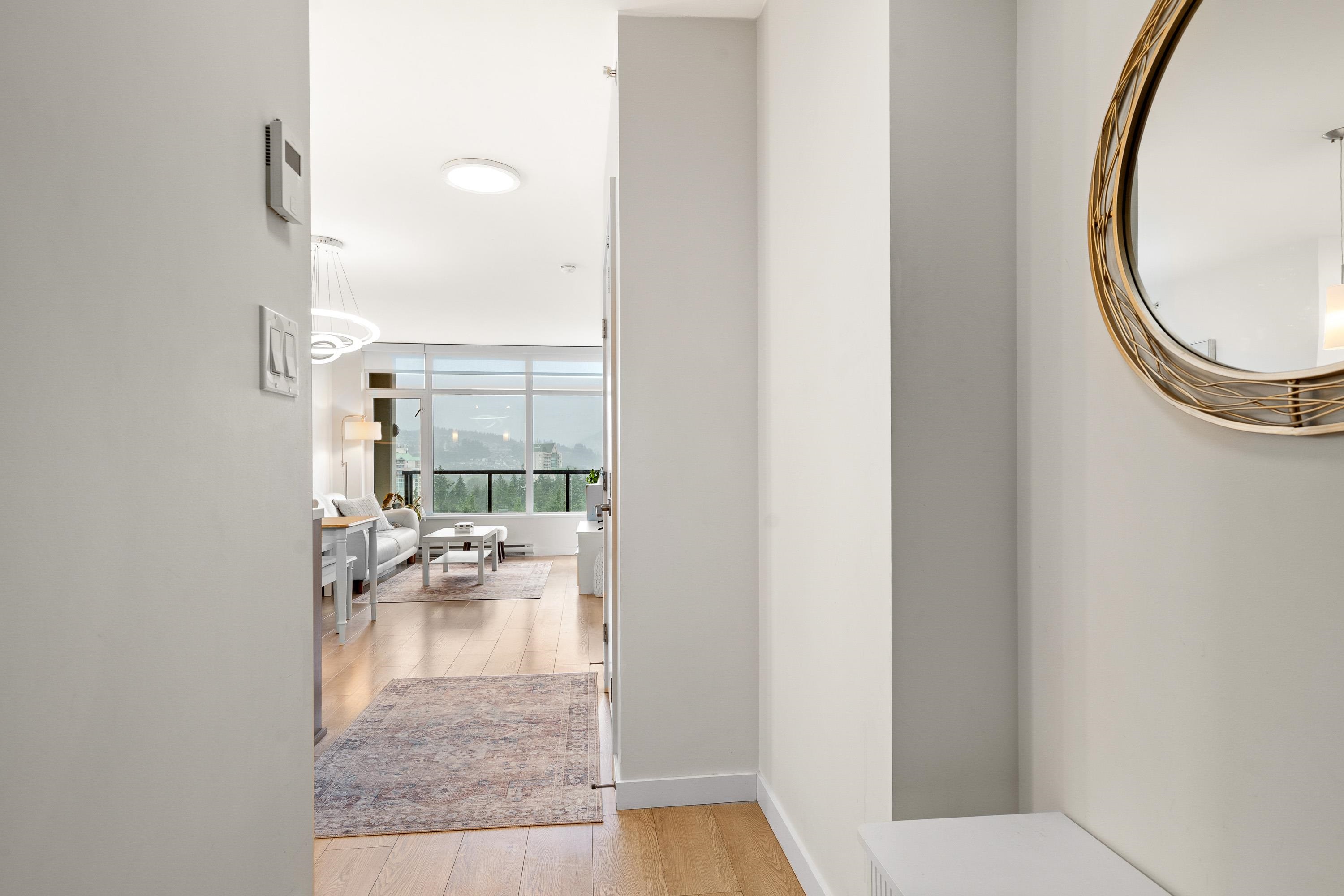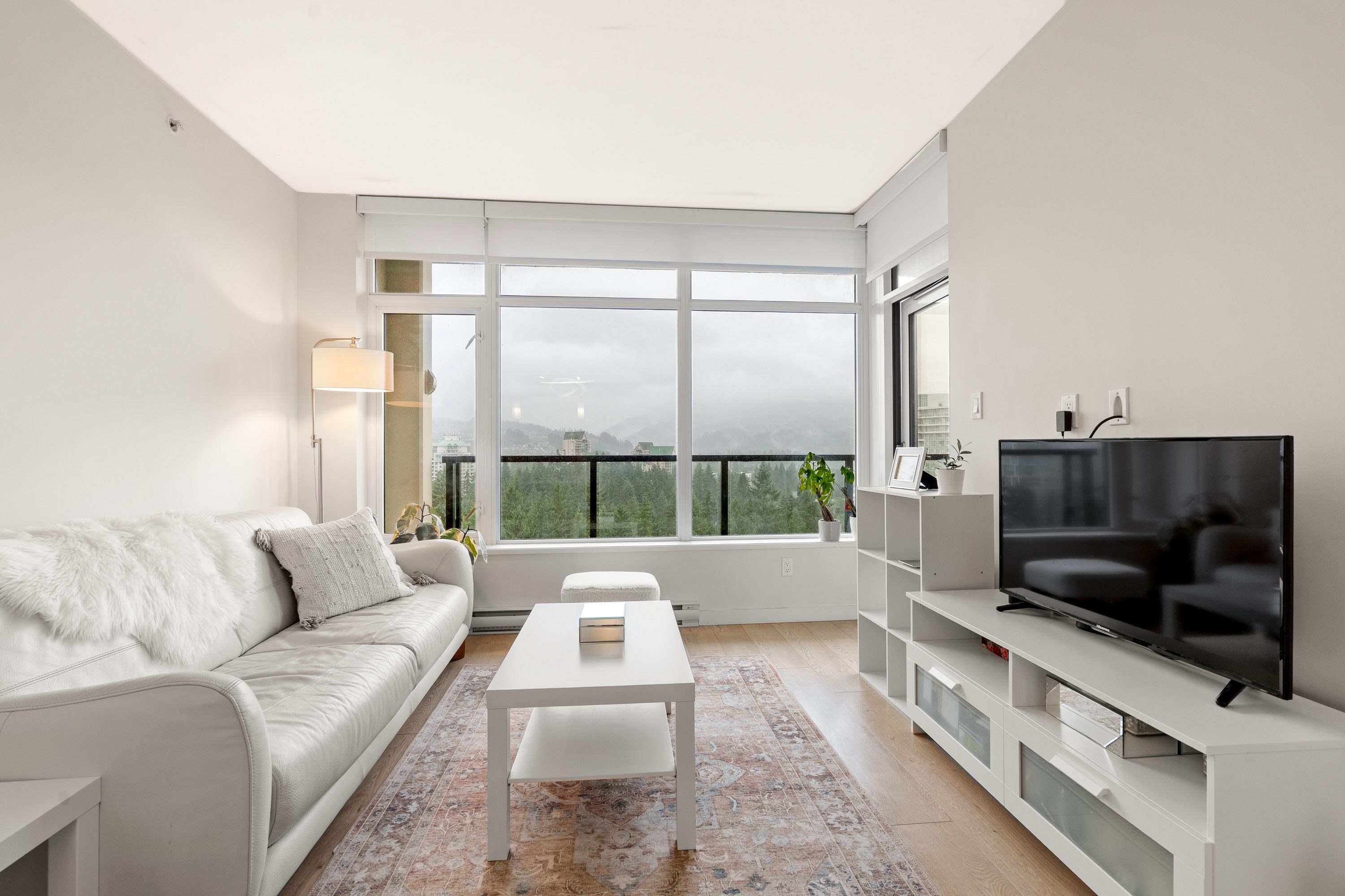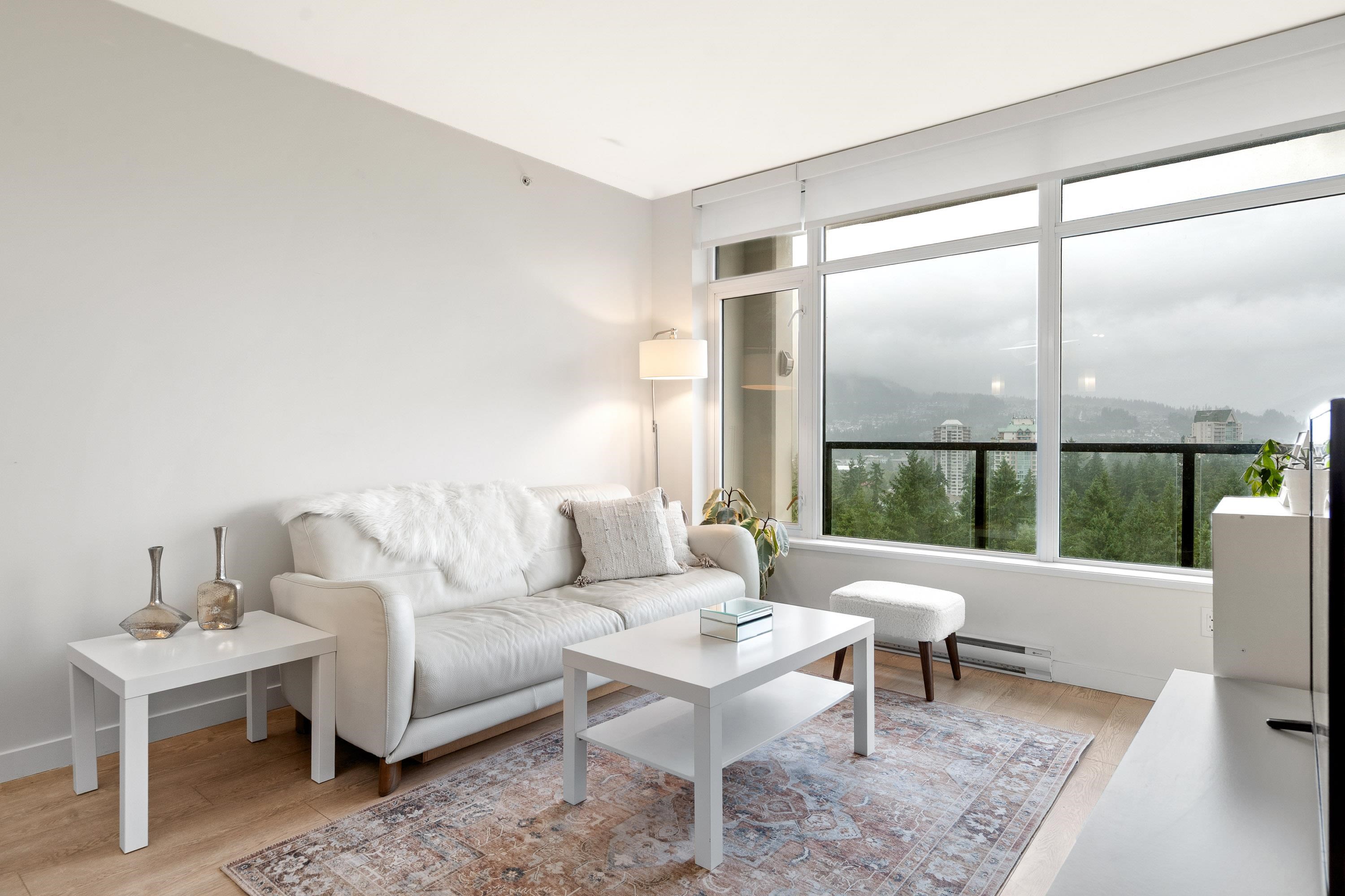 In Coquitlam's most prime location. This 9 year old 848 SF 2 bed + 2 full bath home offers convenience & privacy. The open layout features floor-to-ceiling windows with UNOBSTRUCTED VIEWS of the North Mountains, Glen Park & trees, with no units looking in. Bedrooms are separated on opposite sides for comfort. The modern kitchen boasts S/S appliances, quartz counters, gas cooktop & ample cabinetry. Upgrades incl: Nuheat floors in kitchen/baths, LED lighting & MOTORIZED Hunter Douglas blinds. Building highlig...