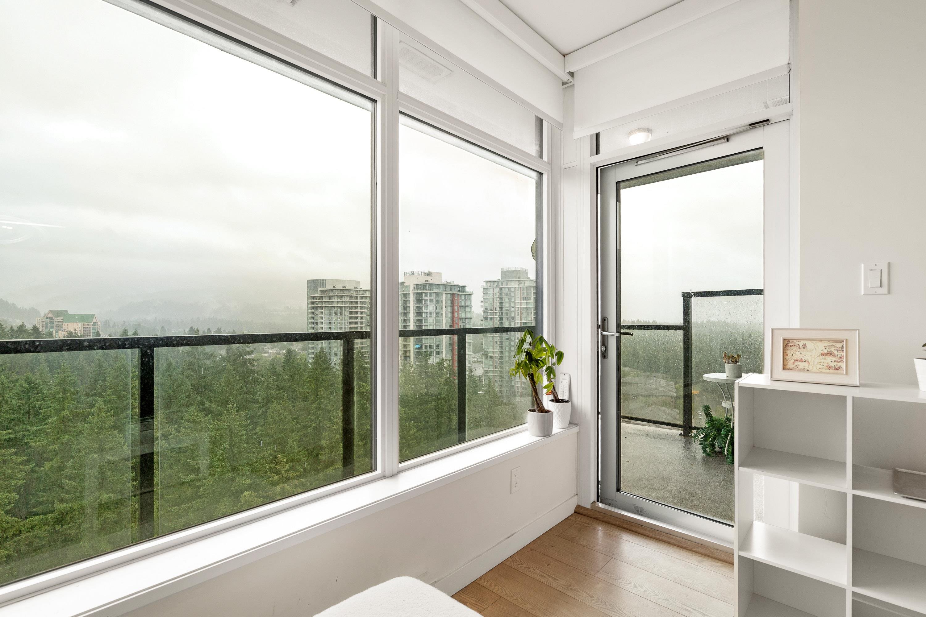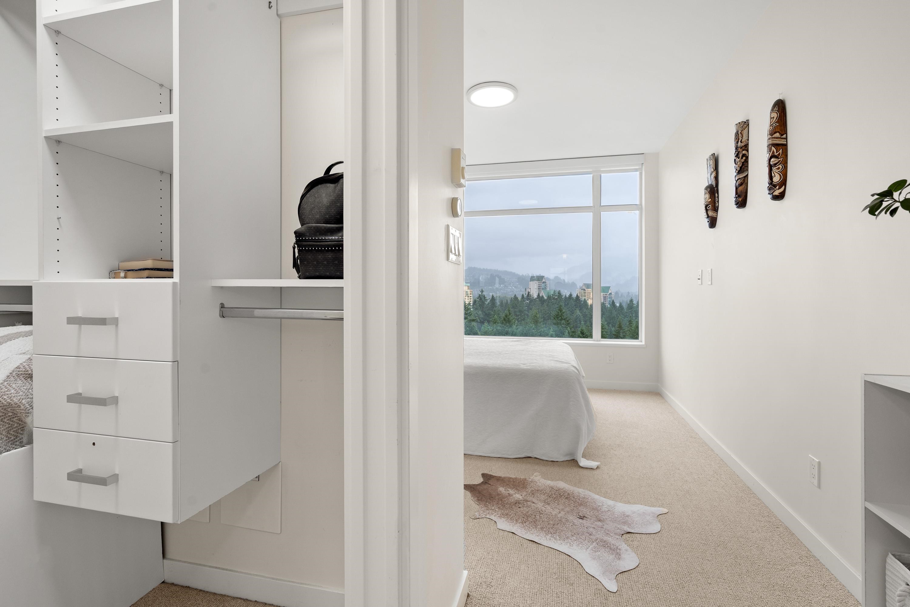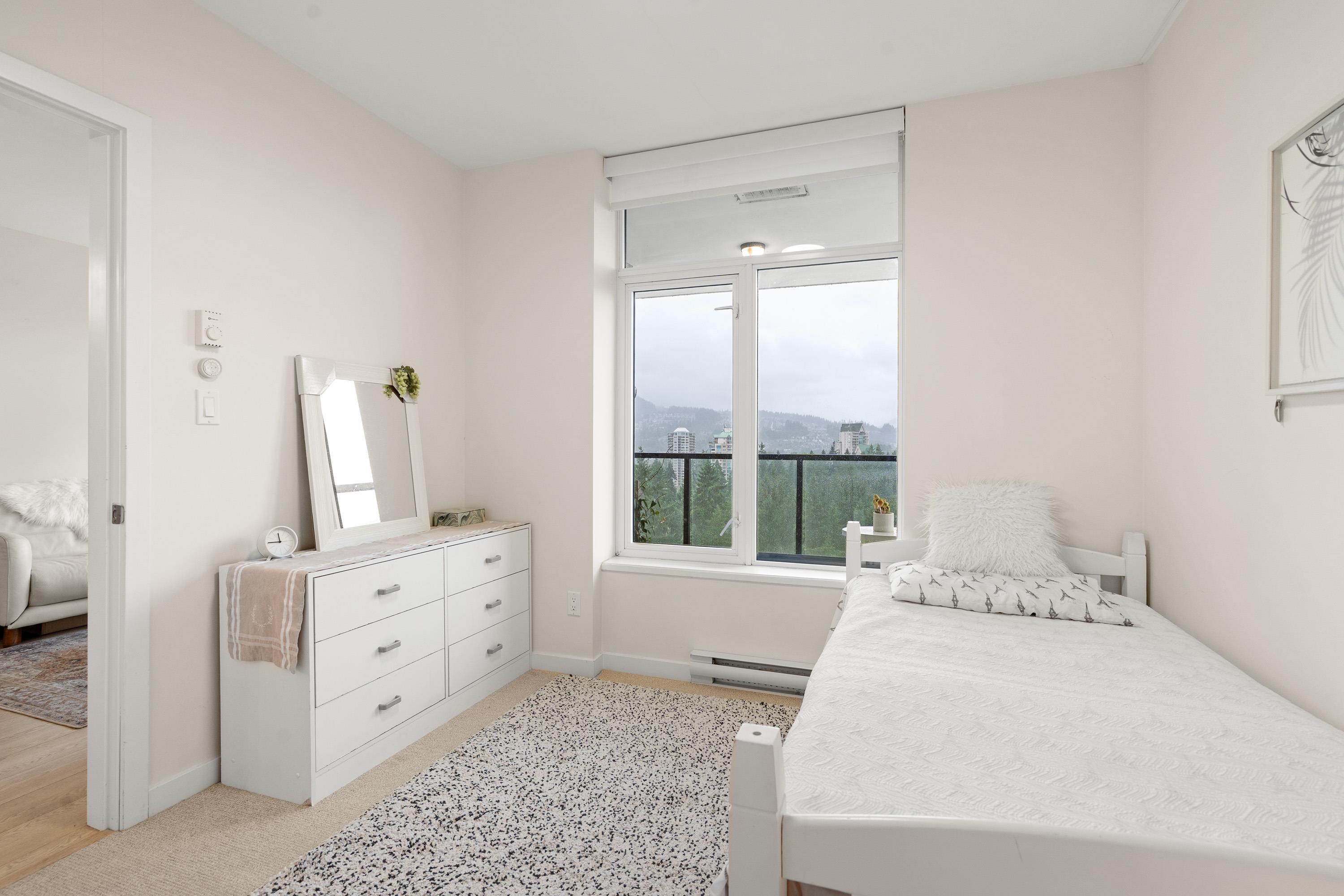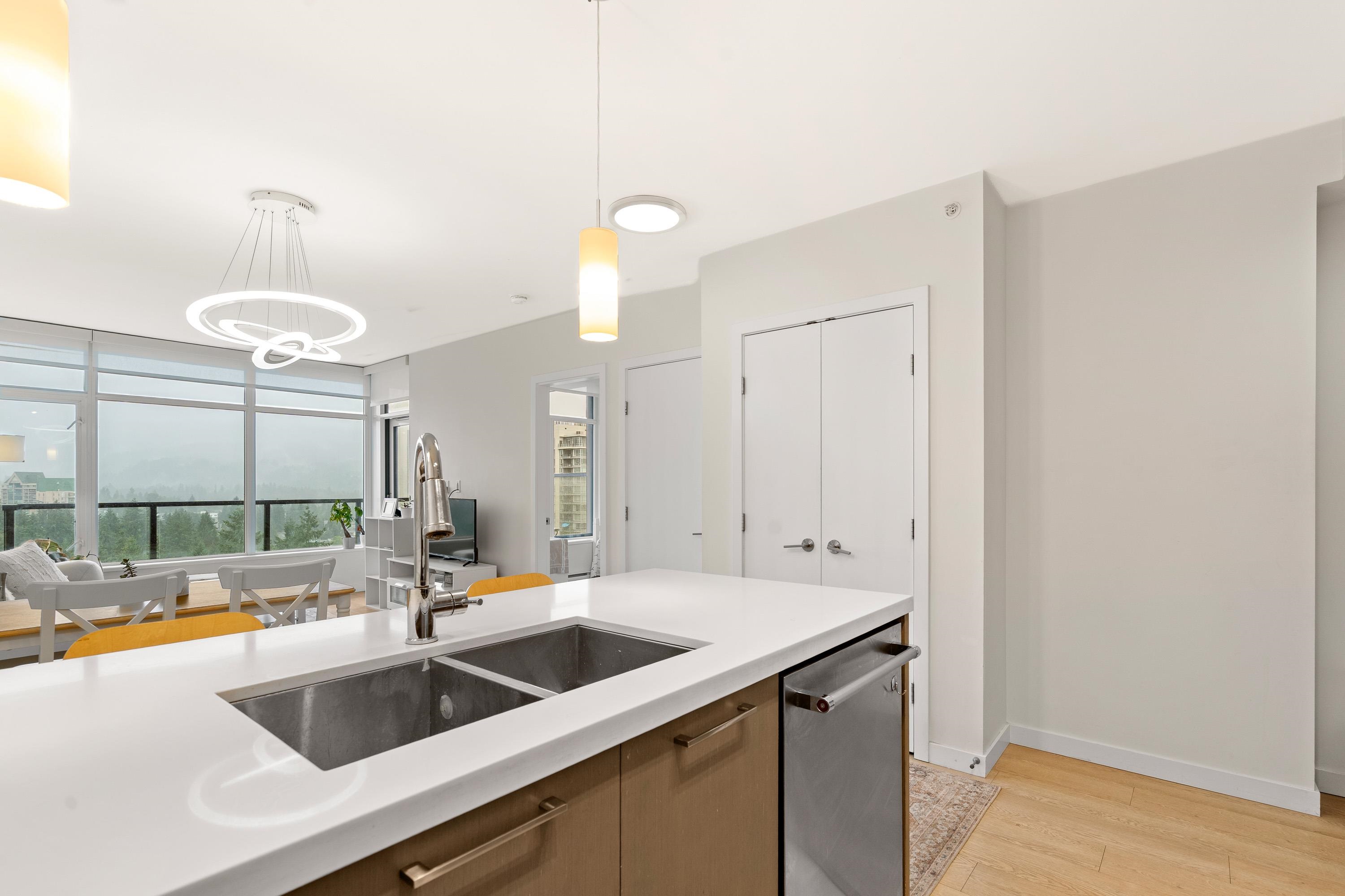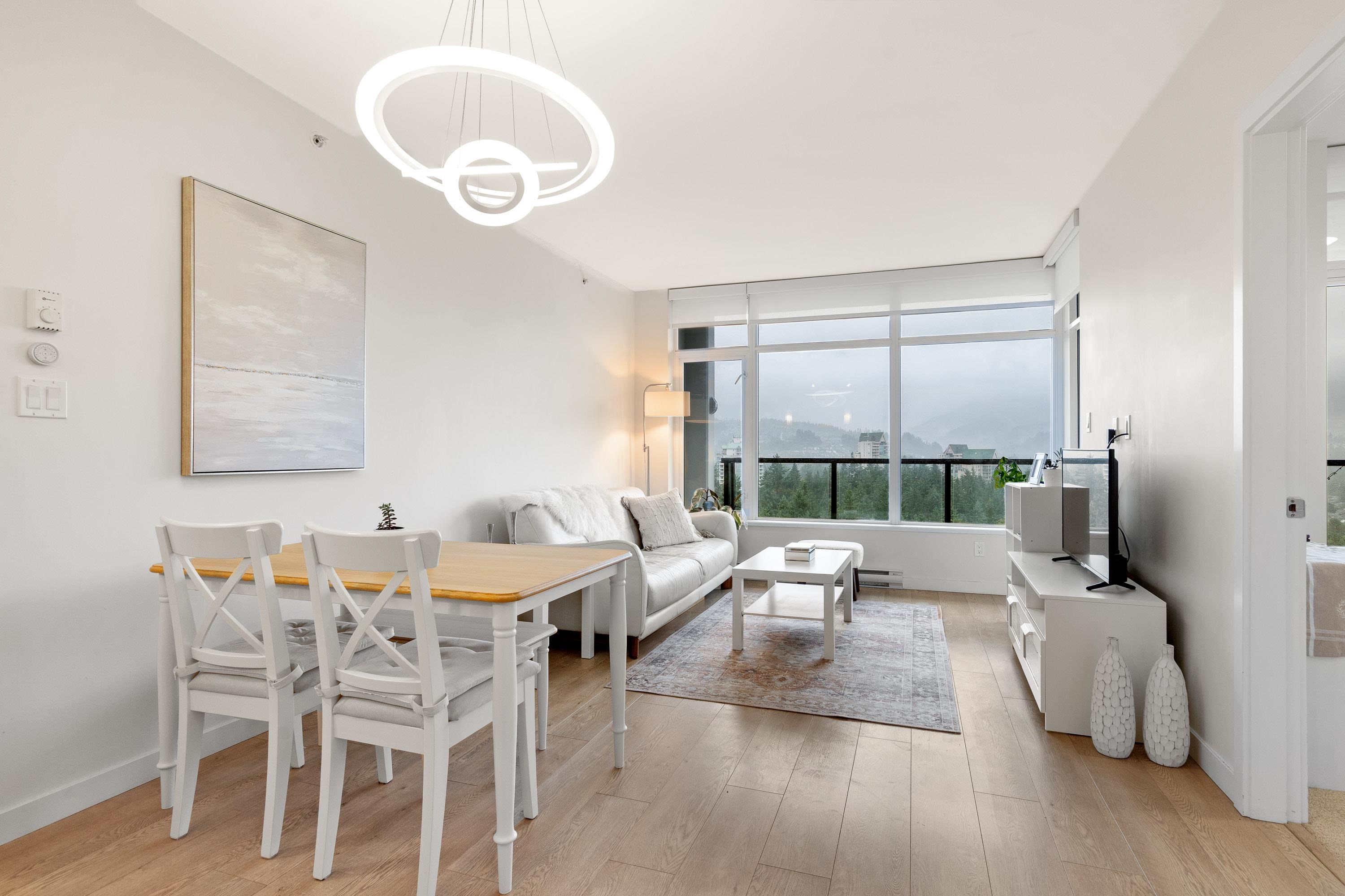 In Coquitlam's most prime location. This 9 year old 848 SF 2 bed + 2 full bath home offers convenience & privacy. The open layout features floor-to-ceiling windows with UNOBSTRUCTED VIEWS of the North Mountains, Glen Park & trees, with no units looking in. Bedrooms are separated on opposite sides for comfort. The modern kitchen boasts S/S appliances, quartz counters, gas cooktop & ample cabinetry. Upgrades incl: Nuheat floors in kitchen/baths, LED lighting & MOTORIZED Hunter Douglas blinds. Building highlig...