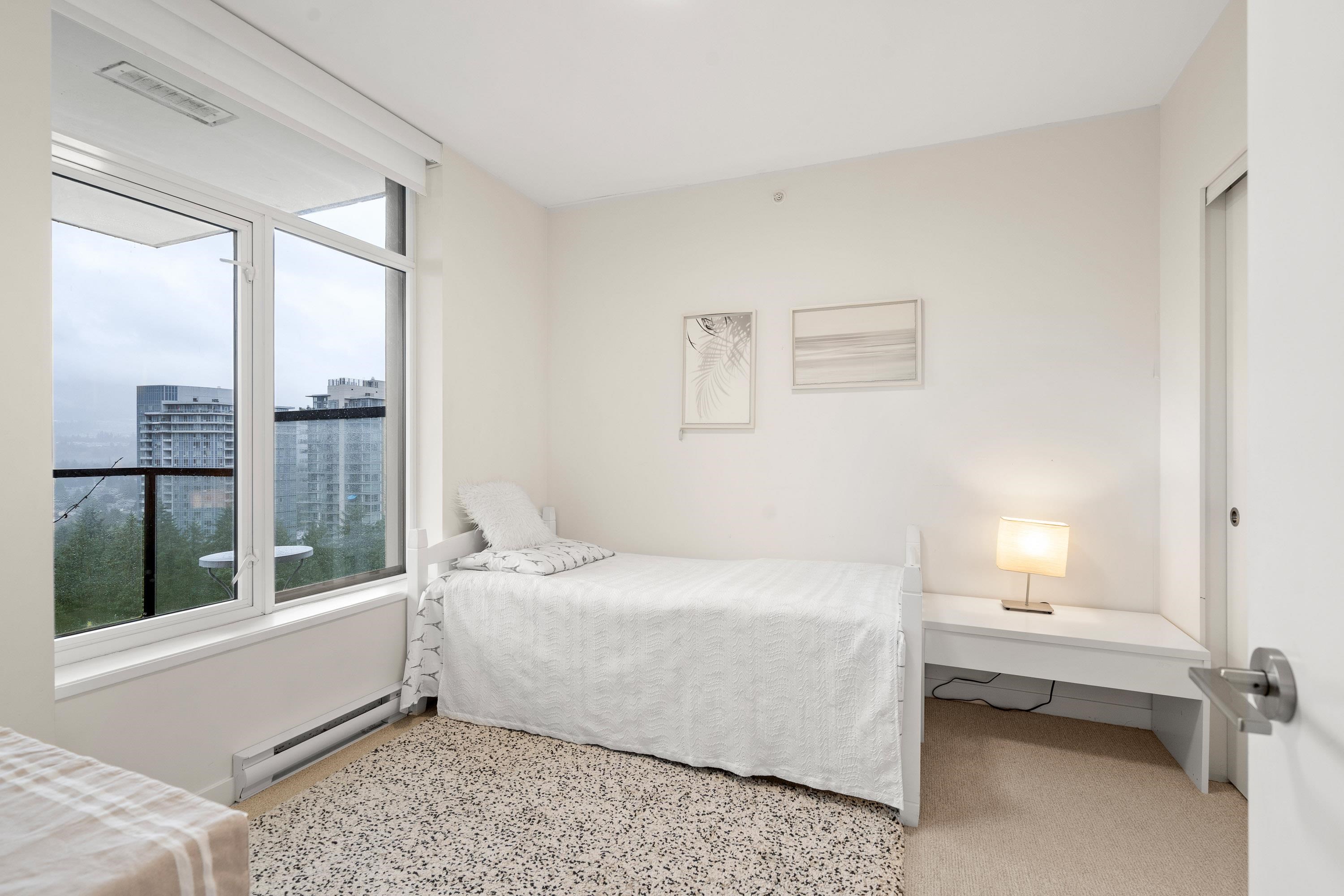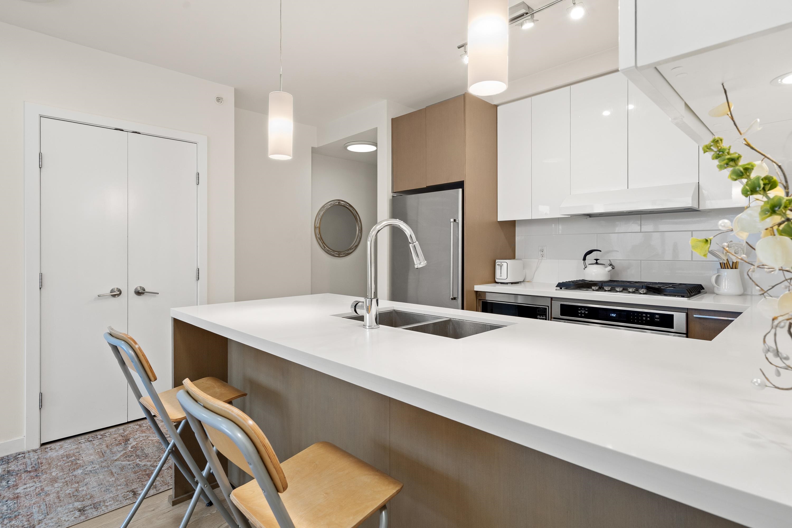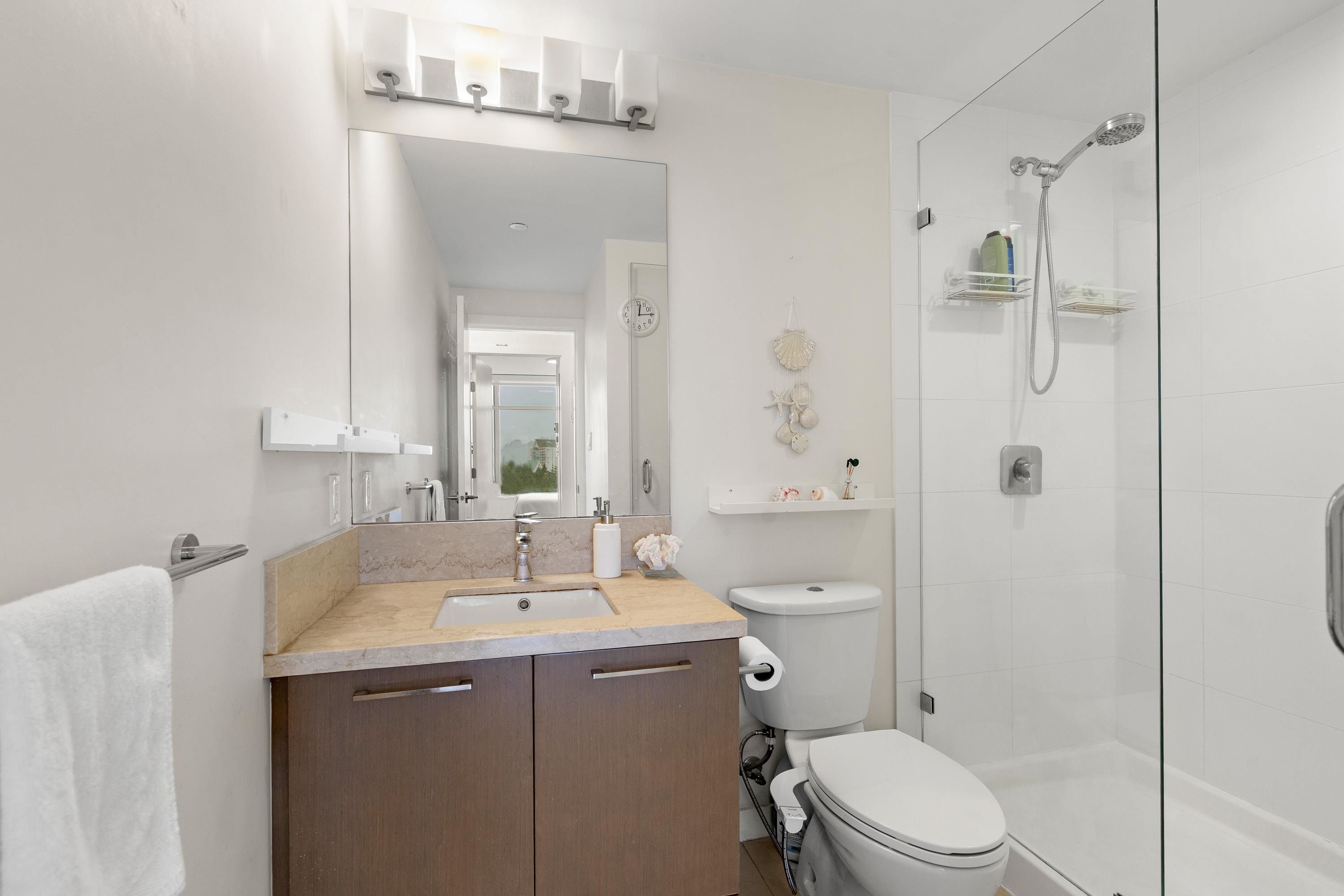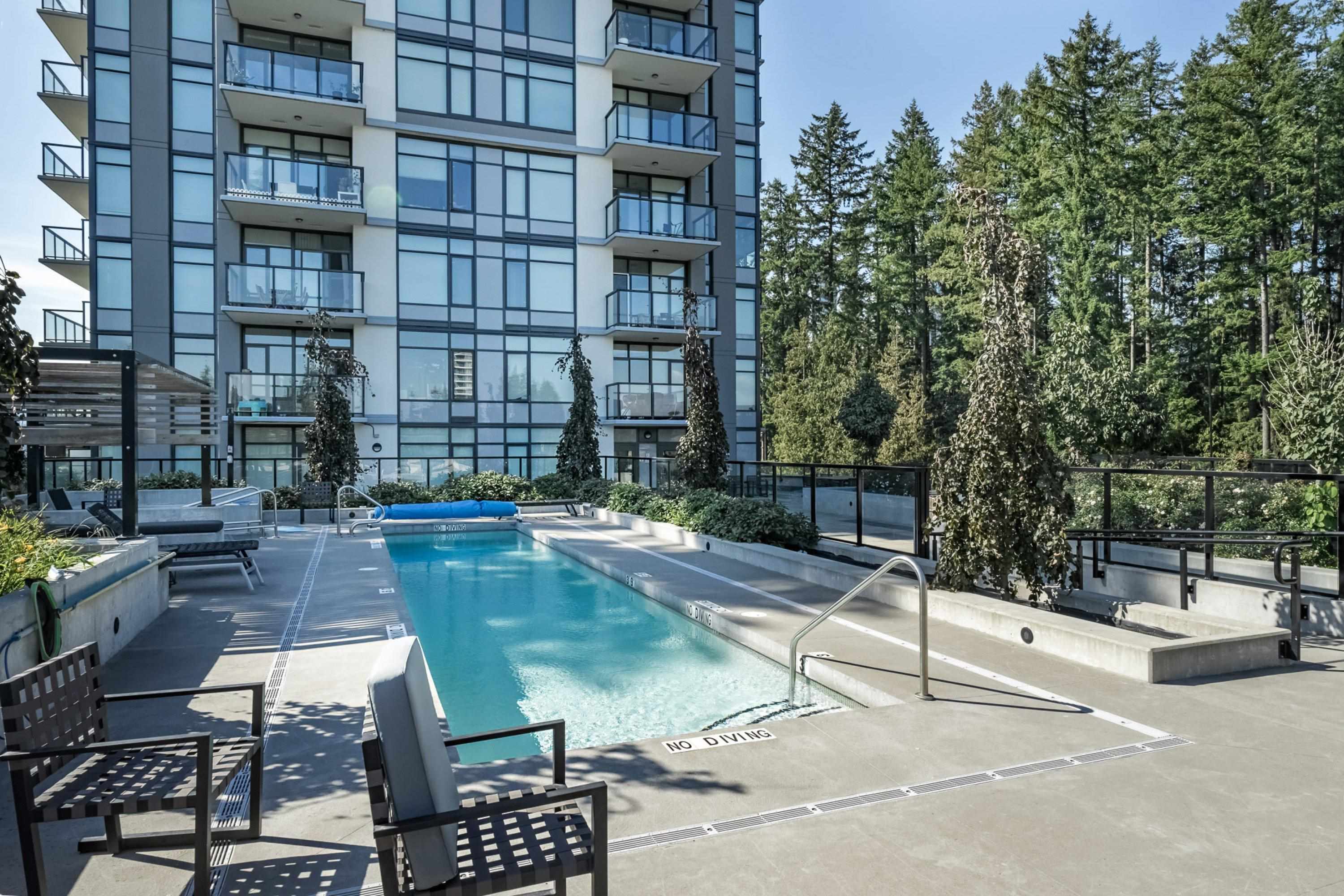 In Coquitlam's most prime location. This 9 year old 848 SF 2 bed + 2 full bath home offers convenience & privacy. The open layout features floor-to-ceiling windows with UNOBSTRUCTED VIEWS of the North Mountains, Glen Park & trees, with no units looking in. Bedrooms are separated on opposite sides for comfort. The modern kitchen boasts S/S appliances, quartz counters, gas cooktop & ample cabinetry. Upgrades incl: Nuheat floors in kitchen/baths, LED lighting & MOTORIZED Hunter Douglas blinds. Building highlig...