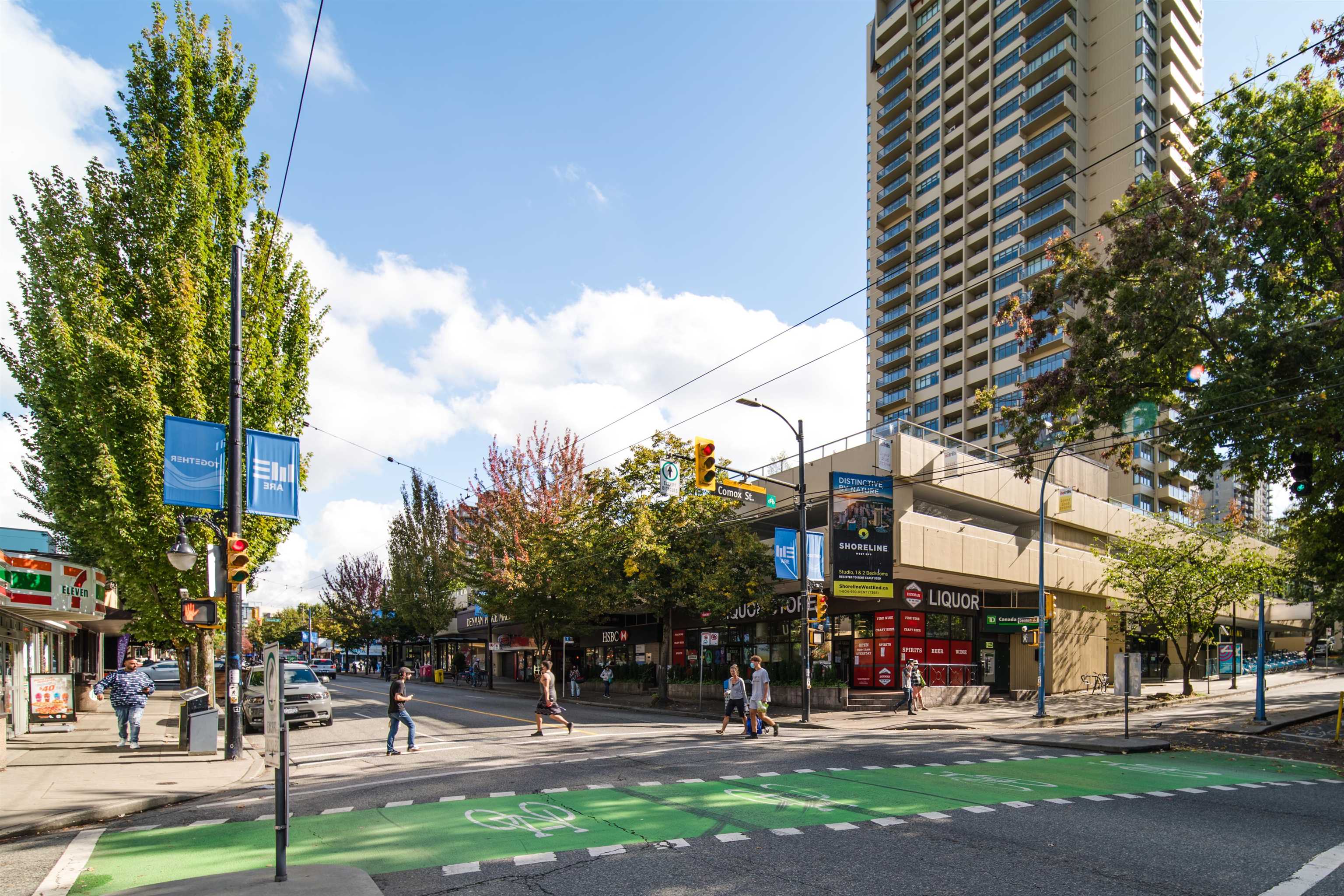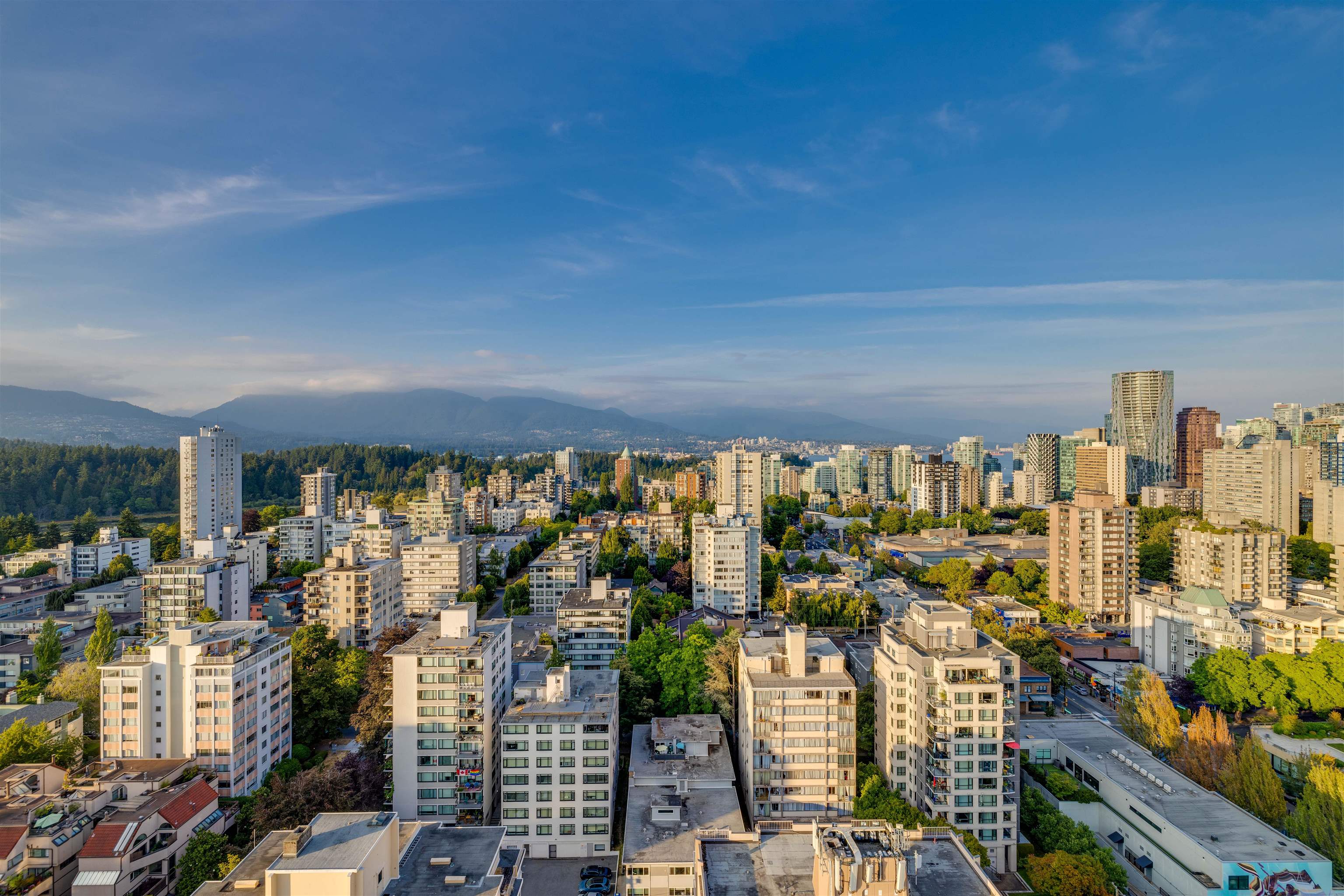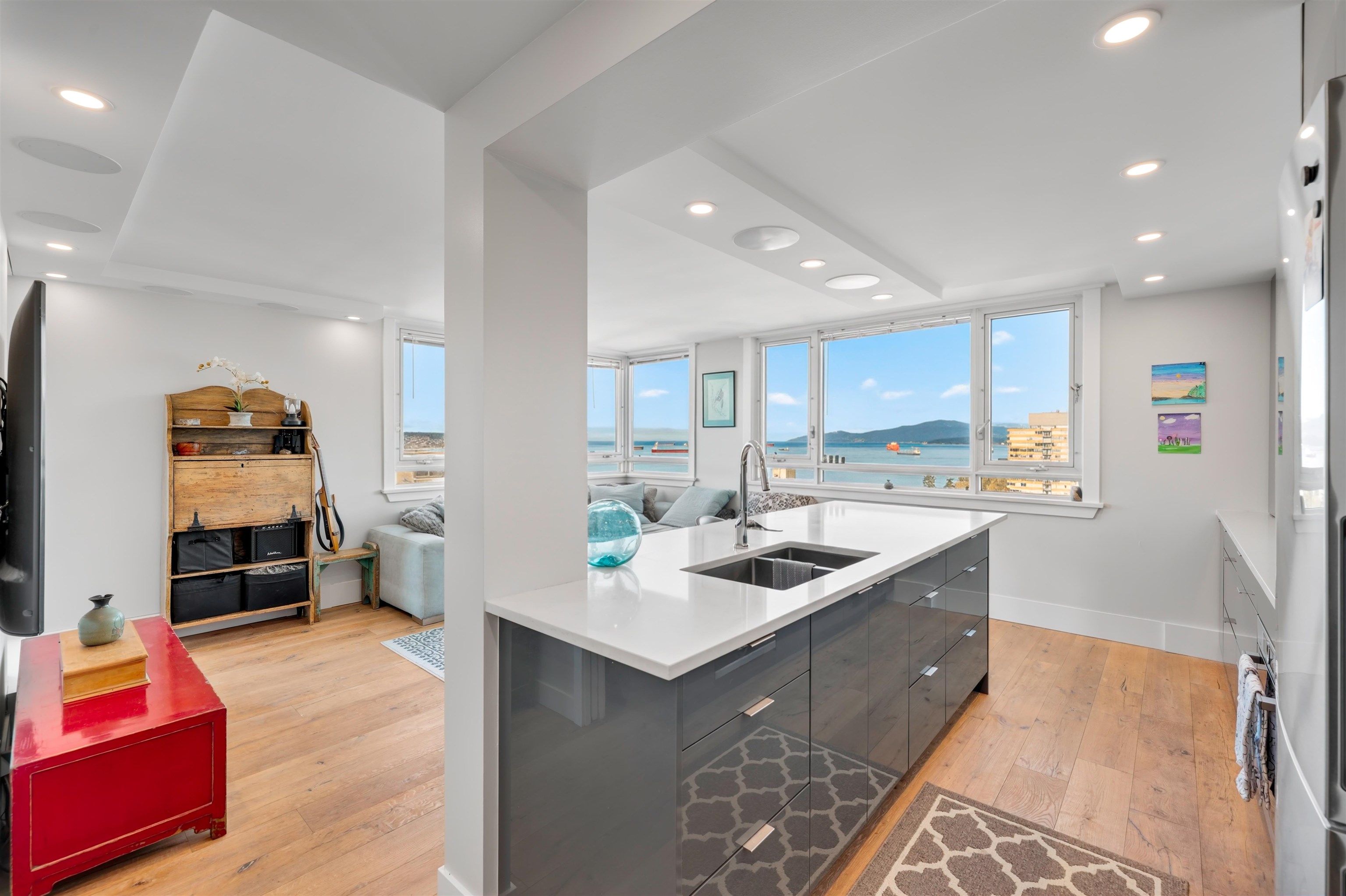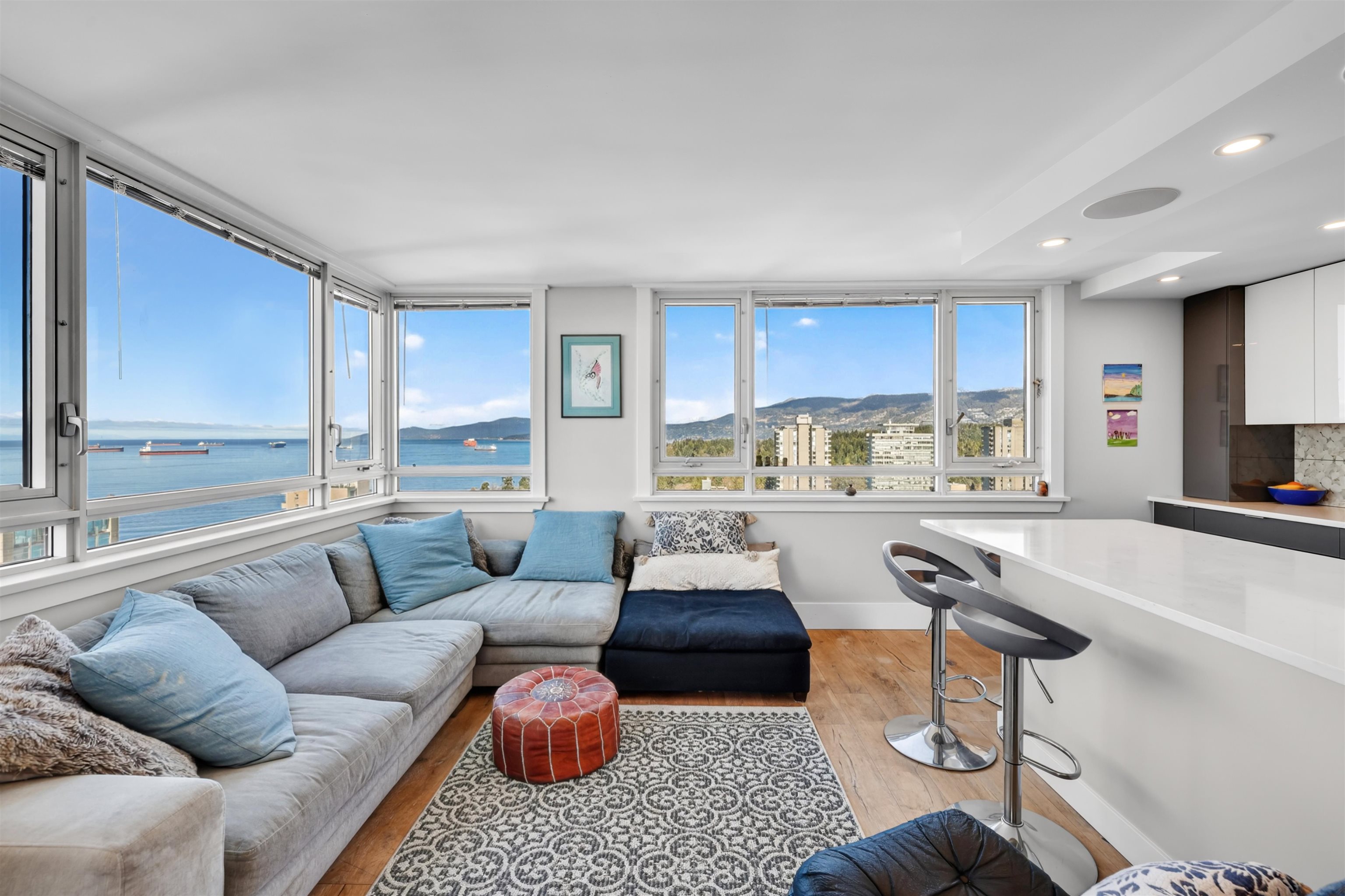 UNIT & VIEW: Sun-kissed SW corner penthouse lvl w/ jaw-dropping views of English Bay, Stanley Park & North Shore Mts. This bright character-filled home fts a corner layout w/ cross-breezes, curved architectural walls & beautiful engineered hardwood flrs. The modern open kitchen is designed w/ sleek cabinetry, S/S appliances & plenty of storage. Stylish renovation continues w/ a spa-inspired bathroom fts a deep soaker tub, while the primary bdrm closet offers custom built-ins. LOCATION: Steps from Denman & D...