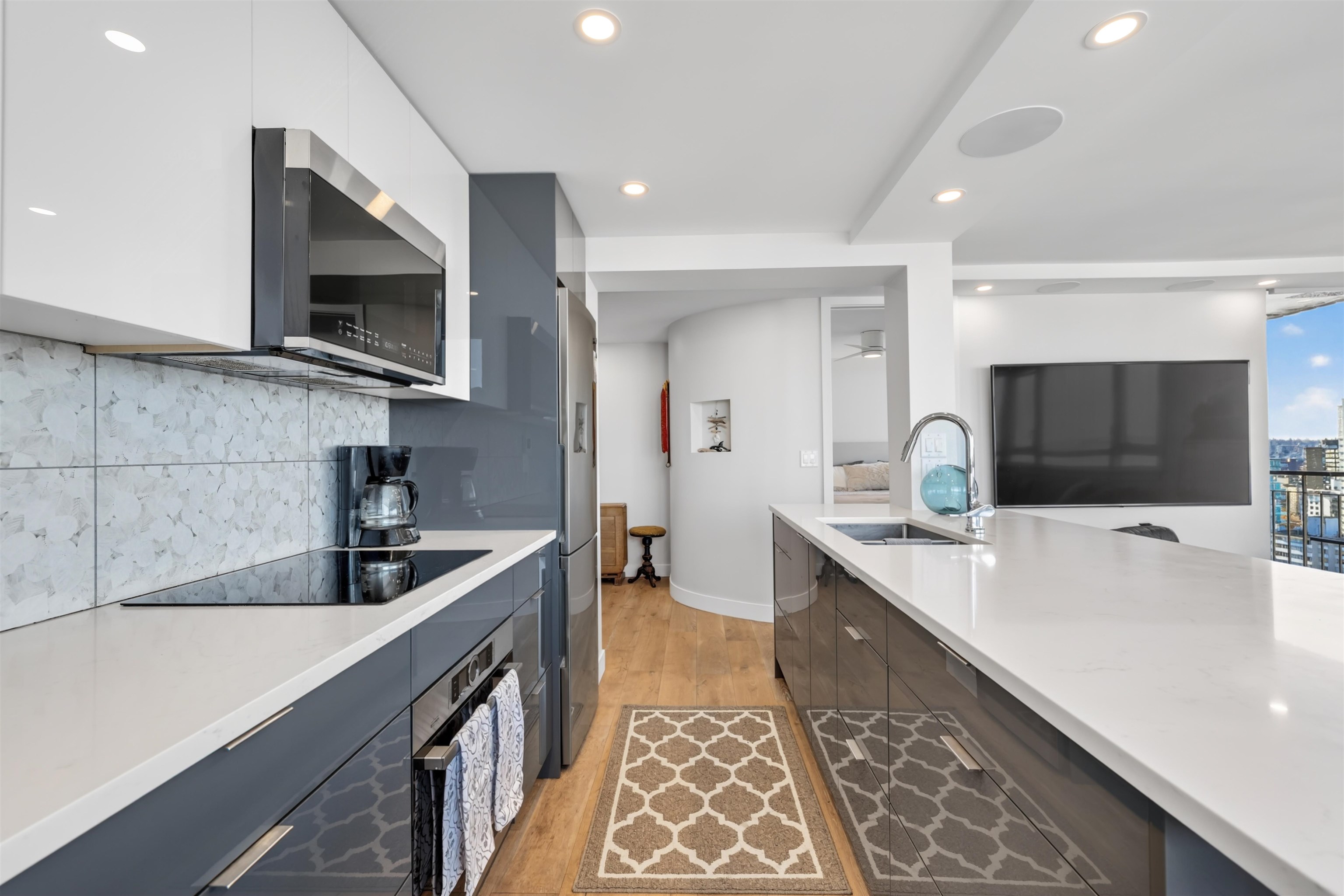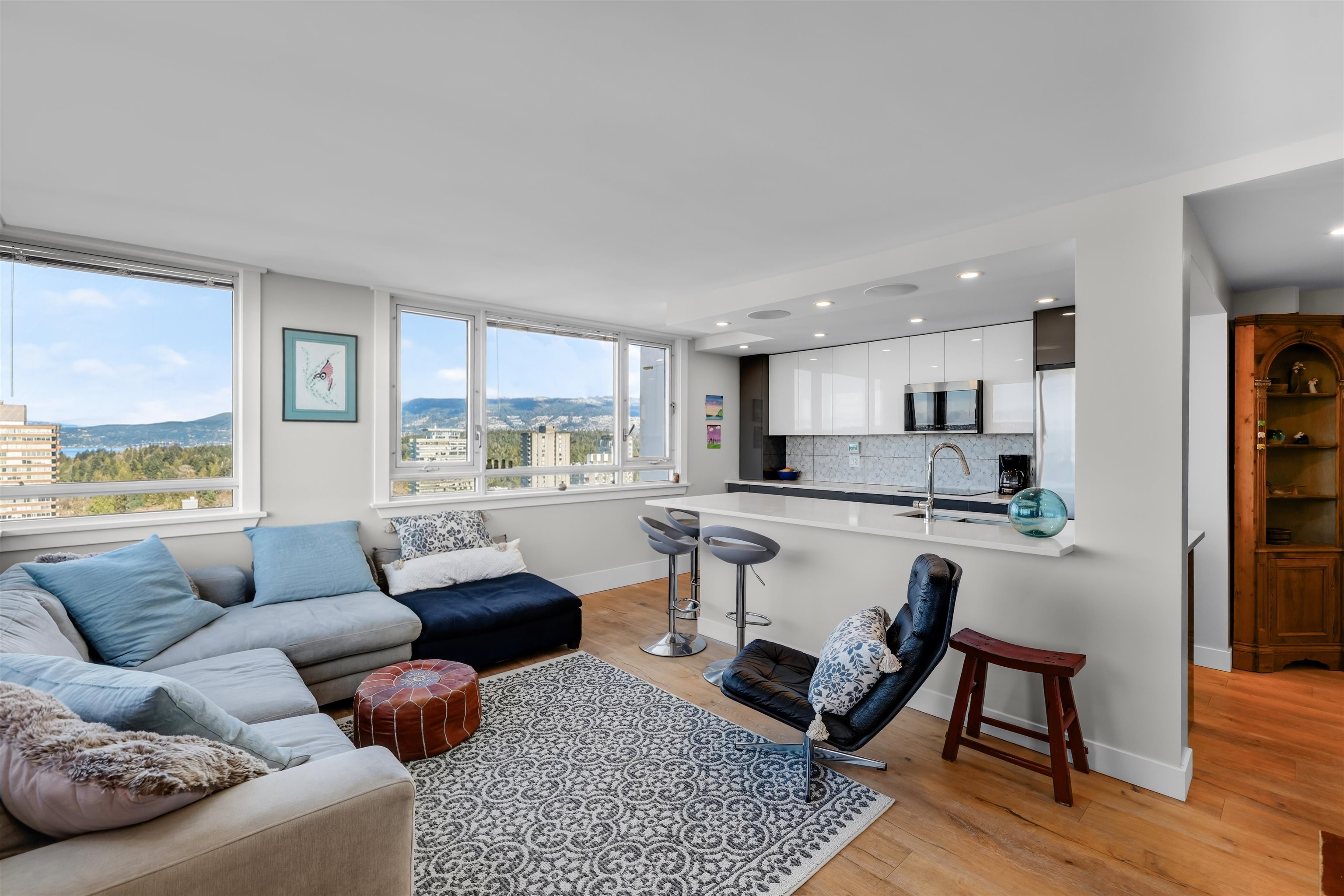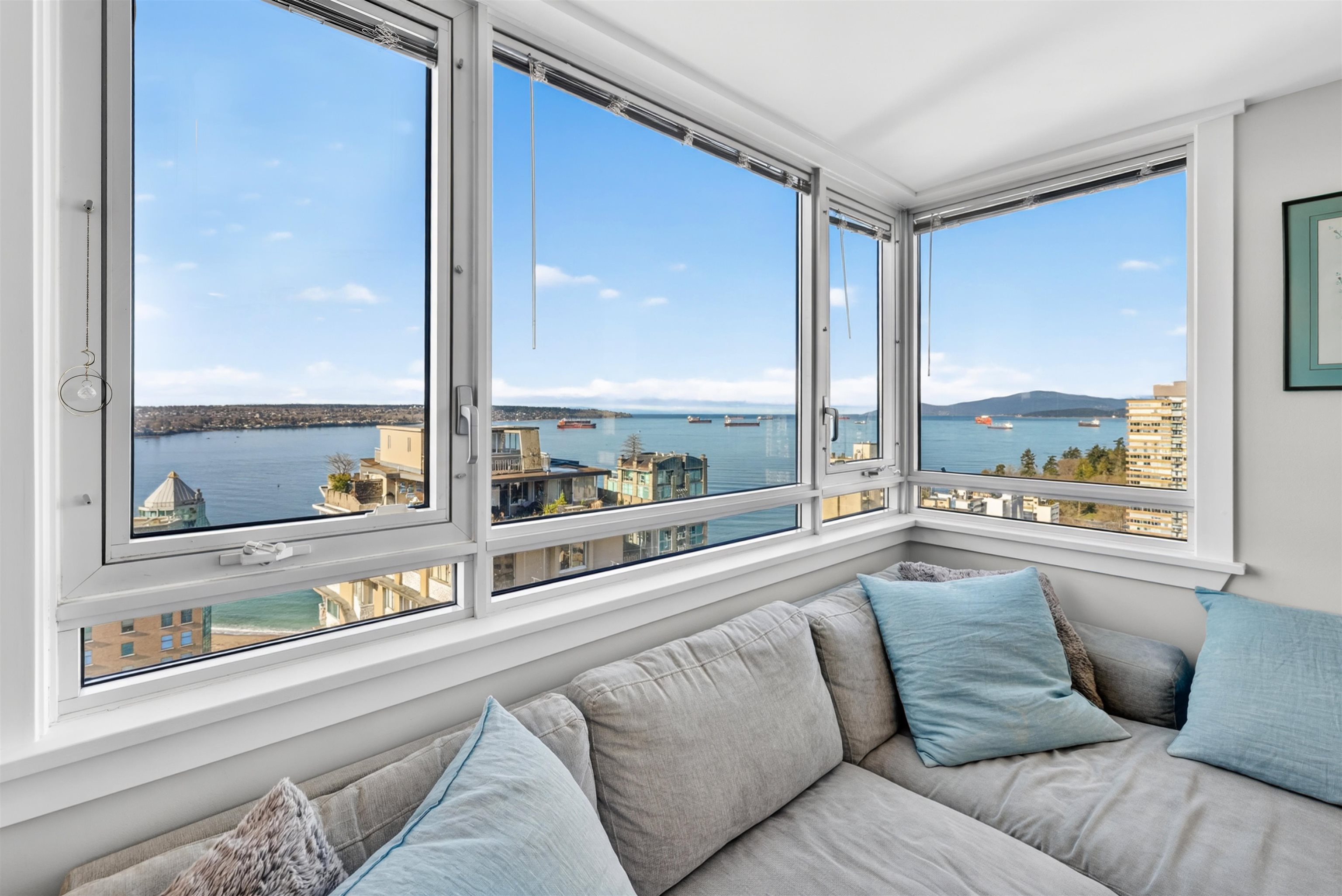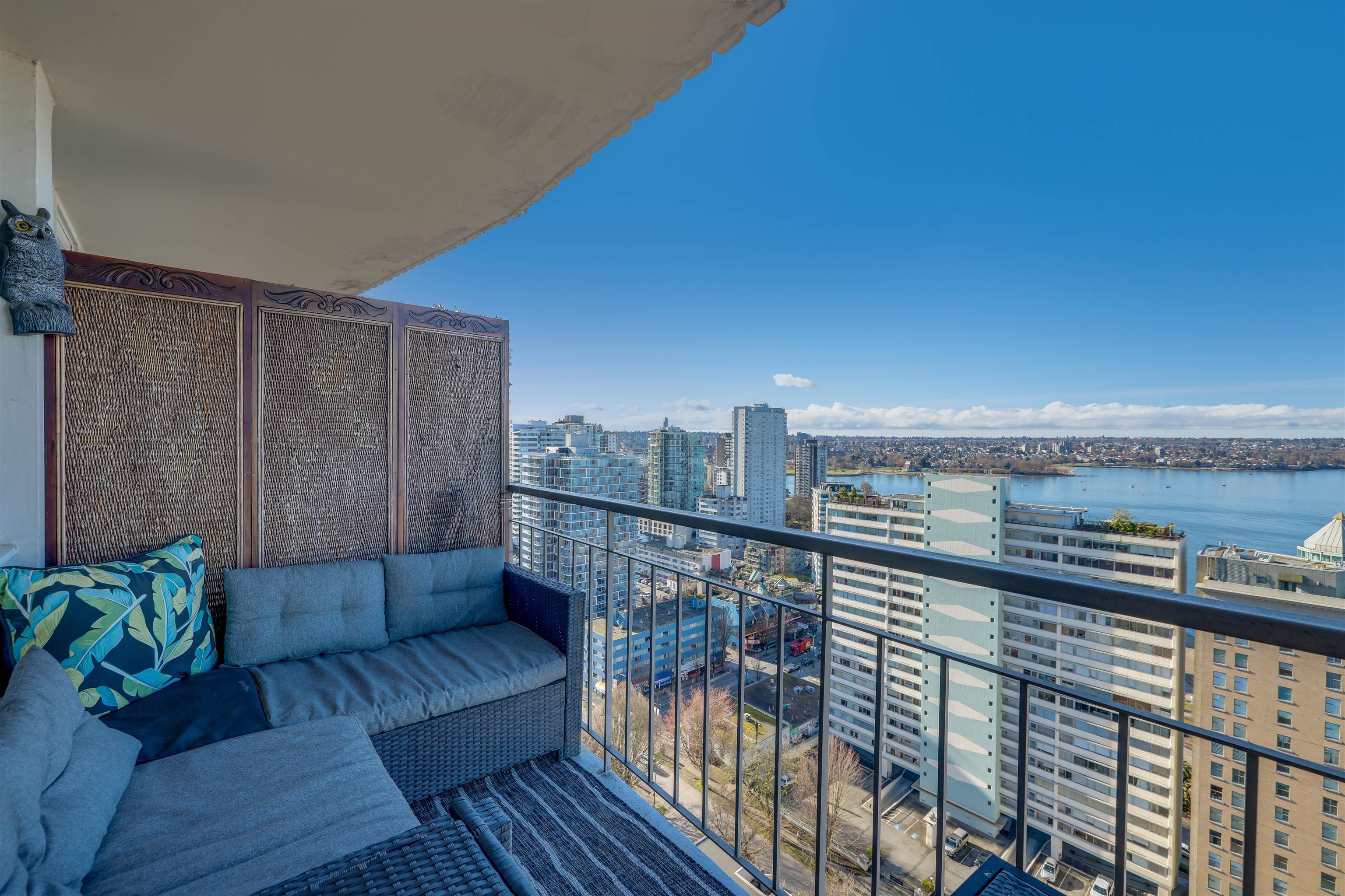 UNIT & VIEW: Sun-kissed SW corner penthouse lvl w/ jaw-dropping views of English Bay, Stanley Park & North Shore Mts. This bright character-filled home fts a corner layout w/ cross-breezes, curved architectural walls & beautiful engineered hardwood flrs. The modern open kitchen is designed w/ sleek cabinetry, S/S appliances & plenty of storage. Stylish renovation continues w/ a spa-inspired bathroom fts a deep soaker tub, while the primary bdrm closet offers custom built-ins. LOCATION: Steps from Denman & D...