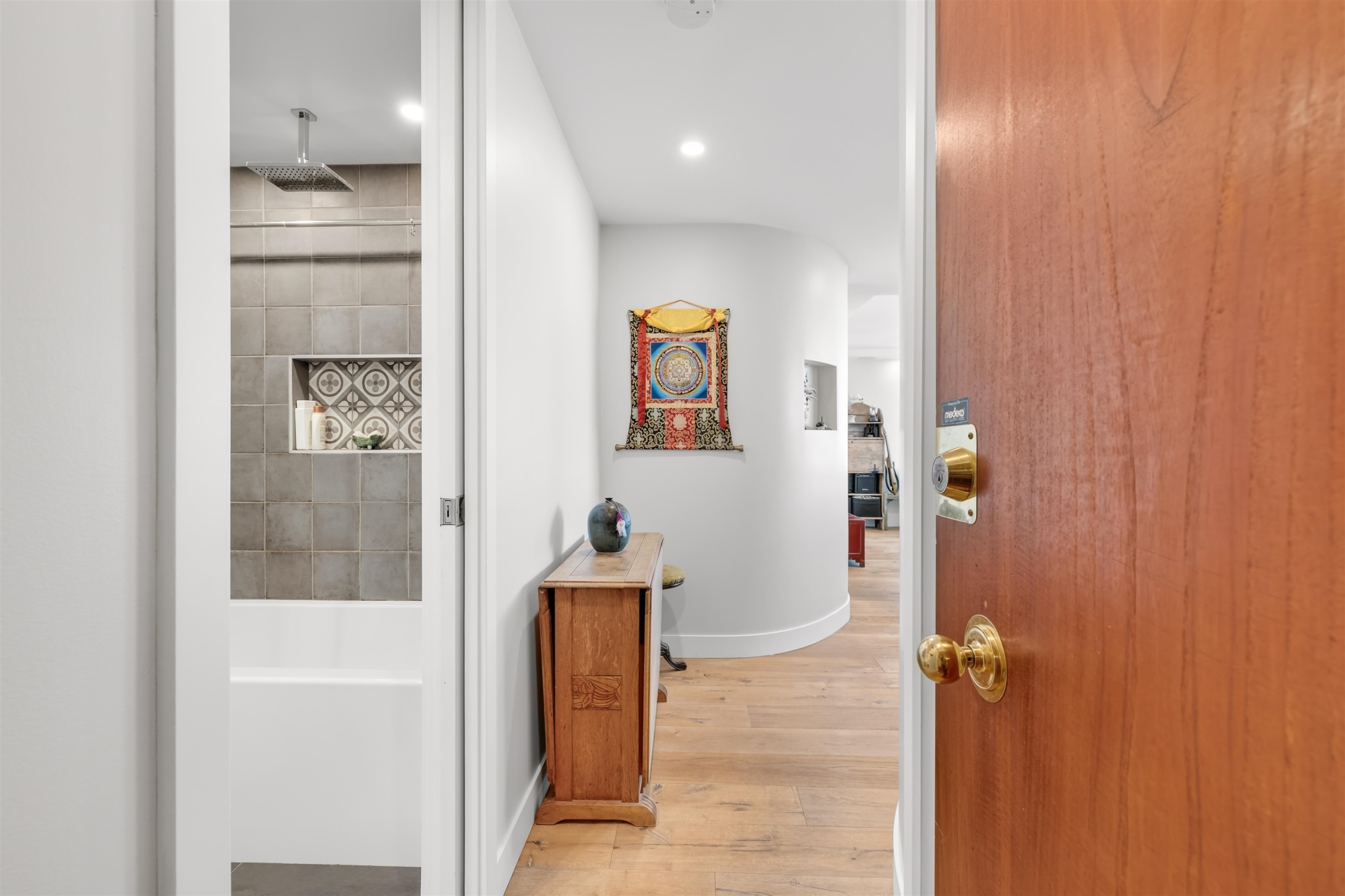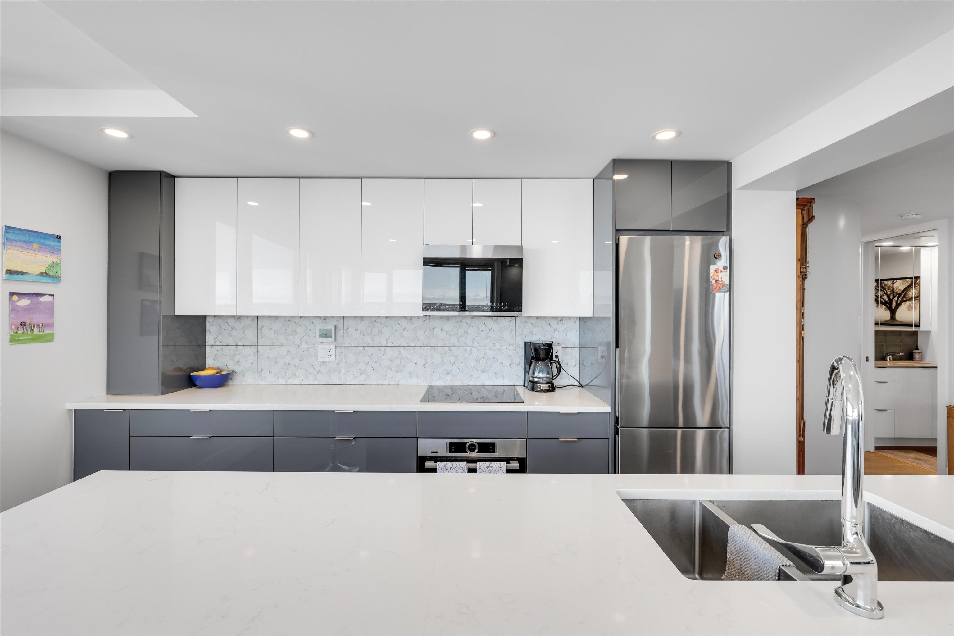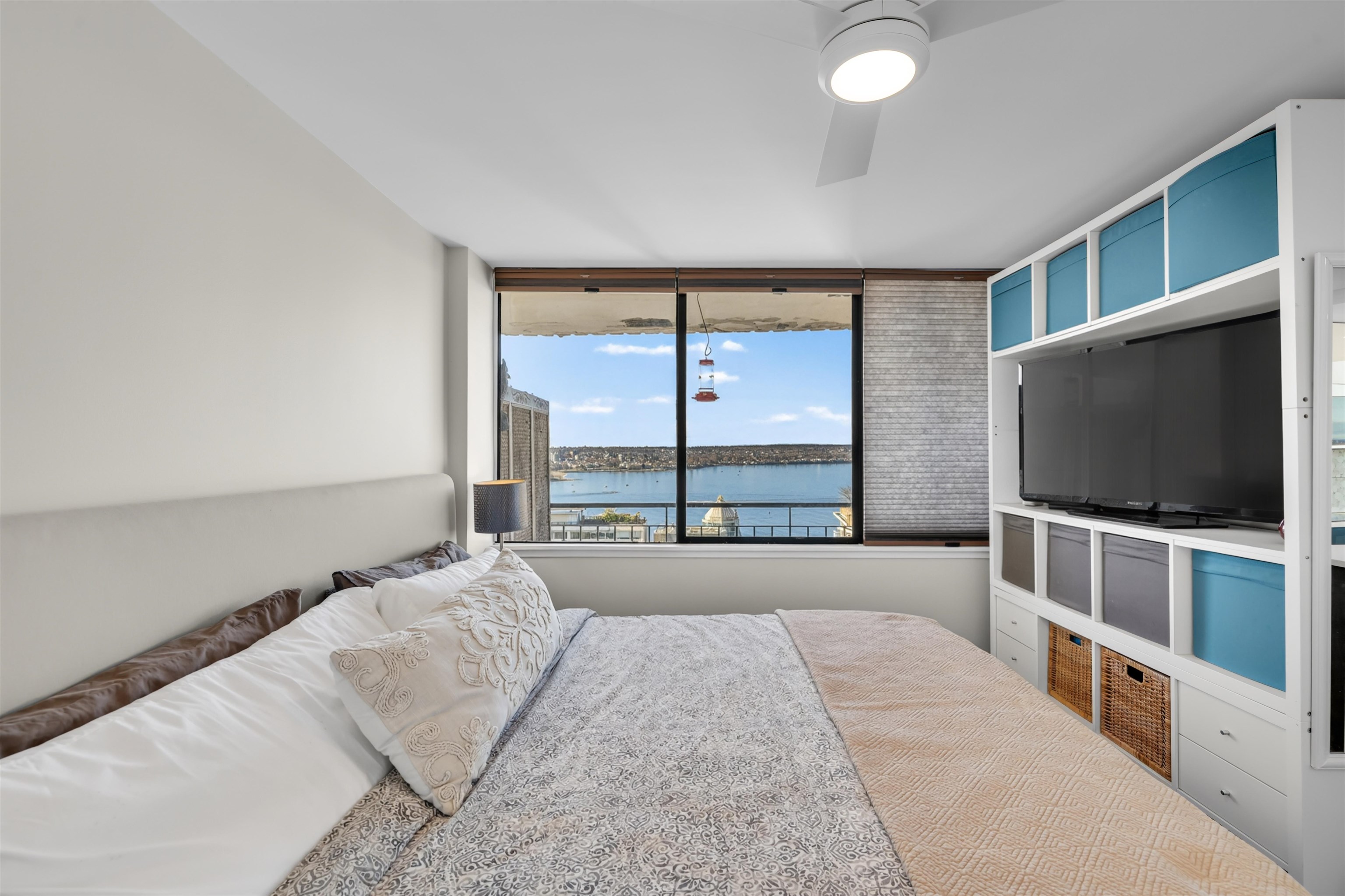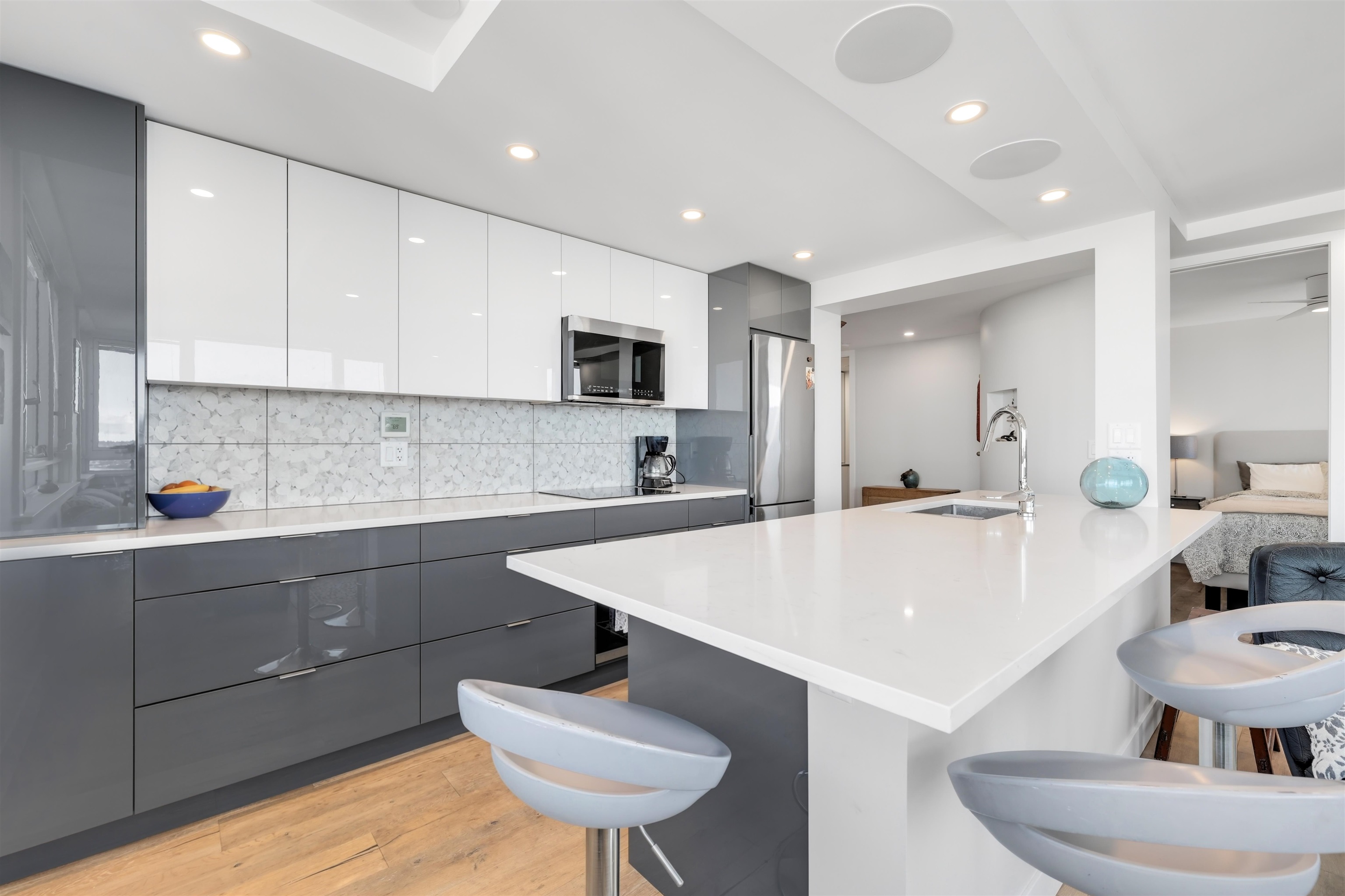 UNIT & VIEW: Sun-kissed SW corner penthouse lvl w/ jaw-dropping views of English Bay, Stanley Park & North Shore Mts. This bright character-filled home fts a corner layout w/ cross-breezes, curved architectural walls & beautiful engineered hardwood flrs. The modern open kitchen is designed w/ sleek cabinetry, S/S appliances & plenty of storage. Stylish renovation continues w/ a spa-inspired bathroom fts a deep soaker tub, while the primary bdrm closet offers custom built-ins. LOCATION: Steps from Denman & D...