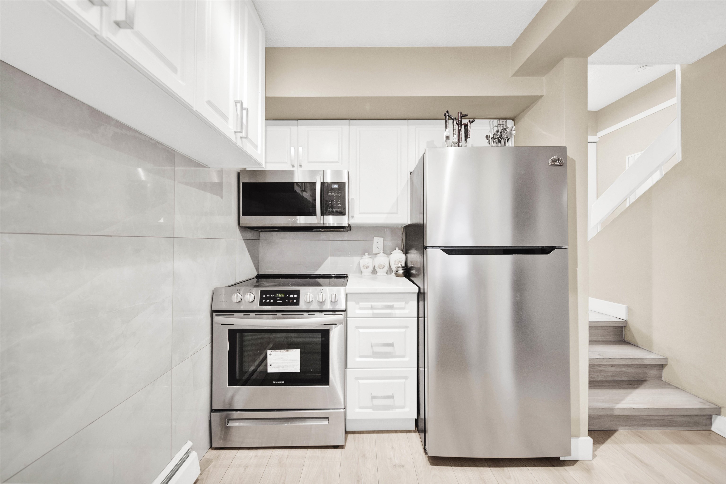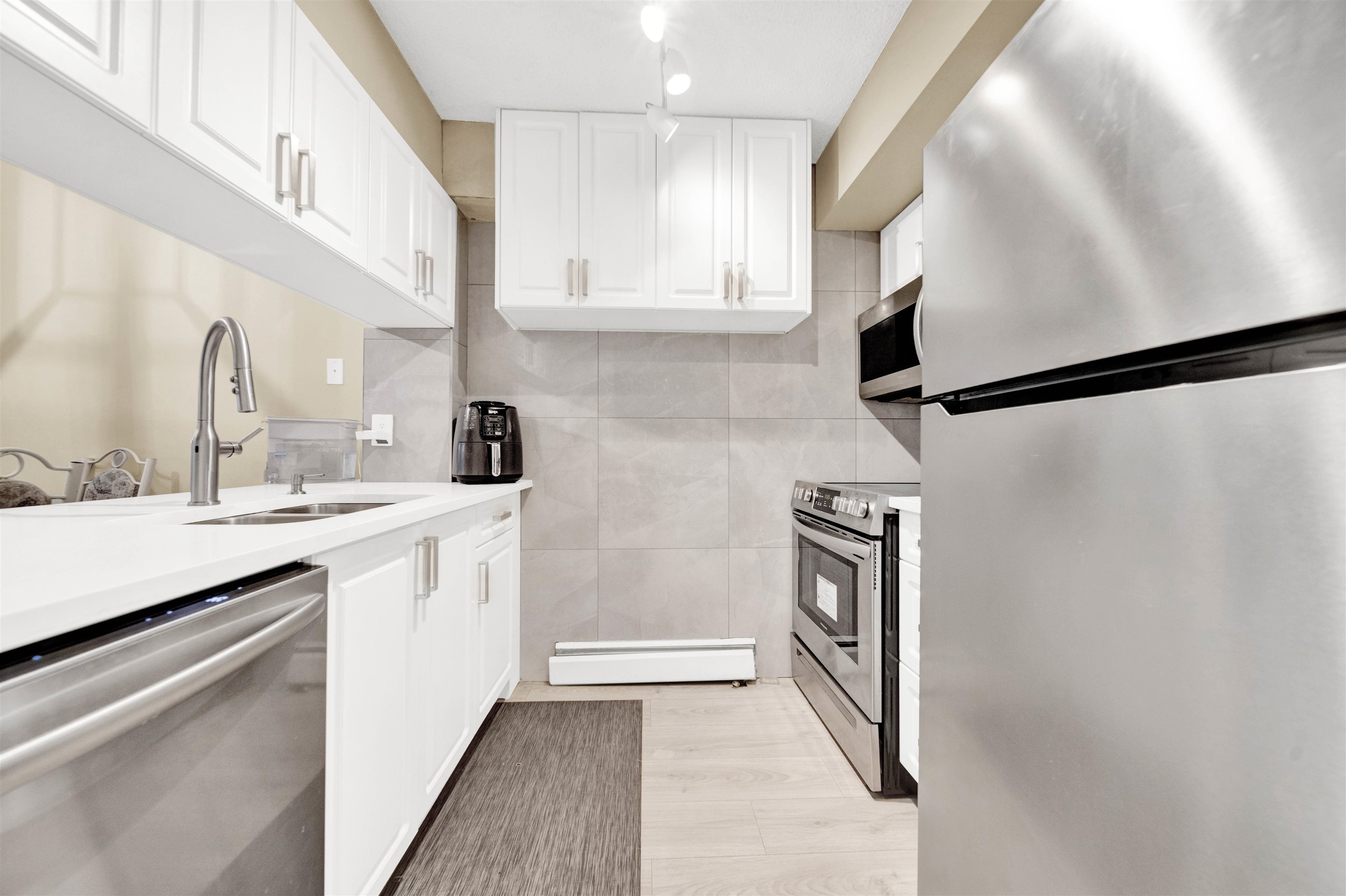 2 bed 2 bath corner townhome in the heart of Cloverdale. Renovated - main floor features fully renovated kitchen with new kitchen cabinets, quartz countertop, new appliances & dining room/living room with laminate flooring. New paint & carpet throughout. Separate laundry room with storage & powder all on the main. Upstairs - 2 large bedrooms with new paint & new elegant light fixtures. Main bathroom has new quartz countertop and new vanity cabinets; new vanity light fixture with new tiles on the bathtub wal...