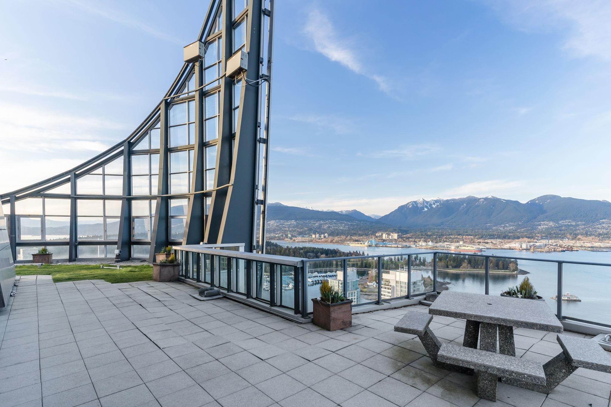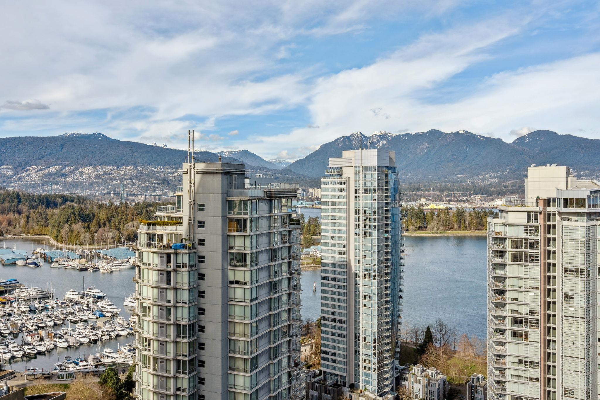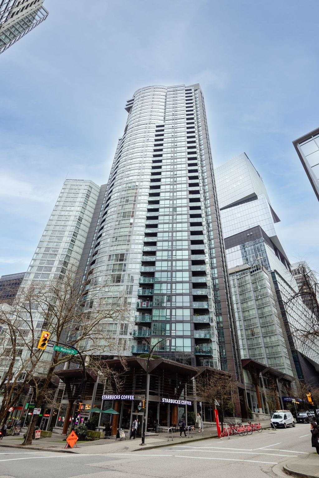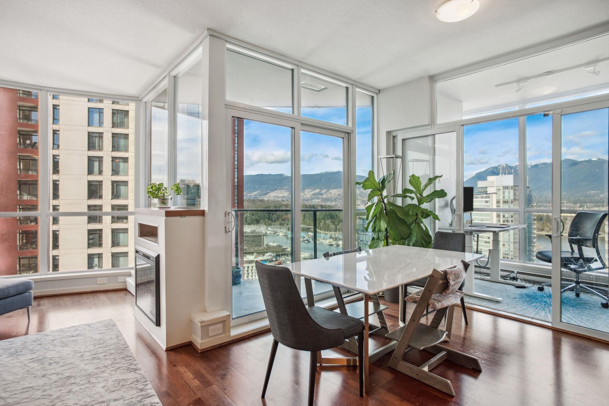 Discover elevated living at its best, welcome to The Melville! Enjoy breathtaking corner-unit views of Coal Harbour, North Shore Mountains, Marina and DT Vancouver. Recently professionally painted, this stunning 2 bed 2 bath home features the desirable NW corner floor plan w/ 9' ceilings, den and solarium. Enjoy sunsets from your beautiful outdoor patio.This impeccably designed home boasts hardwood floors, fireplace, premium full-size stainless steel appliances, granite & marble countertops w/ ample storage...