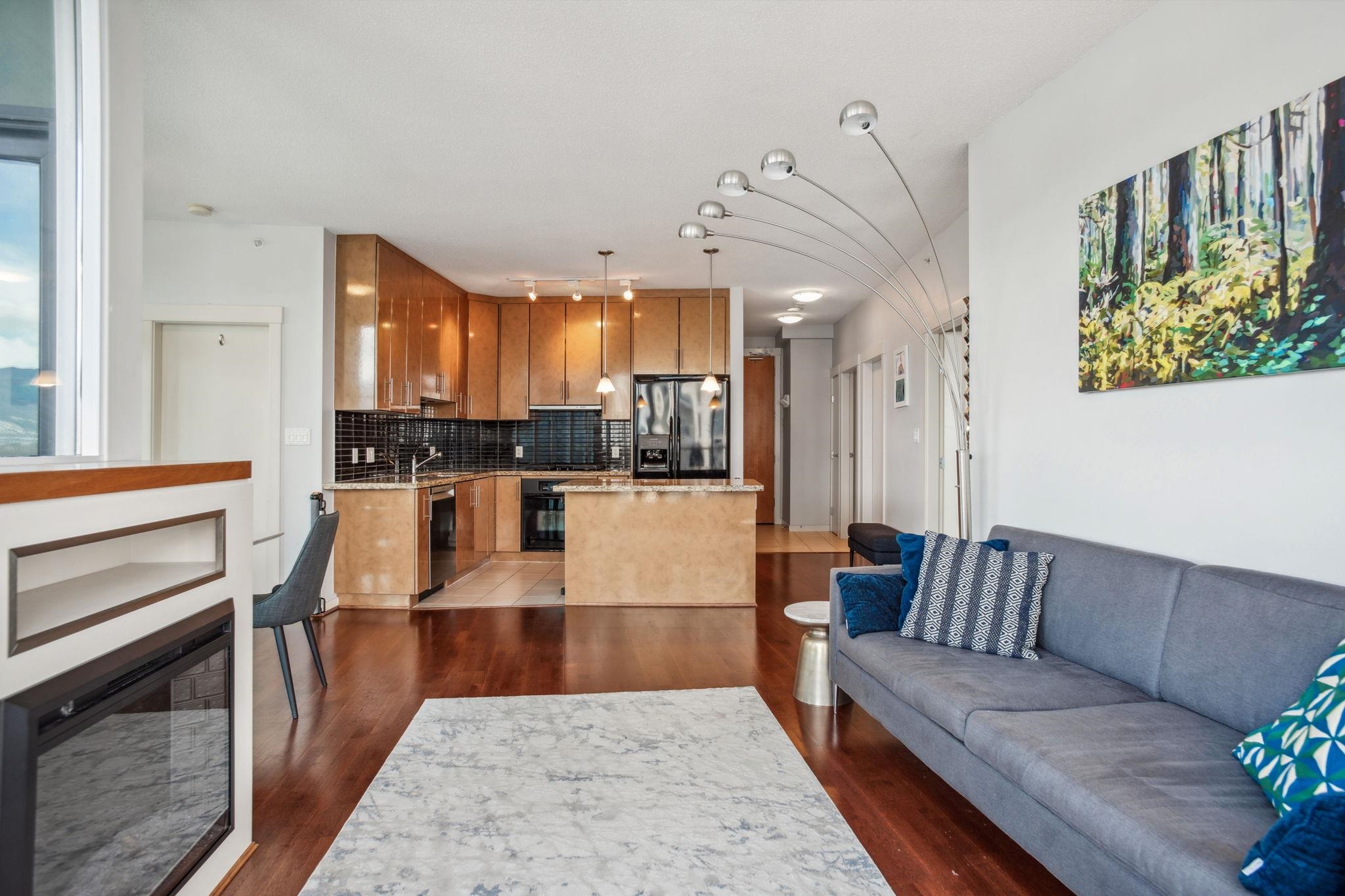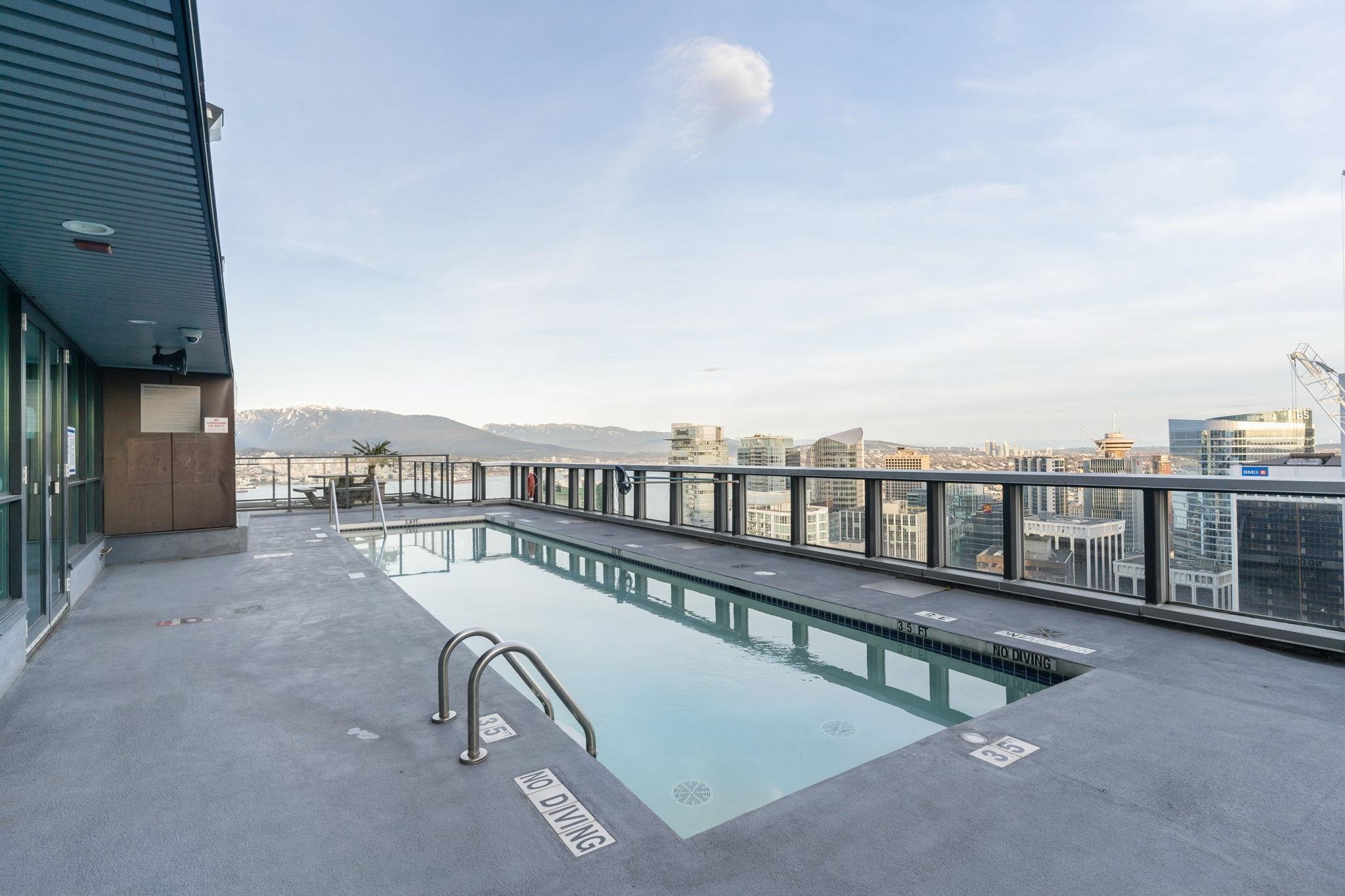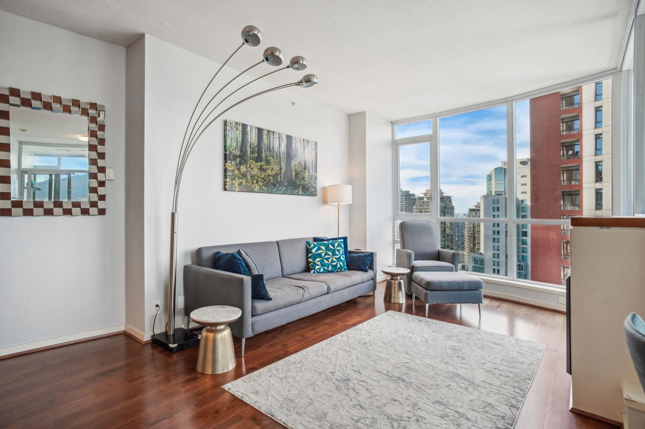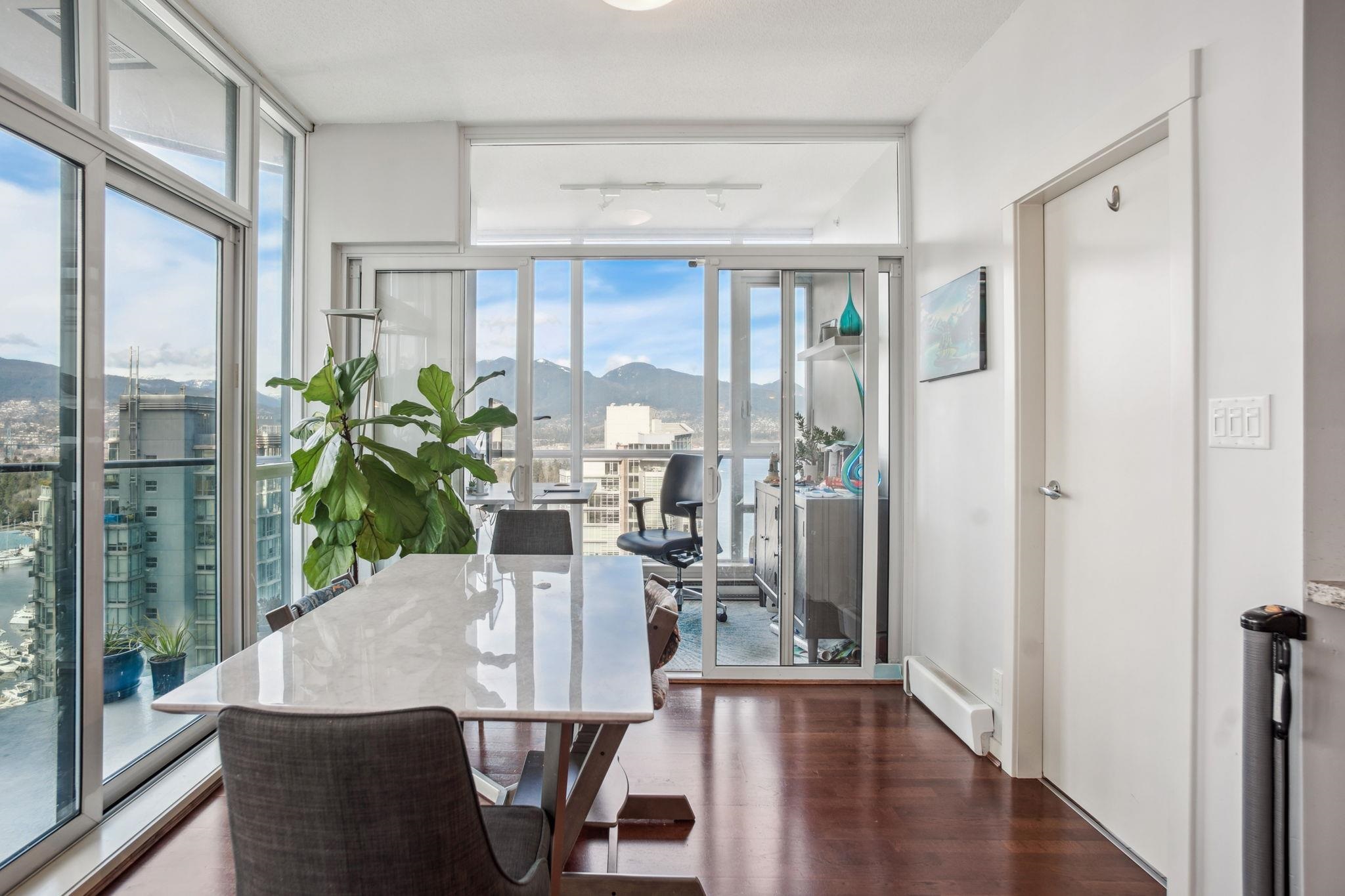 Discover elevated living at its best, welcome to The Melville! Enjoy breathtaking corner-unit views of Coal Harbour, North Shore Mountains, Marina and DT Vancouver. Recently professionally painted, this stunning 2 bed 2 bath home features the desirable NW corner floor plan w/ 9' ceilings, den and solarium. Enjoy sunsets from your beautiful outdoor patio.This impeccably designed home boasts hardwood floors, fireplace, premium full-size stainless steel appliances, granite & marble countertops w/ ample storage...