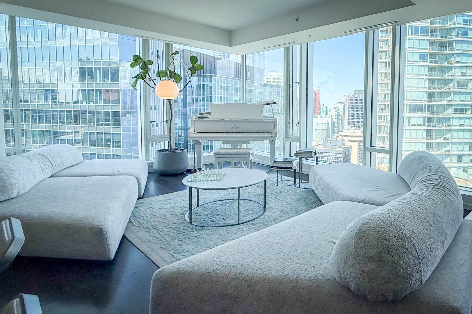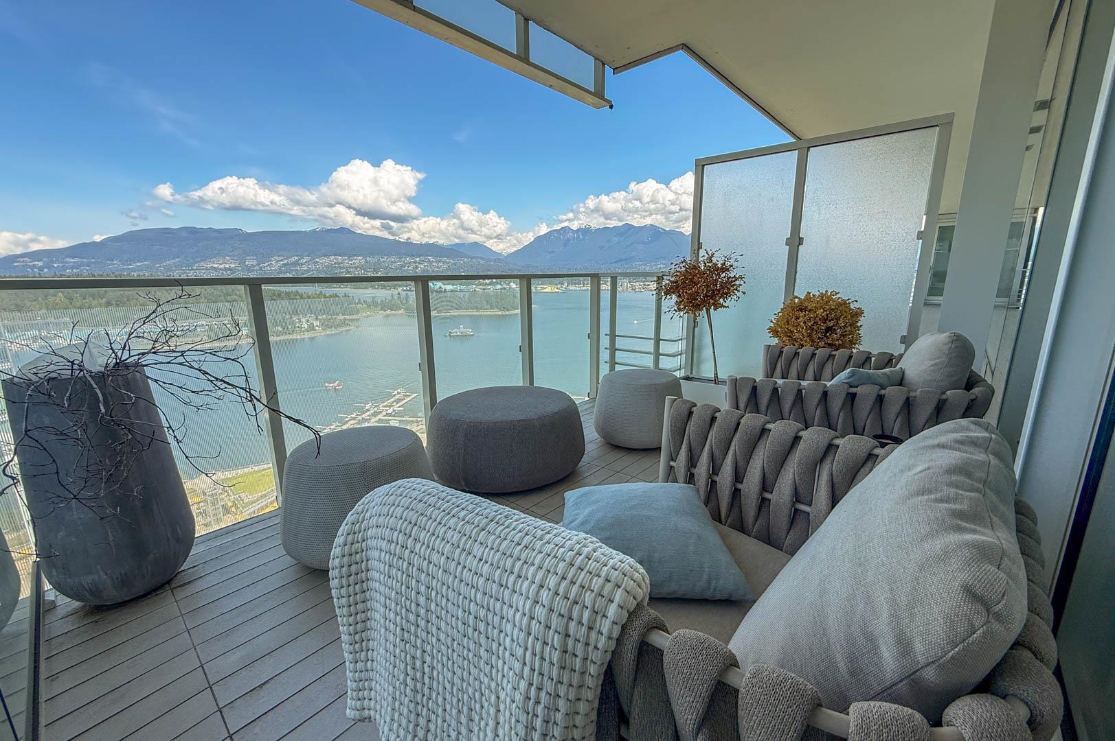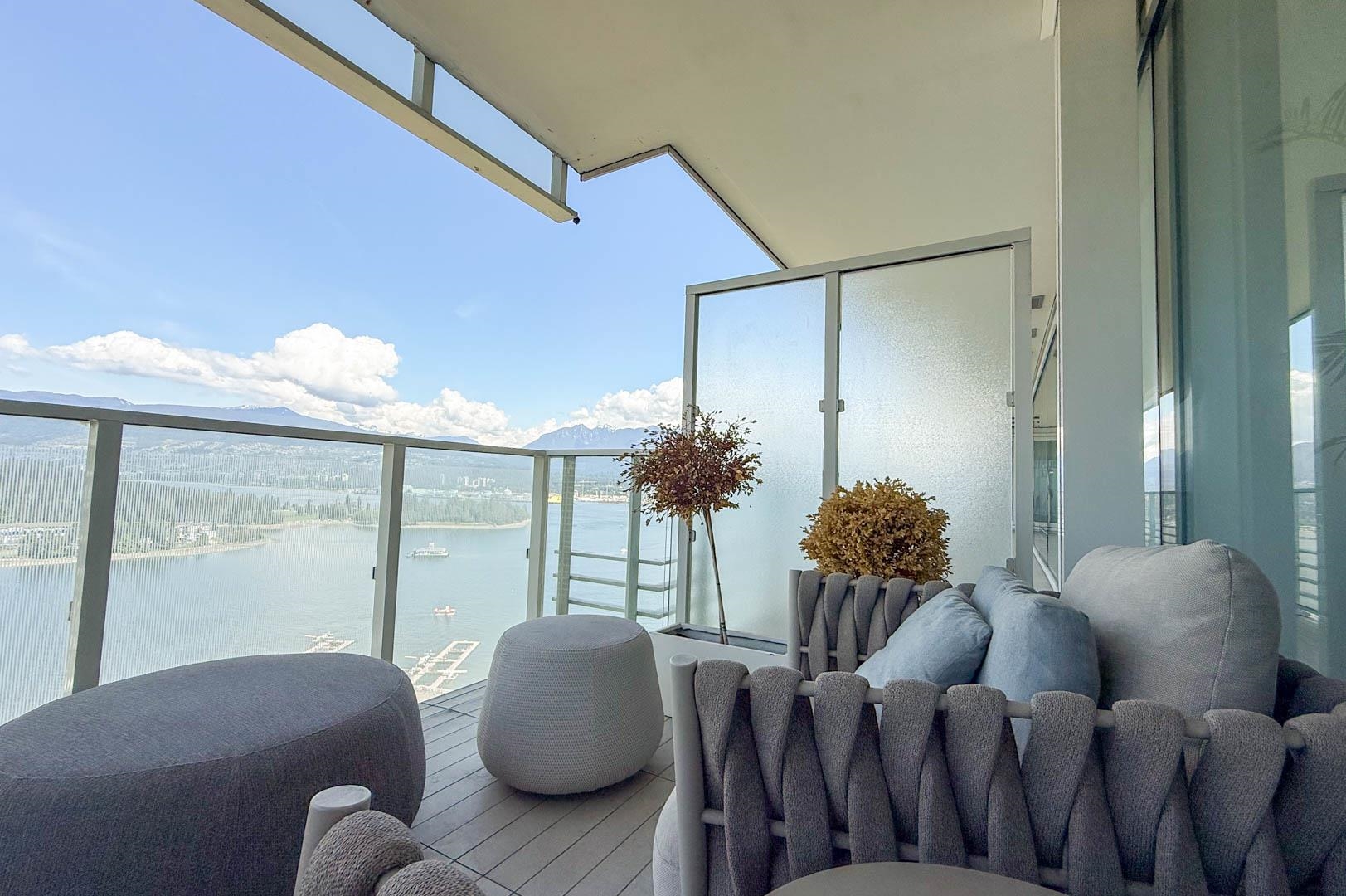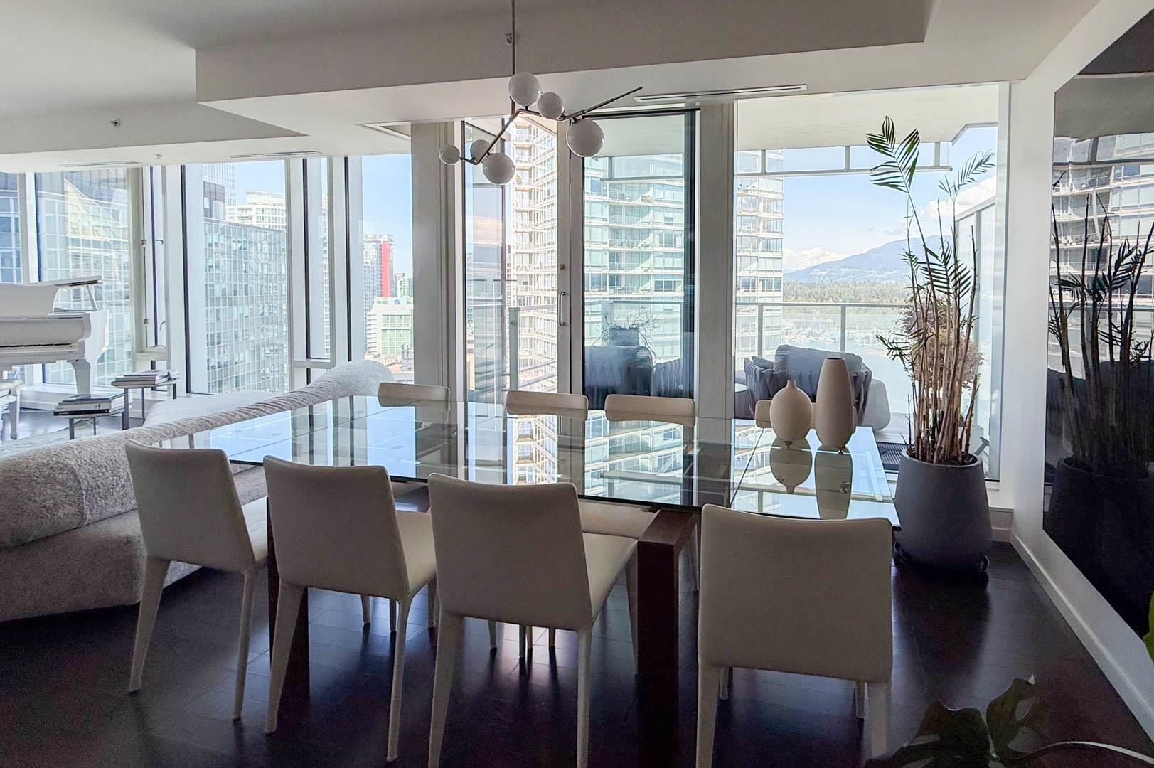 MIN. 6 MONTH TERM - FURNISHED 2 bdrm and den, 2.5 bath condo at the Fairmont Pacific Rim offers 1,800 sq ft of luxury living with unobstructed views of Coal Harbour, North Shore mountains, and Lions Gate Bridge. Kitchen features all s/s Miele appliances, gas cooktop, warming oven, built-in cappuccino maker, and sleek white cabinetry. Open-concept living/dining area includes a Seiler piano, glass dining table with seating for 8. Private terrace with plush outdoor seating. King bed master with spa-like ensuit...