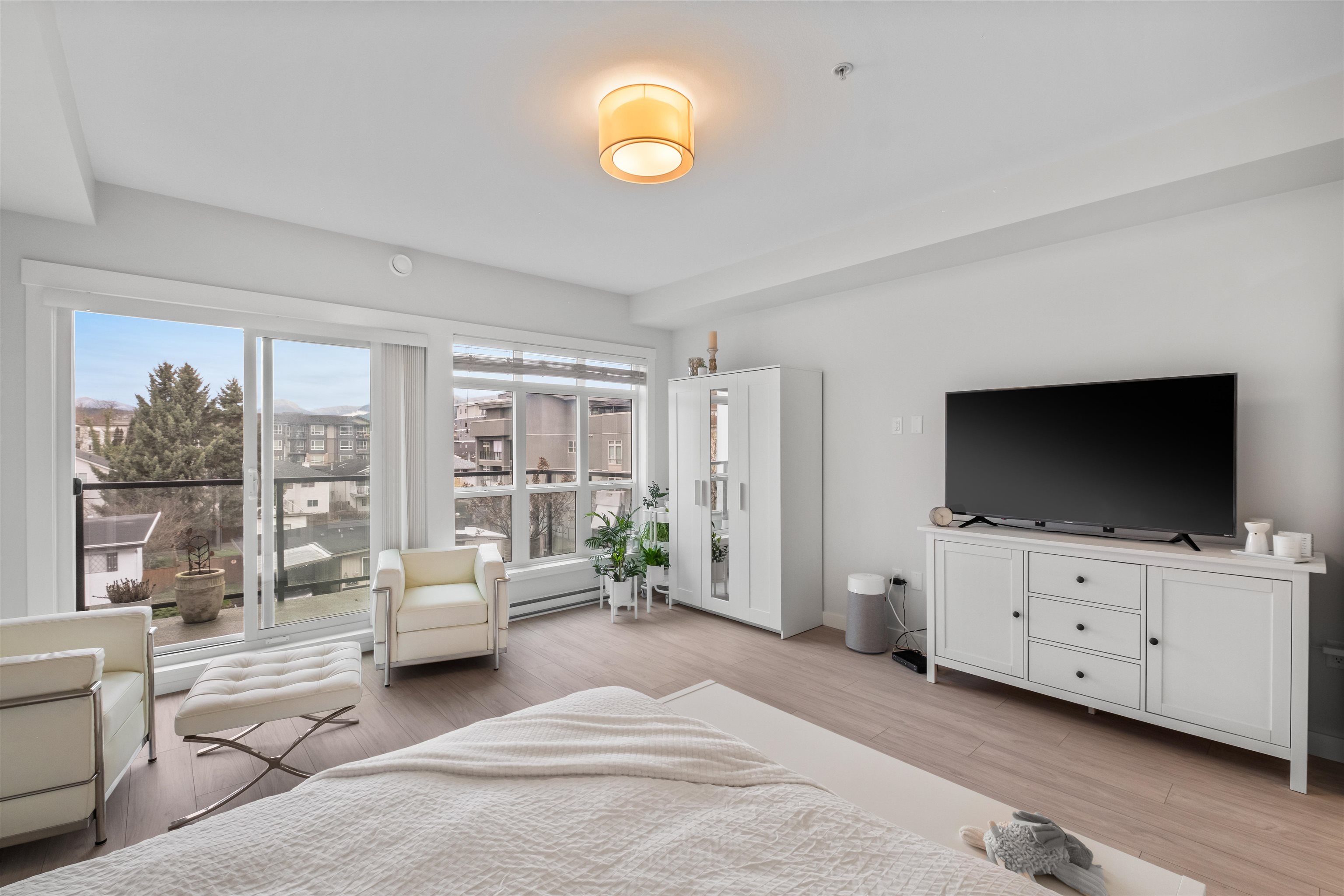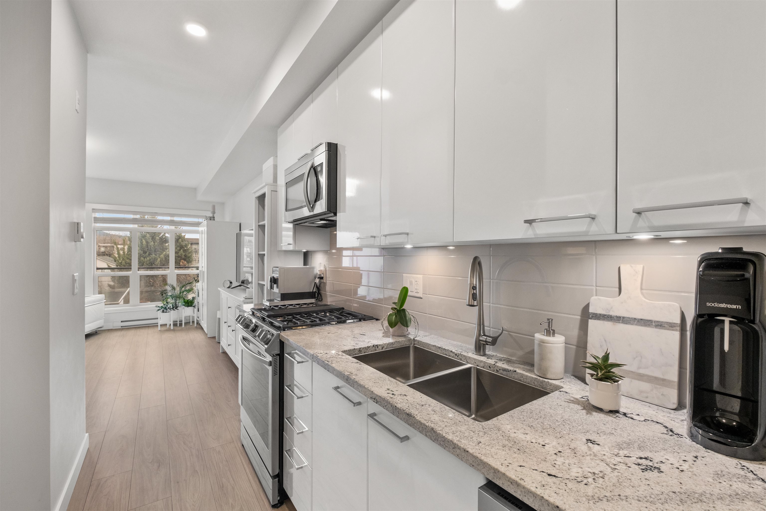 Welcome to this bright and modern third-floor Studio featuring stunning mountain views from your private balcony. The smart open-concept layout offers flexibility to create comfortable living, dining, and work areas. A spacious closet with charming barn-style doors provides excellent storage and can easily function as a home office. Enjoy quality finishes throughout, including stainless steel appliances, a gas cooktop with centre grill, built-in microwave, and sleek double-door fridge. Steps to Coquitlam Ri...