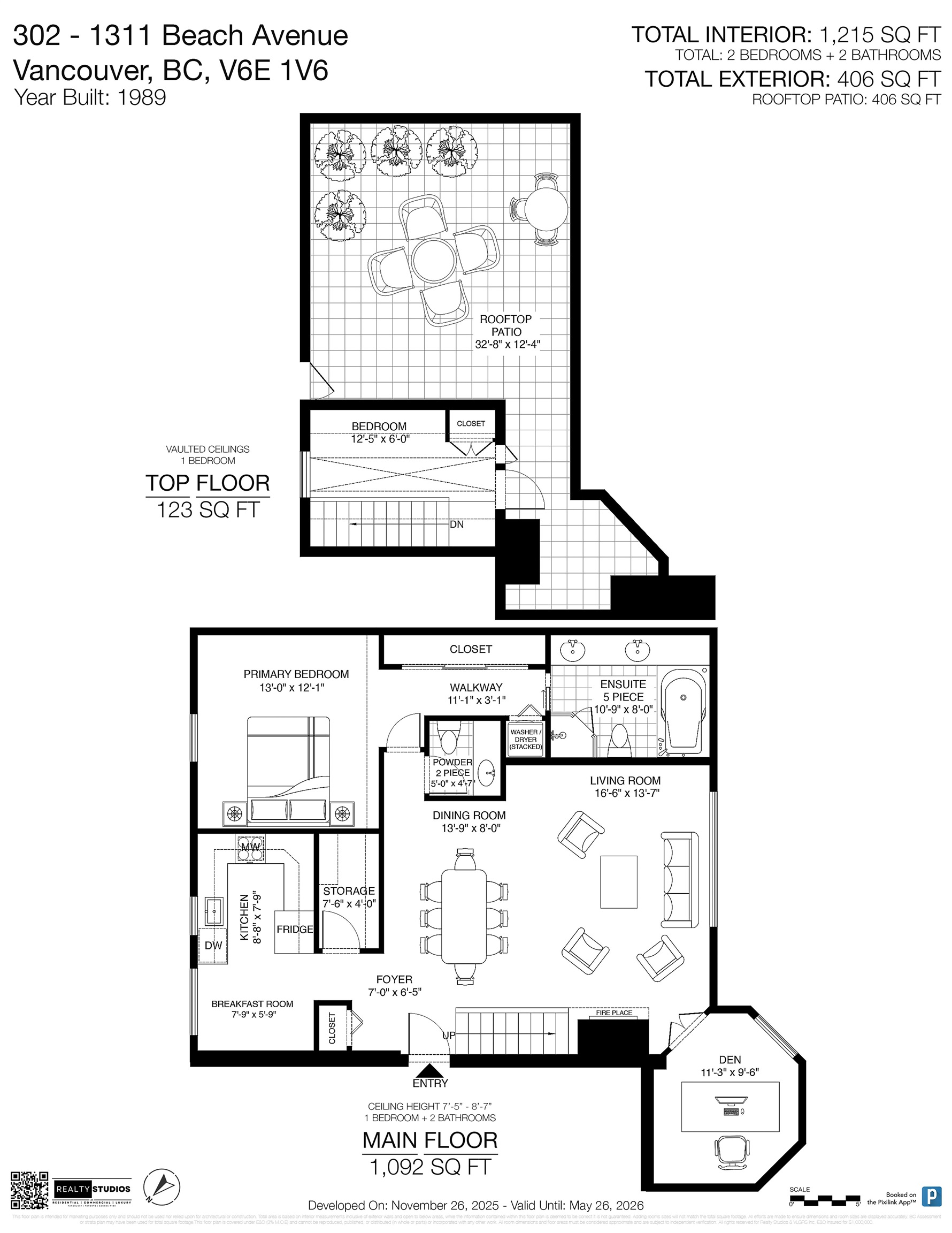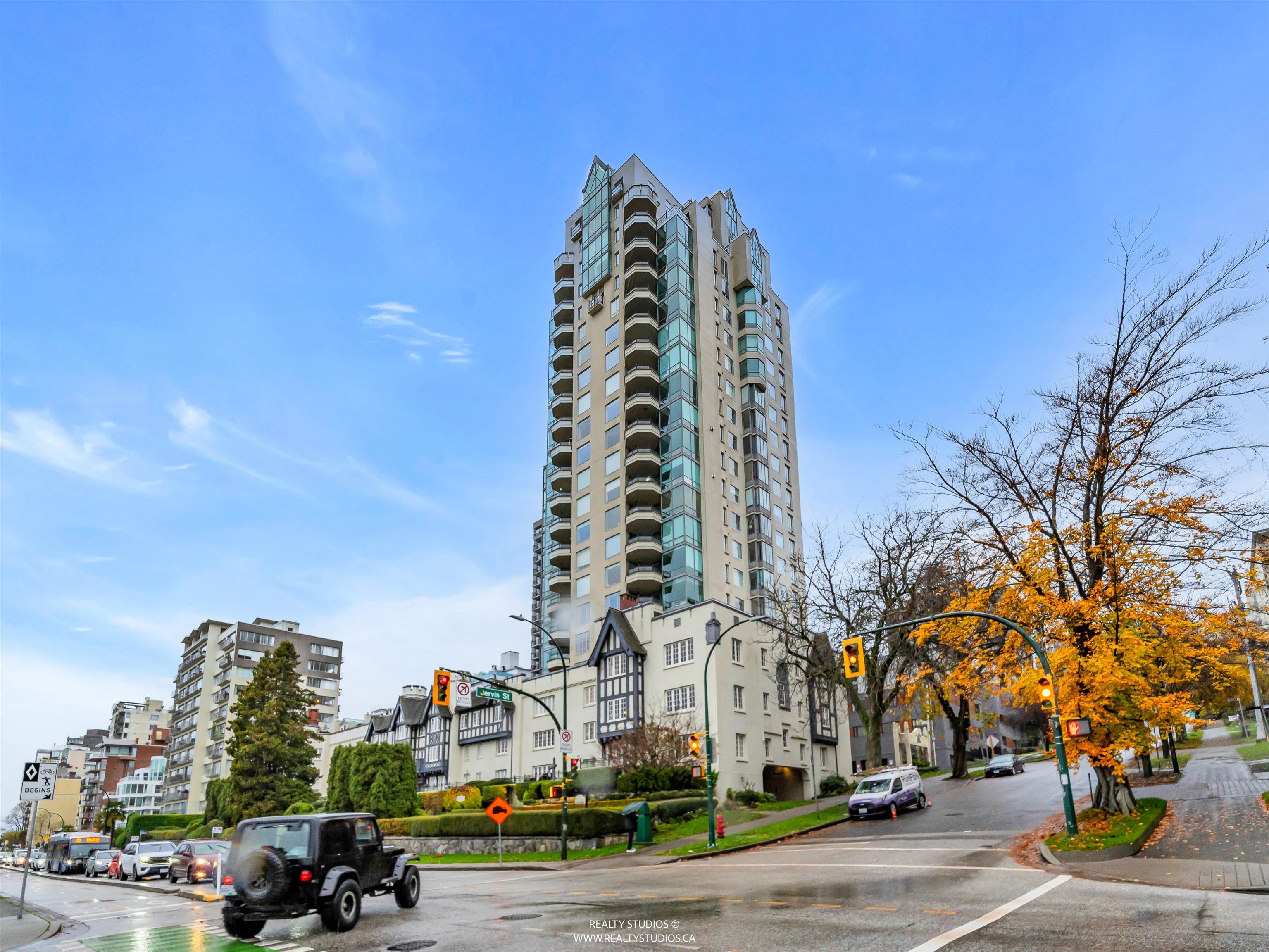 Rare opportunity in the iconic Tudor Manor on Beach Avenue. Waterfront with unobstructed views of Sunset Beach and English Bay. Unique townhome style layout with spacious main level with 1 bedroom + den (or 2nd BR) and 1 1/2 baths. Upper level features flex space/office and 400 sq. ft. sun drenched private roof deck with breathtaking views. Bring your decorating ideas to put your personal touch finishing this delightful home. Fabulous building with manicured gardens & courtyard. 24 hour concierge, fitness c...