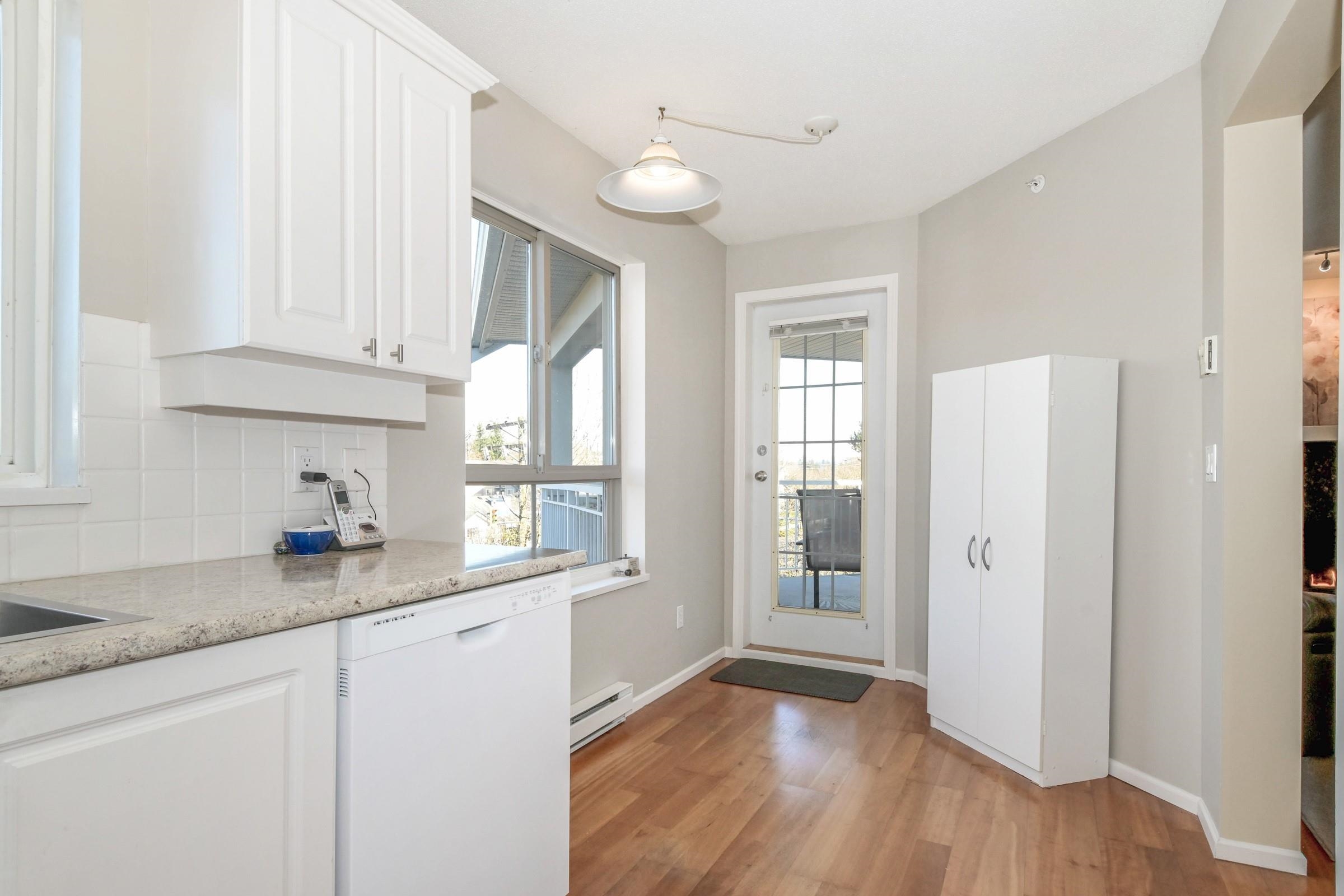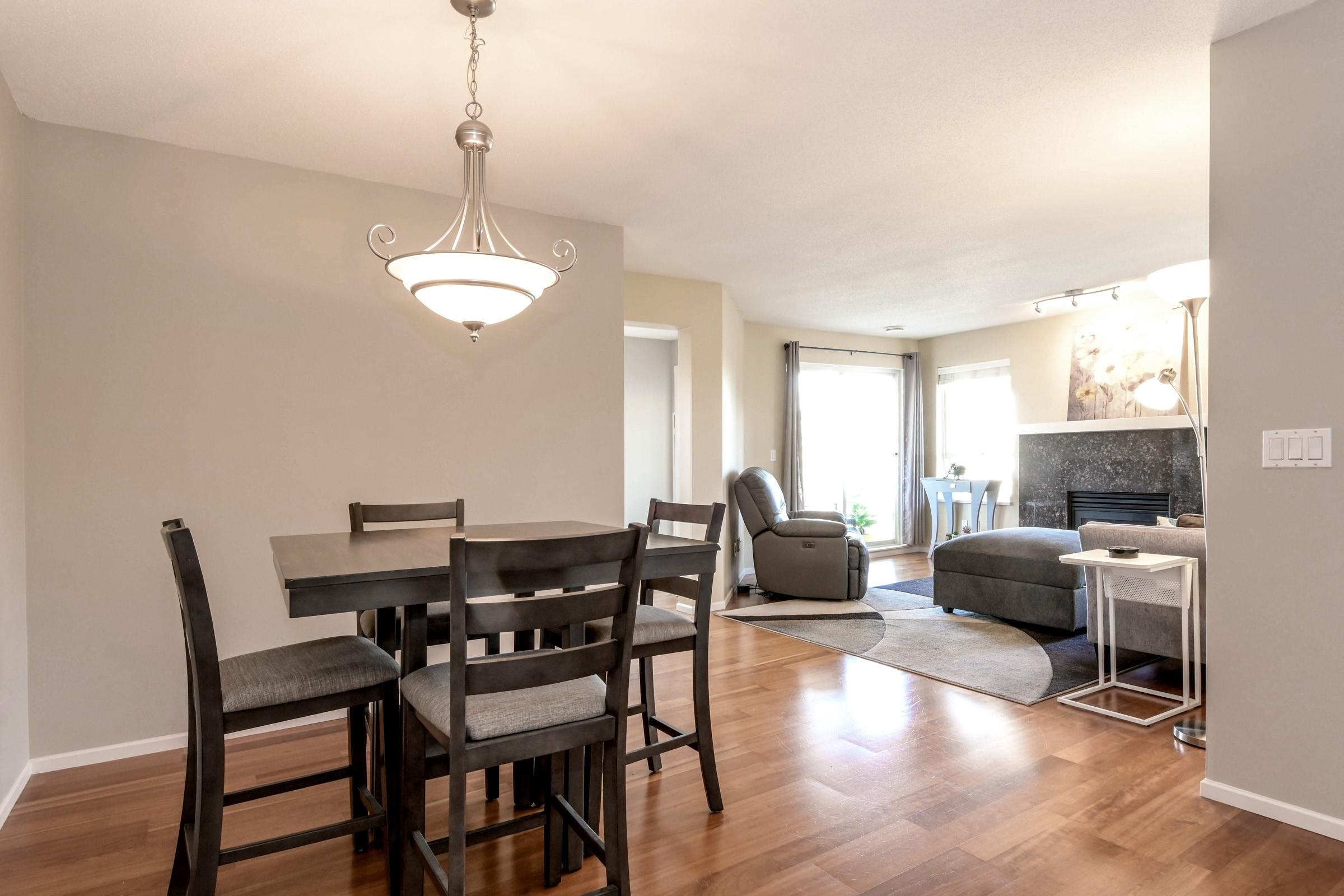 TOP FLOOR CORNER 2 bed/2 bath, feels like a home, spacious entry into a bright open living /dining area, hardwood floors /gas fireplace (gas included in maintenance)Separate kitchen, lots of cabinet space and walk out to corner patio with mountain views. Primary has updated ensuite and walkin closet. The laundry has extra storage space. This is a great building well looked after, new roof, repiping and new fencing in last 5 years. Building offers, bike room, party room gym and strata includes gas and hot wa...