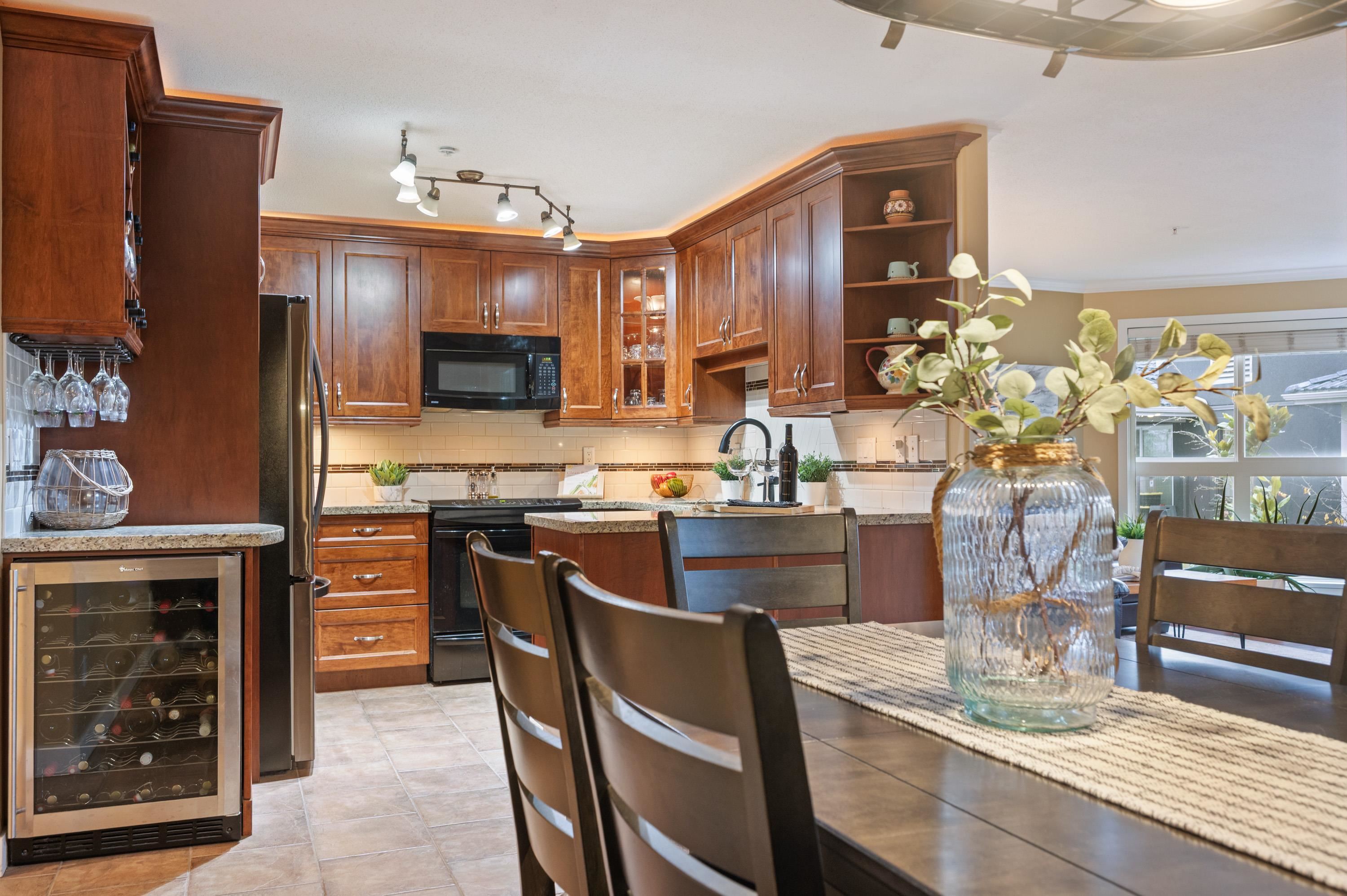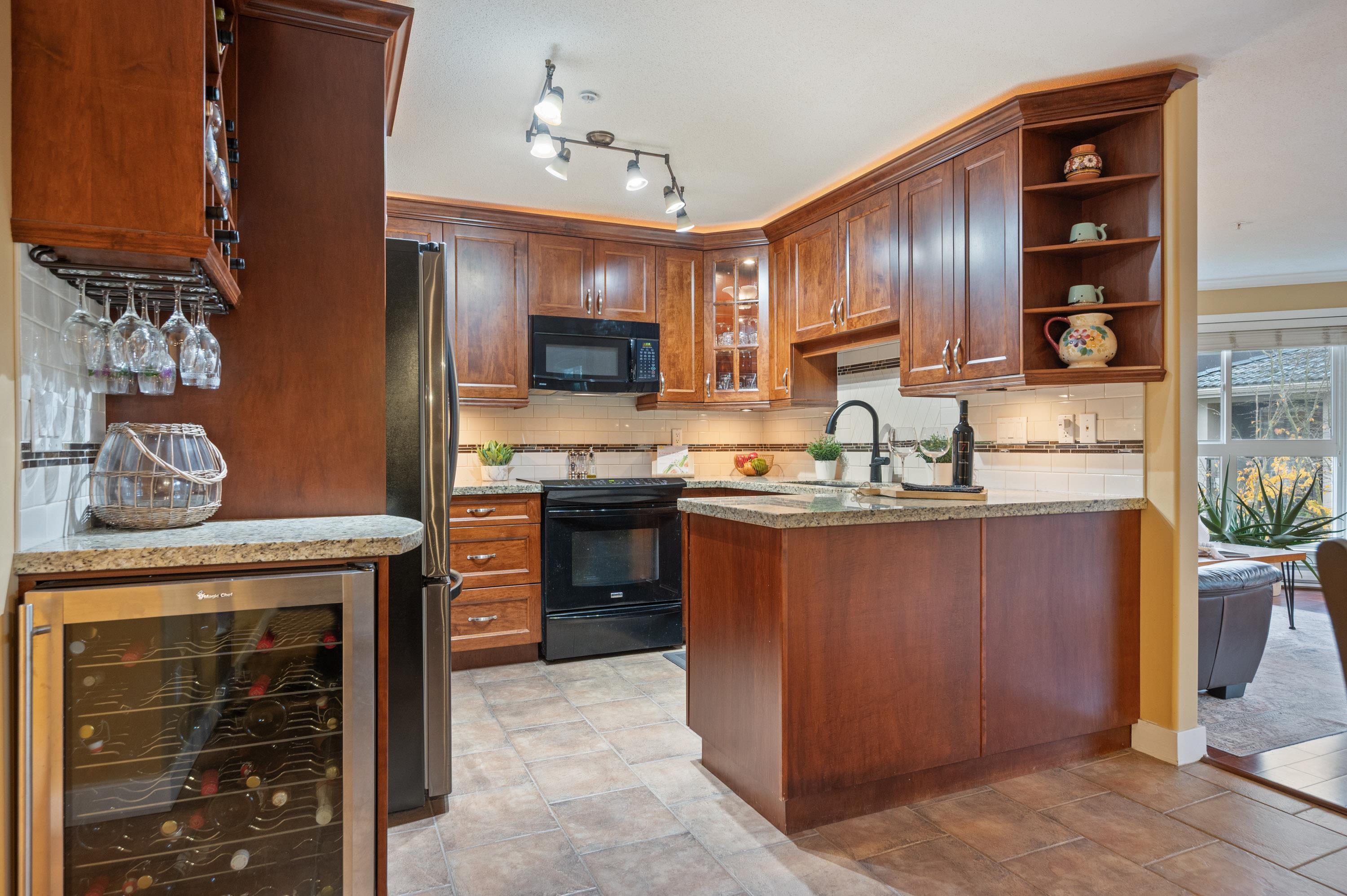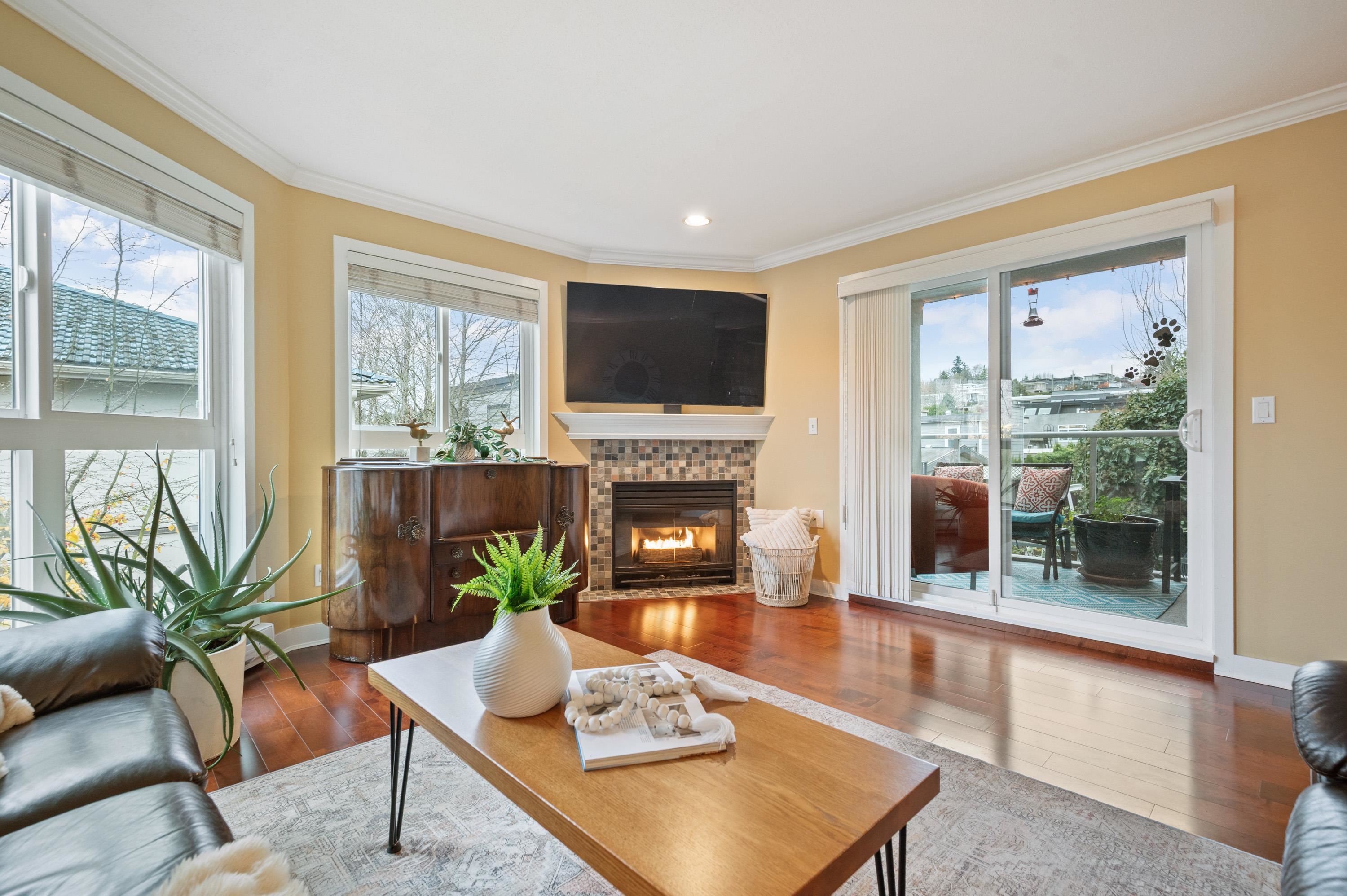 East Beach stunning 2 bed, 2 bath updated condo in White Rock! CORNER END unit is located on the quiet side of the building w/large windows on all sides for lots of natural light. Beautiful solid cherry hardwood floors, crown moulding, remodelled kitchen w/custom cabinetry & lighting, granite counters, wine fridge. Spacious & bright family room w/gas fireplace & large dining area for entertaining. Washer and Dryer new in 2022. Impressive sunny western exposed covered deck for BBQing. Lots of in-suite storag...