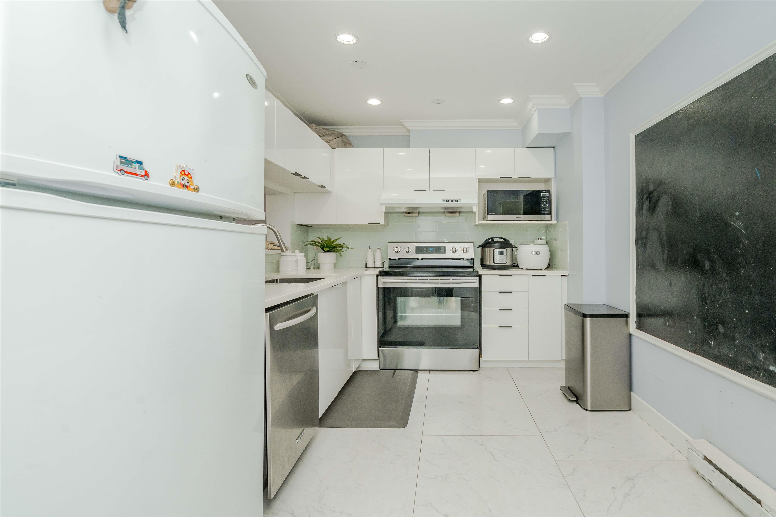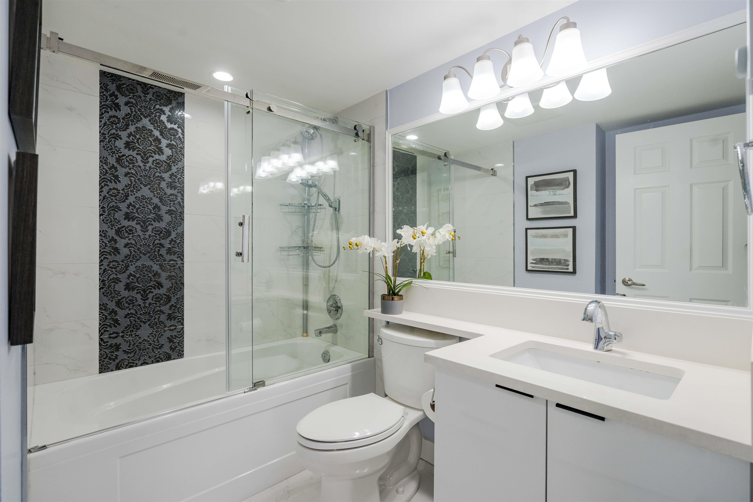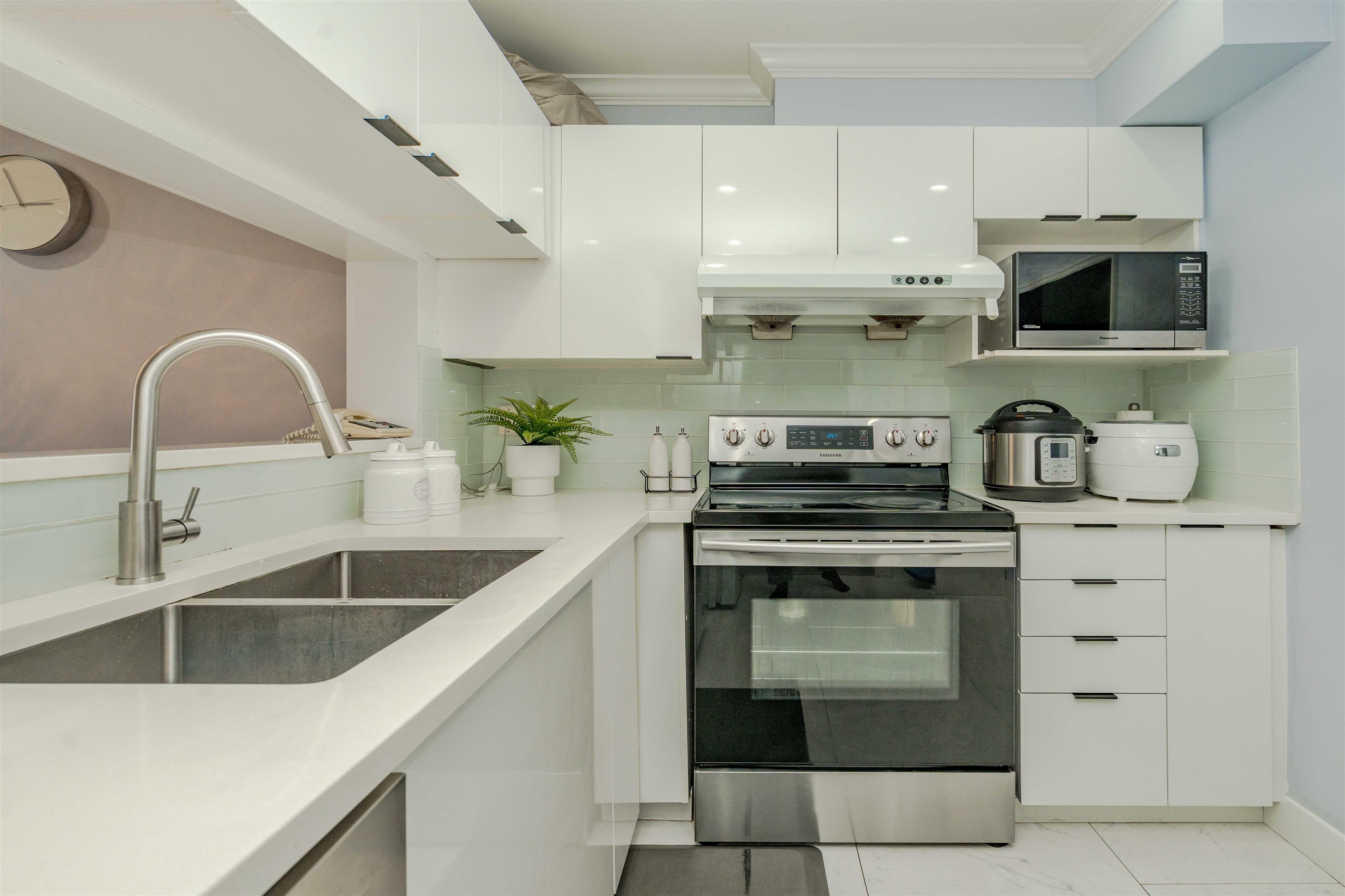 Welcome to "The Fernwood". This beautiful & Professionally renovated unit is move-in ready as your next dream home. Top level unit w/ no one above provides peaceful life & quietness. Around 1000 sqft functional layout features 2 specious bdrms & 2 full bath w/ NO waste of space. Tastefully upgraded w/ SS appliances, matching countertops & cabinets, modern bathrms and added Recessed Lighting. Well maintained building & active strata, incl. recent roof project done & paid. Minutes away to a Future Skytrain s...