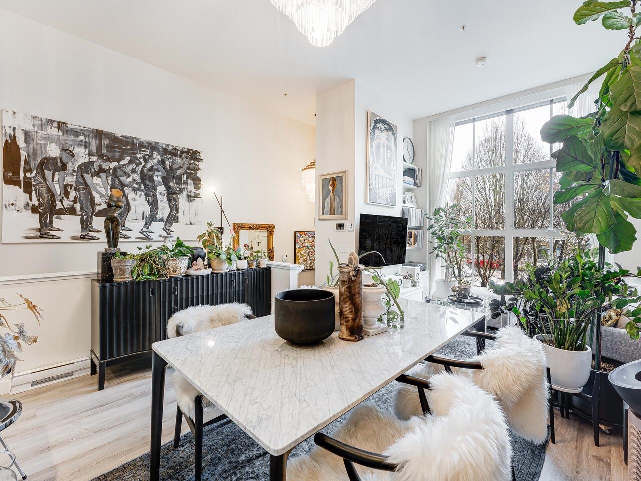 Immaculate boutique 2 bed 2 bath concrete townhome with 11 to 14 ft ceilings and floor to ceiling windows overlooking Trout Lake Park & Trout Lake Community Centre. Ideally located and just minutes to vibrant cafés, dining, and shops of Commercial Drive. Short walk to Skytrain. This bright open concept home is designed for comfortable living and entertaining, featuring quartz and marble countertops, marble tile & stainless steel appliances. Secured parking, bike locker & storage. Upgrades: anti shatter glas...