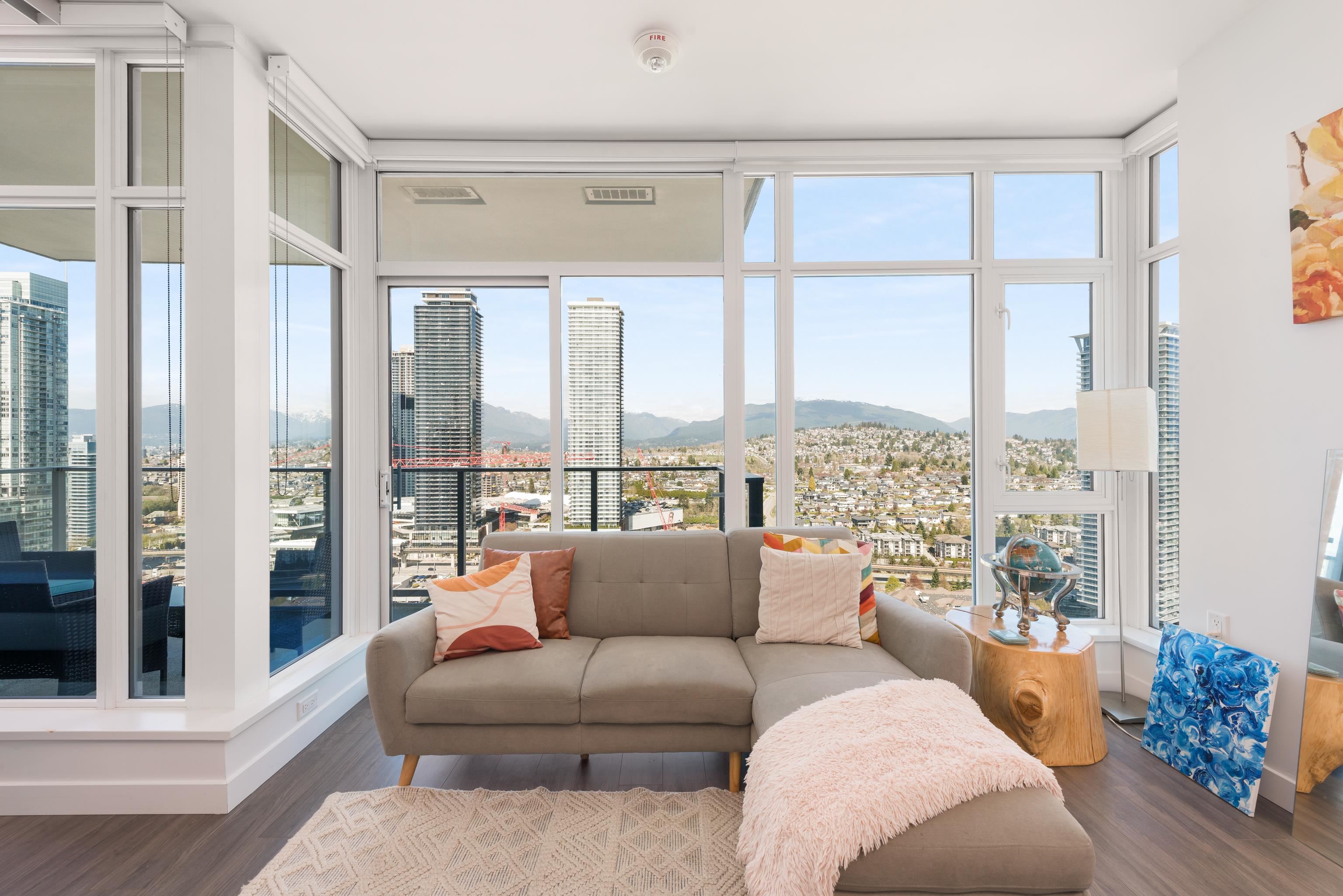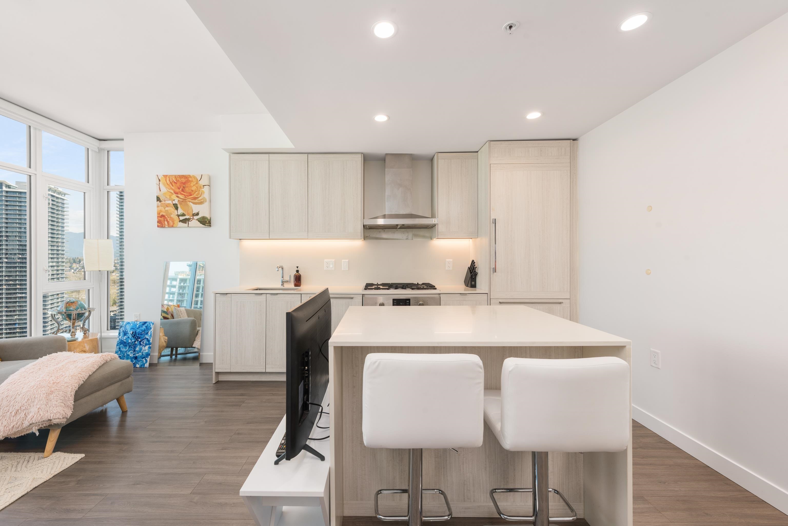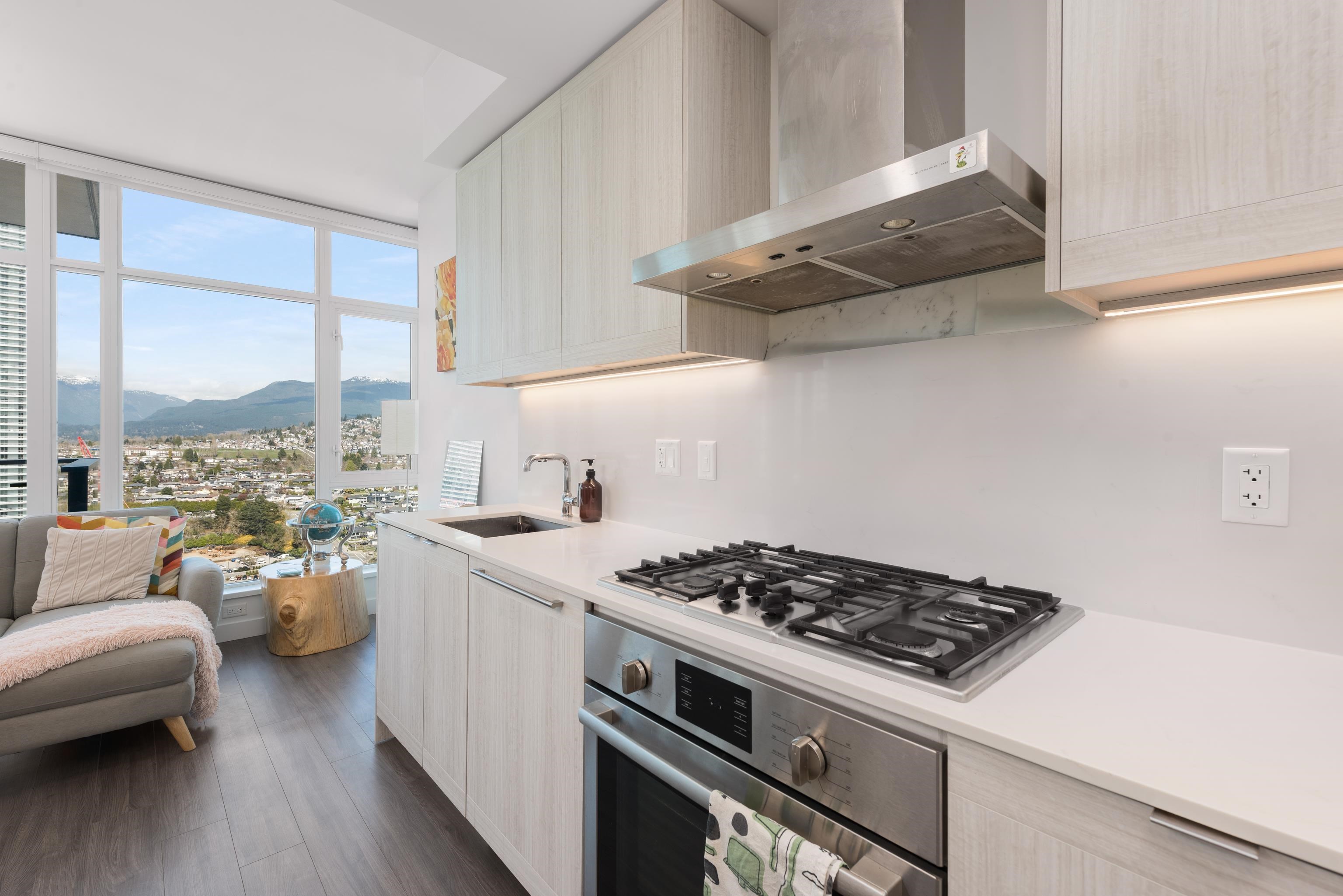 Waterfall At Lumina. Soar above the city from the 35th floor in this bright 1 bed, 1 bath 582 sq.ft. home with sweeping panoramic mountain views. Floor-to-ceiling windows flood the space with natural light, while 9’ ceilings enhance the open, airy feel. The modern kitchen features Bosch stainless steel appliances and gas cooktop, paired with the comfort of built-in A/C for year-round living. Ideally situated in Brentwood, this location is within walking distance to many shops, restaurants, and the SkyTrain,...