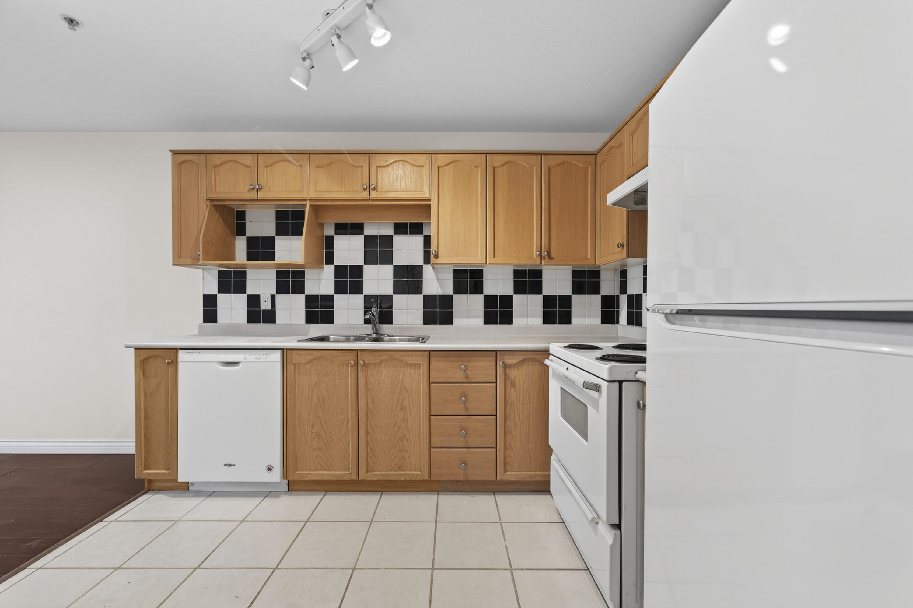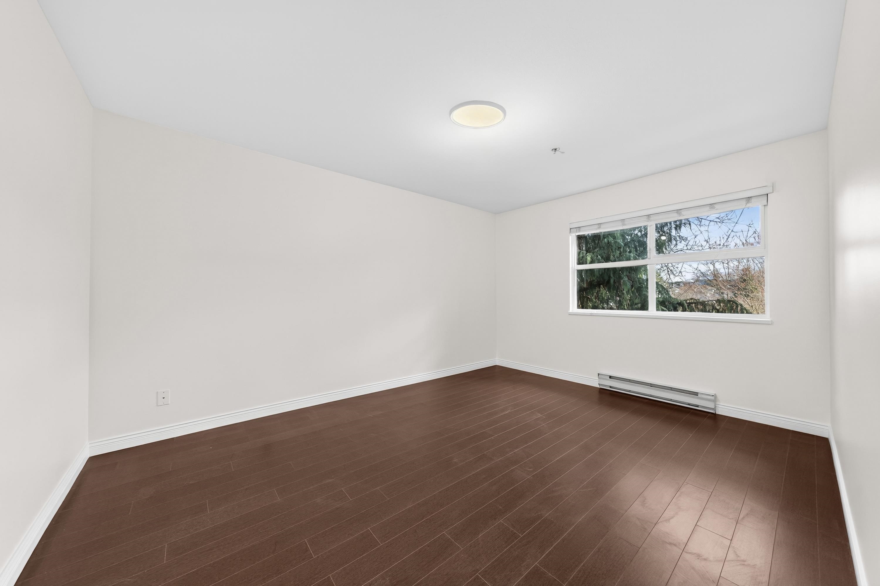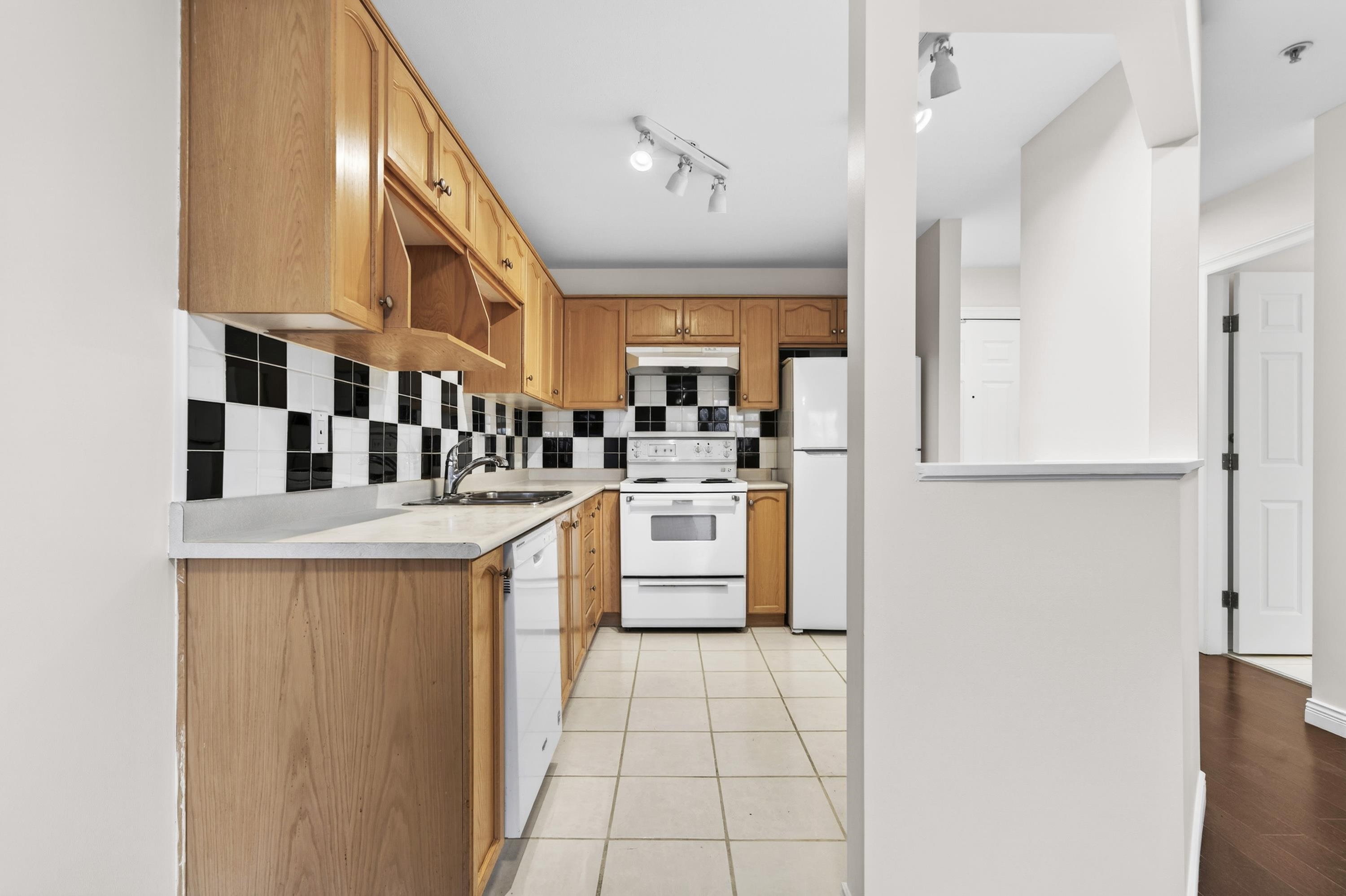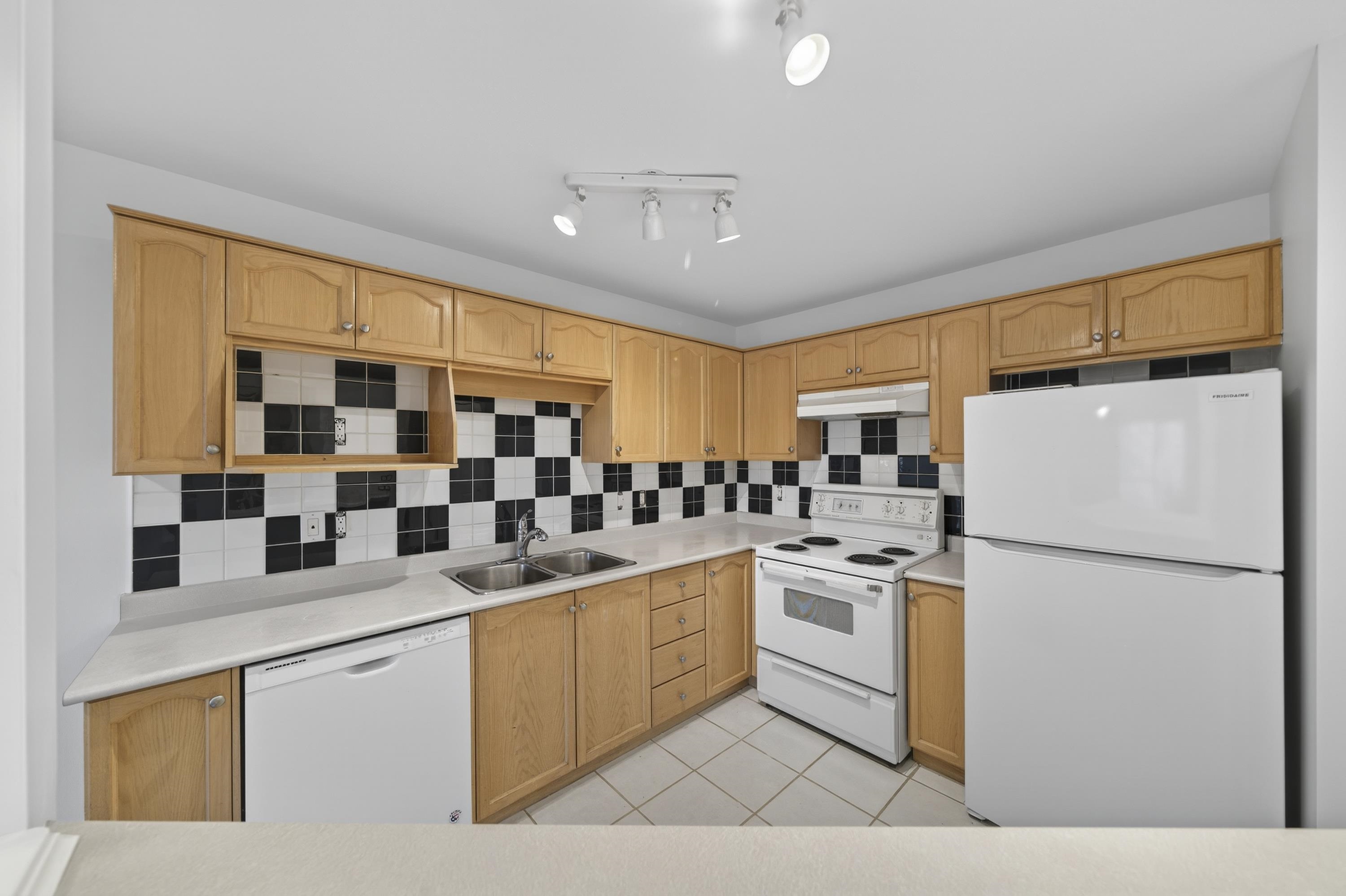 Bright Top-Floor 1-Bdrm Retreat! East-facing & full of natural light, this home combines comfort w/ convenience. The generous kitchen has ample storage, a handy pass-through & room for a bistro table. Living area features a corner gas f/p & opens to a sunny balcony framed by mature trees-perfect for morning coffee. King-sized bdrm includes W/I closet & ensuite access. Sought-after bldg is fully rain-screened & ideally located: steps to shops, dining & services in downtown PoCo, w/ Coquitlam River trails out...
