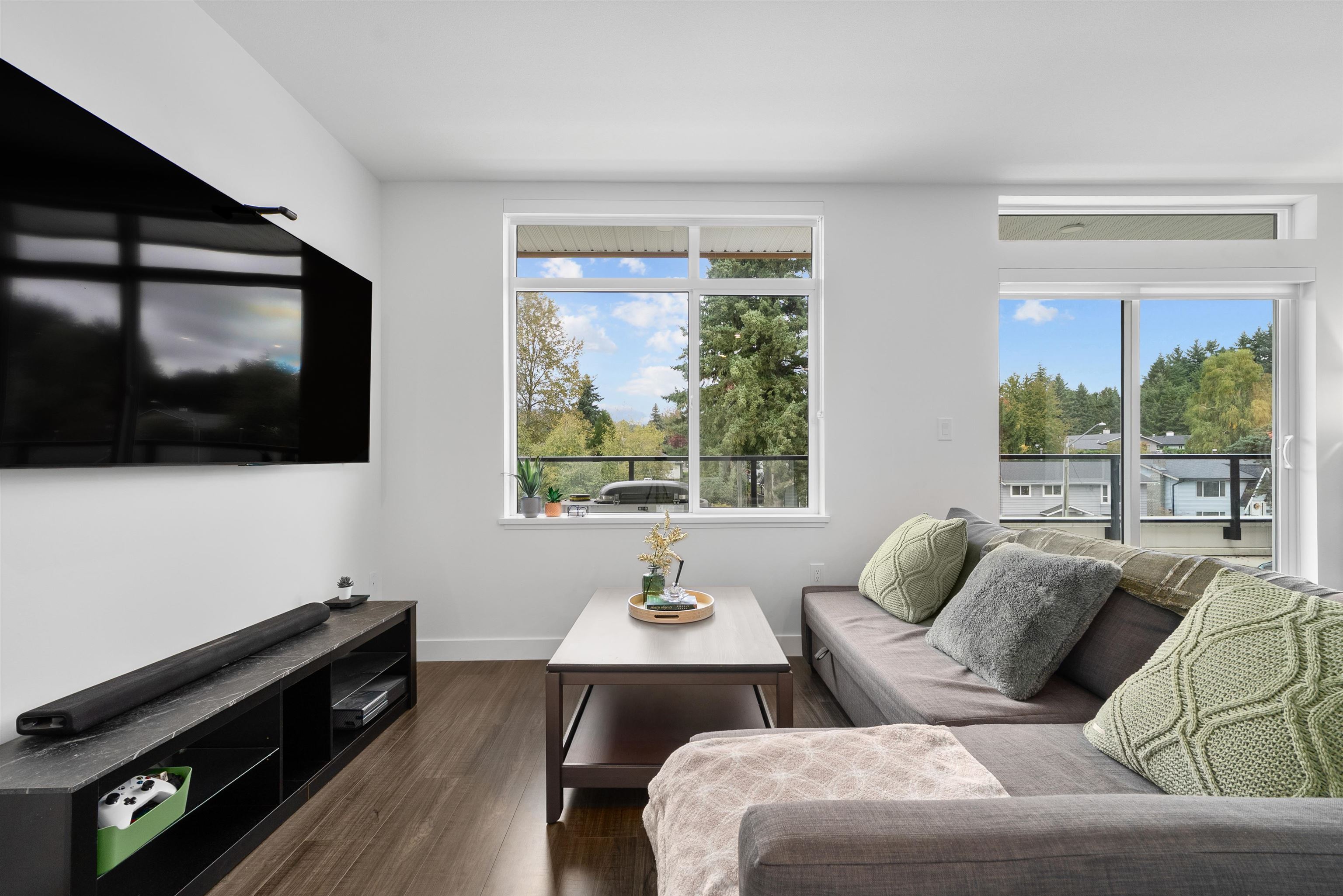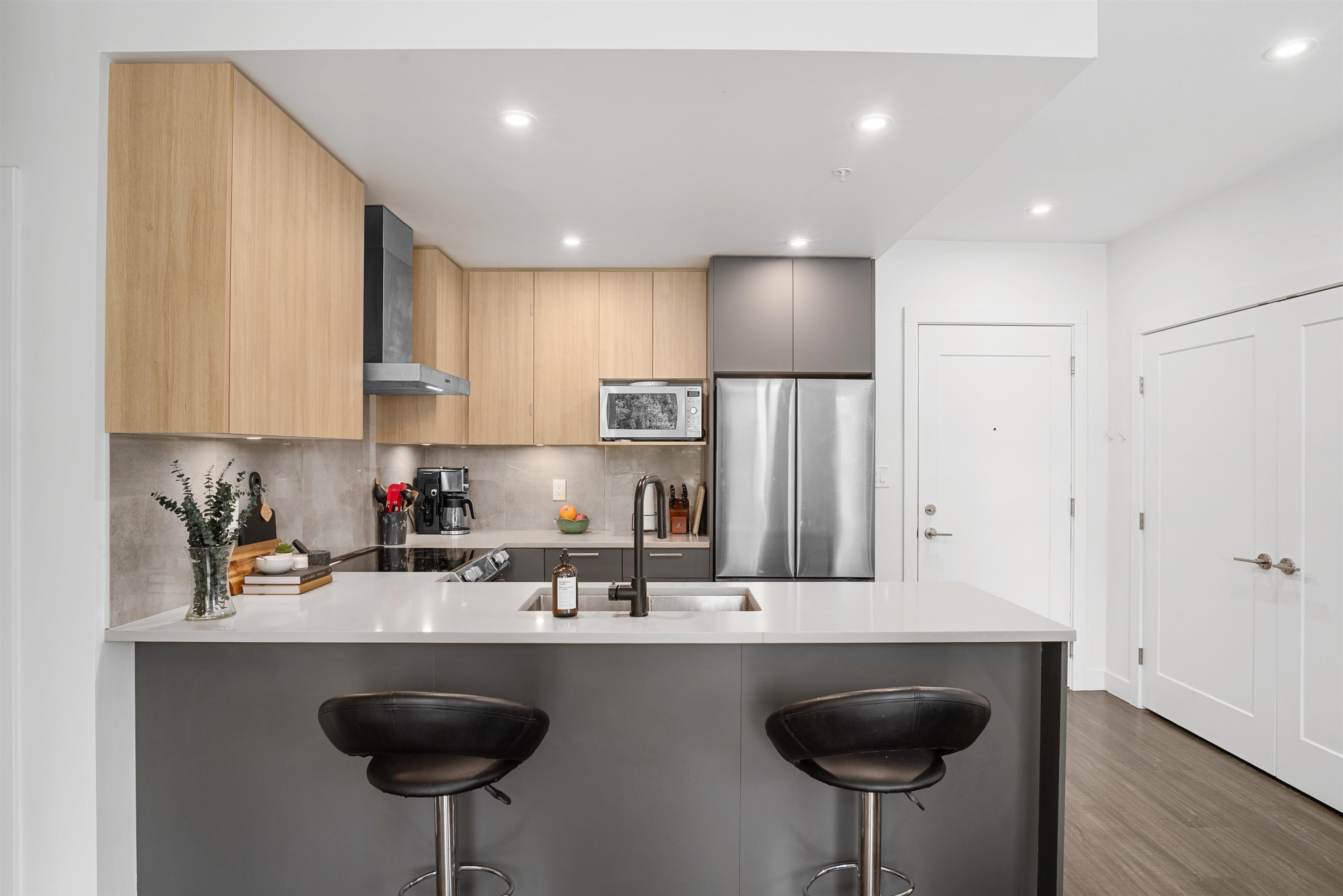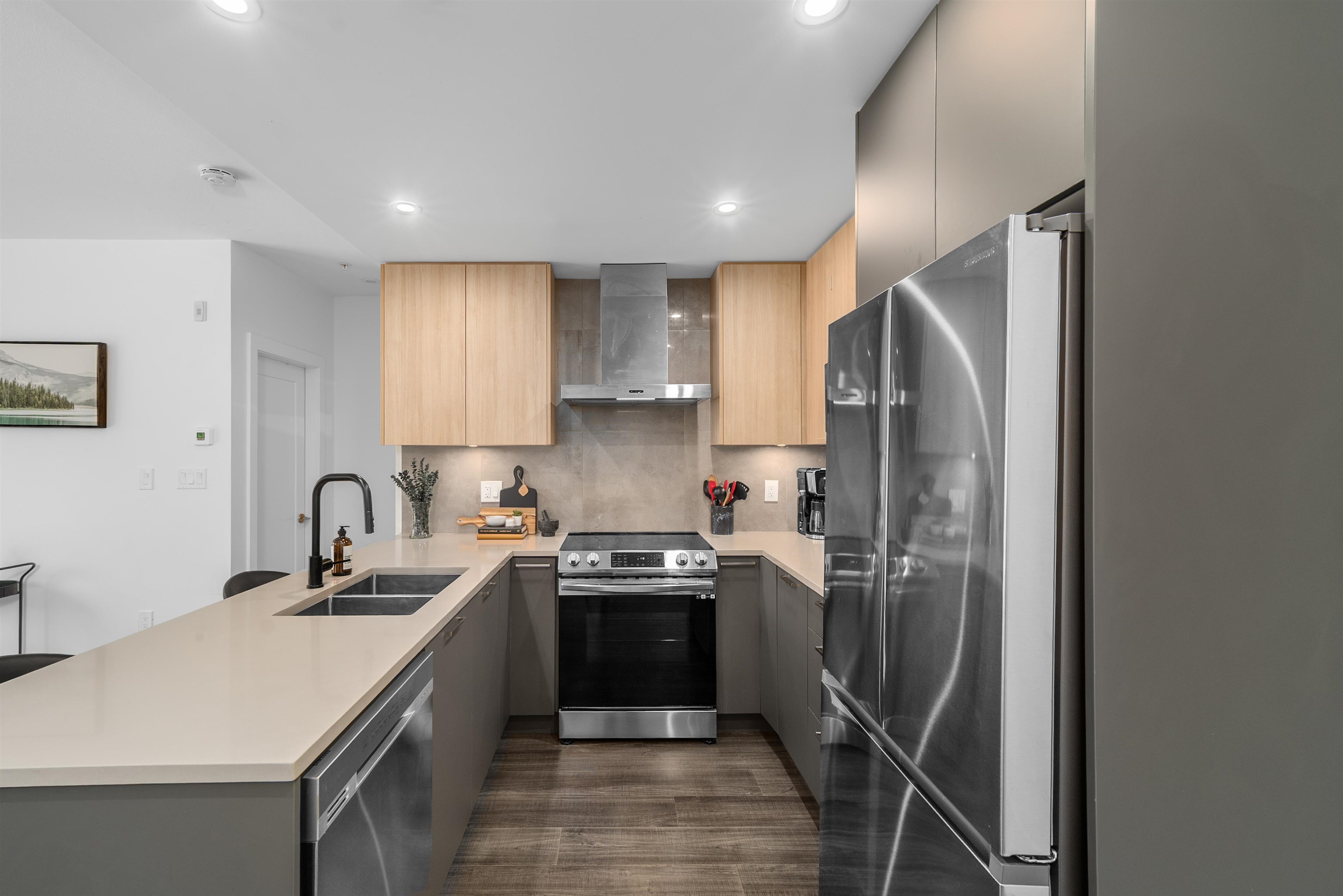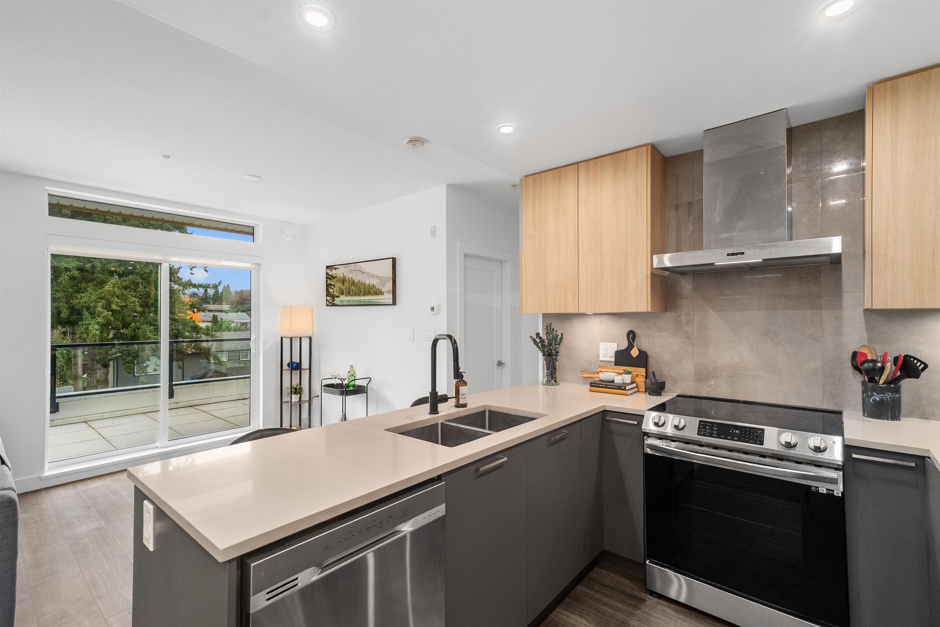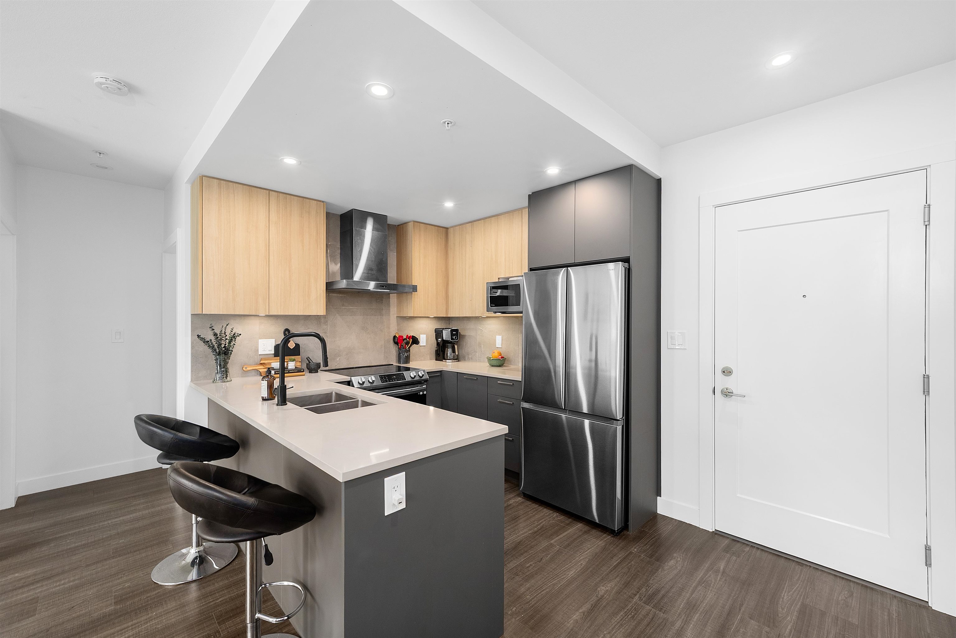 LIKE NEW 2 BEDROOM + DEN at WREN AND RAVEN. This TOP FLOOR, CORNER HOME offers a fantastic, modern, open-concept and BRIGHT layout. The spacious kitchen features S+S appliances, quartz countertops and breakfast bar. The primary bedroom is BIG, with walk through closet leading to a beautifully finished ensuite, while both bathrooms are generously sized with great storage. The den provides PERFECT flexibility for a home office/nursery or guest space. Step out and entertain on the HUGE 250sqft patio with peeki...