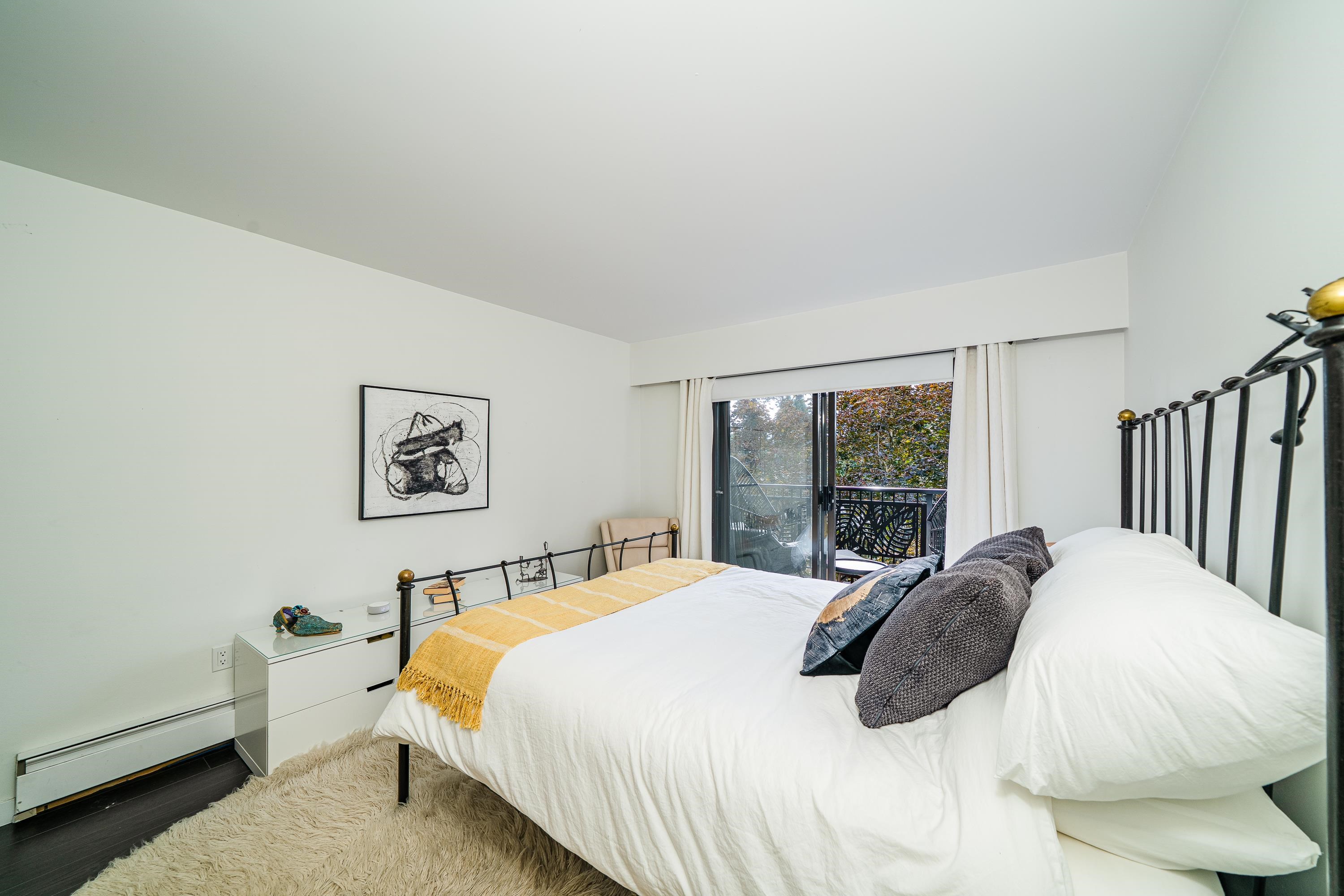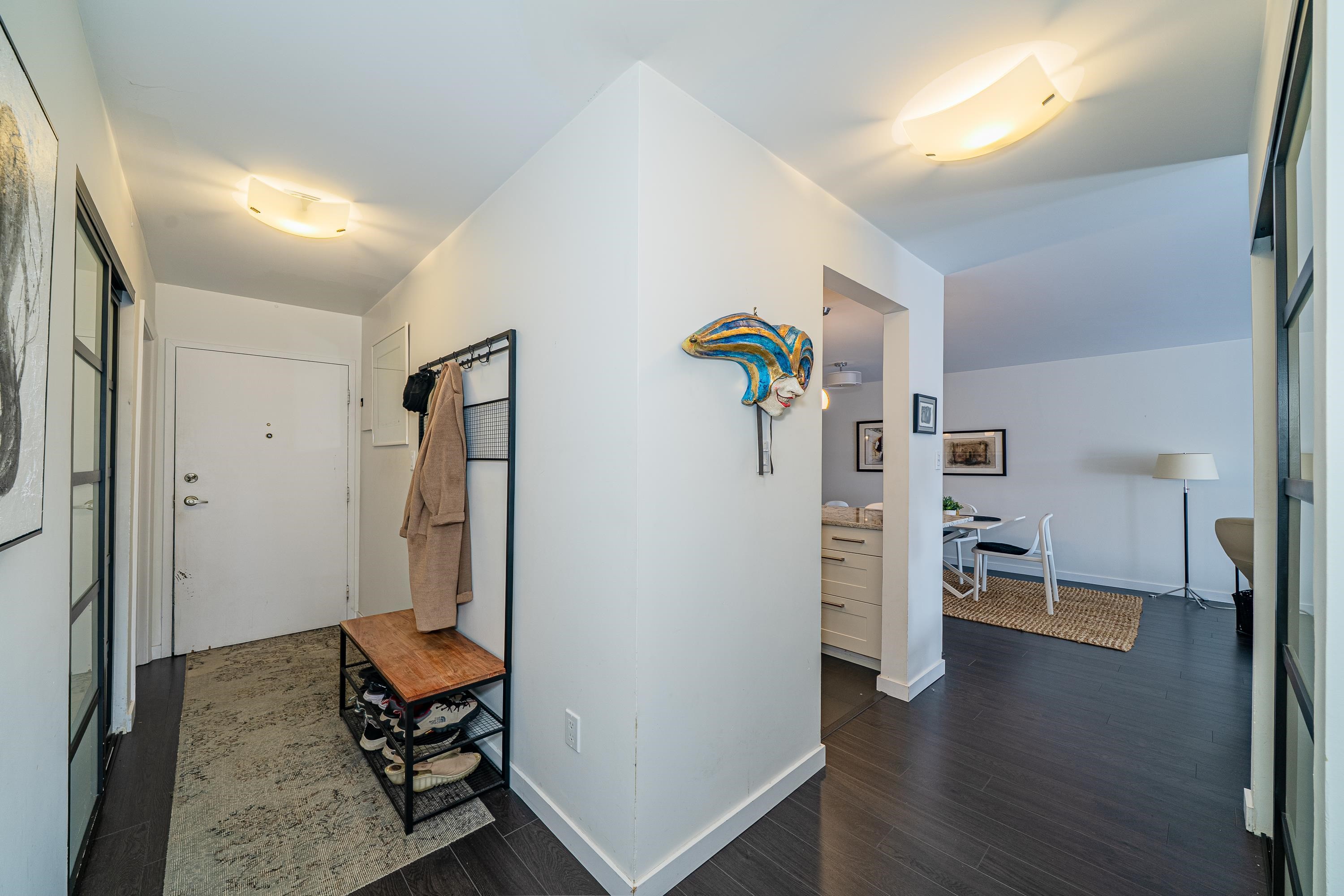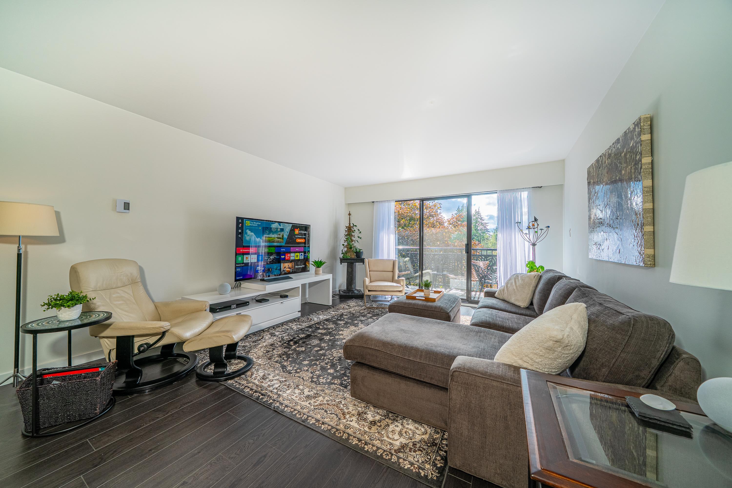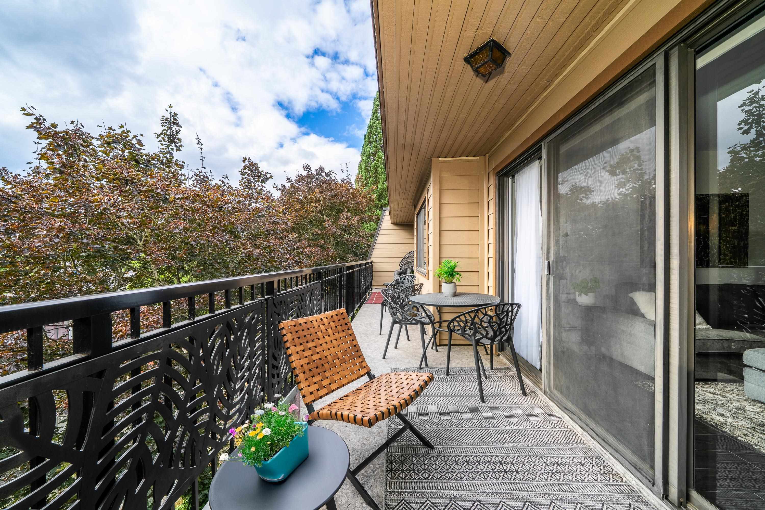 Welcome to your Lynn Valley dream home! This beautifully renovated, (with permits), south facing 1,042 sq ft penthouse is just steps from Lynn Valley trails. A bright, stylish suite where no detail has been overlooked — featuring open-concept living, a sleek updated kitchen, high end appliances, two full size, updated gorgeous bathrooms; inc walk-in shower, new flooring, walk-in closet in the primary, in-suite laundry, custom cabinetry. Enjoy your quiet, private outdoor patio, or if you're feeling sociable...